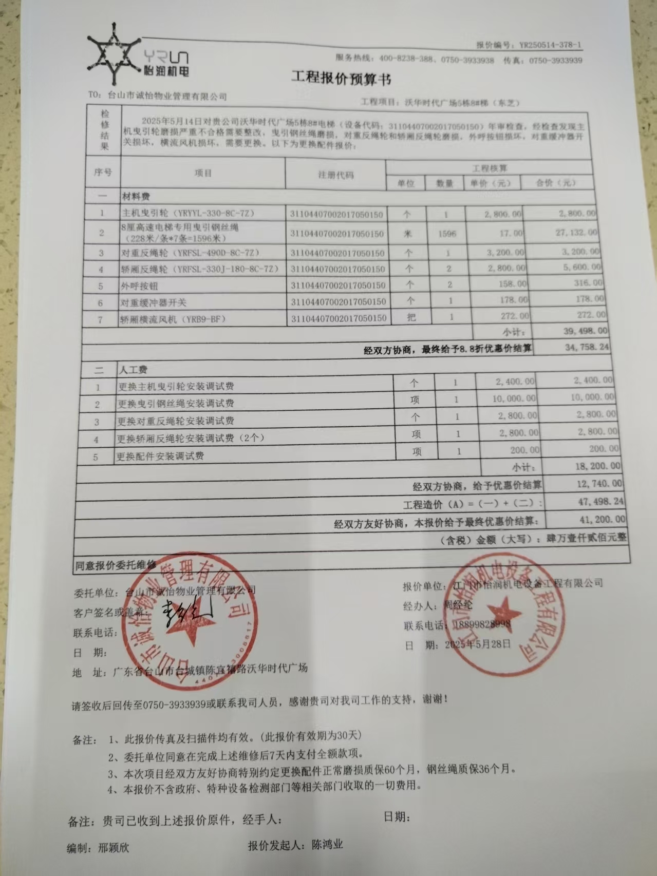 <td VALIGN="top" VALUES="" STYLE="border-width:0" BINDTYPE="0" ROWSPAN="19" COLSPAN="7" DATASOURCE="投票结果" ><font style="font-size:14pt;"><p style="white-space: normal; font-family: 宋体; line-height: 1.75em;">沃华时代广场沃华时代广场5幢全体业主:</p><p style="white-space: normal; font-family: 宋体; line-height: 1.75em; text-indent: 2em;">本小区关于沃华时代广场5栋8#电梯更换主机曳引轮、钢丝绳等配件使用维修资金投票的投票已表决结束,询异时间从2025年07月01日开始,投票询异公示期间,业主可通过微信查询自己的表决情况或可凭身份证件申请查询自己的表决情况;如公示的业主表决情况与查询的本人表决意见不一致的,可以以书面形式向投票组织机构申诉,投票组织机构予以纠正并重新公示表决结果。异议提出人对投票组织机构的处理仍有异议的,可以向街道办事处(镇人民政府)反映处理,涉及住宅专项维修资金的,可向属地住宅专项维修资金管理中心反映处理。</p><p style="white-space: normal;"><br/></p><p style="white-space: normal; font-family: 宋体; line-height: 1.75em;"><strong>附件:</strong></p><p style="white-space: normal; font-family: 宋体; line-height: 1.75em;"><strong>一、投票范围</strong></p><p style="white-space: normal; font-family: 宋体; line-height: 1.75em; text-indent: 2em;">沃华时代广场沃华时代广场5幢</p><p style="white-space: normal; font-family: 宋体; line-height: 1.75em; text-indent: 2em;">总人数(专有部分人数之和):114</p><p style="white-space: normal; font-family: 宋体; line-height: 1.75em; text-indent: 2em;"><span style="font-family: 宋体, SimSun;"><span style="font-family: 宋体; text-indent: 32px;"><span style="font-family: 宋体; text-indent: 32px;">总户数:114</span></span></span></p><p style="white-space: normal; font-family: 宋体; line-height: 1.75em; text-indent: 2em;">建筑物总面积(专有部分面积之和):13451.92㎡</p><p style="white-space: normal; font-family: 宋体; line-height: 1.75em;"><strong>二、询异公示起止时间</strong></p><p dir="ltr" style="white-space: normal; font-family: 宋体; line-height: 1.75em; text-indent: 2em;"><span style="text-indent: 36px;">2025年07月01日至2025年07月11日</span></p><p style="white-space: normal; font-family: 宋体; line-height: 1.75em;"><strong>三、投票详细描述</strong></p><p style="white-space: normal; font-family: 宋体; line-height: 1.75em; text-indent: 2em;"><p> 小区5栋8#电梯年审检查时发现主机曳引轮磨损严重不合格需要整改,经检查,是由于曳引钢丝绳已严重磨损,对重反绳轮和轿厢反绳轮磨损导致,在高速运行时曳引钢丝绳有断裂风险<br/></p><p> 现需申请使用维修资金对5栋8#电梯进行维修,工程维修预算金额为41200元,项目最终费用以施工合同签订金额为准。因已过保修期,维修费用由相关业主按分户分摊,每户361.41元,详见公示附件。如业主手机不能正常通过微信投票,请联系物业公司进行线下纸质投票,物业电话:0750-5612882、0750-5612880。</p><p><br/></p></p><p style="white-space: normal; font-family: 宋体; line-height: 1.75em;"><strong>四、计票规则</strong></p><p style="white-space: normal; font-family: 宋体; line-height: 1.75em; text-indent: 2em;">表决事项:使用建筑物及其附属设施的维修资金<br /><p style='text-align: left; font-family: 宋体; font-size: 16px; line-height: 1.75em; text-indent: 2em;'>计票规则:弃权票不并入其它项 未表决票不并入其它项</p></p><p style="white-space: normal; font-family: 宋体; line-height: 1.75em;"><strong>五、通过规则</strong></p><p style="white-space: normal; font-family: 宋体; line-height: 1.75em;"><strong><strong style="white-space: normal;"><span style="font-family: 宋体, SimSun;"> 根据《中华人民共和国民法典》第二百七十八条规定:业主共同决定事项,应当由专有部分面积占比三分之二以上的业主且人数占比三分之二以上的业主参与表决。</span></strong></strong></p><p style="white-space: normal; font-family: 宋体; line-height: 1.75em; text-indent: 2em;">表决事项:使用建筑物及其附属设施的维修资金<br /><p style='text-align: left; font-family: 宋体; font-size: 16px; line-height: 1.75em; text-indent: 2em;'>通过规则:双2/3以上参与表决,参与表决双过半同意</p></p><p style="white-space: normal; font-family: 宋体; line-height: 1.75em;"><strong>六、投票结果</strong></p><p style="white-space: normal; font-family: 宋体; line-height: 1.75em; text-indent: 2em;"><div id='resultTable'><table style='table-layout: fixed; font-size:12px; margin-top:10px' width='100%' border='0' cellspacing='0' cellpadding='0'><tr><td height='28' colspan='10' align='center' style='border: 1px solid #666'><strong style='font-size: 14px;'> 使用建筑物及其附属设施的维修资金</strong></td> </tr><tr id='trfirst'><td height='28' colspan='4' style='border-left: 1px solid #666; border-bottom: 1px solid #666'><strong> 申报单位:</strong> 台山市诚怡物业管理有限公司</td><td colspan='3' style='border-left: 1px solid #666; border-bottom: 1px solid #666'><strong> 联系方式:</strong> 07505612880 </td><td colspan='3' style='border-left: 1px solid #666; border-bottom: 1px solid #666; border-right: 1px solid #666'><strong> 申报日期:</strong> 2025年5月30日 </td></tr><tr> <td height='28' colspan='5' style='border-left: 1px solid #666; border-bottom: 1px solid #666'><strong> 总人数(专有部分人数之和):</strong>114人 </td><td colspan='5' style='border-left: 1px solid #666; border-bottom: 1px solid #666; border-right: 1px solid #666'><strong> 建筑物总面积(专有部分面积之和):</strong>13451.92㎡ </td> </tr><tr><td height='28' colspan='10' bgcolor='#F3F3F3' style='border-left: 1px solid #666;border-bottom: