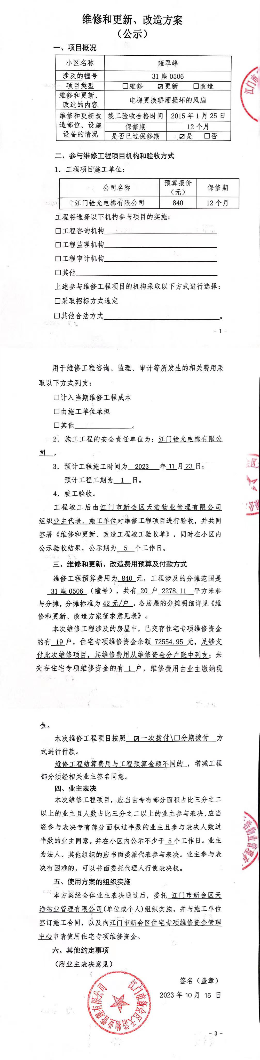 <td valign="top" values="" style="border-width:0" bindtype="0" rowspan="17" colspan="7" datasource="投票结果"><font style=" font-family:方正小标宋简体;font-size:14pt;"><p style="line-height: 1.75em;"><span style="font-family: 宋体, SimSun;">各位尊敬的业主:</span><br></p><p style="text-indent: 2em; line-height: 1.75em;"><span style="font-family: 宋体, SimSun;">根据法律法规的规定,本小区业主利用“江门市物业事项表决管理系统”已对本小区公共事务决策事项进行了表决,在经过7日的询异公示期后,未收到业主有效的异议。现将投票结果公告,并就产生的法律效力说明如下:</span></p><p style="line-height: 1.75em; text-indent: 0em;"><strong style="text-indent: 2em;"><span style="font-family: 宋体, SimSun;">一、投票范围</span></strong></p><p style="text-indent: 2em; line-height: 1.75em;"><span style="font-family: 宋体, SimSun;">雍翠峰雍翠峰31座</span></p><p style="text-indent: 2em; line-height: 1.75em;"><span style="font-family: 宋体, SimSun;">总人数(专有部分人数之和):20</span></p><p style="text-indent: 2em; line-height: 1.75em;"><span style="font-family: 宋体, SimSun;"><span style="font-family: 宋体, SimSun; text-indent: 32px;"><span style="font-family: 宋体; text-indent: 32px;">总户数:20</span></span></span></p><p style="text-indent: 2em; line-height: 1.75em;"><span style="font-family: 宋体, SimSun;">建筑物总面积(专有部分面积之和):2278.11㎡</span></p><p style="line-height: 1.75em;"><strong><span style="font-family: 宋体, SimSun;">二、投票结果公告时间</span></strong></p><p style="text-indent: 2em; line-height: 1.75em;"><span style="font-family: 宋体, SimSun;">从2023年11月18日开始</span></p><p style="line-height: 1.75em;"><strong><span style="font-family: 宋体, SimSun;">三、计票规则</span></strong></p><p style="text-indent: 2em; line-height: 1.75em;"><span style="font-family: 宋体, SimSun;">表决事项:使用建筑物及其附属设施的维修资金<br></span></p><p style="font-family: 宋体, SimSun;line-height: 1.75em; text-indent: 2em;">计票规则:弃权票不并入其它项 未表决票不并入其它项</p><p></p><p style="line-height: 1.75em;"><strong><span style="font-family: 宋体, SimSun;">四、通过规则</span></strong></p><p style="line-height: 1.75em;"><strong><span style="font-family: 宋体, SimSun;"> 根据《中华人民共和国民法典》第二百七十八条规定:业主共同决定事项,应当由专有部分面积占比三分之二以上的业主且人数占比三分之二以上的业主参与表决。</span></strong></p><p style="text-indent: 2em; line-height: 1.75em;"><span style="font-family: 宋体, SimSun;"><span style="font-family: 宋体, SimSun; text-indent: 32px;">表决事项:使用建筑物及其附属设施的维修资金<br></span></span></p><p style="font-family: 宋体, SimSun;line-height: 1.75em; text-indent: 2em;">通过规则:参与表决专有部分面积过半数的业主且参与表决人数过半数的业主同意</p><p></p><p style="line-height: 1.75em;"><strong><span style="font-family: 宋体, SimSun;">五、投票结果</span></strong></p><p style="line-height: 1.75em; text-indent: 2em;"><span style="font-family: 宋体, SimSun; text-indent: 2em;"></span></p><div id="resultTable"><table style="table-layout: fixed; font-size:12px; margin-top:10px" width="100%" border="0" cellspacing="0" cellpadding="0"><tbody><tr><td height="28" colspan="10" align="center" style="border: 1px solid #666"><strong style="font-size: 14px;"> 使用建筑物及其附属设施的维修资金</strong></td> </tr><tr id="trfirst"><td height="28" colspan="4" style="border-left: 1px solid #666; border-bottom: 1px solid #666"><strong> 申报单位:</strong> 江门市新会区天浩物业管理有限公司</td><td colspan="3" style="border-left: 1px solid #666; border-bottom: 1px solid #666"><strong> 联系方式:</strong> </td><td colspan="3" style="border-left: 1px solid #666; border-bottom: 1px solid #666; border-right: 1px solid #666"><strong> 申报日期:</strong> 2023年10月15日 </td></tr><tr> <td height="28" colspan="5" style="border-left: 1px solid #666; border-bottom: 1px solid #666"><strong> 总人数(专有部分人数之和):</strong>20人 </td><td colspan="5" style="border-left: 1px solid #666; border-bottom: 1px solid #666; border-right: 1px solid #666"><strong> 建筑物总面积(专有部分面积之和):</strong>2278.11㎡ </td> </tr><tr><td height="28" colspan="10" bgcolor="#F3F3F3" style="border-left: 1px solid #666;border-bottom: 1px solid #666;border-right: 1px solid #666"><strong> 参与人数及面积统计</strong></td></tr><tr><td height="28" colspan="5" style="border-left: 1px solid #666; border-bottom: 1px solid #666"><strong> 参与表决专有部分人数之和:</strong>15人</td><td colspan="5" style="border-left: 1px solid #666; border-bottom: 1px solid #666; border-right: 1px solid #666"><strong> 参与表决占有表决权总人数比例:</strong>75.00%</td></tr><tr><td height="28" colspan="5" style="border-left: 1px solid #666; border-bottom: 1px solid #666"><strong> 参与表决专有部分面积之和:</strong>1681.50㎡</td><td colspan="5" style="border-left: 1px solid #666; border-bottom: 1px solid #666; border-right: 1px solid #666"><strong> 参与表决占有表决权总面积比例:</strong>73.81%</td></tr><tr><td height="28" colspan="10" bgcolor="#F3F3F3" style="border-left: 1px solid #666; border-bottom: 1px solid #666;border-right: 1px solid #666"> <strong> 未参与人数及面积统计</strong></td> </tr><tr><td height="28" colspan="5" style="border-left: 1px solid #666; border-bottom: 1px solid #666"><strong> 未参与表决专有部分人数之和:</strong>5人 </td><td colspan="5" style="border-left: 1px solid #666; border-bottom: 1px solid #666; border-right: 1px solid #666"><strong> 未参与表决占有表决权总人数比例:</strong>25.00%