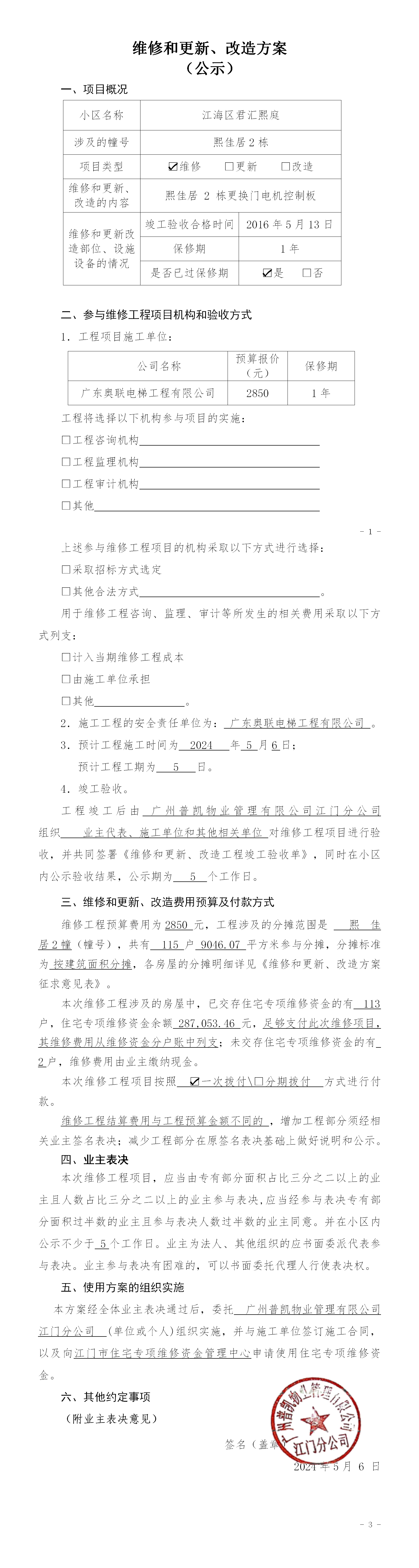 <td valign="top" values="" style="border-width:0" bindtype="0" rowspan="17" colspan="7" datasource="投票结果"><font style=" font-family:方正小标宋简体;font-size:14pt;"><p style="line-height: 1.75em;"><span style="font-family: 宋体, SimSun;">各位尊敬的业主:</span><br></p><p style="text-indent: 2em; line-height: 1.75em;"><span style="font-family: 宋体, SimSun;">根据法律法规的规定,本小区业主利用“江门市物业事项表决管理系统”已对本小区公共事务决策事项进行了表决,在经过7日的询异公示期后,未收到业主有效的异议。现将投票结果公告,并就产生的法律效力说明如下:</span></p><p style="line-height: 1.75em; text-indent: 0em;"><strong style="text-indent: 2em;"><span style="font-family: 宋体, SimSun;">一、投票范围</span></strong></p><p style="text-indent: 2em; line-height: 1.75em;"><span style="font-family: 宋体, SimSun;">江海区君汇熙庭江海区君汇熙庭熙佳居2幢</span></p><p style="text-indent: 2em; line-height: 1.75em;"><span style="font-family: 宋体, SimSun;">总人数(专有部分人数之和):115</span></p><p style="text-indent: 2em; line-height: 1.75em;"><span style="font-family: 宋体, SimSun;"><span style="font-family: 宋体, SimSun; text-indent: 32px;"><span style="font-family: 宋体; text-indent: 32px;"><span style="font-family: 宋体; text-indent: 32px;">总户数:115</span></span></span></span></p><p style="text-indent: 2em; line-height: 1.75em;"><span style="font-family: 宋体, SimSun;">建筑物总面积(专有部分面积之和):9046.07㎡</span></p><p style="line-height: 1.75em;"><strong><span style="font-family: 宋体, SimSun;">二、投票结果公告时间</span></strong></p><p style="text-indent: 2em; line-height: 1.75em;"><span style="font-family: 宋体, SimSun;"><span style="font-family: 宋体, SimSun; text-indent: 32px;">从2024年08月08日开始</span></span></p><p style="line-height: 1.75em;"><strong><span style="font-family: 宋体, SimSun;">三、计票规则</span></strong></p><p style="text-indent: 2em; line-height: 1.75em;"><span style="font-family: 宋体, SimSun;">表决事项:使用建筑物及其附属设施的维修资金<br></span></p><p style="font-family: 宋体, SimSun;line-height: 1.75em; text-indent: 2em;">计票规则:弃权票不并入其它项 未表决票不并入其它项</p><p></p><p style="line-height: 1.75em;"><strong><span style="font-family: 宋体, SimSun;">四、通过规则</span></strong></p><p style="line-height: 1.75em;"><strong><span style="font-family: 宋体, SimSun;"> 根据《中华人民共和国民法典》第二百七十八条规定:业主共同决定事项,应当由专有部分面积占比三分之二以上的业主且人数占比三分之二以上的业主参与表决。</span></strong></p><p style="text-indent: 2em; line-height: 1.75em;"><span style="font-family: 宋体, SimSun;"><span style="font-family: 宋体, SimSun; text-indent: 32px;">表决事项:使用建筑物及其附属设施的维修资金<br></span></span></p><p style="font-family: 宋体, SimSun;line-height: 1.75em; text-indent: 2em;">通过规则:双2/3以上参与表决,参与表决双过半同意</p><p></p><p style="line-height: 1.75em;"><strong><span style="font-family: 宋体, SimSun;">五、投票结果</span></strong></p><p style="line-height: 1.75em; text-indent: 2em;"><span style="font-family: 宋体, SimSun; text-indent: 2em;"></span></p><div id="resultTable"><table style="table-layout: fixed; font-size:12px; margin-top:10px" width="100%" border="0" cellspacing="0" cellpadding="0"><tbody><tr><td height="28" colspan="10" align="center" style="border: 1px solid #666"><strong style="font-size: 14px;"> 使用建筑物及其附属设施的维修资金</strong></td> </tr><tr id="trfirst"><td height="28" colspan="4" style="border-left: 1px solid #666; border-bottom: 1px solid #666"><strong> 申报单位:</strong> 广州普凯物业管理有限公司江门分公司</td><td colspan="3" style="border-left: 1px solid #666; border-bottom: 1px solid #666"><strong> 联系方式:</strong> </td><td colspan="3" style="border-left: 1px solid #666; border-bottom: 1px solid #666; border-right: 1px solid #666"><strong> 申报日期:</strong> 2024年5月24日 </td></tr><tr> <td height="28" colspan="5" style="border-left: 1px solid #666; border-bottom: 1px solid #666"><strong> 总人数(专有部分人数之和):</strong>115人 </td><td colspan="5" style="border-left: 1px solid #666; border-bottom: 1px solid #666; border-right: 1px solid #666"><strong> 建筑物总面积(专有部分面积之和):</strong>9046.07㎡ </td> </tr><tr><td height="28" colspan="10" bgcolor="#F3F3F3" style="border-left: 1px solid #666;border-bottom: 1px solid #666;border-right: 1px solid #666"><strong> 参与表决人数及面积统计</strong></td></tr><tr><td height="28" colspan="5" style="border-left: 1px solid #666; border-bottom: 1px solid #666"><strong> 参与表决人数:</strong>86人</td><td colspan="5" style="border-left: 1px solid #666; border-bottom: 1px solid #666; border-right: 1px solid #666"><strong> 参与表决人数占总人数比例:</strong>74.78%</td></tr><tr><td height="28" colspan="5" style="border-left: 1px solid #666; border-bottom: 1px solid #666"><strong> 参与表决面积:</strong>6690.79㎡</td><td colspan="5" style="border-left: 1px solid #666; border-bottom: 1px solid #666; border-right: 1px solid #666"><strong> 参与表决面积占总面积比例:</strong>73.96%</td></tr><tr><td height="28" colspan="10" bgcolor="#F3F3F3" style="border-left: 1px solid #666; border-bottom: 1px solid #666;border-right: 1px solid #666"> <strong> 参与表决同意人数及面积统计</strong></td> </tr><tr><td height="28" colspan="5" style="border-left: 1px solid #666; border-bottom: 1px solid #666"><strong> 参与表决同意人数:</strong>80人 </td><td colspan="5" style="border-left: 1px solid #666; border-bottom: 1px solid #666; border-right: 1px sol