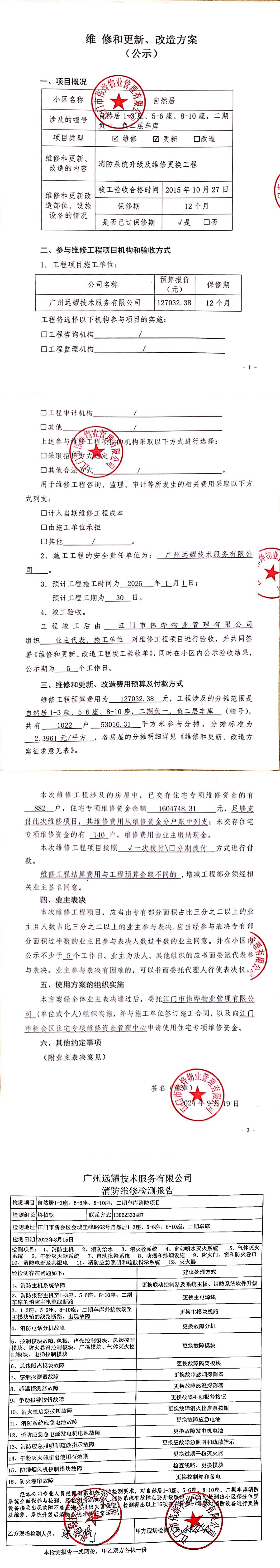 <td VALIGN="top" VALUES="" STYLE="border-width:0" BINDTYPE="0" ROWSPAN="18" COLSPAN="7" DATASOURCE="投票内容" ><font style="font-size:12pt;"><p style="text-align: left; font-family: 宋体; font-size: 16px; line-height: 1.75em;"><strong style="text-align: left; line-height: 1.75em;">一、投票范围</strong><br/></p><p style="white-space: normal; font-family: 宋体; font-size: 16px; line-height: 1.75em; text-indent: 2em;">自然居二期负二层车库、二期负一层车库、自然居10座、自然居1座、自然居2座、自然居3座、自然居5座、自然居6座、自然居8座、自然居9座</p><p style="white-space: normal; font-family: 宋体; font-size: 16px; line-height: 1.75em; text-indent: 2em;">总人数(专有部分人数之和):461</p><p style="white-space: normal; font-family: 宋体; font-size: 16px; line-height: 1.75em; text-indent: 2em;"><span style="font-family: 宋体; text-indent: 32px;">总户数:1022</span></p><p style="white-space: normal; font-family: 宋体; font-size: 16px; line-height: 1.75em; text-indent: 2em;">建筑物总面积(专有部分面积之和):53016.31㎡</p><p style="white-space: normal; font-family: 宋体;font-size: 16px; line-height: 1.75em;"><strong>二、投票起止时间</strong></p><p style="white-space: normal; font-family: 宋体; line-height: 1.75em; text-indent: 2em;">投票表决时间:从2024年09月23日到2025年02月28日止</p><p style="white-space: normal; font-family: 宋体; line-height: 1.75em; text-indent: 2em;">投票补录时间:从2025年03月01日到2025年03月05日止</p><p style="white-space: normal; font-family: 宋体;font-size: 16px; line-height: 1.75em;"><strong>三、投票详细描述</strong></p><p style="white-space: normal; font-family: 宋体; font-size: 16px; line-height: 1.75em; text-indent: 2em;"><p>自然居1-3座、5-6座、8-10座,二期负一、负二层车库消防设施设备日常检查时发现消防设施设备故障,经检查,有部分设备故障和损坏,导致部分消防设施设备无法正常运作。现对1-3座、5-6座、8-10座,二期负一、负二层车库消防系统升级及维修更换,工程维修预算金额为139447.96元,含有审价,其中申请维修资金的分摊金额为127032.38元,人防车库的分摊金额为12415.58元。项目最终费用以施工合同签订金额为准。因已过保修期,维修费用由相关业主按建筑面积分摊,每平方约2.3961元,详见公示附件。如业主手机不能正常通过微信投票,请联系物业公司进行线下纸质投票,物业电话:0750-6183338。</p></p><p style="white-space: normal; font-family: 宋体;font-size: 16px; line-height: 1.75em;"><strong>四、计票规则</strong></p><p style="white-space: normal; font-family: 宋体; font-size: 16px; line-height: 1.75em; text-indent: 2em;"><span style="font-family: 宋体; text-indent: 32px;">表决事项:使用建筑物及其附属设施的维修资金<br /><p style='text-align: left; font-family: 宋体; font-size: 16px; line-height: 1.75em; text-indent: 2em;'>计票规则:弃权票不并入其它项&nbsp;&nbsp;&nbsp;&nbsp;未表决票不并入其它项</p></span></p><p style="white-space: normal; font-family: 宋体;font-size: 16px; line-height: 1.75em;"><strong>五、通过规则</strong></p><p style="white-space: normal; font-family: 宋体;font-size: 16px; line-height: 1.75em;"><strong>&nbsp; 根据《中华人民共和国民法典》第二百七十八条规定:业主共同决定事项,应当由专有部分面积占比三分之二以上的业主且人数占比三分之二以上的业主参与表决。</strong></p><p style="white-space: normal; font-family: 宋体; font-size: 16px; line-height: 1.75em; text-indent: 2em;"><span style="font-family: 宋体; text-indent: 32px;">表决事项:使用建筑物及其附属设施的维修资金<br /><p style='text-align: left; font-family: 宋体; font-size: 16px; line-height: 1.75em; text-indent: 2em;'>通过规则:双2/3以上参与表决,参与表决双过半同意</p></span><span style="font-family: 宋体; text-indent: 32px;"></span></p><p style="text-align: left; font-family: 宋体; font-size: 16px; line-height: 1.75em;"><strong>六、投票方式</strong></p><p style="text-align: left; font-family: 宋体; font-size: 16px; line-height: 1.75em; text-indent: 2em;"><span style="font-size: 16px; font-family: 宋体">在投票事项通知公告日起,请业主扫描二维码或者关注微信公众号(<strong>江门住建易办事</strong>)查看详细情况并进行投票。</span></p><p style="text-align: center; font-family: 宋体; font-size: 16px; line-height: 1.75em; text-indent: 2em;"><span style="font-size: 16px; font-family: 宋体"><strong style="font-family: 宋体; text-align: center; white-space: normal; line-height: 1.75em;"><img src="http://jmzjj.jiangmen.cn:8071/Areas/Custom/Content/images/jmzjybs.jpg"/></strong></span></p><p style="text-align: right; font-family: 宋体; font-size: 16px; line-height: 1.75em; text-indent: 2em;"><span style="text-align: right;">申报单位(盖章):江门市伟烨物业管理有限公司</span></p><p style="text-align: right; font-family: 宋体; font-size: 16px; line-height: 1.75em;">2024年09月23日</p></font></td>