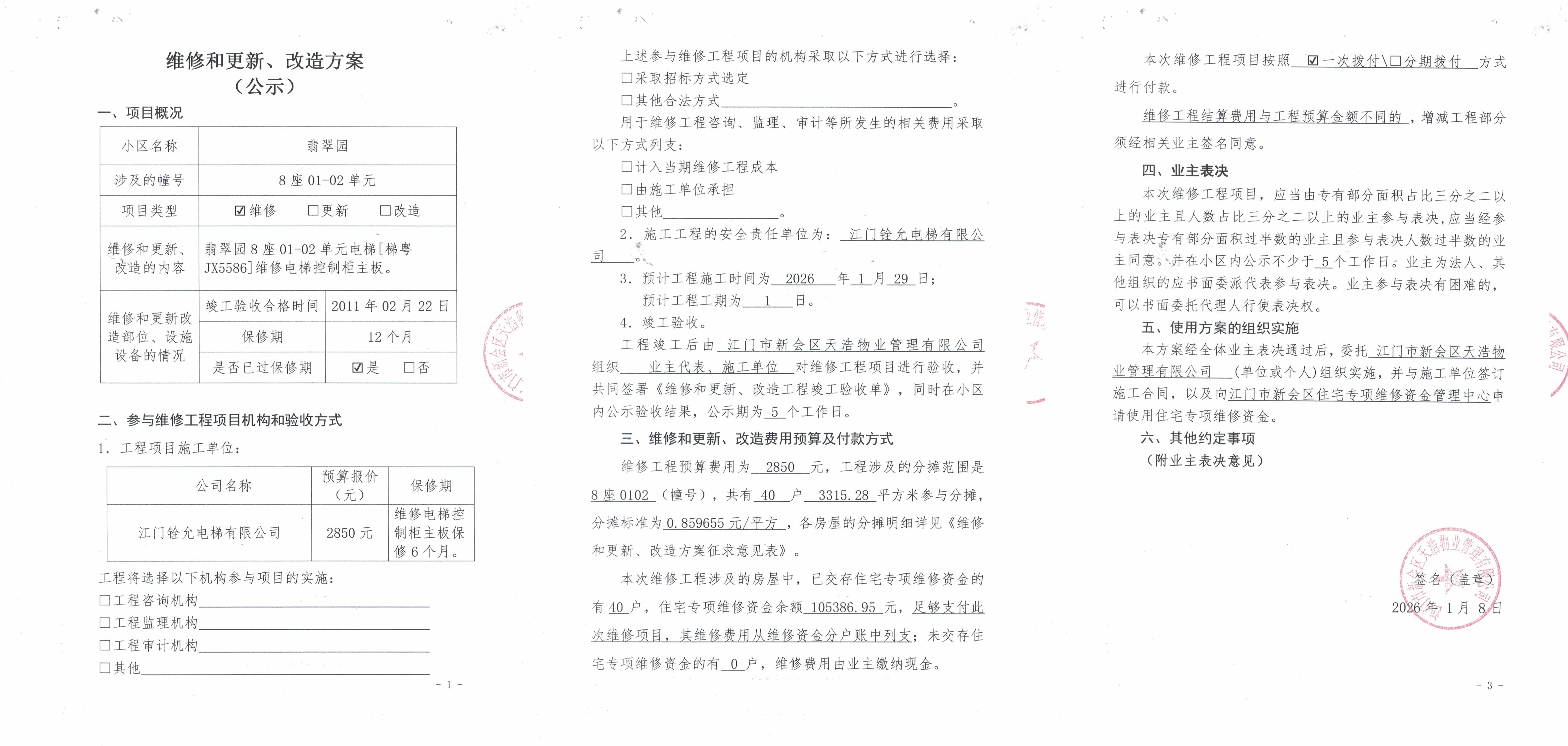 <td VALIGN="top" VALUES="" STYLE="border-width:0" BINDTYPE="0" ROWSPAN="19" COLSPAN="7" DATASOURCE="投票结果" ><font style="font-size:14pt;"><p style="white-space: normal; font-family: 宋体; line-height: 1.75em;">翡翠园翡翠园8座全体业主:</p><p style="white-space: normal; font-family: 宋体; line-height: 1.75em; text-indent: 2em;">本小区关于翡翠园8座0102单元电梯【梯粤JX5586】维修控制柜主板使用维修资金的投票的投票已表决结束,询异时间从2026年01月19日开始,投票询异公示期间,业主可通过微信查询自己的表决情况或可凭身份证件申请查询自己的表决情况;如公示的业主表决情况与查询的本人表决意见不一致的,可以以书面形式向投票组织机构申诉,投票组织机构予以纠正并重新公示表决结果。异议提出人对投票组织机构的处理仍有异议的,可以向街道办事处(镇人民政府)反映处理,涉及住宅专项维修资金的,可向属地住宅专项维修资金管理中心反映处理。</p><p style="white-space: normal;"><br/></p><p style="white-space: normal; font-family: 宋体; line-height: 1.75em;"><strong>附件:</strong></p><p style="white-space: normal; font-family: 宋体; line-height: 1.75em;"><strong>一、投票范围</strong></p><p style="white-space: normal; font-family: 宋体; line-height: 1.75em; text-indent: 2em;">翡翠园翡翠园8座</p><p style="white-space: normal; font-family: 宋体; line-height: 1.75em; text-indent: 2em;">总人数(专有部分人数之和):20</p><p style="white-space: normal; font-family: 宋体; line-height: 1.75em; text-indent: 2em;"><span style="font-family: 宋体, SimSun;"><span style="font-family: 宋体; text-indent: 32px;"><span style="font-family: 宋体; text-indent: 32px;">总户数:40</span></span></span></p><p style="white-space: normal; font-family: 宋体; line-height: 1.75em; text-indent: 2em;">建筑物总面积(专有部分面积之和):3315.28㎡</p><p style="white-space: normal; font-family: 宋体; line-height: 1.75em;"><strong>二、询异公示起止时间</strong></p><p dir="ltr" style="white-space: normal; font-family: 宋体; line-height: 1.75em; text-indent: 2em;"><span style="text-indent: 36px;">2026年01月19日至2026年01月29日</span></p><p style="white-space: normal; font-family: 宋体; line-height: 1.75em;"><strong>三、投票详细描述</strong></p><p style="white-space: normal; font-family: 宋体; line-height: 1.75em; text-indent: 2em;"><p><span style="font-family: 宋体, SimSun; font-size: 14px;"> 翡翠园8座0102单元电梯(梯粤JX5586)控制柜主板故障,配件日常使用自然损坏,已过保修期。</span></p><p><span style="font-family: 宋体, SimSun; font-size: 14px;"> 现需申请使用维修资金对8座0102单元电梯(梯粤JX5586)进行维修,工程维修预算金额为2850元,项目最终费用以施工合同签订金额为准。因已过保修期,维修费用由相关业主按建筑面积分摊,每平方约0.859655元,详见公示附件。如业主手机不能正常通过微信投票,请联系物业公司进行线下纸质投票,物业电话:0750-6602800。</span></p><p><br/></p></p><p style="white-space: normal; font-family: 宋体; line-height: 1.75em;"><strong>四、计票规则</strong></p><p style="white-space: normal; font-family: 宋体; line-height: 1.75em; text-indent: 2em;">表决事项:使用建筑物及其附属设施的维修资金<br /><p style='text-align: left; font-family: 宋体; font-size: 16px; line-height: 1.75em; text-indent: 2em;'>计票规则:弃权票不并入其它项 未表决票不并入其它项</p></p><p style="white-space: normal; font-family: 宋体; line-height: 1.75em;"><strong>五、通过规则</strong></p><p style="white-space: normal; font-family: 宋体; line-height: 1.75em;"><strong><strong style="white-space: normal;"><span style="font-family: 宋体, SimSun;"> 根据《中华人民共和国民法典》第二百七十八条规定:业主共同决定事项,应当由专有部分面积占比三分之二以上的业主且人数占比三分之二以上的业主参与表决。</span></strong></strong></p><p style="white-space: normal; font-family: 宋体; line-height: 1.75em; text-indent: 2em;">表决事项:使用建筑物及其附属设施的维修资金<br /><p style='text-align: left; font-family: 宋体; font-size: 16px; line-height: 1.75em; text-indent: 2em;'>通过规则:双2/3以上参与表决,参与表决双过半同意</p></p><p style="white-space: normal; font-family: 宋体; line-height: 1.75em;"><strong>六、投票结果</strong></p><p style="white-space: normal; font-family: 宋体; line-height: 1.75em; text-indent: 2em;"><div id='resultTable'><table style='table-layout: fixed; font-size:12px; margin-top:10px' width='100%' border='0' cellspacing='0' cellpadding='0'><tr><td height='28' colspan='10' align='center' style='border: 1px solid #666'><strong style='font-size: 14px;'> 使用建筑物及其附属设施的维修资金</strong></td> </tr><tr id='trfirst'><td height='28' colspan='4' style='border-left: 1px solid #666; border-bottom: 1px solid #666'><strong> 申报单位:</strong> 江门市新会区天浩物业管理有限公司</td><td colspan='3' style='border-left: 1px solid #666; border-bottom: 1px solid #666'><strong> 联系方式:</strong> </td><td colspan='3' style='border-left: 1px solid #666; border-bottom: 1px solid #666; border-right: 1px solid #666'><strong> 申报日期:</strong> 2026年1月10日 </td></tr><tr> <td height='28' colspan='5' style='border-left: 1px solid #666; border-bottom: 1px solid #666'><strong> 总人数(专有部分人数之和):</strong>20人 </td><td colspan='5' style='border-left: 1px solid #666; border-bottom: 1px solid #666; border-right: 1px solid #666'><strong> 建筑物总面积(专有部分面积之和):</strong>3315.28㎡ </td> </tr><tr><td height='28' colspan='10' bgcolor='#F3F3F3' style='border-left: 1px solid #666;border-bottom: 1px solid #66