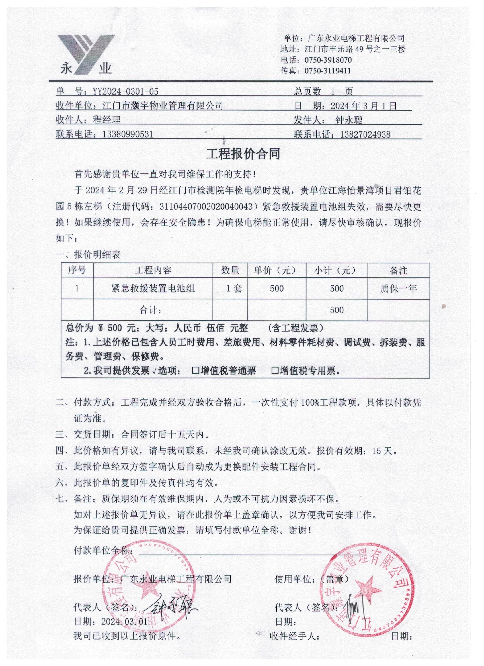 <td VALIGN="top" VALUES="" STYLE="border-width:0" BINDTYPE="0" ROWSPAN="19" COLSPAN="7" DATASOURCE="投票结果" ><font style="font-size:14pt;"><p style="white-space: normal; font-family: 宋体; line-height: 1.75em;">江门市江海区怡景湾君铂花园江门市江海区怡景湾君铂花园5栋全体业主:</p><p style="white-space: normal; font-family: 宋体; line-height: 1.75em; text-indent: 2em;">本小区关于江海怡景湾君铂花园5栋客梯更换紧急救援装置电池的投票已表决结束,询异时间从2024年03月15日开始,投票询异公示期间,业主可通过微信查询自己的表决情况或可凭身份证件申请查询自己的表决情况;如公示的业主表决情况与查询的本人表决意见不一致的,可以以书面形式向投票组织机构申诉,投票组织机构予以纠正并重新公示表决结果。异议提出人对投票组织机构的处理仍有异议的,可以向街道办事处(镇人民政府)反映处理,涉及住宅专项维修资金的,可向属地住宅专项维修资金管理中心反映处理。</p><p style="white-space: normal;"><br/></p><p style="white-space: normal; font-family: 宋体; line-height: 1.75em;"><strong>附件:</strong></p><p style="white-space: normal; font-family: 宋体; line-height: 1.75em;"><strong>一、投票范围</strong></p><p style="white-space: normal; font-family: 宋体; line-height: 1.75em; text-indent: 2em;">江门市江海区怡景湾君铂花园江门市江海区怡景湾君铂花园5栋</p><p style="white-space: normal; font-family: 宋体; line-height: 1.75em; text-indent: 2em;">总人数(专有部分人数之和):93</p><p style="white-space: normal; font-family: 宋体; line-height: 1.75em; text-indent: 2em;"><span style="font-family: 宋体, SimSun;"><span style="font-family: 宋体; text-indent: 32px;"><span style="font-family: 宋体; text-indent: 32px;">总户数:94</span></span></span></p><p style="white-space: normal; font-family: 宋体; line-height: 1.75em; text-indent: 2em;">建筑物总面积(专有部分面积之和):9791.06㎡</p><p style="white-space: normal; font-family: 宋体; line-height: 1.75em;"><strong>二、询异公示起止时间</strong></p><p dir="ltr" style="white-space: normal; font-family: 宋体; line-height: 1.75em; text-indent: 2em;"><span style="text-indent: 36px;">2024年03月15日至2024年03月21日</span></p><p style="white-space: normal; font-family: 宋体; line-height: 1.75em;"><strong>三、投票详细描述</strong></p><p style="white-space: normal; font-family: 宋体; line-height: 1.75em; text-indent: 2em;"><p>小区5栋的客梯经江门市检测院年申时发现,紧急救援装置电池失效,需要跟换。</p><p> 现对5栋客梯进行维修,工程维修预算金额为500元,因已过保修期,维修费用由相关业主按建筑面积分摊,每平方约0.051元,详见公示附件。如业主手机不能正常通过微信投票,请联系物业公司进行线下纸质投票,物业电话:0750-3898816。</p><p><br/></p></p><p style="white-space: normal; font-family: 宋体; line-height: 1.75em;"><strong>四、计票规则</strong></p><p style="white-space: normal; font-family: 宋体; line-height: 1.75em; text-indent: 2em;">表决事项:使用建筑物及其附属设施的维修资金<br /><p style='text-align: left; font-family: 宋体; font-size: 16px; line-height: 1.75em; text-indent: 2em;'>计票规则:弃权票不并入其它项 未表决票不并入其它项</p></p><p style="white-space: normal; font-family: 宋体; line-height: 1.75em;"><strong>五、通过规则</strong></p><p style="white-space: normal; font-family: 宋体; line-height: 1.75em;"><strong><strong style="white-space: normal;"><span style="font-family: 宋体, SimSun;"> 根据《中华人民共和国民法典》第二百七十八条规定:业主共同决定事项,应当由专有部分面积占比三分之二以上的业主且人数占比三分之二以上的业主参与表决。</span></strong></strong></p><p style="white-space: normal; font-family: 宋体; line-height: 1.75em; text-indent: 2em;">表决事项:使用建筑物及其附属设施的维修资金<br /><p style='text-align: left; font-family: 宋体; font-size: 16px; line-height: 1.75em; text-indent: 2em;'>通过规则:双2/3以上参与表决,参与表决双过半同意</p></p><p style="white-space: normal; font-family: 宋体; line-height: 1.75em;"><strong>六、投票结果</strong></p><p style="white-space: normal; font-family: 宋体; line-height: 1.75em; text-indent: 2em;"><div id='resultTable'><table style='table-layout: fixed; font-size:12px; margin-top:10px' width='100%' border='0' cellspacing='0' cellpadding='0'><tr><td height='28' colspan='10' align='center' style='border: 1px solid #666'><strong style='font-size: 14px;'> 使用建筑物及其附属设施的维修资金</strong></td> </tr><tr id='trfirst'><td height='28' colspan='4' style='border-left: 1px solid #666; border-bottom: 1px solid #666'><strong> 申报单位:</strong> 江门市灏宇物业管理有限公司</td><td colspan='3' style='border-left: 1px solid #666; border-bottom: 1px solid #666'><strong> 联系方式:</strong> </td><td colspan='3' style='border-left: 1px solid #666; border-bottom: 1px solid #666; border-right: 1px solid #666'><strong> 申报日期:</strong> 2024年3月8日 </td></tr><tr> <td height='28' colspan='5' style='border-left: 1px solid #666; border-bottom: 1px solid #666'><strong> 总人数(专有部分人数之和):</strong>93人 </td><td colspan='5' style='border-left: 1px solid #666; border-bottom: 1px solid #666; border-right: 1px solid #666'><strong> 建筑物总面积(专有部分面积之和):</strong>9791.06㎡ </td> </tr><tr><td height='28' colspan='10' bgcolor='#F3F3F3' style='border-left: 1px solid #666;border-bottom: 1px solid #666;border-right: 1px solid #666'><strong> 参与人数及面积统计</strong></td></tr><tr><td height='28' colspan='5' style='border-left: 1px solid #666; border-bottom: 1px 
