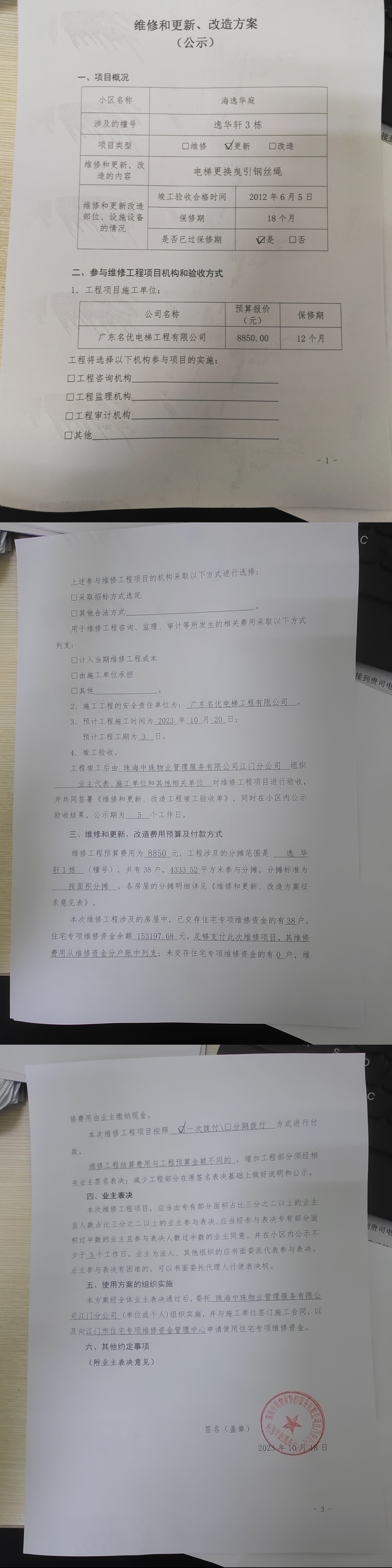 <td VALIGN="top" VALUES="" STYLE="border-width:0" BINDTYPE="0" ROWSPAN="19" COLSPAN="7" DATASOURCE="投票结果" ><font style="font-size:14pt;"><p style="white-space: normal; font-family: 宋体; line-height: 1.75em;">海逸华庭江海区海逸华庭逸华轩3幢全体业主:</p><p style="white-space: normal; font-family: 宋体; line-height: 1.75em; text-indent: 2em;">本小区关于海逸华庭逸华轩3栋电梯更换曳引钢丝绳的投票已表决结束,询异时间从2023年11月01日开始,投票询异公示期间,业主可通过微信查询自己的表决情况或可凭身份证件申请查询自己的表决情况;如公示的业主表决情况与查询的本人表决意见不一致的,可以以书面形式向投票组织机构申诉,投票组织机构予以纠正并重新公示表决结果。异议提出人对投票组织机构的处理仍有异议的,可以向街道办事处(镇人民政府)反映处理,涉及住宅专项维修资金的,可向属地住宅专项维修资金管理中心反映处理。</p><p style="white-space: normal;"><br/></p><p style="white-space: normal; font-family: 宋体; line-height: 1.75em;"><strong>附件:</strong></p><p style="white-space: normal; font-family: 宋体; line-height: 1.75em;"><strong>一、投票范围</strong></p><p style="white-space: normal; font-family: 宋体; line-height: 1.75em; text-indent: 2em;">海逸华庭江海区海逸华庭逸华轩3幢</p><p style="white-space: normal; font-family: 宋体; line-height: 1.75em; text-indent: 2em;">总人数(专有部分人数之和):36</p><p style="white-space: normal; font-family: 宋体; line-height: 1.75em; text-indent: 2em;"><span style="font-family: 宋体, SimSun;">总户数:38</span></p><p style="white-space: normal; font-family: 宋体; line-height: 1.75em; text-indent: 2em;">建筑物总面积(专有部分面积之和):4333.52㎡</p><p style="white-space: normal; font-family: 宋体; line-height: 1.75em;"><strong>二、询异公示起止时间</strong></p><p dir="ltr" style="white-space: normal; font-family: 宋体; line-height: 1.75em; text-indent: 2em;"><span style="text-indent: 36px;">2023年11月01日至2023年11月07日</span></p><p style="white-space: normal; font-family: 宋体; line-height: 1.75em;"><strong>三、投票详细描述</strong></p><p style="white-space: normal; font-family: 宋体; line-height: 1.75em; text-indent: 2em;"><p><span style="font-family: 宋体;letter-spacing: 0;font-size: 14px;background: rgb(255, 255, 255)"><span style="font-family:宋体">本小区海逸华庭逸</span></span><span style="font-family: 宋体;letter-spacing: 0;font-size: 14px;background: rgb(255, 255, 255)"><span style="font-family:宋体">华</span></span><span style="font-family: 宋体;letter-spacing: 0;font-size: 14px;background: rgb(255, 255, 255)"><span style="font-family:宋体">轩</span></span><span style="font-family: 宋体;letter-spacing: 0;font-size: 14px;background: rgb(255, 255, 255)"><span style="font-family:宋体">3</span></span><span style="font-family: 宋体;letter-spacing: 0;font-size: 14px;background: rgb(255, 255, 255)"><span style="font-family:宋体">栋的</span></span><span style="font-family: 宋体;letter-spacing: 0;font-size: 14px;background: rgb(255, 255, 255)"><span style="font-family:宋体">电</span></span><span style="font-family: 宋体;letter-spacing: 0;font-size: 14px;background: rgb(255, 255, 255)"><span style="font-family:宋体">梯,</span></span><span style="font-family: 宋体;letter-spacing: 0;font-size: 14px;background: rgb(255, 255, 255)"><span style="font-family:宋体">接到反映电梯突然停止运行,经维保公司现场检查</span></span><span style="font-family: 宋体;letter-spacing: 0;font-size: 14px;background: rgb(255, 255, 255)"><span style="font-family:宋体">,发现该</span></span><span style="font-family: 宋体;letter-spacing: 0;font-size: 14px;background: rgb(255, 255, 255)"><span style="font-family:宋体">栋电梯曳引钢丝绳散股所致</span></span><span style="font-family: 宋体;letter-spacing: 0;font-size: 14px;background: rgb(255, 255, 255)"><span style="font-family:宋体">,需对该栋电梯</span></span><span style="font-family: 宋体;letter-spacing: 0;font-size: 14px;background: rgb(255, 255, 255)"><span style="font-family:宋体">曳引</span></span><span style="font-family: 宋体;letter-spacing: 0;font-size: 14px;background: rgb(255, 255, 255)"><span style="font-family:宋体">钢丝绳进行更换,已过保修期。现需申请使用维修资金对海逸华庭逸</span></span><span style="font-family: 宋体;letter-spacing: 0;font-size: 14px;background: rgb(255, 255, 255)"><span style="font-family:宋体">华</span></span><span style="font-family: 宋体;letter-spacing: 0;font-size: 14px;background: rgb(255, 255, 255)"><span style="font-family:宋体">轩</span></span><span style="font-family: 宋体;letter-spacing: 0;font-size: 14px;background: rgb(255, 255, 255)"><span style="font-family:Calibri">3</span></span><span style="font-family: 宋体;letter-spacing: 0;font-size: 14px;background: rgb(255, 255, 255)"><span style="font-family:宋体">栋</span></span><span style="font-family: 宋体;letter-spacing: 0;font-size: 14px;background: rgb(255, 255, 255)"><span style="font-family:宋体">电梯</span></span><span style="font-family: 宋体;letter-spacing: 0;font-size: 14px;background: rgb(255, 255, 255)"><span style="font-family:宋体">维修,工程维修预算金额为</span></span><span style="font-family: 宋体;letter-spacing: 0;font-size: 14px;background: rgb(255, 255, 255)"><span style="font-family:Calibri">8850</span></span><span style="font-family: 宋体;letter-spacing: 0;font-size: 14px;background: rgb(255, 255, 255)"><span style="font-family:宋体">元,项目最终费用以施工合同签订金额为准,维修费用的分摊标准为按建筑面积分摊,每平方约:</span></span><span style="font-family: 宋体;letter-spacing: 0;font-size: 14px;background: rgb(255, 255, 255