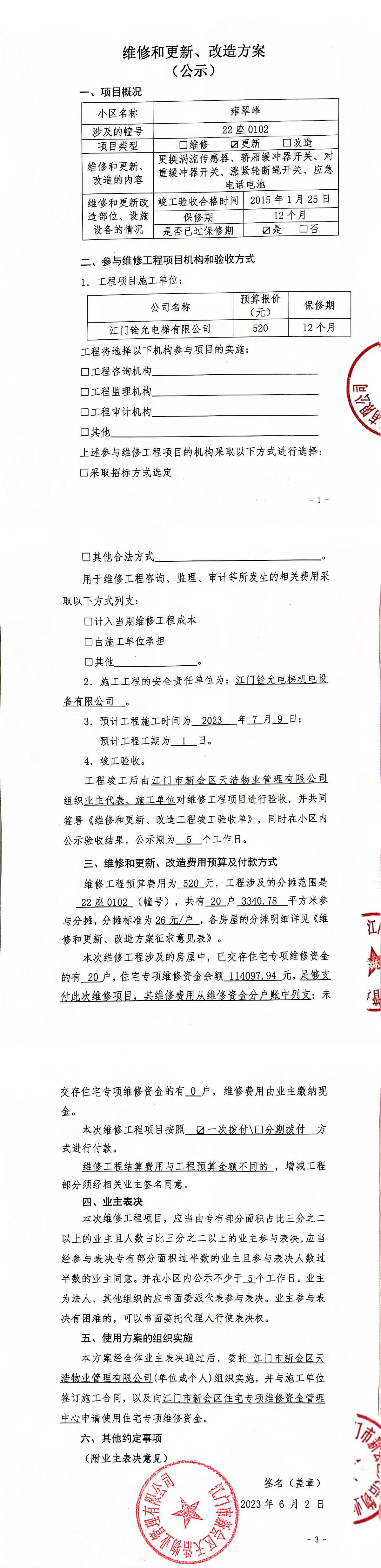 <td VALIGN="top" VALUES="" STYLE="border-width:0" BINDTYPE="0" ROWSPAN="19" COLSPAN="7" DATASOURCE="投票结果" ><font style="font-size:14pt;"><p style="white-space: normal; font-family: 宋体; line-height: 1.75em;">雍翠峰雍翠峰22座全体业主:</p><p style="white-space: normal; font-family: 宋体; line-height: 1.75em; text-indent: 2em;">本小区关于雍翠峰22座0102更换涡流传感器、轿厢缓冲器开关、对重缓冲器开关、涨紧轮断绳开关和应急电话电池使用维修资金的投票的投票已表决结束,询异时间从2023年06月06日开始,投票询异公示期间,业主可通过微信查询自己的表决情况或可凭身份证件申请查询自己的表决情况;如公示的业主表决情况与查询的本人表决意见不一致的,可以以书面形式向投票组织机构申诉,投票组织机构予以纠正并重新公示表决结果。异议提出人对投票组织机构的处理仍有异议的,可以向街道办事处(镇人民政府)反映处理,涉及住宅专项维修资金的,可向属地住宅专项维修资金管理中心反映处理。</p><p style="white-space: normal;"><br/></p><p style="white-space: normal; font-family: 宋体; line-height: 1.75em;"><strong>附件:</strong></p><p style="white-space: normal; font-family: 宋体; line-height: 1.75em;"><strong>一、投票范围</strong></p><p style="white-space: normal; font-family: 宋体; line-height: 1.75em; text-indent: 2em;">雍翠峰雍翠峰22座</p><p style="white-space: normal; font-family: 宋体; line-height: 1.75em; text-indent: 2em;">总人数(专有部分人数之和):20</p><p style="white-space: normal; font-family: 宋体; line-height: 1.75em; text-indent: 2em;"><span style="font-family: 宋体, SimSun;">总户数:20</span></p><p style="white-space: normal; font-family: 宋体; line-height: 1.75em; text-indent: 2em;">建筑物总面积(专有部分面积之和):3340.78㎡</p><p style="white-space: normal; font-family: 宋体; line-height: 1.75em;"><strong>二、询异公示起止时间</strong></p><p dir="ltr" style="white-space: normal; font-family: 宋体; line-height: 1.75em; text-indent: 2em;"><span style="text-indent: 36px;">2023年06月06日至2023年06月12日</span></p><p style="white-space: normal; font-family: 宋体; line-height: 1.75em;"><strong>三、投票详细描述</strong></p><p style="white-space: normal; font-family: 宋体; line-height: 1.75em; text-indent: 2em;"><p>雍翠峰小区22座0102的电梯故障,经检查,是由于轿底称重涡流传感器故障、开关锈蚀损坏(轿厢缓冲器开关、对重缓冲器开关、涨紧轮断绳开关)和应急电话电池失效,为日常使用自然磨损损坏,已过保修期。</p><p>现需申请使用维修资金对22座0102电梯进行维修,工程维修预算金额为520元,项目最终费用以施工合同签订金额为准。维修费用的分摊标准为按分户分摊,每户分摊26元,详见公示附件。如业主手机不能正常通过维修投票,请联系物业公司进行线下纸质投票,物业电话:0750-6125500</p><p><br/></p></p><p style="white-space: normal; font-family: 宋体; line-height: 1.75em;"><strong>四、计票规则</strong></p><p style="white-space: normal; font-family: 宋体; line-height: 1.75em; text-indent: 2em;">表决事项:使用建筑物及其附属设施的维修资金<br /><p style='text-align: left; font-family: 宋体; font-size: 16px; line-height: 1.75em; text-indent: 2em;'>计票规则:弃权票不并入其它项 未表决票不并入其它项</p></p><p style="white-space: normal; font-family: 宋体; line-height: 1.75em;"><strong>五、通过规则</strong></p><p style="white-space: normal; font-family: 宋体; line-height: 1.75em; text-indent: 2em;">表决事项:使用建筑物及其附属设施的维修资金<br /><p style='text-align: left; font-family: 宋体; font-size: 16px; line-height: 1.75em; text-indent: 2em;'>通过规则:参与表决专有部分面积过半数的业主且参与表决人数过半数的业主同意</p></p><p style="white-space: normal; font-family: 宋体; line-height: 1.75em;"><strong>六、投票结果</strong></p><p style="white-space: normal; font-family: 宋体; line-height: 1.75em; text-indent: 2em;"><div id='resultTable'><table style='table-layout: fixed; font-size:12px; margin-top:10px' width='100%' border='0' cellspacing='0' cellpadding='0'><tr><td height='28' colspan='10' align='center' style='border: 1px solid #666'><strong style='font-size: 14px;'> 使用建筑物及其附属设施的维修资金</strong></td> </tr><tr id='trfirst'><td height='28' colspan='4' style='border-left: 1px solid #666; border-bottom: 1px solid #666'><strong> 申报单位:</strong> 江门市新会区天浩物业管理有限公司</td><td colspan='3' style='border-left: 1px solid #666; border-bottom: 1px solid #666'><strong> 联系方式:</strong> </td><td colspan='3' style='border-left: 1px solid #666; border-bottom: 1px solid #666; border-right: 1px solid #666'><strong> 申报日期:</strong> 2023年6月2日 </td></tr><tr> <td height='28' colspan='5' style='border-left: 1px solid #666; border-bottom: 1px solid #666'><strong> 总人数(专有部分人数之和):</strong>20人 </td><td colspan='5' style='border-left: 1px solid #666; border-bottom: 1px solid #666; border-right: 1px solid #666'><strong> 建筑物总面积(专有部分面积之和):</strong>3340.78㎡ </td> </tr><tr><td height='28' colspan='10' bgcolor='#F3F3F3' style='border-left: 1px solid #666;border-bottom: 1px solid #666;border-right: 1px solid #666'><strong> 参与人数及面积统计</strong></td></tr><tr><td height='28' colspan='5' style='border-left: 1px solid #666; border-bottom: 1px solid #666'><strong> 参与表决专有部分人数之和:</strong>15人</td><td colspan='5' style='border-left: 1px solid #666; border-bottom: 1px solid #666; border-right: 1px solid #666'><strong> 参与表决占有表决权总人数比例:</strong>75.00%</td></tr><tr><td height='