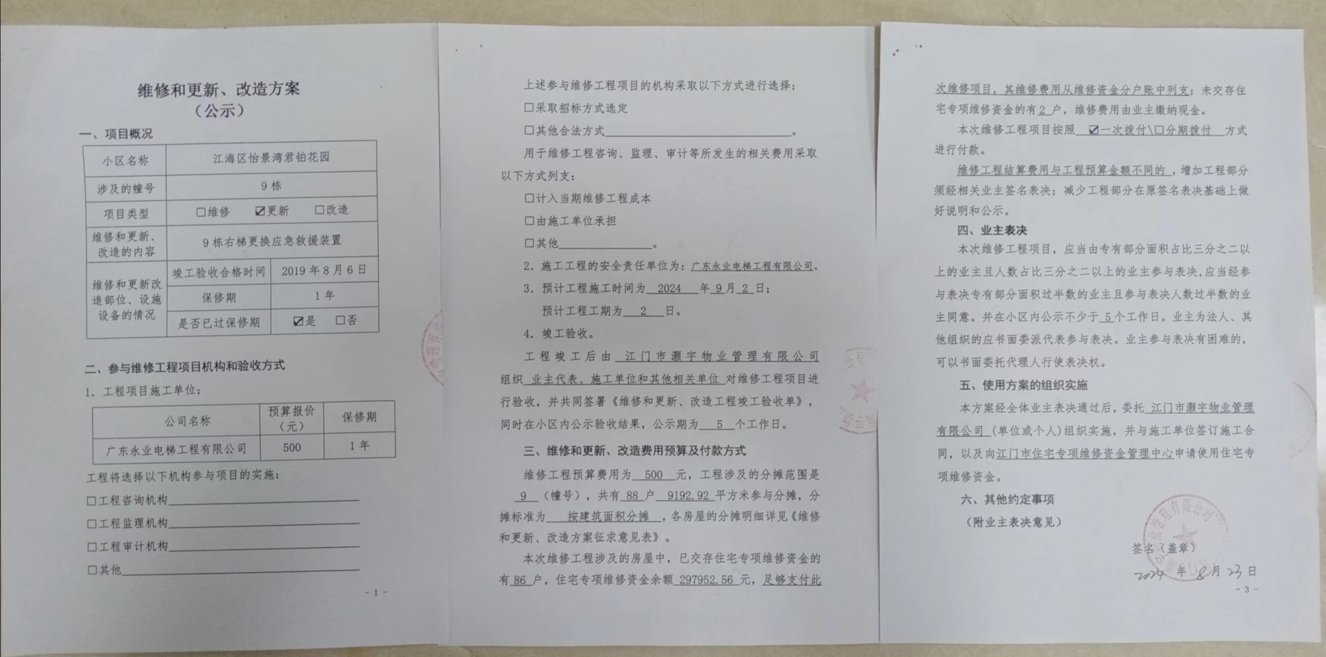 <td VALIGN="top" VALUES="" STYLE="border-width:0" BINDTYPE="0" ROWSPAN="19" COLSPAN="7" DATASOURCE="投票结果" ><font style="font-size:14pt;"><p style="white-space: normal; font-family: 宋体; line-height: 1.75em;">江门市江海区怡景湾君铂花园江门市江海区怡景湾君铂花园9栋全体业主:</p><p style="white-space: normal; font-family: 宋体; line-height: 1.75em; text-indent: 2em;">本小区关于江门市江海区怡景湾君铂花园9栋右梯更换应急救援装置使用维修资金的投票的投票已表决结束,询异时间从2024年09月02日开始,投票询异公示期间,业主可通过微信查询自己的表决情况或可凭身份证件申请查询自己的表决情况;如公示的业主表决情况与查询的本人表决意见不一致的,可以以书面形式向投票组织机构申诉,投票组织机构予以纠正并重新公示表决结果。异议提出人对投票组织机构的处理仍有异议的,可以向街道办事处(镇人民政府)反映处理,涉及住宅专项维修资金的,可向属地住宅专项维修资金管理中心反映处理。</p><p style="white-space: normal;"><br/></p><p style="white-space: normal; font-family: 宋体; line-height: 1.75em;"><strong>附件:</strong></p><p style="white-space: normal; font-family: 宋体; line-height: 1.75em;"><strong>一、投票范围</strong></p><p style="white-space: normal; font-family: 宋体; line-height: 1.75em; text-indent: 2em;">江门市江海区怡景湾君铂花园江门市江海区怡景湾君铂花园9栋</p><p style="white-space: normal; font-family: 宋体; line-height: 1.75em; text-indent: 2em;">总人数(专有部分人数之和):88</p><p style="white-space: normal; font-family: 宋体; line-height: 1.75em; text-indent: 2em;"><span style="font-family: 宋体, SimSun;"><span style="font-family: 宋体; text-indent: 32px;"><span style="font-family: 宋体; text-indent: 32px;">总户数:88</span></span></span></p><p style="white-space: normal; font-family: 宋体; line-height: 1.75em; text-indent: 2em;">建筑物总面积(专有部分面积之和):9192.92㎡</p><p style="white-space: normal; font-family: 宋体; line-height: 1.75em;"><strong>二、询异公示起止时间</strong></p><p dir="ltr" style="white-space: normal; font-family: 宋体; line-height: 1.75em; text-indent: 2em;"><span style="text-indent: 36px;">2024年09月02日至2024年09月08日</span></p><p style="white-space: normal; font-family: 宋体; line-height: 1.75em;"><strong>三、投票详细描述</strong></p><p style="white-space: normal; font-family: 宋体; line-height: 1.75em; text-indent: 2em;"><p><span style=";font-family:宋体;font-size:14px"><span style="font-family:宋体"> 江海怡景湾君铂花园</span><span style="font-family:Calibri">9</span><span style="font-family:宋体">栋右梯经江门市检测院年检电梯时发现</span><span style="font-family:Calibri">9</span><span style="font-family:宋体">栋右梯应急救援装置失效,存在安全隐患。</span></span></p><p><span style=";font-family:宋体;font-size:14px"><span style="font-family:宋体"> 现对9栋右梯进行更换应急救援装置,工程维修预算金额为500元,项目最终费用以施工合同签订金额为准。因已过保修期,维修费用由相关业主按建筑面积分摊,每平方约0.055元,详见公示附件。如业主</span><span style="font-family:宋体">手机不能正常通过微信投票,请联系物业公司进行线下纸质投票,物业公司联系电话:</span><span style="font-family:Calibri">0750-3898816</span></span></p><p><br/></p></p><p style="white-space: normal; font-family: 宋体; line-height: 1.75em;"><strong>四、计票规则</strong></p><p style="white-space: normal; font-family: 宋体; line-height: 1.75em; text-indent: 2em;">表决事项:使用建筑物及其附属设施的维修资金<br /><p style='text-align: left; font-family: 宋体; font-size: 16px; line-height: 1.75em; text-indent: 2em;'>计票规则:弃权票不并入其它项 未表决票不并入其它项</p></p><p style="white-space: normal; font-family: 宋体; line-height: 1.75em;"><strong>五、通过规则</strong></p><p style="white-space: normal; font-family: 宋体; line-height: 1.75em;"><strong><strong style="white-space: normal;"><span style="font-family: 宋体, SimSun;"> 根据《中华人民共和国民法典》第二百七十八条规定:业主共同决定事项,应当由专有部分面积占比三分之二以上的业主且人数占比三分之二以上的业主参与表决。</span></strong></strong></p><p style="white-space: normal; font-family: 宋体; line-height: 1.75em; text-indent: 2em;">表决事项:使用建筑物及其附属设施的维修资金<br /><p style='text-align: left; font-family: 宋体; font-size: 16px; line-height: 1.75em; text-indent: 2em;'>通过规则:双2/3以上参与表决,参与表决双过半同意</p></p><p style="white-space: normal; font-family: 宋体; line-height: 1.75em;"><strong>六、投票结果</strong></p><p style="white-space: normal; font-family: 宋体; line-height: 1.75em; text-indent: 2em;"><div id='resultTable'><table style='table-layout: fixed; font-size:12px; margin-top:10px' width='100%' border='0' cellspacing='0' cellpadding='0'><tr><td height='28' colspan='10' align='center' style='border: 1px solid #666'><strong style='font-size: 14px;'> 使用建筑物及其附属设施的维修资金</strong></td> </tr><tr id='trfirst'><td height='28' colspan='4' style='border-left: 1px solid #666; border-bottom: 1px solid #666'><strong> 申报单位:</strong> 江门市灏宇物业管理有限公司</td><td colspan='3' style='border-left: 1px solid #666; border-bottom: 1px solid #666'><strong> 联系方式:</strong> </td><td colspan='3' style='border-left: 1px solid #666; border-bottom: 1px solid #666; border-right: 1px solid #666'><strong> 申报日期:</strong> 2024年8月25日 </td></tr><tr> <td height='28' colspan='5' style='border-left: 1px solid #666