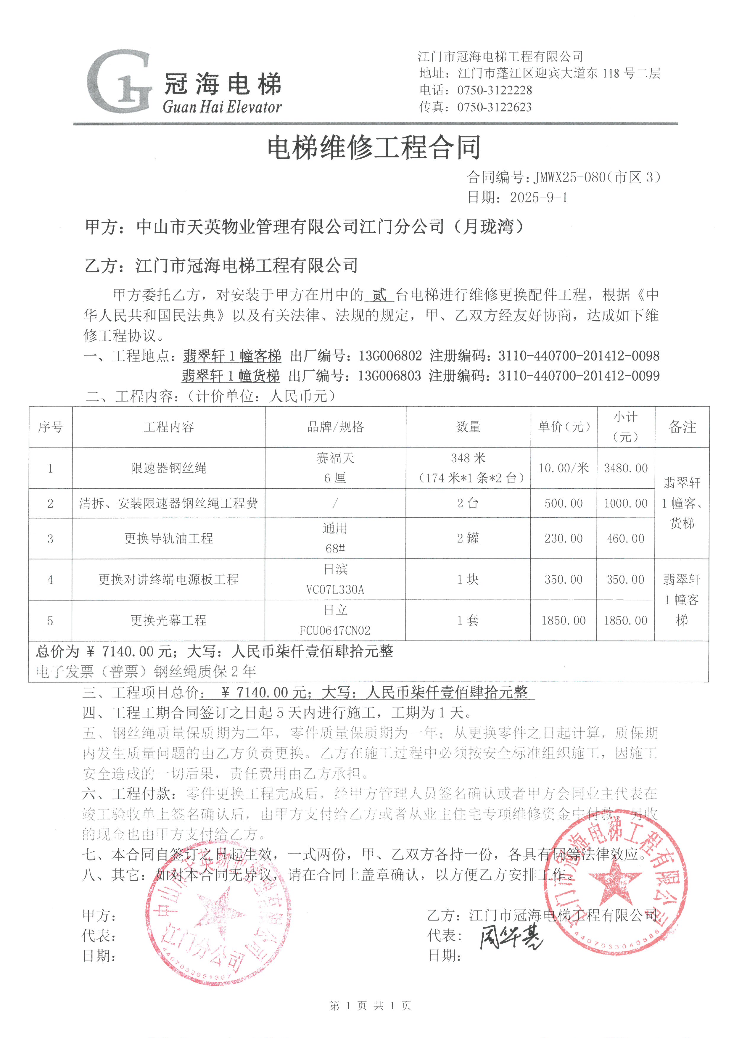 <br/>现对翡翠轩1幢的客梯、货梯进行维修,工程维修预算金额为7140元,项目最终费用以施工合同签订金额为准。因已过保修期,维修费用由相关业主按建筑面积分摊,每平方约0.72元,详见公示附件。如业主手机不能正常通过微信投票,请联系物业公司或者管家进行线下纸质投票,物业电话:0750-2037899或者联系管家号码:18026834750</p></p><p style="white-space: normal; font-family: 宋体; line-height: 1.75em;"><strong>四、计票规则</strong></p><p style="white-space: normal; font-family: 宋体; line-height: 1.75em; text-indent: 2em;">表决事项:月珑湾豪庭翡翠轩1幢客梯、货梯更换限速钢丝绳和补充导轨油,客梯更换对讲终端电源板、光幕使用维修资金的投票<br /><p style='text-align: left; font-family: 宋体; font-size: 16px; line-height: 1.75em; text-indent: 2em;'>计票规则:弃权票不并入其它项 未表决票不并入其它项</p></p><p style="white-space: normal; font-family: 宋体; line-height: 1.75em;"><strong>五、通过规则</strong></p><p style="white-space: normal; font-family: 宋体; line-height: 1.75em;"><strong><strong style="white-space: normal;"><span style="font-family: 宋体, SimSun;"> 根据《中华人民共和国民法典》第二百七十八条规定:业主共同决定事项,应当由专有部分面积占比三分之二以上的业主且人数占比三分之二以上的业主参与表决。</span></strong></strong></p><p style="white-space: normal; font-family: 宋体; line-height: 1.75em; text-indent: 2em;">表决事项:月珑湾豪庭翡翠轩1幢客梯、货梯更换限速钢丝绳和补充导轨油,客梯更换对讲终端电源板、光幕使用维修资金的投票<br /><p style='text-align: left; font-family: 宋体; font-size: 16px; line-height: 1.75em; text-indent: 2em;'>通过规则:双2/3以上参与表决,参与表决双过半同意</p></p><p style="white-space: normal; font-family: 宋体; line-height: 1.75em;"><strong>六、投票结果</strong></p><p style="white-space: normal; font-family: 宋体; line-height: 1.75em; text-indent: 2em;"><div id='resultTable'><table style='table-layout: fixed; font-size:12px; margin-top:10px' width='100%' border='0' cellspacing='0' cellpadding='0'><tr><td height='28' colspan='10' align='center' style='border: 1px solid #666'><strong style='font-size: 14px;'> 月珑湾豪庭翡翠轩1幢客梯、货梯更换限速钢丝绳和补充导轨油,客梯更换对讲终端电源板、光幕使用维修资金的投票</strong></td> </tr><tr id='trfirst'><td height='28' colspan='4' style='border-left: 1px solid #666; border-bottom: 1px solid #666'><strong> 申报单位:</strong> 中山市天英物业管理有限公司江门分公司</td><td colspan='3' style='border-left: 1px solid #666; border-bottom: 1px solid #666'><strong> 联系方式:</strong> 2037899 </td><td colspan='3' style='border-left: 1px solid #666; border-bottom: 1px solid #666; border-right: 1px solid #666'><strong> 申报日期:</strong> 2025年10月25日 </td></tr><tr> <td height='28' colspan='5' style='border-left: 1px solid #666; border-bottom: 1px solid #666'><strong> 总人数(专有部分人数之和):</strong>98人 </td><td colspan='5' style='border-left: 1px solid #666; border-bottom: 1px solid #666; border-right: 1px solid #666'><strong> 建筑物总面积(专有部分面积之和):</strong>9959.98㎡ </td> </tr><tr><td height='28' colspan='10' bgcolor='#F3F3F3' style='border-left: 1px solid #666;border-bottom: 1px solid #666;border-right: 1px solid #666'><strong> 参与人数及面积统计</strong></td></tr><tr><td height='28' colspan='5' style='border-left: 1px solid #666; border-bottom: 1px solid #666'><strong> 参与表决专有部分人数之和:</strong>66人</td><td colspan='5' style='border-left: 1px solid #666; border-bottom: 1px solid #666; border-right: 1px solid #666'><strong> 参与表决占有表决权总人数比例:</strong>67.35%</td></tr><tr><td height='28' colspan='5' style='border-left: 1px solid #666; border-bottom: 1px solid #666'><strong> 参与表决专有部分面积之和:</strong>6697.91㎡</td><td colspan='5' style='border-left: 1px solid #666; border-bottom: 1px solid #666; border-right: 1px solid #666'><strong> 参与表决占有表决权总面积比例:</strong>67.25%</td></tr><tr><td height='28' colspan='10' bgcolor='#F3F3F3' style='border-left: 1px solid #666; border-bottom: 1px solid #666;border-right: 1px solid #666'> <strong> 参与表决同意人数及面积统计</strong></td> </tr><tr><td height='28' colspan='5' style='border-left: 1px solid #666; border-bottom: 1px solid #666'><strong> 参与表决同意人数:</strong>59人 </td><td colspan='5' style='border-left: 1px solid #666; border-bottom: 1px solid #666; border-right: 1px solid #666'><strong> 参与表决同意人数占参与表决人数比例:</strong>89.39%</td></tr><tr><td height='28' colspan='5' style='border-left: 1px solid #666; border-bottom: 1px solid #666'><strong> 参与表决同意面积:</strong>5964.60㎡</td><td colspan='5' style='border-left: 1px solid #666; border-bottom: 1px solid #666; border-right: 1px solid #666'><strong> 参与表决同意面积占参与表决面积比例:</strong>89.05% </td> </tr><tr><td width='6%' rowspan='2' align='center' bgcolor='#F3F3F3' style='border-left: 1px solid #666; border-bottom: 1px solid #666'><strong>序号</strong></td><td width='11%' rowspan='2' align='center' bgcolor='#F3F3F3' style='border-left: 1px solid #666; border-bottom: 1px solid #666'><strong>候选项</strong></td><td height='28' colspan='2' align='center' bgcolor='#F3F3F3' style='border-left: 1px solid #666; border-bottom: 1px solid #666'><strong>表决人数情况</strong> </td><td colspan='2' align='center' bgcolor='#F3F3F3' style='border-left: 1px solid #666; border-bottom: 1px solid #666'><strong>表决面积情况</strong></td><td colspan='4' align='center' bgcolor='#F3F3F3' style='border-left: