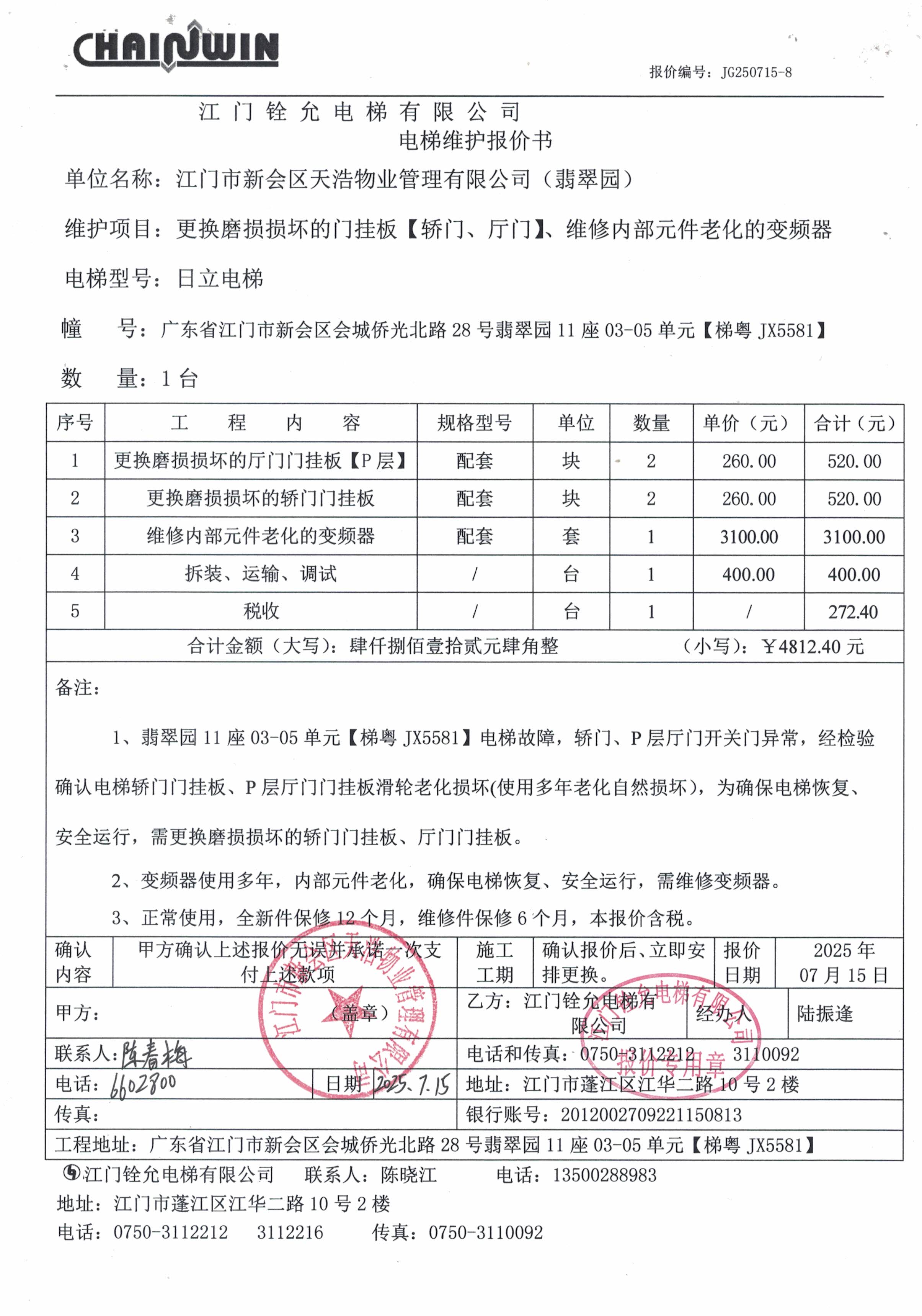 <td VALIGN="top" VALUES="" STYLE="border-width:0" BINDTYPE="0" ROWSPAN="19" COLSPAN="7" DATASOURCE="投票结果" ><font style="font-size:14pt;"><p style="white-space: normal; font-family: 宋体; line-height: 1.75em;">翡翠园翡翠园11座全体业主:</p><p style="white-space: normal; font-family: 宋体; line-height: 1.75em; text-indent: 2em;">本小区关于翡翠园11座03-05单元电梯(梯粤JX5581)更换厅门门挂板、轿门门挂板和维修变频器使用维修资金的投票的投票已表决结束,询异时间从2025年08月05日开始,投票询异公示期间,业主可通过微信查询自己的表决情况或可凭身份证件申请查询自己的表决情况;如公示的业主表决情况与查询的本人表决意见不一致的,可以以书面形式向投票组织机构申诉,投票组织机构予以纠正并重新公示表决结果。异议提出人对投票组织机构的处理仍有异议的,可以向街道办事处(镇人民政府)反映处理,涉及住宅专项维修资金的,可向属地住宅专项维修资金管理中心反映处理。</p><p style="white-space: normal;"><br/></p><p style="white-space: normal; font-family: 宋体; line-height: 1.75em;"><strong>附件:</strong></p><p style="white-space: normal; font-family: 宋体; line-height: 1.75em;"><strong>一、投票范围</strong></p><p style="white-space: normal; font-family: 宋体; line-height: 1.75em; text-indent: 2em;">翡翠园翡翠园11座</p><p style="white-space: normal; font-family: 宋体; line-height: 1.75em; text-indent: 2em;">总人数(专有部分人数之和):24</p><p style="white-space: normal; font-family: 宋体; line-height: 1.75em; text-indent: 2em;"><span style="font-family: 宋体, SimSun;"><span style="font-family: 宋体; text-indent: 32px;"><span style="font-family: 宋体; text-indent: 32px;">总户数:42</span></span></span></p><p style="white-space: normal; font-family: 宋体; line-height: 1.75em; text-indent: 2em;">建筑物总面积(专有部分面积之和):3587.24㎡</p><p style="white-space: normal; font-family: 宋体; line-height: 1.75em;"><strong>二、询异公示起止时间</strong></p><p dir="ltr" style="white-space: normal; font-family: 宋体; line-height: 1.75em; text-indent: 2em;"><span style="text-indent: 36px;">2025年08月05日至2025年08月15日</span></p><p style="white-space: normal; font-family: 宋体; line-height: 1.75em;"><strong>三、投票详细描述</strong></p><p style="white-space: normal; font-family: 宋体; line-height: 1.75em; text-indent: 2em;"><p style="font-family: "Helvetica Neue", Helvetica, Arial, sans-serif; font-size: 14px; text-wrap-mode: wrap; background-color: rgb(255, 255, 255);"> 翡翠园11座03-05单元电梯(梯粤JX5581)电梯开关门异常,经检验确认电梯轿门门挂板、P层厅门门挂板滑轮老化损坏,变频器内部元件老化,需更换厅门门挂板、轿门门挂板和维修变频器,已过保修期。</p><p style="font-family: "Helvetica Neue", Helvetica, Arial, sans-serif; font-size: 14px; text-wrap-mode: wrap; background-color: rgb(255, 255, 255);"> 现需申请使用维修资金对11座03-05单元电梯<span style="text-wrap-style: initial;">(梯粤JX5581)进行维修,工程维修预算金额为4812.4元,项目最终费用以施工合同签订金额为准。因已过保修期,维修费用由相关业主按建筑面积分摊,每平方约1.34154元,详见公示附件。如业主手机不能正常通过微信投票,请联系物业公司进行线下纸质投票,物业电话:0750-6602800。</span></p><p><br/></p></p><p style="white-space: normal; font-family: 宋体; line-height: 1.75em;"><strong>四、计票规则</strong></p><p style="white-space: normal; font-family: 宋体; line-height: 1.75em; text-indent: 2em;">表决事项:使用建筑物及其附属设施的维修资金<br /><p style='text-align: left; font-family: 宋体; font-size: 16px; line-height: 1.75em; text-indent: 2em;'>计票规则:弃权票不并入其它项 未表决票不并入其它项</p></p><p style="white-space: normal; font-family: 宋体; line-height: 1.75em;"><strong>五、通过规则</strong></p><p style="white-space: normal; font-family: 宋体; line-height: 1.75em;"><strong><strong style="white-space: normal;"><span style="font-family: 宋体, SimSun;"> 根据《中华人民共和国民法典》第二百七十八条规定:业主共同决定事项,应当由专有部分面积占比三分之二以上的业主且人数占比三分之二以上的业主参与表决。</span></strong></strong></p><p style="white-space: normal; font-family: 宋体; line-height: 1.75em; text-indent: 2em;">表决事项:使用建筑物及其附属设施的维修资金<br /><p style='text-align: left; font-family: 宋体; font-size: 16px; line-height: 1.75em; text-indent: 2em;'>通过规则:双2/3以上参与表决,参与表决双过半同意</p></p><p style="white-space: normal; font-family: 宋体; line-height: 1.75em;"><strong>六、投票结果</strong></p><p style="white-space: normal; font-family: 宋体; line-height: 1.75em; text-indent: 2em;"><div id='resultTable'><table style='table-layout: fixed; font-size:12px; margin-top:10px' width='100%' border='0' cellspacing='0' cellpadding='0'><tr><td height='28' colspan='10' align='center' style='border: 1px solid #666'><strong style='font-size: 14px;'> 使用建筑物及其附属设施的维修资金</strong></td> </tr><tr id='trfirst'><td height='28' colspan='4' style='border-left: 1px solid #666; border-bottom: 1px solid #666'><strong> 申报单位:</strong> 江门市新会区天浩物业管理有限公司</td><td colspan='3' style='border-left: 1px solid #666; border-bottom: 1px solid #666'><strong> 联系方式:</strong> </td><td colspan='3' style='border-left: 1px solid #666; border-bottom: 1px solid #666; border-right: 1px solid #666'><strong> 申报日期:</strong> 2025年7月17日 </td></tr><tr> <td height='28' colspan='5' style='border-left: 1px solid #666; border-bottom: 1px solid #6