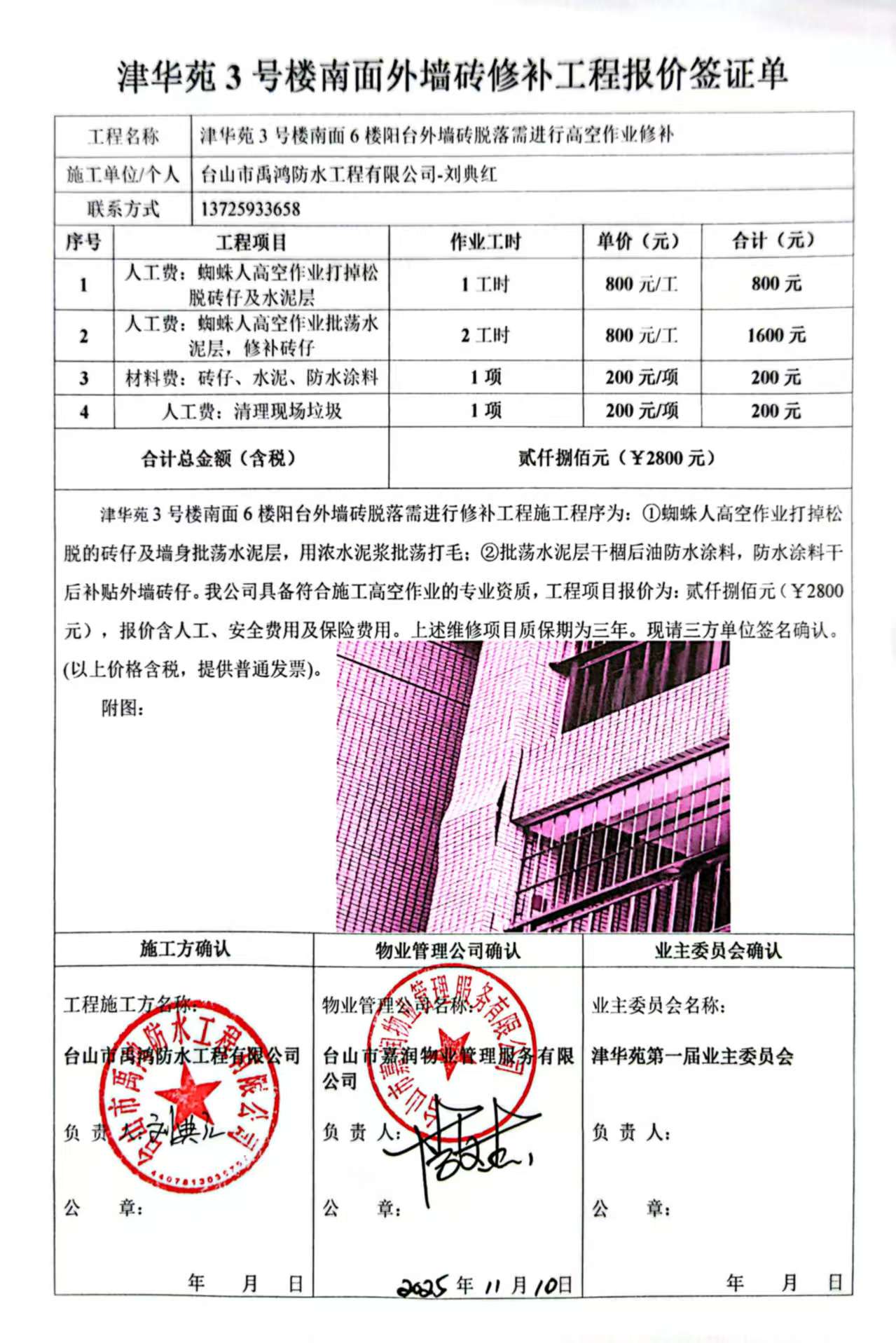 <td VALIGN="top" VALUES="" STYLE="border-width:0" BINDTYPE="0" ROWSPAN="17" COLSPAN="7" DATASOURCE="投票结果" ><font style=" font-family:方正小标宋简体;font-size:14pt;"><p style="line-height: 1.75em;"><span style="font-family: 宋体, SimSun;">各位尊敬的业主:</span><br/></p><p style="text-indent: 2em; line-height: 1.75em;"><span style="font-family: 宋体, SimSun;">根据法律法规的规定,本小区业主利用“江门市物业事项表决管理系统”已对本小区公共事务决策事项(<span style="font-family: 宋体; text-indent: 32px;">津华苑3号楼03单元外墙瓷砖剥落维修的使用维修资金投票</span>)进行了表决,在经过7日的询异公示期后,未收到业主有效的异议。现将投票结果公告,并就产生的法律效力说明如下:</span></p><p style="line-height: 1.75em; text-indent: 0em;"><strong style="text-indent: 2em;"><span style="font-family: 宋体, SimSun;">一、投票范围</span></strong></p><p style="text-indent: 2em; line-height: 1.75em;"><span style="font-family: 宋体, SimSun;">台山津华苑津华苑3号楼</span></p><p style="text-indent: 2em; line-height: 1.75em;"><span style="font-family: 宋体, SimSun;">总人数(专有部分人数之和):18</span></p><p style="text-indent: 2em; line-height: 1.75em;"><span style="font-family: 宋体, SimSun;"><span style="font-family: 宋体, SimSun; text-indent: 32px;"><span style="font-family: 宋体; text-indent: 32px;"><span style="font-family: 宋体; text-indent: 32px;">总户数:18</span></span></span></span></p><p style="text-indent: 2em; line-height: 1.75em;"><span style="font-family: 宋体, SimSun;">建筑物总面积(专有部分面积之和):2336.50㎡</span></p><p style="line-height: 1.75em;"><strong><span style="font-family: 宋体, SimSun;">二、投票结果公告时间</span></strong></p><p style="text-indent: 2em; line-height: 1.75em;"><span style="font-family: 宋体, SimSun;"><span style="font-family: 宋体, SimSun; text-indent: 32px;">从2026年01月27日开始</span></span></p><p style="line-height: 1.75em;"><strong><span style="font-family: 宋体, SimSun;">三、计票规则</span></strong></p><p style="text-indent: 2em; line-height: 1.75em;"><span style="font-family: 宋体, SimSun;">表决事项:使用建筑物及其附属设施的维修资金<br /><p style='font-family: 宋体, SimSun;line-height: 1.75em; text-indent: 2em;'>计票规则:弃权票不并入其它项&nbsp;&nbsp;&nbsp;&nbsp;未表决票不并入其它项</p></span></p><p style="line-height: 1.75em;"><strong><span style="font-family: 宋体, SimSun;">四、通过规则</span></strong></p><p style="line-height: 1.75em;"><strong><span style="font-family: 宋体, SimSun;">&nbsp; 根据《中华人民共和国民法典》第二百七十八条规定:业主共同决定事项,应当由专有部分面积占比三分之二以上的业主且人数占比三分之二以上的业主参与表决。</span></strong></p><p style="text-indent: 2em; line-height: 1.75em;"><span style="font-family: 宋体, SimSun;"><span style="font-family: 宋体, SimSun; text-indent: 32px;">表决事项:使用建筑物及其附属设施的维修资金<br /><p style='font-family: 宋体, SimSun;line-height: 1.75em; text-indent: 2em;'>通过规则:双2/3以上参与表决,参与表决双过半同意</p></span></span></p><p style="line-height: 1.75em;"><strong><span style="font-family: 宋体, SimSun;">五、投票结果</span></strong></p><p style="line-height: 1.75em; text-indent: 2em;"><span style="font-family: 宋体, SimSun; text-indent: 2em;"><div id='resultTable'><table style='table-layout: fixed; font-size:12px; margin-top:10px' width='100%' border='0' cellspacing='0' cellpadding='0'><tr><td height='28' colspan='10' align='center' style='border: 1px solid #666'><strong style='font-size: 14px;'> 使用建筑物及其附属设施的维修资金</strong></td> </tr><tr id='trfirst'><td height='28' colspan='4' style='border-left: 1px solid #666; border-bottom: 1px solid #666'><strong>&nbsp;申报单位:</strong> 台山市嘉润物业管理服务有限公司</td><td colspan='3' style='border-left: 1px solid #666; border-bottom: 1px solid #666'><strong>&nbsp;联系方式:</strong> </td><td colspan='3' style='border-left: 1px solid #666; border-bottom: 1px solid #666; border-right: 1px solid #666'><strong>&nbsp;申报日期:</strong> 2025年12月9日 </td></tr><tr> <td height='28' colspan='5' style='border-left: 1px solid #666; border-bottom: 1px solid #666'><strong>&nbsp;列支总人数(专有部分人数之和):</strong>18人 </td><td colspan='5' style='border-left: 1px solid #666; border-bottom: 1px solid #666; border-right: 1px solid #666'><strong>&nbsp;列支建筑物总面积(专有部分面积之和):</strong>2336.50㎡ </td> </tr><tr><td height='28' colspan='10' bgcolor='#F3F3F3' style='border-left: 1px solid #666;border-bottom: 1px solid #666;border-right: 1px solid #666'><strong>&nbsp;参与表决人数及面积统计</strong></td></tr><tr><td height='28' colspan='5' style='border-left: 1px solid #666; border-bottom: 1px solid #666'><strong>&nbsp;参与表决人数:</strong>6人</td><td colspan='5' style='border-left: 1px solid #666; border-bottom: 1px solid #666; border-right: 1px solid #666'><strong>&nbsp;参与表决人数占总人数比例:</strong>33.33%</td></tr><tr><td height='28' colspan='5' style='border-left: 1px solid #666; border-bottom: 1px solid #666'><strong>&nbsp;参与表决面积:</strong>721.30㎡</td><td colspan='5' style='border-left: 1px solid #666; border-bottom: 1px solid #666; border-right: 1px solid #666'><strong>&nbsp;参与表决面积占总面积比例:</strong>30.87%</td></tr><tr><td height='28' colspan='10' bgcolor='#F3F3F3' style='border-left: 1px solid #666; border-bottom: 1px solid #666;border-right: 1px solid #666'> <strong>&nbsp;参与表决同意人数及面积统计</strong></td> </tr><tr><td height='28' colspan='5' style='border-left: 1px solid #666; border-bottom: 1
