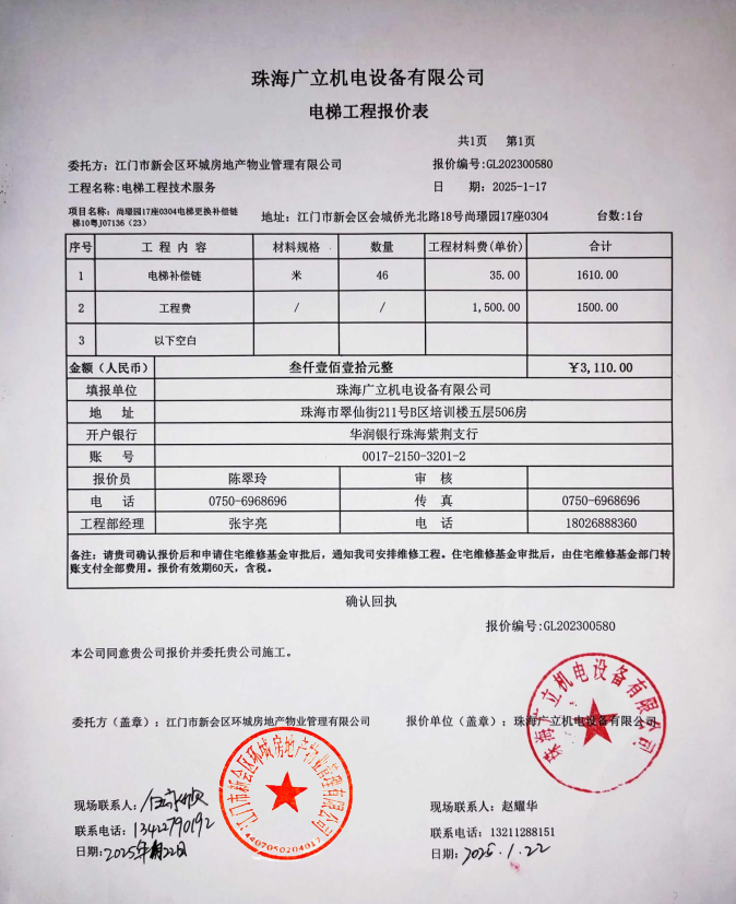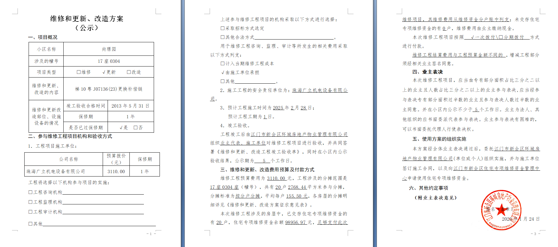 <td VALIGN="top" VALUES="" STYLE="border-width:0" BINDTYPE="0" ROWSPAN="19" COLSPAN="7" DATASOURCE="投票结果" ><font style="font-size:14pt;"><p style="white-space: normal; font-family: 宋体; line-height: 1.75em;">尚璟园尚璟园17座全体业主:</p><p style="white-space: normal; font-family: 宋体; line-height: 1.75em; text-indent: 2em;">本小区关于尚璟园17座0304电梯[梯10粤J07136(23)]更换补偿链使用维修资金的投票的投票已表决结束,询异时间从2025年02月17日开始,投票询异公示期间,业主可通过微信查询自己的表决情况或可凭身份证件申请查询自己的表决情况;如公示的业主表决情况与查询的本人表决意见不一致的,可以以书面形式向投票组织机构申诉,投票组织机构予以纠正并重新公示表决结果。异议提出人对投票组织机构的处理仍有异议的,可以向街道办事处(镇人民政府)反映处理,涉及住宅专项维修资金的,可向属地住宅专项维修资金管理中心反映处理。</p><p style="white-space: normal;"><br/></p><p style="white-space: normal; font-family: 宋体; line-height: 1.75em;"><strong>附件:</strong></p><p style="white-space: normal; font-family: 宋体; line-height: 1.75em;"><strong>一、投票范围</strong></p><p style="white-space: normal; font-family: 宋体; line-height: 1.75em; text-indent: 2em;">尚璟园尚璟园17座</p><p style="white-space: normal; font-family: 宋体; line-height: 1.75em; text-indent: 2em;">总人数(专有部分人数之和):20</p><p style="white-space: normal; font-family: 宋体; line-height: 1.75em; text-indent: 2em;"><span style="font-family: 宋体, SimSun;"><span style="font-family: 宋体; text-indent: 32px;"><span style="font-family: 宋体; text-indent: 32px;">总户数:20</span></span></span></p><p style="white-space: normal; font-family: 宋体; line-height: 1.75em; text-indent: 2em;">建筑物总面积(专有部分面积之和):2768.44㎡</p><p style="white-space: normal; font-family: 宋体; line-height: 1.75em;"><strong>二、询异公示起止时间</strong></p><p dir="ltr" style="white-space: normal; font-family: 宋体; line-height: 1.75em; text-indent: 2em;"><span style="text-indent: 36px;">2025年02月17日至2025年02月27日</span></p><p style="white-space: normal; font-family: 宋体; line-height: 1.75em;"><strong>三、投票详细描述</strong></p><p style="white-space: normal; font-family: 宋体; line-height: 1.75em; text-indent: 2em;"><p><span style="font-size: 15px;font-family: 宋体;background: white">本小区17座0304电梯[梯10粤J07136(23)]电梯出现异响,经检查,是由于电梯补偿链损坏造成。现需申请使用维修资金对17座0304电梯[梯10粤J07136(23)]电梯的补偿链进行更换,工程维修预算金额为3110.00元,项目最终费用以施工合同签订金额为准。因已过保修期,维修费用由相关业主按分户分摊,共涉及20户,每户155.50元,详见公示附件。如业主手机不能正常通过微信投票,请联系物业公司进行线下纸质投票,物业公司联系电话:0750-6198383</span></p></p><p style="white-space: normal; font-family: 宋体; line-height: 1.75em;"><strong>四、计票规则</strong></p><p style="white-space: normal; font-family: 宋体; line-height: 1.75em; text-indent: 2em;">表决事项:使用建筑物及其附属设施的维修资金<br /><p style='text-align: left; font-family: 宋体; font-size: 16px; line-height: 1.75em; text-indent: 2em;'>计票规则:弃权票不并入其它项 未表决票不并入其它项</p></p><p style="white-space: normal; font-family: 宋体; line-height: 1.75em;"><strong>五、通过规则</strong></p><p style="white-space: normal; font-family: 宋体; line-height: 1.75em;"><strong><strong style="white-space: normal;"><span style="font-family: 宋体, SimSun;"> 根据《中华人民共和国民法典》第二百七十八条规定:业主共同决定事项,应当由专有部分面积占比三分之二以上的业主且人数占比三分之二以上的业主参与表决。</span></strong></strong></p><p style="white-space: normal; font-family: 宋体; line-height: 1.75em; text-indent: 2em;">表决事项:使用建筑物及其附属设施的维修资金<br /><p style='text-align: left; font-family: 宋体; font-size: 16px; line-height: 1.75em; text-indent: 2em;'>通过规则:双2/3以上参与表决,参与表决双过半同意</p></p><p style="white-space: normal; font-family: 宋体; line-height: 1.75em;"><strong>六、投票结果</strong></p><p style="white-space: normal; font-family: 宋体; line-height: 1.75em; text-indent: 2em;"><div id='resultTable'><table style='table-layout: fixed; font-size:12px; margin-top:10px' width='100%' border='0' cellspacing='0' cellpadding='0'><tr><td height='28' colspan='10' align='center' style='border: 1px solid #666'><strong style='font-size: 14px;'> 使用建筑物及其附属设施的维修资金</strong></td> </tr><tr id='trfirst'><td height='28' colspan='4' style='border-left: 1px solid #666; border-bottom: 1px solid #666'><strong> 申报单位:</strong> 新会区环城房地产物业管理有限公司</td><td colspan='3' style='border-left: 1px solid #666; border-bottom: 1px solid #666'><strong> 联系方式:</strong> </td><td colspan='3' style='border-left: 1px solid #666; border-bottom: 1px solid #666; border-right: 1px solid #666'><strong> 申报日期:</strong> 2025年2月10日 </td></tr><tr> <td height='28' colspan='5' style='border-left: 1px solid #666; border-bottom: 1px solid #666'><strong> 总人数(专有部分人数之和):</strong>20人 </td><td colspan='5' style='border-left: 1px solid #666; border-bottom: 1px solid #666; border-right: 1px solid #666'><strong> 建筑物总面积(专有部分面积之和):</strong>2768.44㎡ </td> </tr><tr><td height='28' colspan='10' bgcolor='#F3F3F3' style='border-left: 1px solid #666;border-bottom: 1px solid #666;border-right: 1px solid #666'><strong> 参与人数及