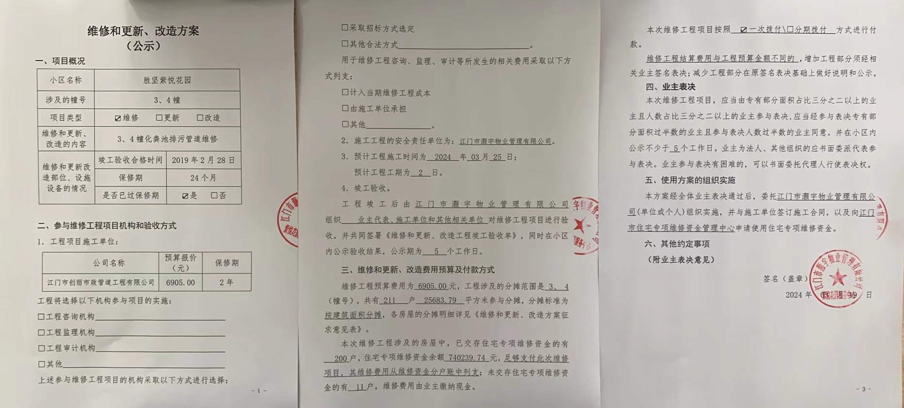 <td VALIGN="top" VALUES="" STYLE="border-width:0" BINDTYPE="0" ROWSPAN="19" COLSPAN="7" DATASOURCE="投票结果" ><font style="font-size:14pt;"><p style="white-space: normal; font-family: 宋体; line-height: 1.75em;">蓬江区胜坚紫悦花园蓬江区胜坚紫悦花园3幢、蓬江区胜坚紫悦花园4幢全体业主:</p><p style="white-space: normal; font-family: 宋体; line-height: 1.75em; text-indent: 2em;">本小区关于蓬江区胜坚紫悦花园3、4幢化粪池排污管维修使用维修资金的投票的投票已表决结束,询异时间从2024年04月01日开始,投票询异公示期间,业主可通过微信查询自己的表决情况或可凭身份证件申请查询自己的表决情况;如公示的业主表决情况与查询的本人表决意见不一致的,可以以书面形式向投票组织机构申诉,投票组织机构予以纠正并重新公示表决结果。异议提出人对投票组织机构的处理仍有异议的,可以向街道办事处(镇人民政府)反映处理,涉及住宅专项维修资金的,可向属地住宅专项维修资金管理中心反映处理。</p><p style="white-space: normal;"><br/></p><p style="white-space: normal; font-family: 宋体; line-height: 1.75em;"><strong>附件:</strong></p><p style="white-space: normal; font-family: 宋体; line-height: 1.75em;"><strong>一、投票范围</strong></p><p style="white-space: normal; font-family: 宋体; line-height: 1.75em; text-indent: 2em;">蓬江区胜坚紫悦花园蓬江区胜坚紫悦花园3幢、蓬江区胜坚紫悦花园4幢</p><p style="white-space: normal; font-family: 宋体; line-height: 1.75em; text-indent: 2em;">总人数(专有部分人数之和):206</p><p style="white-space: normal; font-family: 宋体; line-height: 1.75em; text-indent: 2em;"><span style="font-family: 宋体, SimSun;"><span style="font-family: 宋体; text-indent: 32px;"><span style="font-family: 宋体; text-indent: 32px;">总户数:211</span></span></span></p><p style="white-space: normal; font-family: 宋体; line-height: 1.75em; text-indent: 2em;">建筑物总面积(专有部分面积之和):25683.79㎡</p><p style="white-space: normal; font-family: 宋体; line-height: 1.75em;"><strong>二、询异公示起止时间</strong></p><p dir="ltr" style="white-space: normal; font-family: 宋体; line-height: 1.75em; text-indent: 2em;"><span style="text-indent: 36px;">2024年04月01日至2024年04月07日</span></p><p style="white-space: normal; font-family: 宋体; line-height: 1.75em;"><strong>三、投票详细描述</strong></p><p style="white-space: normal; font-family: 宋体; line-height: 1.75em; text-indent: 2em;"><p>因胜坚紫悦花园3、4栋化粪池有一段排污管道发生破裂、渗漏、错位、脱节、沉积现象,严重影响业主们的日常生活.现对3、4栋化粪池排污管道进行维修,工程维修预算金额为6905元,项目最终费用以施工合同签订金额为准。因已过保修期,维修费用由相关业主按建筑面积分摊,每平方约0.2689元,详见公示附件。如业主手机不能正常通过微信投票,请联系物业公司进行线下纸质投票,物业电话:0750-3339221。</p></p><p style="white-space: normal; font-family: 宋体; line-height: 1.75em;"><strong>四、计票规则</strong></p><p style="white-space: normal; font-family: 宋体; line-height: 1.75em; text-indent: 2em;">表决事项:使用建筑物及其附属设施的维修资金<br /><p style='text-align: left; font-family: 宋体; font-size: 16px; line-height: 1.75em; text-indent: 2em;'>计票规则:弃权票不并入其它项 未表决票不并入其它项</p></p><p style="white-space: normal; font-family: 宋体; line-height: 1.75em;"><strong>五、通过规则</strong></p><p style="white-space: normal; font-family: 宋体; line-height: 1.75em;"><strong><strong style="white-space: normal;"><span style="font-family: 宋体, SimSun;"> 根据《中华人民共和国民法典》第二百七十八条规定:业主共同决定事项,应当由专有部分面积占比三分之二以上的业主且人数占比三分之二以上的业主参与表决。</span></strong></strong></p><p style="white-space: normal; font-family: 宋体; line-height: 1.75em; text-indent: 2em;">表决事项:使用建筑物及其附属设施的维修资金<br /><p style='text-align: left; font-family: 宋体; font-size: 16px; line-height: 1.75em; text-indent: 2em;'>通过规则:双2/3以上参与表决,参与表决双过半同意</p></p><p style="white-space: normal; font-family: 宋体; line-height: 1.75em;"><strong>六、投票结果</strong></p><p style="white-space: normal; font-family: 宋体; line-height: 1.75em; text-indent: 2em;"><div id='resultTable'><table style='table-layout: fixed; font-size:12px; margin-top:10px' width='100%' border='0' cellspacing='0' cellpadding='0'><tr><td height='28' colspan='10' align='center' style='border: 1px solid #666'><strong style='font-size: 14px;'> 使用建筑物及其附属设施的维修资金</strong></td> </tr><tr id='trfirst'><td height='28' colspan='4' style='border-left: 1px solid #666; border-bottom: 1px solid #666'><strong> 申报单位:</strong> 江门市灏宇物业管理有限公司</td><td colspan='3' style='border-left: 1px solid #666; border-bottom: 1px solid #666'><strong> 联系方式:</strong> </td><td colspan='3' style='border-left: 1px solid #666; border-bottom: 1px solid #666; border-right: 1px solid #666'><strong> 申报日期:</strong> 2024年3月22日 </td></tr><tr> <td height='28' colspan='5' style='border-left: 1px solid #666; border-bottom: 1px solid #666'><strong> 总人数(专有部分人数之和):</strong>206人 </td><td colspan='5' style='border-left: 1px solid #666; border-bottom: 1px solid #666; border-right: 1px solid #666'><strong> 建筑物总面积(专有部分面积之和):</strong>25683.79㎡ </td> </tr><tr><td height='28' colspan='10' bgcolor='#F3F3F3' style='border-left: 1px solid #666;border-bottom: 1px solid #666;border-right: 1px solid