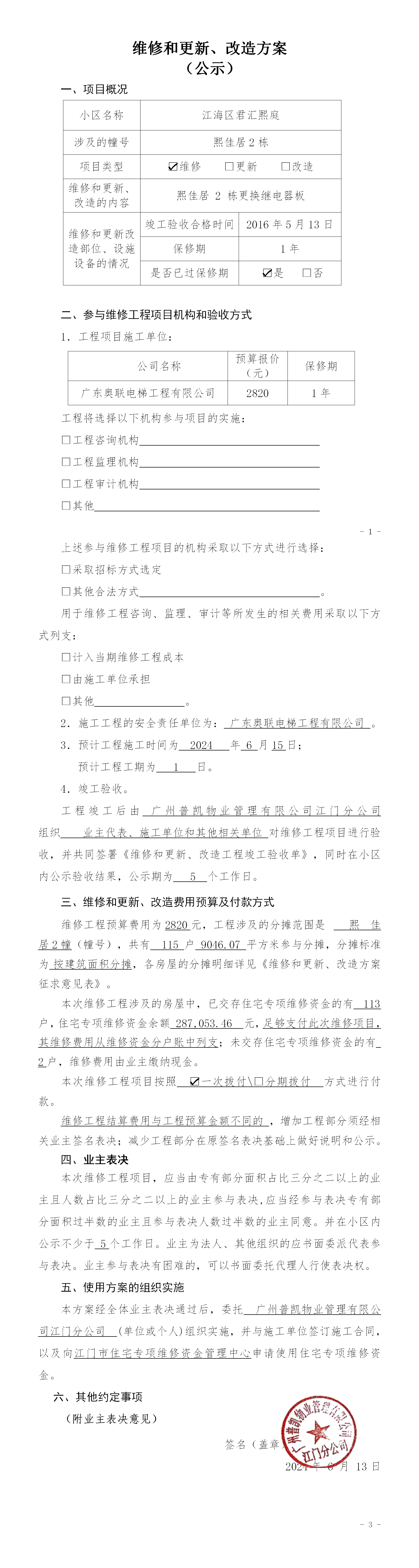 <td VALIGN="top" VALUES="" STYLE="border-width:0" BINDTYPE="0" ROWSPAN="17" COLSPAN="7" DATASOURCE="投票结果" ><font style=" font-family:方正小标宋简体;font-size:14pt;"><p style="line-height: 1.75em;"><span style="font-family: 宋体, SimSun;">各位尊敬的业主:</span><br/></p><p style="text-indent: 2em; line-height: 1.75em;"><span style="font-family: 宋体, SimSun;">根据法律法规的规定,本小区业主利用“江门市物业事项表决管理系统”已对本小区公共事务决策事项进行了表决,在经过7日的询异公示期后,未收到业主有效的异议。现将投票结果公告,并就产生的法律效力说明如下:</span></p><p style="line-height: 1.75em; text-indent: 0em;"><strong style="text-indent: 2em;"><span style="font-family: 宋体, SimSun;">一、投票范围</span></strong></p><p style="text-indent: 2em; line-height: 1.75em;"><span style="font-family: 宋体, SimSun;">江海区君汇熙庭江海区君汇熙庭熙佳居2幢</span></p><p style="text-indent: 2em; line-height: 1.75em;"><span style="font-family: 宋体, SimSun;">总人数(专有部分人数之和):115</span></p><p style="text-indent: 2em; line-height: 1.75em;"><span style="font-family: 宋体, SimSun;"><span style="font-family: 宋体, SimSun; text-indent: 32px;"><span style="font-family: 宋体; text-indent: 32px;"><span style="font-family: 宋体; text-indent: 32px;">总户数:115</span></span></span></span></p><p style="text-indent: 2em; line-height: 1.75em;"><span style="font-family: 宋体, SimSun;">建筑物总面积(专有部分面积之和):9046.07㎡</span></p><p style="line-height: 1.75em;"><strong><span style="font-family: 宋体, SimSun;">二、投票结果公告时间</span></strong></p><p style="text-indent: 2em; line-height: 1.75em;"><span style="font-family: 宋体, SimSun;"><span style="font-family: 宋体, SimSun; text-indent: 32px;">从2024年08月25日开始</span></span></p><p style="line-height: 1.75em;"><strong><span style="font-family: 宋体, SimSun;">三、计票规则</span></strong></p><p style="text-indent: 2em; line-height: 1.75em;"><span style="font-family: 宋体, SimSun;">表决事项:使用建筑物及其附属设施的维修资金<br /><p style='font-family: 宋体, SimSun;line-height: 1.75em; text-indent: 2em;'>计票规则:弃权票不并入其它项&nbsp;&nbsp;&nbsp;&nbsp;未表决票不并入其它项</p></span></p><p style="line-height: 1.75em;"><strong><span style="font-family: 宋体, SimSun;">四、通过规则</span></strong></p><p style="line-height: 1.75em;"><strong><span style="font-family: 宋体, SimSun;">&nbsp; 根据《中华人民共和国民法典》第二百七十八条规定:业主共同决定事项,应当由专有部分面积占比三分之二以上的业主且人数占比三分之二以上的业主参与表决。</span></strong></p><p style="text-indent: 2em; line-height: 1.75em;"><span style="font-family: 宋体, SimSun;"><span style="font-family: 宋体, SimSun; text-indent: 32px;">表决事项:使用建筑物及其附属设施的维修资金<br /><p style='font-family: 宋体, SimSun;line-height: 1.75em; text-indent: 2em;'>通过规则:双2/3以上参与表决,参与表决双过半同意</p></span></span></p><p style="line-height: 1.75em;"><strong><span style="font-family: 宋体, SimSun;">五、投票结果</span></strong></p><p style="line-height: 1.75em; text-indent: 2em;"><span style="font-family: 宋体, SimSun; text-indent: 2em;"><div id='resultTable'><table style='table-layout: fixed; font-size:12px; margin-top:10px' width='100%' border='0' cellspacing='0' cellpadding='0'><tr><td height='28' colspan='10' align='center' style='border: 1px solid #666'><strong style='font-size: 14px;'> 使用建筑物及其附属设施的维修资金</strong></td> </tr><tr id='trfirst'><td height='28' colspan='4' style='border-left: 1px solid #666; border-bottom: 1px solid #666'><strong>&nbsp;申报单位:</strong> 广州普凯物业管理有限公司江门分公司</td><td colspan='3' style='border-left: 1px solid #666; border-bottom: 1px solid #666'><strong>&nbsp;联系方式:</strong> </td><td colspan='3' style='border-left: 1px solid #666; border-bottom: 1px solid #666; border-right: 1px solid #666'><strong>&nbsp;申报日期:</strong> 2024年6月15日 </td></tr><tr> <td height='28' colspan='5' style='border-left: 1px solid #666; border-bottom: 1px solid #666'><strong>&nbsp;总人数(专有部分人数之和):</strong>115人 </td><td colspan='5' style='border-left: 1px solid #666; border-bottom: 1px solid #666; border-right: 1px solid #666'><strong>&nbsp;建筑物总面积(专有部分面积之和):</strong>9046.07㎡ </td> </tr><tr><td height='28' colspan='10' bgcolor='#F3F3F3' style='border-left: 1px solid #666;border-bottom: 1px solid #666;border-right: 1px solid #666'><strong>&nbsp;参与表决人数及面积统计</strong></td></tr><tr><td height='28' colspan='5' style='border-left: 1px solid #666; border-bottom: 1px solid #666'><strong>&nbsp;参与表决人数:</strong>89人</td><td colspan='5' style='border-left: 1px solid #666; border-bottom: 1px solid #666; border-right: 1px solid #666'><strong>&nbsp;参与表决人数占总人数比例:</strong>77.39%</td></tr><tr><td height='28' colspan='5' style='border-left: 1px solid #666; border-bottom: 1px solid #666'><strong>&nbsp;参与表决面积:</strong>6964.11㎡</td><td colspan='5' style='border-left: 1px solid #666; border-bottom: 1px solid #666; border-right: 1px solid #666'><strong>&nbsp;参与表决面积占总面积比例:</strong>76.98%</td></tr><tr><td height='28' colspan='10' bgcolor='#F3F3F3' style='border-left: 1px solid #666; border-bottom: 1px solid #666;border-right: 1px solid #666'> <strong>&nbsp;参与表决同意人数及面积统计</strong></td> </tr><tr><td height='28' colspan='5' style='border-left: 1px solid #666; border-bottom: 1px solid #666'><strong>&nbsp;参与表决同意人数:</strong>81人 </td><td colspan='5' style='border-left: 1px s