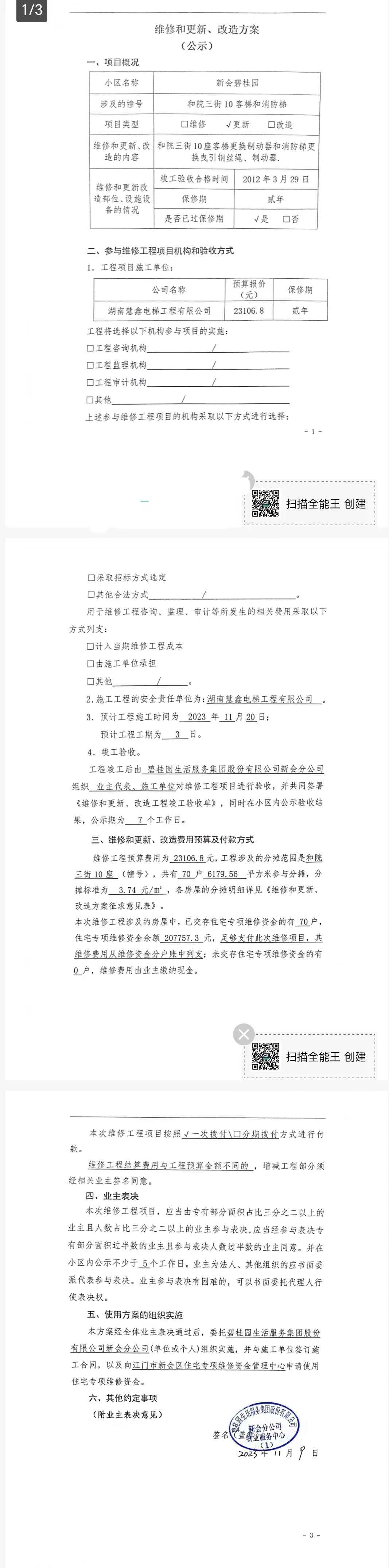 <td VALIGN="top" VALUES="" STYLE="border-width:0" BINDTYPE="0" ROWSPAN="19" COLSPAN="7" DATASOURCE="投票结果" ><font style="font-size:14pt;"><p style="white-space: normal; font-family: 宋体; line-height: 1.75em;">新会碧桂园和院三街10号全体业主:</p><p style="white-space: normal; font-family: 宋体; line-height: 1.75em; text-indent: 2em;">本小区关于新会碧桂园和院三街10座客梯更换制动器和消防梯更换曳引钢丝绳、制动器使用维修资金的投票的投票已表决结束,询异时间从2023年11月21日开始,投票询异公示期间,业主可通过微信查询自己的表决情况或可凭身份证件申请查询自己的表决情况;如公示的业主表决情况与查询的本人表决意见不一致的,可以以书面形式向投票组织机构申诉,投票组织机构予以纠正并重新公示表决结果。异议提出人对投票组织机构的处理仍有异议的,可以向街道办事处(镇人民政府)反映处理,涉及住宅专项维修资金的,可向属地住宅专项维修资金管理中心反映处理。</p><p style="white-space: normal;"><br/></p><p style="white-space: normal; font-family: 宋体; line-height: 1.75em;"><strong>附件:</strong></p><p style="white-space: normal; font-family: 宋体; line-height: 1.75em;"><strong>一、投票范围</strong></p><p style="white-space: normal; font-family: 宋体; line-height: 1.75em; text-indent: 2em;">新会碧桂园和院三街10号</p><p style="white-space: normal; font-family: 宋体; line-height: 1.75em; text-indent: 2em;">总人数(专有部分人数之和):68</p><p style="white-space: normal; font-family: 宋体; line-height: 1.75em; text-indent: 2em;"><span style="font-family: 宋体, SimSun;">总户数:70</span></p><p style="white-space: normal; font-family: 宋体; line-height: 1.75em; text-indent: 2em;">建筑物总面积(专有部分面积之和):6179.56㎡</p><p style="white-space: normal; font-family: 宋体; line-height: 1.75em;"><strong>二、询异公示起止时间</strong></p><p dir="ltr" style="white-space: normal; font-family: 宋体; line-height: 1.75em; text-indent: 2em;"><span style="text-indent: 36px;">2023年11月21日至2023年11月27日</span></p><p style="white-space: normal; font-family: 宋体; line-height: 1.75em;"><strong>三、投票详细描述</strong></p><p style="white-space: normal; font-family: 宋体; line-height: 1.75em; text-indent: 2em;"><p><span style="font-family: "Helvetica Neue", Helvetica, Arial, sans-serif; font-size: 14px; background-color: rgb(255, 255, 255);">新会碧桂园和院三街10座客梯和消防梯在每月维保检查中,发现<span style="font-family: "Helvetica Neue", Helvetica, Arial, sans-serif; font-size: 14px; background-color: rgb(255, 255, 255);">客梯制动器和</span>消防梯曳引钢丝绳、制动器,由于使用时间较长出现磨损和钢丝绳散股等现象,导致电梯在运行过程中出现异响和振动严重。已过保修期,现申请使用维修资金对新会碧桂园和院三街10座客梯制动器和消防梯曳引钢丝绳、制动器进行更换,工程维修预算约23106.8元,项目最终费用以施工合同签订为准,维修费用的分摊标准按建筑面积分摊,每平方约3.74元,详见公示,如果有业主手机不能正常通过微信投票的,请联系物业公司进行线下纸质投票,物业电话17308202891.</span></p></p><p style="white-space: normal; font-family: 宋体; line-height: 1.75em;"><strong>四、计票规则</strong></p><p style="white-space: normal; font-family: 宋体; line-height: 1.75em; text-indent: 2em;">表决事项:使用建筑物及其附属设施的维修资金<br /><p style='text-align: left; font-family: 宋体; font-size: 16px; line-height: 1.75em; text-indent: 2em;'>计票规则:弃权票不并入其它项 未表决票不并入其它项</p></p><p style="white-space: normal; font-family: 宋体; line-height: 1.75em;"><strong>五、通过规则</strong></p><p style="white-space: normal; font-family: 宋体; line-height: 1.75em;"><strong><strong style="white-space: normal;"><span style="font-family: 宋体, SimSun;">&nbsp; 根据《中华人民共和国民法典》第二百七十八条规定:业主共同决定事项,应当由专有部分面积占比三分之二以上的业主且人数占比三分之二以上的业主参与表决。</span></strong></strong></p><p style="white-space: normal; font-family: 宋体; line-height: 1.75em; text-indent: 2em;">表决事项:使用建筑物及其附属设施的维修资金<br /><p style='text-align: left; font-family: 宋体; font-size: 16px; line-height: 1.75em; text-indent: 2em;'>通过规则:参与表决专有部分面积过半数的业主且参与表决人数过半数的业主同意</p></p><p style="white-space: normal; font-family: 宋体; line-height: 1.75em;"><strong>六、投票结果</strong></p><p style="white-space: normal; font-family: 宋体; line-height: 1.75em; text-indent: 2em;"><div id='resultTable'><table style='table-layout: fixed; font-size:12px; margin-top:10px' width='100%' border='0' cellspacing='0' cellpadding='0'><tr><td height='28' colspan='10' align='center' style='border: 1px solid #666'><strong style='font-size: 14px;'> 使用建筑物及其附属设施的维修资金</strong></td> </tr><tr id='trfirst'><td height='28' colspan='4' style='border-left: 1px solid #666; border-bottom: 1px solid #666'><strong> 申报单位:</strong> 碧桂园生活服务集团股份有限公司新会分公司</td><td colspan='3' style='border-left: 1px solid #666; border-bottom: 1px solid #666'><strong> 联系方式:</strong> </td><td colspan='3' style='border-left: 1px solid #666; border-bottom: 1px solid #666; border-right: 1px solid #666'><strong> 申报日期:</strong> 2023年11月9日 </td></tr><tr> <td height='28' colspan='5' style='border-left: 1px solid #666; border-bottom: 1px solid #666'><strong> 总人数(专有部分人数之和):</strong>68人 </td><td colspan='5' style='border-le