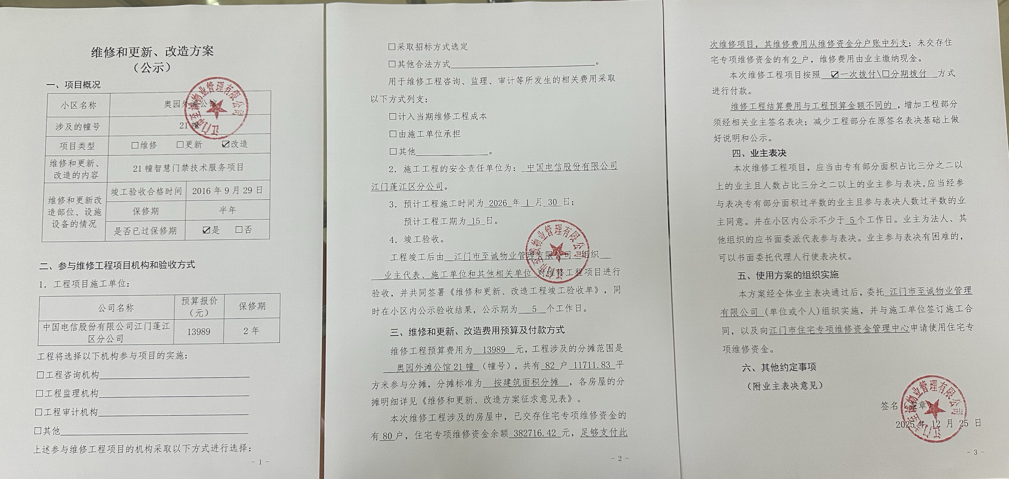 <td VALIGN="top" VALUES="" STYLE="border-width:0" BINDTYPE="0" ROWSPAN="19" COLSPAN="7" DATASOURCE="投票结果" ><font style="font-size:14pt;"><p style="white-space: normal; font-family: 宋体; line-height: 1.75em;">奥园外滩公馆蓬江区棠下镇奥园外滩公馆21幢全体业主:</p><p style="white-space: normal; font-family: 宋体; line-height: 1.75em; text-indent: 2em;">本小区关于奥园外滩公馆21幢智慧门禁技术服务项目使用维修资金的投票的投票已表决结束,询异时间从2026年03月05日开始,投票询异公示期间,业主可通过微信查询自己的表决情况或可凭身份证件申请查询自己的表决情况;如公示的业主表决情况与查询的本人表决意见不一致的,可以以书面形式向投票组织机构申诉,投票组织机构予以纠正并重新公示表决结果。异议提出人对投票组织机构的处理仍有异议的,可以向街道办事处(镇人民政府)反映处理,涉及住宅专项维修资金的,可向属地住宅专项维修资金管理中心反映处理。</p><p style="white-space: normal;"><br/></p><p style="white-space: normal; font-family: 宋体; line-height: 1.75em;"><strong>附件:</strong></p><p style="white-space: normal; font-family: 宋体; line-height: 1.75em;"><strong>一、投票范围</strong></p><p style="white-space: normal; font-family: 宋体; line-height: 1.75em; text-indent: 2em;">奥园外滩公馆蓬江区棠下镇奥园外滩公馆21幢</p><p style="white-space: normal; font-family: 宋体; line-height: 1.75em; text-indent: 2em;">总人数(专有部分人数之和):81</p><p style="white-space: normal; font-family: 宋体; line-height: 1.75em; text-indent: 2em;"><span style="font-family: 宋体, SimSun;"><span style="font-family: 宋体; text-indent: 32px;"><span style="font-family: 宋体; text-indent: 32px;">总户数:82</span></span></span></p><p style="white-space: normal; font-family: 宋体; line-height: 1.75em; text-indent: 2em;">建筑物总面积(专有部分面积之和):11711.83㎡</p><p style="white-space: normal; font-family: 宋体; line-height: 1.75em;"><strong>二、询异公示起止时间</strong></p><p dir="ltr" style="white-space: normal; font-family: 宋体; line-height: 1.75em; text-indent: 2em;"><span style="text-indent: 36px;">2026年03月05日至2026年03月12日</span></p><p style="white-space: normal; font-family: 宋体; line-height: 1.75em;"><strong>三、投票详细描述</strong></p><p style="white-space: normal; font-family: 宋体; line-height: 1.75em; text-indent: 2em;"><p style="text-wrap: wrap;"><span style="font-family: 等线; font-size: 14px;">小区21</span><span style="font-family: 等线; font-size: 14px;">幢的门禁设备</span><span style="font-family: 等线; font-size: 14px;">使用时间较长,</span><span style="font-family: 等线; font-size: 14px;">系统</span><span style="font-family: 等线; font-size: 14px;">出现</span><span style="font-family: 等线; font-size: 14px;">故障多次,不能正常</span><span style="font-family: 等线; font-size: 14px;">使用</span><span style="font-family: 等线; font-size: 14px;">。</span></p><p style="text-wrap: wrap;"><span style="font-family: 等线; font-size: 14px;"> 现对21</span><span style="font-family: 等线; font-size: 14px;">幢的门禁设备</span><span style="font-family: 等线; font-size: 14px;">升级改造</span><span style="font-family: 等线; font-size: 15px;">,</span><span style="font-family: 等线; font-size: 14px;">工程维修预算金额为</span><span style="font-family: 等线; font-size: 14px;">13989</span><span style="font-family: 等线; font-size: 14px;">元,项目最终费用以施工合同签订金额为准。因已过保修期,维修费用由相关业主按建筑面积分摊,每平方约</span><span style="font-family: 等线; font-size: 14px;">1.19</span><span style="font-family: 等线; font-size: 14px;">元,详见公示附件。如业主手机不能正常通过微信投票,请联系物业公司进行线下纸质投票,物业电话:0750-3851968。</span></p><p><br/></p></p><p style="white-space: normal; font-family: 宋体; line-height: 1.75em;"><strong>四、计票规则</strong></p><p style="white-space: normal; font-family: 宋体; line-height: 1.75em; text-indent: 2em;">表决事项:使用建筑物及其附属设施的维修资金<br /><p style='text-align: left; font-family: 宋体; font-size: 16px; line-height: 1.75em; text-indent: 2em;'>计票规则:弃权票不并入其它项 未表决票不并入其它项</p></p><p style="white-space: normal; font-family: 宋体; line-height: 1.75em;"><strong>五、通过规则</strong></p><p style="white-space: normal; font-family: 宋体; line-height: 1.75em;"><strong><strong style="white-space: normal;"><span style="font-family: 宋体, SimSun;"> 根据《中华人民共和国民法典》第二百七十八条规定:业主共同决定事项,应当由专有部分面积占比三分之二以上的业主且人数占比三分之二以上的业主参与表决。</span></strong></strong></p><p style="white-space: normal; font-family: 宋体; line-height: 1.75em; text-indent: 2em;">表决事项:使用建筑物及其附属设施的维修资金<br /><p style='text-align: left; font-family: 宋体; font-size: 16px; line-height: 1.75em; text-indent: 2em;'>通过规则:双2/3以上参与表决,参与表决双过半同意</p></p><p style="white-space: normal; font-family: 宋体; line-height: 1.75em;"><strong>六、投票结果</strong></p><p style="white-space: normal; font-family: 宋体; line-height: 1.75em; text-indent: 2em;"><div id='resultTable'><table style='table-layout: fixed; font-size:12px; margin-top:10px' width='100%' border='0' cellspacing='0' cellpadding='0'><tr><td height='28' colspan='10' align='center' style='border: 1px solid #666'><strong style='font-size: 14px;'> 使用建筑物及其附属设施的维修资金</strong></td> </tr><tr id='trfirst'><td height='28' colspan='4' style='bor