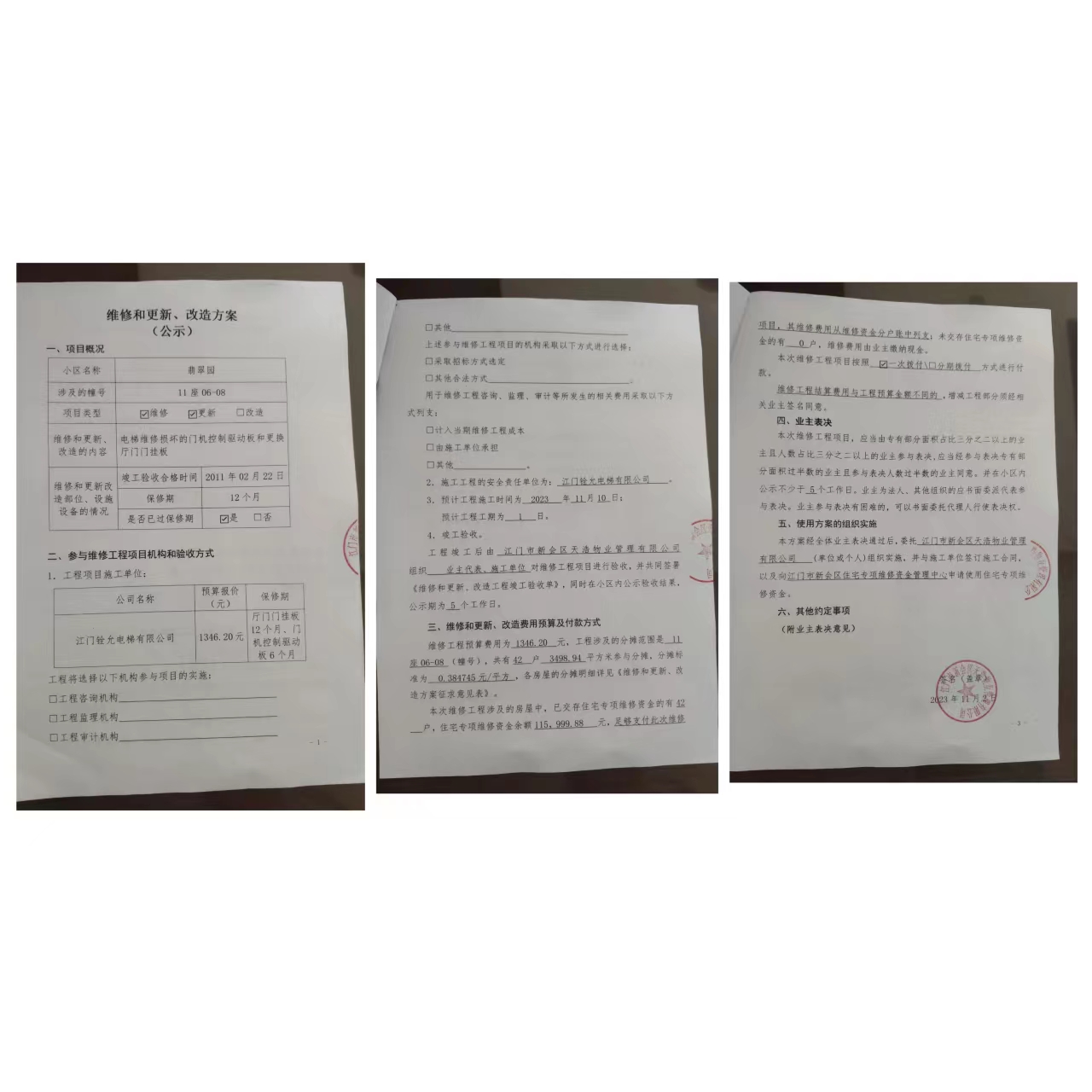 <td VALIGN="top" VALUES="" STYLE="border-width:0" BINDTYPE="0" ROWSPAN="19" COLSPAN="7" DATASOURCE="投票结果" ><font style="font-size:14pt;"><p style="white-space: normal; font-family: 宋体; line-height: 1.75em;">翡翠园翡翠园11座全体业主:</p><p style="white-space: normal; font-family: 宋体; line-height: 1.75em; text-indent: 2em;">本小区关于翡翠园11座0608单元(梯粤JX5579)更换厅门门挂板及维修门机控制驱动板使用维修资金的投票的投票已表决结束,询异时间从2023年11月18日开始,投票询异公示期间,业主可通过微信查询自己的表决情况或可凭身份证件申请查询自己的表决情况;如公示的业主表决情况与查询的本人表决意见不一致的,可以以书面形式向投票组织机构申诉,投票组织机构予以纠正并重新公示表决结果。异议提出人对投票组织机构的处理仍有异议的,可以向街道办事处(镇人民政府)反映处理,涉及住宅专项维修资金的,可向属地住宅专项维修资金管理中心反映处理。</p><p style="white-space: normal;"><br/></p><p style="white-space: normal; font-family: 宋体; line-height: 1.75em;"><strong>附件:</strong></p><p style="white-space: normal; font-family: 宋体; line-height: 1.75em;"><strong>一、投票范围</strong></p><p style="white-space: normal; font-family: 宋体; line-height: 1.75em; text-indent: 2em;">翡翠园翡翠园11座</p><p style="white-space: normal; font-family: 宋体; line-height: 1.75em; text-indent: 2em;">总人数(专有部分人数之和):24</p><p style="white-space: normal; font-family: 宋体; line-height: 1.75em; text-indent: 2em;"><span style="font-family: 宋体, SimSun;">总户数:42</span></p><p style="white-space: normal; font-family: 宋体; line-height: 1.75em; text-indent: 2em;">建筑物总面积(专有部分面积之和):3498.94㎡</p><p style="white-space: normal; font-family: 宋体; line-height: 1.75em;"><strong>二、询异公示起止时间</strong></p><p dir="ltr" style="white-space: normal; font-family: 宋体; line-height: 1.75em; text-indent: 2em;"><span style="text-indent: 36px;">2023年11月18日至2023年11月24日</span></p><p style="white-space: normal; font-family: 宋体; line-height: 1.75em;"><strong>三、投票详细描述</strong></p><p style="white-space: normal; font-family: 宋体; line-height: 1.75em; text-indent: 2em;"><p><span style="font-family: Helvetica;letter-spacing: 0;font-size: 14px;background: rgb(255, 255, 255)"><span style="font-family:Helvetica">翡翠园</span>11座0608电梯停在10楼不能开门,</span><span style="font-family: Helvetica;letter-spacing: 0;font-size: 14px;background: rgb(255, 255, 255)"><span style="font-family:Helvetica">经检查是</span>10楼电梯门的门挂板老化损坏不能正常开门,从而再导致门机板烧坏,电梯不能使用 ,已过保修期。现需申请使用维修资金对11座0608电梯更换厅门门挂板及维修门机控制驱动板,预算金额为 1346.20 元,项目最终费用以施工合同签订金额为准。维修费用的分摊标准为按建筑面积分摊每平方为:0.384745元,详见公示附件。如业主手机不能正常通过微信投票,请联系物业公司进行线下纸质投票,物业公司联系电话:6602800</span></p><p><br/></p></p><p style="white-space: normal; font-family: 宋体; line-height: 1.75em;"><strong>四、计票规则</strong></p><p style="white-space: normal; font-family: 宋体; line-height: 1.75em; text-indent: 2em;">表决事项:使用建筑物及其附属设施的维修资金<br /><p style='text-align: left; font-family: 宋体; font-size: 16px; line-height: 1.75em; text-indent: 2em;'>计票规则:弃权票不并入其它项 未表决票不并入其它项</p></p><p style="white-space: normal; font-family: 宋体; line-height: 1.75em;"><strong>五、通过规则</strong></p><p style="white-space: normal; font-family: 宋体; line-height: 1.75em;"><strong><strong style="white-space: normal;"><span style="font-family: 宋体, SimSun;">&nbsp; 根据《中华人民共和国民法典》第二百七十八条规定:业主共同决定事项,应当由专有部分面积占比三分之二以上的业主且人数占比三分之二以上的业主参与表决。</span></strong></strong></p><p style="white-space: normal; font-family: 宋体; line-height: 1.75em; text-indent: 2em;">表决事项:使用建筑物及其附属设施的维修资金<br /><p style='text-align: left; font-family: 宋体; font-size: 16px; line-height: 1.75em; text-indent: 2em;'>通过规则:参与表决专有部分面积过半数的业主且参与表决人数过半数的业主同意</p></p><p style="white-space: normal; font-family: 宋体; line-height: 1.75em;"><strong>六、投票结果</strong></p><p style="white-space: normal; font-family: 宋体; line-height: 1.75em; text-indent: 2em;"><div id='resultTable'><table style='table-layout: fixed; font-size:12px; margin-top:10px' width='100%' border='0' cellspacing='0' cellpadding='0'><tr><td height='28' colspan='10' align='center' style='border: 1px solid #666'><strong style='font-size: 14px;'> 使用建筑物及其附属设施的维修资金</strong></td> </tr><tr id='trfirst'><td height='28' colspan='4' style='border-left: 1px solid #666; border-bottom: 1px solid #666'><strong> 申报单位:</strong> 江门市新会区天浩物业管理有限公司</td><td colspan='3' style='border-left: 1px solid #666; border-bottom: 1px solid #666'><strong> 联系方式:</strong> </td><td colspan='3' style='border-left: 1px solid #666; border-bottom: 1px solid #666; border-right: 1px solid #666'><strong> 申报日期:</strong> 2023年11月3日 </td></tr><tr> <td height='28' colspan='5' style='border-left: 1px solid #666; border-bottom: 1px solid #666'><strong> 总人数(专有部分人数之和):</strong>24人 </td><td colspan='5' style='border-left: 1px solid #666; border-bottom: 1px solid #666; border-right: 1px solid #666'><strong> 建筑