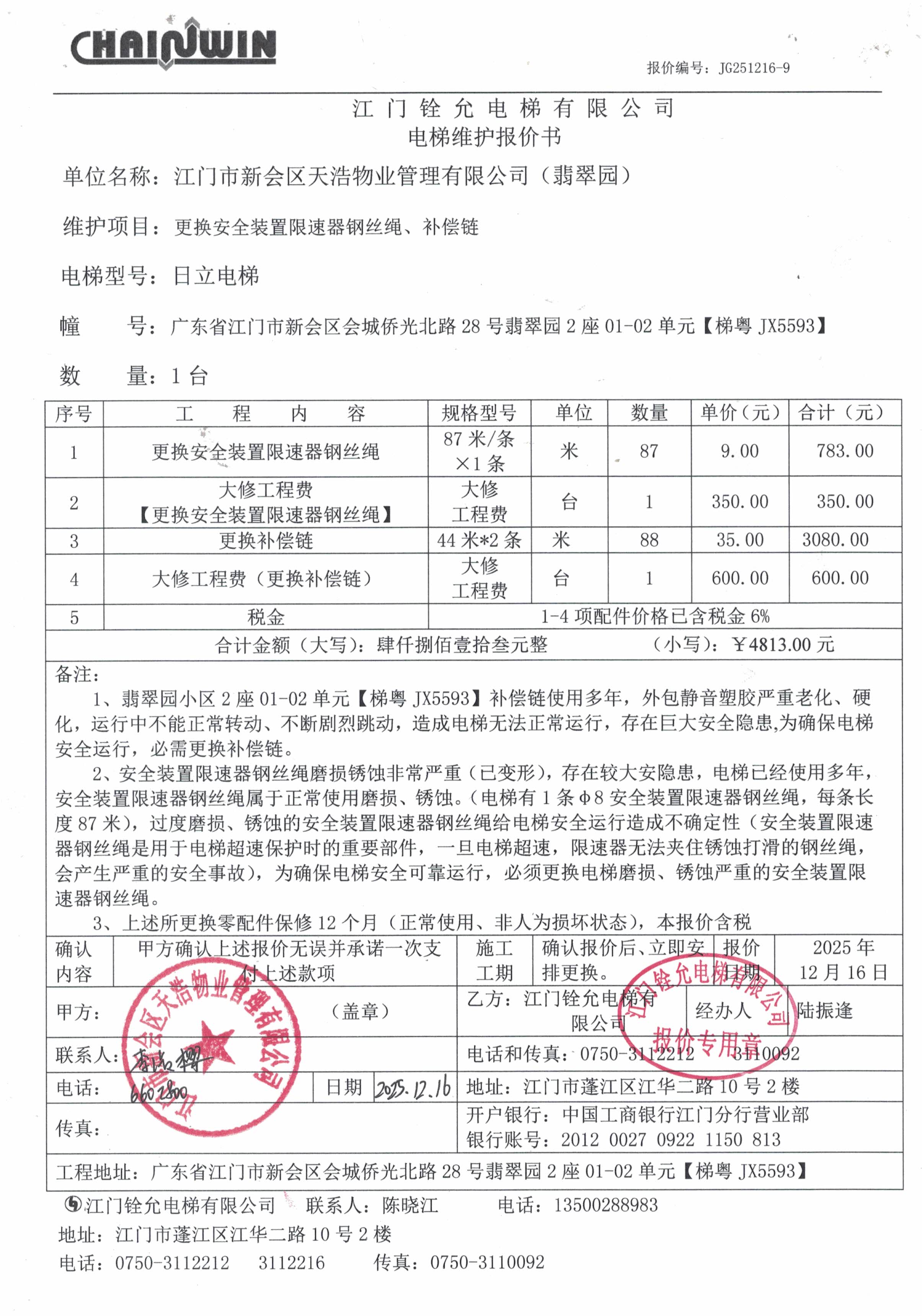 <td VALIGN="top" VALUES="" STYLE="border-width:0" BINDTYPE="0" ROWSPAN="17" COLSPAN="7" DATASOURCE="投票结果" ><font style=" font-family:方正小标宋简体;font-size:14pt;"><p style="line-height: 1.75em;"><span style="font-family: 宋体, SimSun;">各位尊敬的业主:</span><br/></p><p style="text-indent: 2em; line-height: 1.75em;"><span style="font-family: 宋体, SimSun;">根据法律法规的规定,本小区业主利用“江门市物业事项表决管理系统”已对本小区公共事务决策事项(<span style="font-family: 宋体; text-indent: 32px;">翡翠园2座01-02单元电梯【梯粤JX5593】更换安全装置限速器钢丝绳、补偿链使用维修资金的投票</span>)进行了表决,在经过7日的询异公示期后,未收到业主有效的异议。现将投票结果公告,并就产生的法律效力说明如下:</span></p><p style="line-height: 1.75em; text-indent: 0em;"><strong style="text-indent: 2em;"><span style="font-family: 宋体, SimSun;">一、投票范围</span></strong></p><p style="text-indent: 2em; line-height: 1.75em;"><span style="font-family: 宋体, SimSun;">翡翠园翡翠园2座</span></p><p style="text-indent: 2em; line-height: 1.75em;"><span style="font-family: 宋体, SimSun;">总人数(专有部分人数之和):18</span></p><p style="text-indent: 2em; line-height: 1.75em;"><span style="font-family: 宋体, SimSun;"><span style="font-family: 宋体, SimSun; text-indent: 32px;"><span style="font-family: 宋体; text-indent: 32px;"><span style="font-family: 宋体; text-indent: 32px;">总户数:27</span></span></span></span></p><p style="text-indent: 2em; line-height: 1.75em;"><span style="font-family: 宋体, SimSun;">建筑物总面积(专有部分面积之和):2729.66㎡</span></p><p style="line-height: 1.75em;"><strong><span style="font-family: 宋体, SimSun;">二、投票结果公告时间</span></strong></p><p style="text-indent: 2em; line-height: 1.75em;"><span style="font-family: 宋体, SimSun;"><span style="font-family: 宋体, SimSun; text-indent: 32px;">从2026年01月03日开始</span></span></p><p style="line-height: 1.75em;"><strong><span style="font-family: 宋体, SimSun;">三、计票规则</span></strong></p><p style="text-indent: 2em; line-height: 1.75em;"><span style="font-family: 宋体, SimSun;">表决事项:使用建筑物及其附属设施的维修资金<br /><p style='font-family: 宋体, SimSun;line-height: 1.75em; text-indent: 2em;'>计票规则:弃权票不并入其它项&nbsp;&nbsp;&nbsp;&nbsp;未表决票不并入其它项</p></span></p><p style="line-height: 1.75em;"><strong><span style="font-family: 宋体, SimSun;">四、通过规则</span></strong></p><p style="line-height: 1.75em;"><strong><span style="font-family: 宋体, SimSun;">&nbsp; 根据《中华人民共和国民法典》第二百七十八条规定:业主共同决定事项,应当由专有部分面积占比三分之二以上的业主且人数占比三分之二以上的业主参与表决。</span></strong></p><p style="text-indent: 2em; line-height: 1.75em;"><span style="font-family: 宋体, SimSun;"><span style="font-family: 宋体, SimSun; text-indent: 32px;">表决事项:使用建筑物及其附属设施的维修资金<br /><p style='font-family: 宋体, SimSun;line-height: 1.75em; text-indent: 2em;'>通过规则:双2/3以上参与表决,参与表决双过半同意</p></span></span></p><p style="line-height: 1.75em;"><strong><span style="font-family: 宋体, SimSun;">五、投票结果</span></strong></p><p style="line-height: 1.75em; text-indent: 2em;"><span style="font-family: 宋体, SimSun; text-indent: 2em;"><div id='resultTable'><table style='table-layout: fixed; font-size:12px; margin-top:10px' width='100%' border='0' cellspacing='0' cellpadding='0'><tr><td height='28' colspan='10' align='center' style='border: 1px solid #666'><strong style='font-size: 14px;'> 使用建筑物及其附属设施的维修资金</strong></td> </tr><tr id='trfirst'><td height='28' colspan='4' style='border-left: 1px solid #666; border-bottom: 1px solid #666'><strong>&nbsp;申报单位:</strong> 江门市新会区天浩物业管理有限公司</td><td colspan='3' style='border-left: 1px solid #666; border-bottom: 1px solid #666'><strong>&nbsp;联系方式:</strong> </td><td colspan='3' style='border-left: 1px solid #666; border-bottom: 1px solid #666; border-right: 1px solid #666'><strong>&nbsp;申报日期:</strong> 2025年12月17日 </td></tr><tr> <td height='28' colspan='5' style='border-left: 1px solid #666; border-bottom: 1px solid #666'><strong>&nbsp;列支总人数(专有部分人数之和):</strong>18人 </td><td colspan='5' style='border-left: 1px solid #666; border-bottom: 1px solid #666; border-right: 1px solid #666'><strong>&nbsp;列支建筑物总面积(专有部分面积之和):</strong>2729.66㎡ </td> </tr><tr><td height='28' colspan='10' bgcolor='#F3F3F3' style='border-left: 1px solid #666;border-bottom: 1px solid #666;border-right: 1px solid #666'><strong>&nbsp;参与表决人数及面积统计</strong></td></tr><tr><td height='28' colspan='5' style='border-left: 1px solid #666; border-bottom: 1px solid #666'><strong>&nbsp;参与表决人数:</strong>17人</td><td colspan='5' style='border-left: 1px solid #666; border-bottom: 1px solid #666; border-right: 1px solid #666'><strong>&nbsp;参与表决人数占总人数比例:</strong>94.44%</td></tr><tr><td height='28' colspan='5' style='border-left: 1px solid #666; border-bottom: 1px solid #666'><strong>&nbsp;参与表决面积:</strong>2563.92㎡</td><td colspan='5' style='border-left: 1px solid #666; border-bottom: 1px solid #666; border-right: 1px solid #666'><strong>&nbsp;参与表决面积占总面积比例:</strong>93.93%</td></tr><tr><td height='28' colspan='10' bgcolor='#F3F3F3' style='border-left: 1px solid #666; border-bottom: 1px solid #666;border-right: 1px solid #666'> <strong>&nbsp;参与表决同意人数及面积统计</strong></td> </tr><tr><td height='28' colspan='5' style='