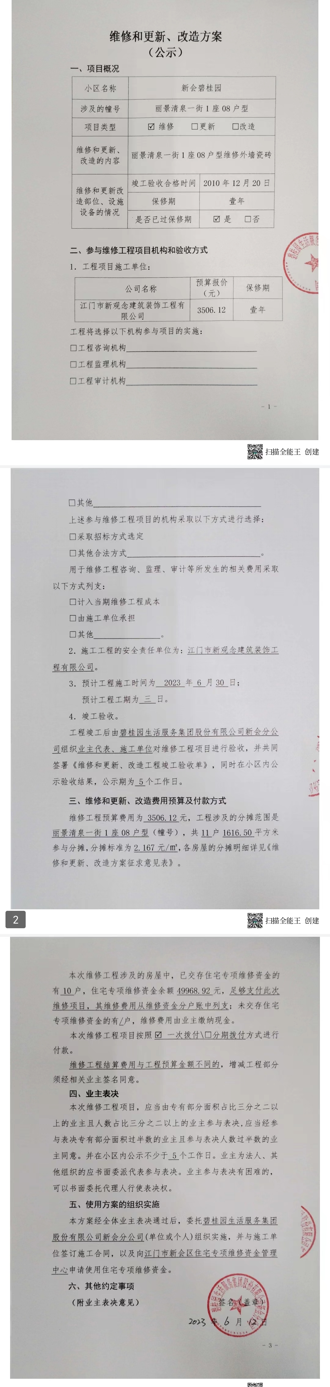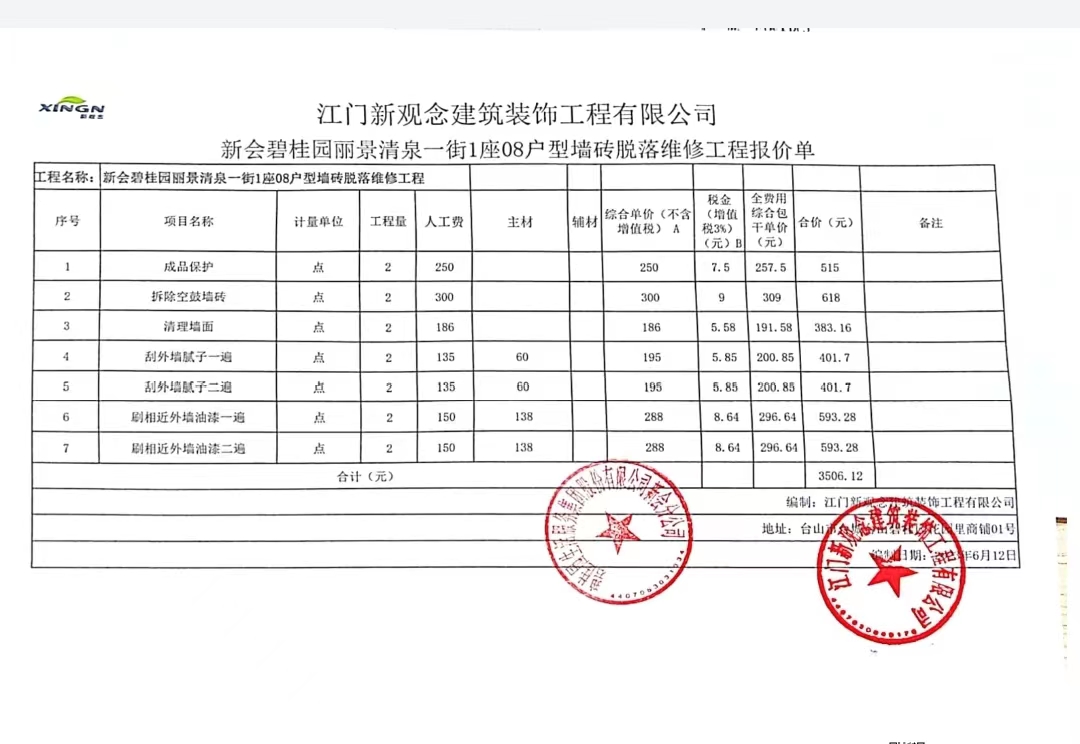 <td VALIGN="top" VALUES="" STYLE="border-width:0" BINDTYPE="0" ROWSPAN="19" COLSPAN="7" DATASOURCE="投票结果" ><font style="font-size:14pt;"><p style="white-space: normal; font-family: 宋体; line-height: 1.75em;">新会碧桂园丽景清泉一街1座全体业主:</p><p style="white-space: normal; font-family: 宋体; line-height: 1.75em; text-indent: 2em;">本小区关于新会碧桂园丽景清泉一街1座08户型维修外墙瓷砖使用维修资金的投票的投票已表决结束,询异时间从2023年07月01日开始,投票询异公示期间,业主可通过微信查询自己的表决情况或可凭身份证件申请查询自己的表决情况;如公示的业主表决情况与查询的本人表决意见不一致的,可以以书面形式向投票组织机构申诉,投票组织机构予以纠正并重新公示表决结果。异议提出人对投票组织机构的处理仍有异议的,可以向街道办事处(镇人民政府)反映处理,涉及住宅专项维修资金的,可向属地住宅专项维修资金管理中心反映处理。</p><p style="white-space: normal;"><br/></p><p style="white-space: normal; font-family: 宋体; line-height: 1.75em;"><strong>附件:</strong></p><p style="white-space: normal; font-family: 宋体; line-height: 1.75em;"><strong>一、投票范围</strong></p><p style="white-space: normal; font-family: 宋体; line-height: 1.75em; text-indent: 2em;">新会碧桂园丽景清泉一街1座</p><p style="white-space: normal; font-family: 宋体; line-height: 1.75em; text-indent: 2em;">总人数(专有部分人数之和):10</p><p style="white-space: normal; font-family: 宋体; line-height: 1.75em; text-indent: 2em;"><span style="font-family: 宋体, SimSun;">总户数:11</span></p><p style="white-space: normal; font-family: 宋体; line-height: 1.75em; text-indent: 2em;">建筑物总面积(专有部分面积之和):1616.50㎡</p><p style="white-space: normal; font-family: 宋体; line-height: 1.75em;"><strong>二、询异公示起止时间</strong></p><p dir="ltr" style="white-space: normal; font-family: 宋体; line-height: 1.75em; text-indent: 2em;"><span style="text-indent: 36px;">2023年07月01日至2023年07月07日</span></p><p style="white-space: normal; font-family: 宋体; line-height: 1.75em;"><strong>三、投票详细描述</strong></p><p style="white-space: normal; font-family: 宋体; line-height: 1.75em; text-indent: 2em;"><p><span style="font-family: "Helvetica Neue", Helvetica, Arial, sans-serif; font-size: 14px; background-color: rgb(255, 255, 255);">新会碧桂园丽景清泉一街1座08户型外墙瓷砖脱落,经检查是因交楼使用时间已约有12年,部份外墙出现空鼓和脱落现象,对路人造成好大的危险需要加急维修,为确保业户生活不受影响,必须对部份有危险的<span style="font-family: "Helvetica Neue", Helvetica, Arial, sans-serif; font-size: 14px; background-color: rgb(255, 255, 255);">外墙瓷砖进行维修</span>处理,已过保修期。现申请使用维修资金对新会碧桂园<span style="font-family: "Helvetica Neue", Helvetica, Arial, sans-serif; font-size: 14px; background-color: rgb(255, 255, 255);">丽景清泉一街1座08户型外墙瓷砖维修</span><span style="font-family: "Helvetica Neue", Helvetica, Arial, sans-serif; font-size: 14px; background-color: rgb(255, 255, 255);">处理</span></span><span style="font-family: "Helvetica Neue", Helvetica, Arial, sans-serif; font-size: 14px; background-color: rgb(255, 255, 255);">,工程维修预算约3506.12元,项目最终费用以施工合同签订为准,维修费用的分摊标准按建筑面积分摊,每平方约2.167元,详见公示,如果有业主手机不能正常通过微信投票的,请联系物业公司进行线下纸质投票,物业电话18088896991王管家</span></p></p><p style="white-space: normal; font-family: 宋体; line-height: 1.75em;"><strong>四、计票规则</strong></p><p style="white-space: normal; font-family: 宋体; line-height: 1.75em; text-indent: 2em;">表决事项:使用建筑物及其附属设施的维修资金<br /><p style='text-align: left; font-family: 宋体; font-size: 16px; line-height: 1.75em; text-indent: 2em;'>计票规则:弃权票不并入其它项 未表决票不并入其它项</p></p><p style="white-space: normal; font-family: 宋体; line-height: 1.75em;"><strong>五、通过规则</strong></p><p style="white-space: normal; font-family: 宋体; line-height: 1.75em; text-indent: 2em;">表决事项:使用建筑物及其附属设施的维修资金<br /><p style='text-align: left; font-family: 宋体; font-size: 16px; line-height: 1.75em; text-indent: 2em;'>通过规则:参与表决专有部分面积过半数的业主且参与表决人数过半数的业主同意</p></p><p style="white-space: normal; font-family: 宋体; line-height: 1.75em;"><strong>六、投票结果</strong></p><p style="white-space: normal; font-family: 宋体; line-height: 1.75em; text-indent: 2em;"><div id='resultTable'><table style='table-layout: fixed; font-size:12px; margin-top:10px' width='100%' border='0' cellspacing='0' cellpadding='0'><tr><td height='28' colspan='10' align='center' style='border: 1px solid #666'><strong style='font-size: 14px;'> 使用建筑物及其附属设施的维修资金</strong></td> </tr><tr id='trfirst'><td height='28' colspan='4' style='border-left: 1px solid #666; border-bottom: 1px solid #666'><strong> 申报单位:</strong> 碧桂园生活服务集团股份有限公司新会分公司</td><td colspan='3' style='border-left: 1px solid #666; border-bottom: 1px solid #666'><strong> 联系方式:</strong> </td><td colspan='3' style='border-left: 1px solid #666; border-bottom: 1px solid #666; border-right: 1px solid #666'><strong> 申报日期:</strong> 2023年6月14日 </td></tr><tr> <td height='28' colspan='5' style='border-left: 1px solid #666; border-bottom: 1px solid #666'><strong> 总人数(专有部分人数之和):</strong>10人 </td><td colspan='5' style='border-left: 1px s