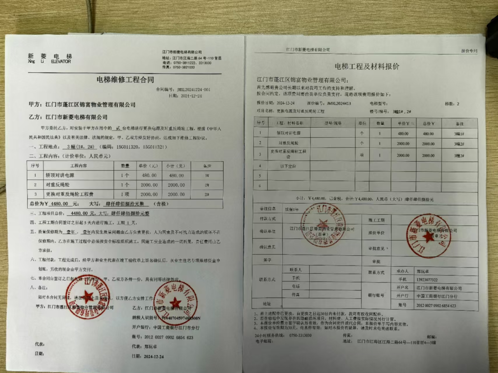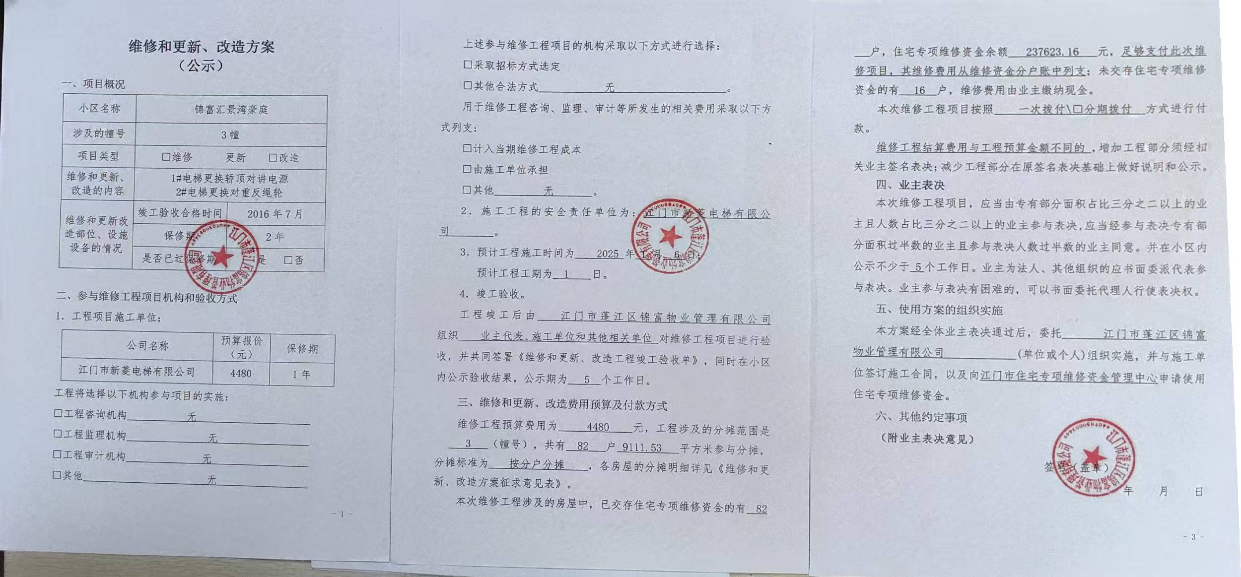 <td VALIGN="top" VALUES="" STYLE="border-width:0" BINDTYPE="0" ROWSPAN="19" COLSPAN="7" DATASOURCE="投票结果" ><font style="font-size:14pt;"><p style="white-space: normal; font-family: 宋体; line-height: 1.75em;">蓬江区锦富汇景湾豪庭蓬江区棠下镇锦富汇景湾豪庭3幢全体业主:</p><p style="white-space: normal; font-family: 宋体; line-height: 1.75em; text-indent: 2em;">本小区关于锦富汇景湾豪庭3幢电梯更换轿顶对讲电源及对重反绳轮工程的投票已表决结束,询异时间从2025年01月16日开始,投票询异公示期间,业主可通过微信查询自己的表决情况或可凭身份证件申请查询自己的表决情况;如公示的业主表决情况与查询的本人表决意见不一致的,可以以书面形式向投票组织机构申诉,投票组织机构予以纠正并重新公示表决结果。异议提出人对投票组织机构的处理仍有异议的,可以向街道办事处(镇人民政府)反映处理,涉及住宅专项维修资金的,可向属地住宅专项维修资金管理中心反映处理。</p><p style="white-space: normal;"><br/></p><p style="white-space: normal; font-family: 宋体; line-height: 1.75em;"><strong>附件:</strong></p><p style="white-space: normal; font-family: 宋体; line-height: 1.75em;"><strong>一、投票范围</strong></p><p style="white-space: normal; font-family: 宋体; line-height: 1.75em; text-indent: 2em;">蓬江区锦富汇景湾豪庭蓬江区棠下镇锦富汇景湾豪庭3幢</p><p style="white-space: normal; font-family: 宋体; line-height: 1.75em; text-indent: 2em;">总人数(专有部分人数之和):82</p><p style="white-space: normal; font-family: 宋体; line-height: 1.75em; text-indent: 2em;"><span style="font-family: 宋体, SimSun;"><span style="font-family: 宋体; text-indent: 32px;"><span style="font-family: 宋体; text-indent: 32px;">总户数:82</span></span></span></p><p style="white-space: normal; font-family: 宋体; line-height: 1.75em; text-indent: 2em;">建筑物总面积(专有部分面积之和):9111.53㎡</p><p style="white-space: normal; font-family: 宋体; line-height: 1.75em;"><strong>二、询异公示起止时间</strong></p><p dir="ltr" style="white-space: normal; font-family: 宋体; line-height: 1.75em; text-indent: 2em;"><span style="text-indent: 36px;">2025年01月16日至2025年01月26日</span></p><p style="white-space: normal; font-family: 宋体; line-height: 1.75em;"><strong>三、投票详细描述</strong></p><p style="white-space: normal; font-family: 宋体; line-height: 1.75em; text-indent: 2em;"><p><span style="text-wrap-mode: wrap;">小区3幢1#电梯</span><span style="text-wrap-mode: wrap; font-family: "Helvetica Neue", Helvetica, Arial, sans-serif; font-size: 14px; background-color: rgb(255, 255, 255);">经检查为</span><span style="text-wrap-mode: wrap;">轿顶对讲电源及2#电梯更换对重反绳轮</span><span style="text-wrap-mode: wrap; font-family: "Helvetica Neue", Helvetica, Arial, sans-serif; font-size: 14px; background-color: rgb(255, 255, 255);">磨损、</span><span style="text-wrap-mode: wrap; font-family: "Helvetica Neue", Helvetica, Arial, sans-serif; font-size: 14px; background-color: rgb(255, 255, 255);">老化</span><span style="text-wrap-mode: wrap;">,</span><span style="text-wrap-mode: wrap; font-family: "Helvetica Neue", Helvetica, Arial, sans-serif; font-size: 14px; background-color: rgb(255, 255, 255);">由于日常运行正常磨损、老化,已过保修期。现需申请使用维修资金对3幢 1#2#电梯维修,工程维修预算金额为 4480 元,项目最终费用以施工合同签订金额为准。维修费用的分摊标准为 按建筑面积分摊,每平方约0.5元,详见公示附件。物业公司联系电话:3598316</span></p></p><p style="white-space: normal; font-family: 宋体; line-height: 1.75em;"><strong>四、计票规则</strong></p><p style="white-space: normal; font-family: 宋体; line-height: 1.75em; text-indent: 2em;">表决事项:使用建筑物及其附属设施的维修资金<br /><p style='text-align: left; font-family: 宋体; font-size: 16px; line-height: 1.75em; text-indent: 2em;'>计票规则:弃权票不并入其它项 未表决票不并入其它项</p></p><p style="white-space: normal; font-family: 宋体; line-height: 1.75em;"><strong>五、通过规则</strong></p><p style="white-space: normal; font-family: 宋体; line-height: 1.75em;"><strong><strong style="white-space: normal;"><span style="font-family: 宋体, SimSun;"> 根据《中华人民共和国民法典》第二百七十八条规定:业主共同决定事项,应当由专有部分面积占比三分之二以上的业主且人数占比三分之二以上的业主参与表决。</span></strong></strong></p><p style="white-space: normal; font-family: 宋体; line-height: 1.75em; text-indent: 2em;">表决事项:使用建筑物及其附属设施的维修资金<br /><p style='text-align: left; font-family: 宋体; font-size: 16px; line-height: 1.75em; text-indent: 2em;'>通过规则:最多前位,且双2/3以上参与表决,参与表决双过半同意</p></p><p style="white-space: normal; font-family: 宋体; line-height: 1.75em;"><strong>六、投票结果</strong></p><p style="white-space: normal; font-family: 宋体; line-height: 1.75em; text-indent: 2em;"><div id='resultTable'><table style='table-layout: fixed; font-size:12px; margin-top:10px' width='100%' border='0' cellspacing='0' cellpadding='0'><tr><td height='28' colspan='10' align='center' style='border: 1px solid #666'><strong style='font-size: 14px;'> 使用建筑物及其附属设施的维修资金</strong></td> </tr><tr id='trfirst'><td height='28' colspan='4' style='border-left: 1px solid #666; border-bottom: 1px solid #666'><strong> 申报单位:</strong> 江门市蓬江区锦富物业管理有限公司</td><td colspan='3' style='border-left: 1px solid #666; border-bottom: 1px solid #666'><strong> 联系方式:</strong> 3598316 </td><td colspan='3' styl