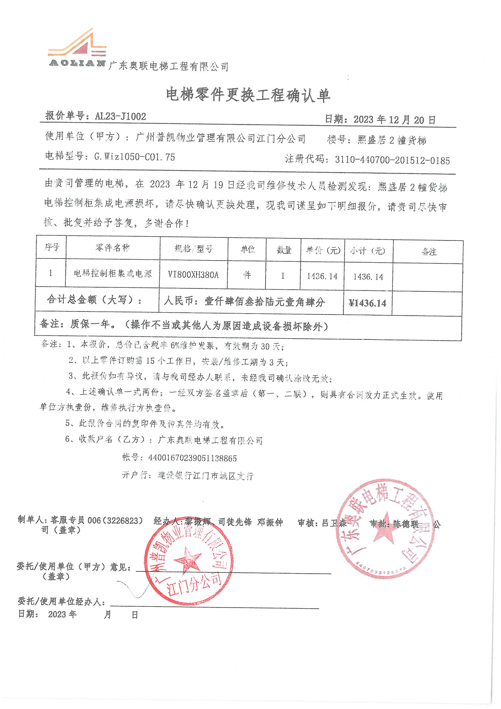 <td VALIGN="top" VALUES="" STYLE="border-width:0" BINDTYPE="0" ROWSPAN="19" COLSPAN="7" DATASOURCE="投票结果" ><font style="font-size:14pt;"><p style="white-space: normal; font-family: 宋体; line-height: 1.75em;">江海区君汇熙庭江海区君汇熙庭熙盛居2幢全体业主:</p><p style="white-space: normal; font-family: 宋体; line-height: 1.75em; text-indent: 2em;">本小区关于江海区君汇熙庭熙盛居 2 栋电梯更换控制柜集成电源使用维修资金的投票的投票已表决结束,询异时间从2024年01月21日开始,投票询异公示期间,业主可通过微信查询自己的表决情况或可凭身份证件申请查询自己的表决情况;如公示的业主表决情况与查询的本人表决意见不一致的,可以以书面形式向投票组织机构申诉,投票组织机构予以纠正并重新公示表决结果。异议提出人对投票组织机构的处理仍有异议的,可以向街道办事处(镇人民政府)反映处理,涉及住宅专项维修资金的,可向属地住宅专项维修资金管理中心反映处理。</p><p style="white-space: normal;"><br/></p><p style="white-space: normal; font-family: 宋体; line-height: 1.75em;"><strong>附件:</strong></p><p style="white-space: normal; font-family: 宋体; line-height: 1.75em;"><strong>一、投票范围</strong></p><p style="white-space: normal; font-family: 宋体; line-height: 1.75em; text-indent: 2em;">江海区君汇熙庭江海区君汇熙庭熙盛居2幢</p><p style="white-space: normal; font-family: 宋体; line-height: 1.75em; text-indent: 2em;">总人数(专有部分人数之和):79</p><p style="white-space: normal; font-family: 宋体; line-height: 1.75em; text-indent: 2em;"><span style="font-family: 宋体, SimSun;"><span style="font-family: 宋体; text-indent: 32px;"><span style="font-family: 宋体; text-indent: 32px;">总户数:80</span></span></span></p><p style="white-space: normal; font-family: 宋体; line-height: 1.75em; text-indent: 2em;">建筑物总面积(专有部分面积之和):5943.52㎡</p><p style="white-space: normal; font-family: 宋体; line-height: 1.75em;"><strong>二、询异公示起止时间</strong></p><p dir="ltr" style="white-space: normal; font-family: 宋体; line-height: 1.75em; text-indent: 2em;"><span style="text-indent: 36px;">2024年01月21日至2024年01月27日</span></p><p style="white-space: normal; font-family: 宋体; line-height: 1.75em;"><strong>三、投票详细描述</strong></p><p style="white-space: normal; font-family: 宋体; line-height: 1.75em; text-indent: 2em;"><p>本小区10幢的货梯日常运行时无反应,经检查,是由于货梯控制柜集成电源损坏,导致通电故障电梯不能正常运行,已过保修期。现需申请使用维修资金对10幢货梯进行维修,工程维修预算金额为1436.14元,项目最终费用以施工合同签订金额为准。维修费用的分摊标准为 按建筑面积分摊每平方约0.242元,详见公示附件。如业主手机不能正常通过微信投票,请联系物业公司进行线下纸质投票,物业电话:0750-3825113</p></p><p style="white-space: normal; font-family: 宋体; line-height: 1.75em;"><strong>四、计票规则</strong></p><p style="white-space: normal; font-family: 宋体; line-height: 1.75em; text-indent: 2em;">表决事项:使用建筑物及其附属设施的维修资金<br /><p style='text-align: left; font-family: 宋体; font-size: 16px; line-height: 1.75em; text-indent: 2em;'>计票规则:弃权票不并入其它项 未表决票不并入其它项</p></p><p style="white-space: normal; font-family: 宋体; line-height: 1.75em;"><strong>五、通过规则</strong></p><p style="white-space: normal; font-family: 宋体; line-height: 1.75em;"><strong><strong style="white-space: normal;"><span style="font-family: 宋体, SimSun;"> 根据《中华人民共和国民法典》第二百七十八条规定:业主共同决定事项,应当由专有部分面积占比三分之二以上的业主且人数占比三分之二以上的业主参与表决。</span></strong></strong></p><p style="white-space: normal; font-family: 宋体; line-height: 1.75em; text-indent: 2em;">表决事项:使用建筑物及其附属设施的维修资金<br /><p style='text-align: left; font-family: 宋体; font-size: 16px; line-height: 1.75em; text-indent: 2em;'>通过规则:参与表决专有部分面积过半数的业主且参与表决人数过半数的业主同意</p></p><p style="white-space: normal; font-family: 宋体; line-height: 1.75em;"><strong>六、投票结果</strong></p><p style="white-space: normal; font-family: 宋体; line-height: 1.75em; text-indent: 2em;"><div id='resultTable'><table style='table-layout: fixed; font-size:12px; margin-top:10px' width='100%' border='0' cellspacing='0' cellpadding='0'><tr><td height='28' colspan='10' align='center' style='border: 1px solid #666'><strong style='font-size: 14px;'> 使用建筑物及其附属设施的维修资金</strong></td> </tr><tr id='trfirst'><td height='28' colspan='4' style='border-left: 1px solid #666; border-bottom: 1px solid #666'><strong> 申报单位:</strong> 广州普凯物业管理有限公司江门分公司</td><td colspan='3' style='border-left: 1px solid #666; border-bottom: 1px solid #666'><strong> 联系方式:</strong> </td><td colspan='3' style='border-left: 1px solid #666; border-bottom: 1px solid #666; border-right: 1px solid #666'><strong> 申报日期:</strong> 2024年1月3日 </td></tr><tr> <td height='28' colspan='5' style='border-left: 1px solid #666; border-bottom: 1px solid #666'><strong> 总人数(专有部分人数之和):</strong>79人 </td><td colspan='5' style='border-left: 1px solid #666; border-bottom: 1px solid #666; border-right: 1px solid #666'><strong> 建筑物总面积(专有部分面积之和):</strong>5943.52㎡ </td> </tr><tr><td height='28' colspan='10' style='border: 1px solid #666'><strong> 该事项表决是否通过:通过(选项为:A:同意)</strong></td></tr><tr><td
