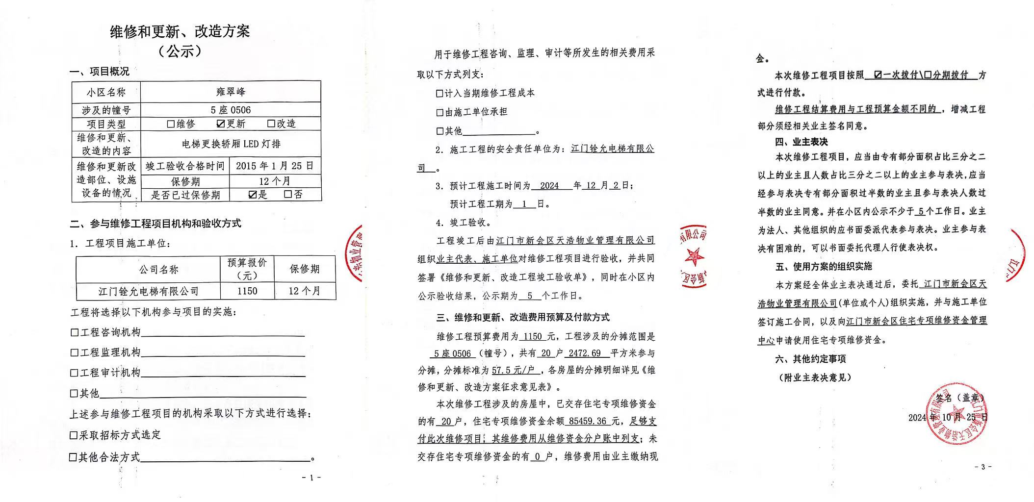 <td VALIGN="top" VALUES="" STYLE="border-width:0" BINDTYPE="0" ROWSPAN="19" COLSPAN="7" DATASOURCE="投票结果" ><font style="font-size:14pt;"><p style="white-space: normal; font-family: 宋体; line-height: 1.75em;">雍翠峰雍翠峰5座全体业主:</p><p style="white-space: normal; font-family: 宋体; line-height: 1.75em; text-indent: 2em;">本小区关于雍翠峰5座0506电梯【梯粤JX4559】更换轿厢LED灯排的使用维修资金的投票的投票已表决结束,询异时间从2024年10月29日开始,投票询异公示期间,业主可通过微信查询自己的表决情况或可凭身份证件申请查询自己的表决情况;如公示的业主表决情况与查询的本人表决意见不一致的,可以以书面形式向投票组织机构申诉,投票组织机构予以纠正并重新公示表决结果。异议提出人对投票组织机构的处理仍有异议的,可以向街道办事处(镇人民政府)反映处理,涉及住宅专项维修资金的,可向属地住宅专项维修资金管理中心反映处理。</p><p style="white-space: normal;"><br/></p><p style="white-space: normal; font-family: 宋体; line-height: 1.75em;"><strong>附件:</strong></p><p style="white-space: normal; font-family: 宋体; line-height: 1.75em;"><strong>一、投票范围</strong></p><p style="white-space: normal; font-family: 宋体; line-height: 1.75em; text-indent: 2em;">雍翠峰雍翠峰5座</p><p style="white-space: normal; font-family: 宋体; line-height: 1.75em; text-indent: 2em;">总人数(专有部分人数之和):20</p><p style="white-space: normal; font-family: 宋体; line-height: 1.75em; text-indent: 2em;"><span style="font-family: 宋体, SimSun;"><span style="font-family: 宋体; text-indent: 32px;"><span style="font-family: 宋体; text-indent: 32px;">总户数:20</span></span></span></p><p style="white-space: normal; font-family: 宋体; line-height: 1.75em; text-indent: 2em;">建筑物总面积(专有部分面积之和):2472.69㎡</p><p style="white-space: normal; font-family: 宋体; line-height: 1.75em;"><strong>二、询异公示起止时间</strong></p><p dir="ltr" style="white-space: normal; font-family: 宋体; line-height: 1.75em; text-indent: 2em;"><span style="text-indent: 36px;">2024年10月29日至2024年11月08日</span></p><p style="white-space: normal; font-family: 宋体; line-height: 1.75em;"><strong>三、投票详细描述</strong></p><p style="white-space: normal; font-family: 宋体; line-height: 1.75em; text-indent: 2em;"><p style="font-family: "Helvetica Neue", Helvetica, Arial, sans-serif; font-size: 14px; text-wrap: wrap; background-color: rgb(255, 255, 255);"> 雍翠峰5座0506电梯【梯粤JX4559】电梯轿厢内LED灯牌故障,经检查确认灯排故障(电子器件常年使用老化损坏),已过保修期。</p><p style="font-family: "Helvetica Neue", Helvetica, Arial, sans-serif; font-size: 14px; text-wrap: wrap; background-color: rgb(255, 255, 255);"> 现需申请使用维修资金对5座0506电梯【梯粤JX4559】进行维修,工程维修预算金额为1150元,项目最终费用以施工合同签订金额为准。维修费用的分摊标准为按分户分摊,每户分摊57.5元,详见公示附件。如业主不能正常通过微信投票,请联系物业公司进行线下纸质投票,物业电话:0750-6125500。</p><p><br/></p></p><p style="white-space: normal; font-family: 宋体; line-height: 1.75em;"><strong>四、计票规则</strong></p><p style="white-space: normal; font-family: 宋体; line-height: 1.75em; text-indent: 2em;">表决事项:使用建筑物及其附属设施的维修资金<br /><p style='text-align: left; font-family: 宋体; font-size: 16px; line-height: 1.75em; text-indent: 2em;'>计票规则:弃权票不并入其它项 未表决票不并入其它项</p></p><p style="white-space: normal; font-family: 宋体; line-height: 1.75em;"><strong>五、通过规则</strong></p><p style="white-space: normal; font-family: 宋体; line-height: 1.75em;"><strong><strong style="white-space: normal;"><span style="font-family: 宋体, SimSun;"> 根据《中华人民共和国民法典》第二百七十八条规定:业主共同决定事项,应当由专有部分面积占比三分之二以上的业主且人数占比三分之二以上的业主参与表决。</span></strong></strong></p><p style="white-space: normal; font-family: 宋体; line-height: 1.75em; text-indent: 2em;">表决事项:使用建筑物及其附属设施的维修资金<br /><p style='text-align: left; font-family: 宋体; font-size: 16px; line-height: 1.75em; text-indent: 2em;'>通过规则:双2/3以上参与表决,参与表决双过半同意</p></p><p style="white-space: normal; font-family: 宋体; line-height: 1.75em;"><strong>六、投票结果</strong></p><p style="white-space: normal; font-family: 宋体; line-height: 1.75em; text-indent: 2em;"><div id='resultTable'><table style='table-layout: fixed; font-size:12px; margin-top:10px' width='100%' border='0' cellspacing='0' cellpadding='0'><tr><td height='28' colspan='10' align='center' style='border: 1px solid #666'><strong style='font-size: 14px;'> 使用建筑物及其附属设施的维修资金</strong></td> </tr><tr id='trfirst'><td height='28' colspan='4' style='border-left: 1px solid #666; border-bottom: 1px solid #666'><strong> 申报单位:</strong> 江门市新会区天浩物业管理有限公司</td><td colspan='3' style='border-left: 1px solid #666; border-bottom: 1px solid #666'><strong> 联系方式:</strong> </td><td colspan='3' style='border-left: 1px solid #666; border-bottom: 1px solid #666; border-right: 1px solid #666'><strong> 申报日期:</strong> 2024年10月25日 </td></tr><tr> <td height='28' colspan='5' style='border-left: 1px solid #666; border-bottom: 1px solid #666'><strong> 总人数(专有部分人数之和):</strong>20人 </td><td colspan='5' style='border-left: 1px solid #666; border-bottom: 1px solid #666; border-right: 1px solid #666'><strong> 建筑物总面积(专有部分面