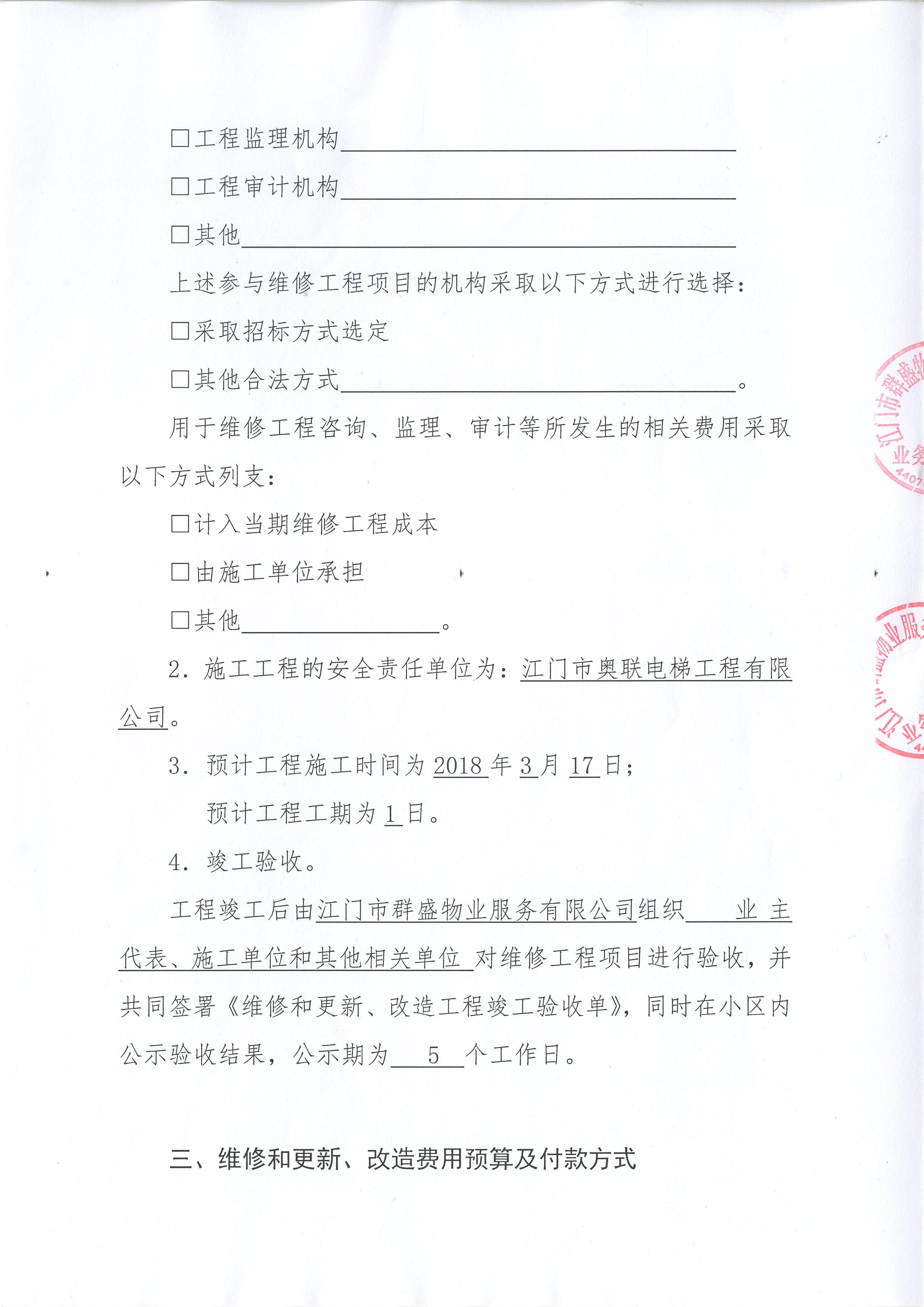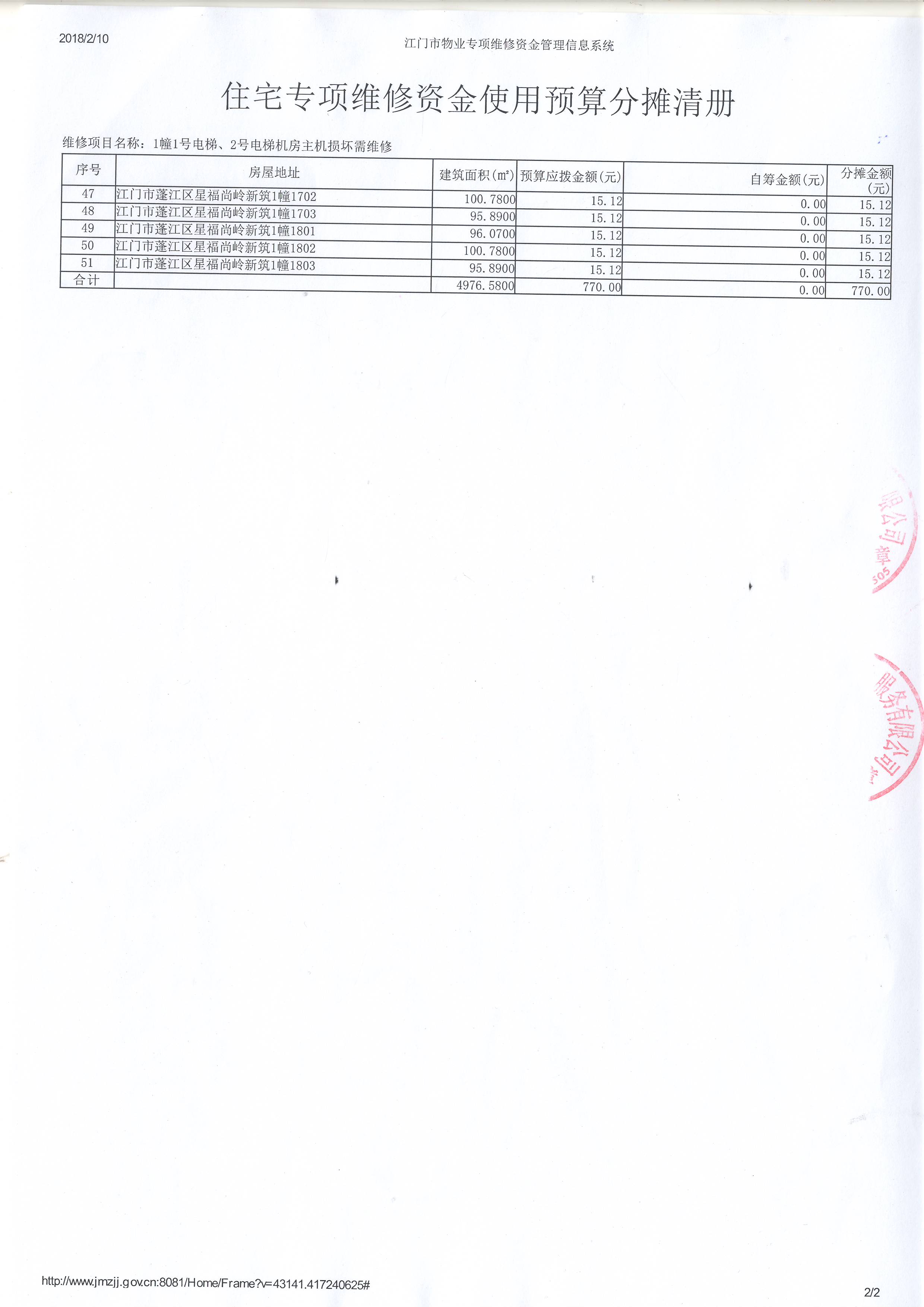 投票结果通知公告时间:从2018年04月22日开始<br/></p><p style="text-align: left; line-height: 1.75em; font-family: 宋体; font-size: 16px;"><strong>三、投票详细描述</strong> </p><p style="text-align: left; line-height: 1.75em; font-family: 宋体; font-size: 16px;"><span style="line-height: 28px; font-family: 宋体;"> </span><p><span style="font-family: "Helvetica Neue", Helvetica, Arial, sans-serif; font-size: 14px; background-color: rgb(255, 255, 255);">本小区1幢1号、2号电梯(Y12122253、Y12122254)出现故障,经检查,是由于该电梯机房主机损坏,已过保修期。</span><br style="font-family: "Helvetica Neue", Helvetica, Arial, sans-serif; font-size: 14px; white-space: normal; background-color: rgb(255, 255, 255);"/><span style="font-family: "Helvetica Neue", Helvetica, Arial, sans-serif; font-size: 14px; background-color: rgb(255, 255, 255);">现需申请使用维修资金对<span style="font-family: "Helvetica Neue", Helvetica, Arial, sans-serif; font-size: 14px; background-color: rgb(255, 255, 255);">1幢1号、2号电梯(Y12122253、Y12122254)机房损坏的主机进行</span>维修,工程维修预算金额为770元,项目最终费用以施工合同签订金额为准。维修费用的分摊标准为每户15.08元,详见附件。</span></p></p><p style="text-align: left; line-height: 1.75em; font-family: 宋体; font-size: 16px;"><strong>四、投票结果</strong> </p><p style="text-align: left; line-height: 1.75em; font-family: 宋体; font-size: 16px;"><table style='table-layout: fixed; font-size:12px; margin-top:10px' width='100%' border='0' cellspacing='0' cellpadding='0'><tr><td height='28' colspan='10' align='center' style='border: 1px solid #666'><strong style='font-size: 14px;'> 星福尚岭新筑花园1幢1、2号电梯机房主机损坏需维修</strong></td> </tr><tr><td height='28' colspan='4' style='border-left: 1px solid #666; border-bottom: 1px solid #666'><strong> 申报单位:</strong> 江门市群盛物业服务有限公司</td><td colspan='3' style='border-left: 1px solid #666; border-bottom: 1px solid #666'><strong> 联系方式:</strong> (0750) 3871336 3829717 </td><td colspan='3' style='border-left: 1px solid #666; border-bottom: 1px solid #666; border-right: 1px solid #666'><strong> 申报日期:</strong> 2018年2月13日 </td></tr><tr> <td height='28' colspan='5' style='border-left: 1px solid #666; border-bottom: 1px solid #666'><strong> 总人数(专有部分人数之和):</strong>51人 </td><td colspan='5' style='border-left: 1px solid #666; border-bottom: 1px solid #666; border-right: 1px solid #666'><strong> 建筑物总面积(专有部分面积之和):</strong>4976.58㎡ </td> </tr><tr><td height='28' colspan='10' bgcolor='#F3F3F3' style='border-left: 1px solid #666;border-bottom: 1px solid #666;border-right: 1px solid #666'><strong> 参与人数及面积统计</strong></td></tr><tr><td height='28' colspan='5' style='border-left: 1px solid #666; border-bottom: 1px solid #666'><strong> 参与表决专有部分人数之和:</strong>1人</td><td colspan='5' style='border-left: 1px solid #666; border-bottom: 1px solid #666; border-right: 1px solid #666'><strong> 参与表决占有表决权总人数比例:</strong>1.96%</td></tr><tr><td height='28' colspan='5' style='border-left: 1px solid #666; border-bottom: 1px solid #666'><strong> 参与表决专有部分面积之和:</strong>95.89㎡</td><td colspan='5' style='border-left: 1px solid #666; border-bottom: 1px solid #666; border-right: 1px solid #666'><strong> 参与表决占有表决权总面积比例:</strong>1.93%</td></tr><tr><td height='28' colspan='10' bgcolor='#F3F3F3' style='border-left: 1px solid #666; border-bottom: 1px solid #666;border-right: 1px solid #666'> <strong> 未参与人数及面积统计</strong></td> </tr><tr><td height='28' colspan='5' style='border-left: 1px solid #666; border-bottom: 1px solid #666'><strong> 未参与表决专有部分人数之和:</strong>50人 </td><td colspan='5' style='border-left: 1px solid #666; border-bottom: 1px solid #666; border-right: 1px solid #666'><strong> 未参与表决占有表决权总人数比例:</strong>98.04%</td></tr><tr><td height='28' colspan='5' style='border-left: 1px solid #666; border-bottom: 1px solid #666'><strong> 未参与表决专有部分面积之和:</strong>4880.69㎡</td><td colspan='5' style='border-left: 1px solid #666; border-bottom: 1px solid #666; border-right: 1px solid #666'><strong> 未参与表决占有表决权总面积比例:</strong>98.07% </td> </tr><tr><td width='6%' rowspan='2' align='center' bgcolor='#F3F3F3' style='border-left: 1px solid #666; border-bottom: 1px solid #666'><strong>序号</strong></td><td width='11%' rowspan='2' align='center' bgcolor='#F3F3F3' style='border-left: 1px solid #666; border-bottom: 1px solid #666'><strong>候选项</strong></td><td height='28' colspan='2' align='center' bgcolor='#F3F3F3' style='border-left: 1px solid #666; border-bottom: 1px solid #666'><strong>表决人数情况</strong> </td><td colspan='2' align='center' bgcolor='#F3F3F3' style='border-left: 1px solid #666; border-bottom: 1px solid #666'><strong>表决面积情况</strong></td><td colspan='4' align='center' bgcolor='#F3F3F3' style='border-left: 1px solid #666; border-bottom: 1px solid #666; border-right: 1px solid #666'><strong>表决方式</strong></td></tr><tr><td width='11%' height='28' align='center' bgcolor='#F3F3F3' style='border-left: 1px solid #666;border-bottom: 1px solid #666'><strong>参与表决<br />专有部分<br />人数之和</strong> </td><td width='11%' align='center' bgcolor='#F3F3F3' style='border-left: 1px solid #666; border-bottom: 1px solid #666'><strong>占有<br /> 表决权<br /> 总人数比例<br /> </strong></td><td width='11%' align='center' bgcolor='#F3F3F3' style='border-left: 1px solid #666; border-bottom: 1px solid #666'><strong>参与表决<br /> 专有部分<br /> 面积之和<br /> </strong></td><td width='13%' align='center' bgco