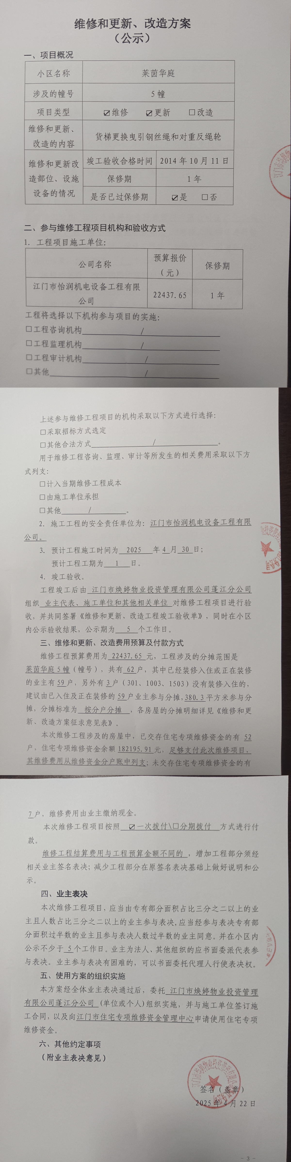 <td VALIGN="top" VALUES="" STYLE="border-width:0" BINDTYPE="0" ROWSPAN="17" COLSPAN="7" DATASOURCE="投票结果" ><font style=" font-family:方正小标宋简体;font-size:14pt;"><p style="line-height: 1.75em;"><span style="font-family: 宋体, SimSun;">各位尊敬的业主:</span><br/></p><p style="text-indent: 2em; line-height: 1.75em;"><span style="font-family: 宋体, SimSun;">根据法律法规的规定,本小区业主利用“江门市物业事项表决管理系统”已对本小区公共事务决策事项(<span style="font-family: 宋体; text-indent: 32px;">莱茵华庭小区5幢货梯更换曳引钢丝绳和对重反绳轮使用维修资金的投票</span>)进行了表决,在经过7日的询异公示期后,未收到业主有效的异议。现将投票结果公告,并就产生的法律效力说明如下:</span></p><p style="line-height: 1.75em; text-indent: 0em;"><strong style="text-indent: 2em;"><span style="font-family: 宋体, SimSun;">一、投票范围</span></strong></p><p style="text-indent: 2em; line-height: 1.75em;"><span style="font-family: 宋体, SimSun;">莱茵华庭蓬江区莱茵华庭5幢</span></p><p style="text-indent: 2em; line-height: 1.75em;"><span style="font-family: 宋体, SimSun;">总人数(专有部分人数之和):59</span></p><p style="text-indent: 2em; line-height: 1.75em;"><span style="font-family: 宋体, SimSun;"><span style="font-family: 宋体, SimSun; text-indent: 32px;"><span style="font-family: 宋体; text-indent: 32px;"><span style="font-family: 宋体; text-indent: 32px;">总户数:59</span></span></span></span></p><p style="text-indent: 2em; line-height: 1.75em;"><span style="font-family: 宋体, SimSun;">建筑物总面积(专有部分面积之和):6443.56㎡</span></p><p style="line-height: 1.75em;"><strong><span style="font-family: 宋体, SimSun;">二、投票结果公告时间</span></strong></p><p style="text-indent: 2em; line-height: 1.75em;"><span style="font-family: 宋体, SimSun;"><span style="font-family: 宋体, SimSun; text-indent: 32px;">从2025年05月23日开始</span></span></p><p style="line-height: 1.75em;"><strong><span style="font-family: 宋体, SimSun;">三、计票规则</span></strong></p><p style="text-indent: 2em; line-height: 1.75em;"><span style="font-family: 宋体, SimSun;">表决事项:使用建筑物及其附属设施的维修资金<br /><p style='font-family: 宋体, SimSun;line-height: 1.75em; text-indent: 2em;'>计票规则:弃权票不并入其它项&nbsp;&nbsp;&nbsp;&nbsp;未表决票不并入其它项</p></span></p><p style="line-height: 1.75em;"><strong><span style="font-family: 宋体, SimSun;">四、通过规则</span></strong></p><p style="line-height: 1.75em;"><strong><span style="font-family: 宋体, SimSun;">&nbsp; 根据《中华人民共和国民法典》第二百七十八条规定:业主共同决定事项,应当由专有部分面积占比三分之二以上的业主且人数占比三分之二以上的业主参与表决。</span></strong></p><p style="text-indent: 2em; line-height: 1.75em;"><span style="font-family: 宋体, SimSun;"><span style="font-family: 宋体, SimSun; text-indent: 32px;">表决事项:使用建筑物及其附属设施的维修资金<br /><p style='font-family: 宋体, SimSun;line-height: 1.75em; text-indent: 2em;'>通过规则:双2/3以上参与表决,参与表决双过半同意</p></span></span></p><p style="line-height: 1.75em;"><strong><span style="font-family: 宋体, SimSun;">五、投票结果</span></strong></p><p style="line-height: 1.75em; text-indent: 2em;"><span style="font-family: 宋体, SimSun; text-indent: 2em;"><div id='resultTable'><table style='table-layout: fixed; font-size:12px; margin-top:10px' width='100%' border='0' cellspacing='0' cellpadding='0'><tr><td height='28' colspan='10' align='center' style='border: 1px solid #666'><strong style='font-size: 14px;'> 使用建筑物及其附属设施的维修资金</strong></td> </tr><tr id='trfirst'><td height='28' colspan='4' style='border-left: 1px solid #666; border-bottom: 1px solid #666'><strong>&nbsp;申报单位:</strong> 江门市焕婷物业投资管理有限公司蓬江分公司</td><td colspan='3' style='border-left: 1px solid #666; border-bottom: 1px solid #666'><strong>&nbsp;联系方式:</strong> 3211392 </td><td colspan='3' style='border-left: 1px solid #666; border-bottom: 1px solid #666; border-right: 1px solid #666'><strong>&nbsp;申报日期:</strong> 2025年4月22日 </td></tr><tr> <td height='28' colspan='5' style='border-left: 1px solid #666; border-bottom: 1px solid #666'><strong>&nbsp;列支总人数(专有部分人数之和):</strong>59人 </td><td colspan='5' style='border-left: 1px solid #666; border-bottom: 1px solid #666; border-right: 1px solid #666'><strong>&nbsp;列支建筑物总面积(专有部分面积之和):</strong>6443.56㎡ </td> </tr><tr><td height='28' colspan='10' bgcolor='#F3F3F3' style='border-left: 1px solid #666;border-bottom: 1px solid #666;border-right: 1px solid #666'><strong>&nbsp;参与表决人数及面积统计</strong></td></tr><tr><td height='28' colspan='5' style='border-left: 1px solid #666; border-bottom: 1px solid #666'><strong>&nbsp;参与表决人数:</strong>45人</td><td colspan='5' style='border-left: 1px solid #666; border-bottom: 1px solid #666; border-right: 1px solid #666'><strong>&nbsp;参与表决人数占总人数比例:</strong>76.27%</td></tr><tr><td height='28' colspan='5' style='border-left: 1px solid #666; border-bottom: 1px solid #666'><strong>&nbsp;参与表决面积:</strong>4985.44㎡</td><td colspan='5' style='border-left: 1px solid #666; border-bottom: 1px solid #666; border-right: 1px solid #666'><strong>&nbsp;参与表决面积占总面积比例:</strong>77.37%</td></tr><tr><td height='28' colspan='10' bgcolor='#F3F3F3' style='border-left: 1px solid #666; border-bottom: 1px solid #666;border-right: 1px solid #666'> <strong>&nbsp;参与表决同意人数及面积统计</strong></td> </tr><tr><td height='28' colspan='5' st