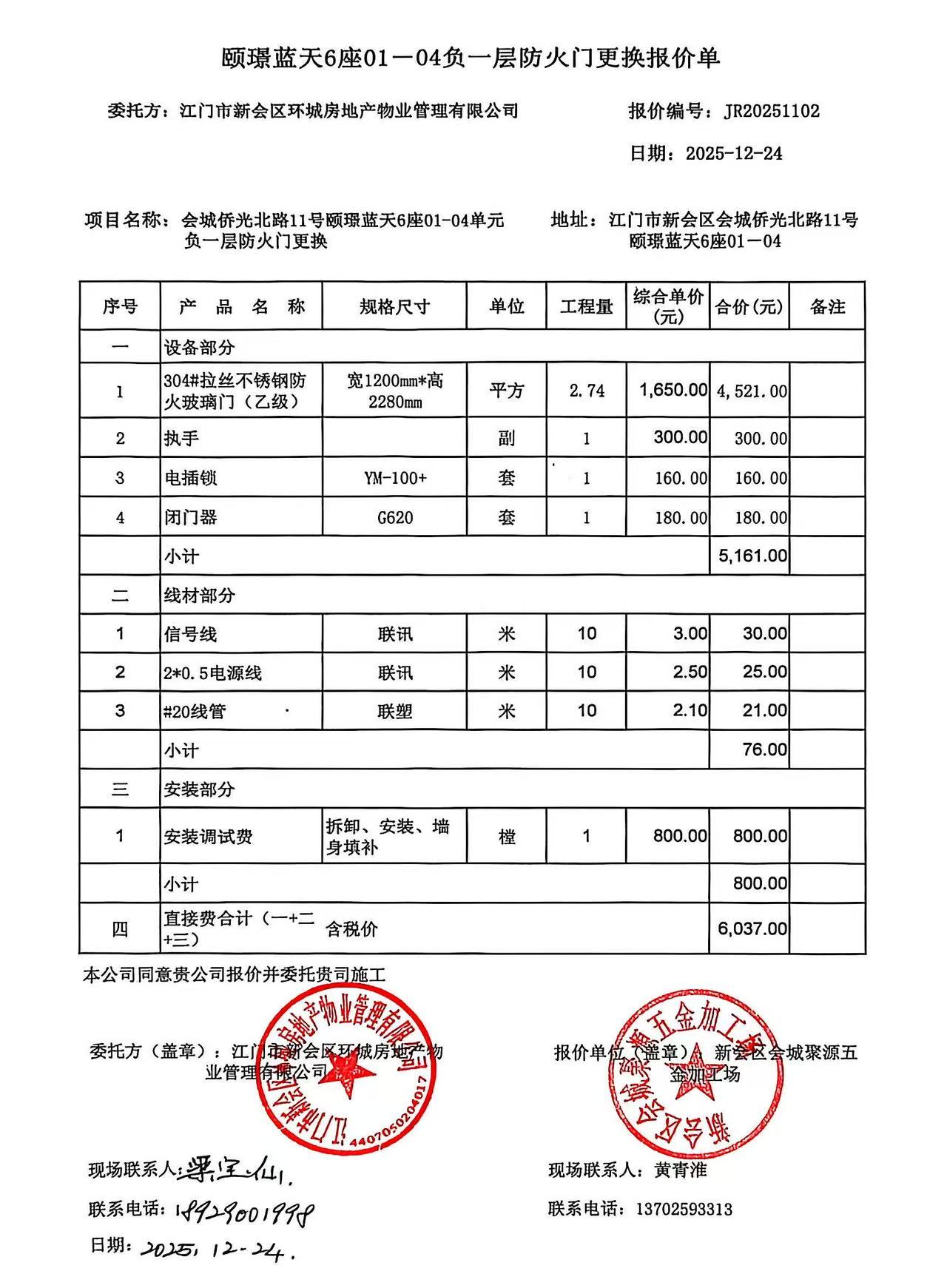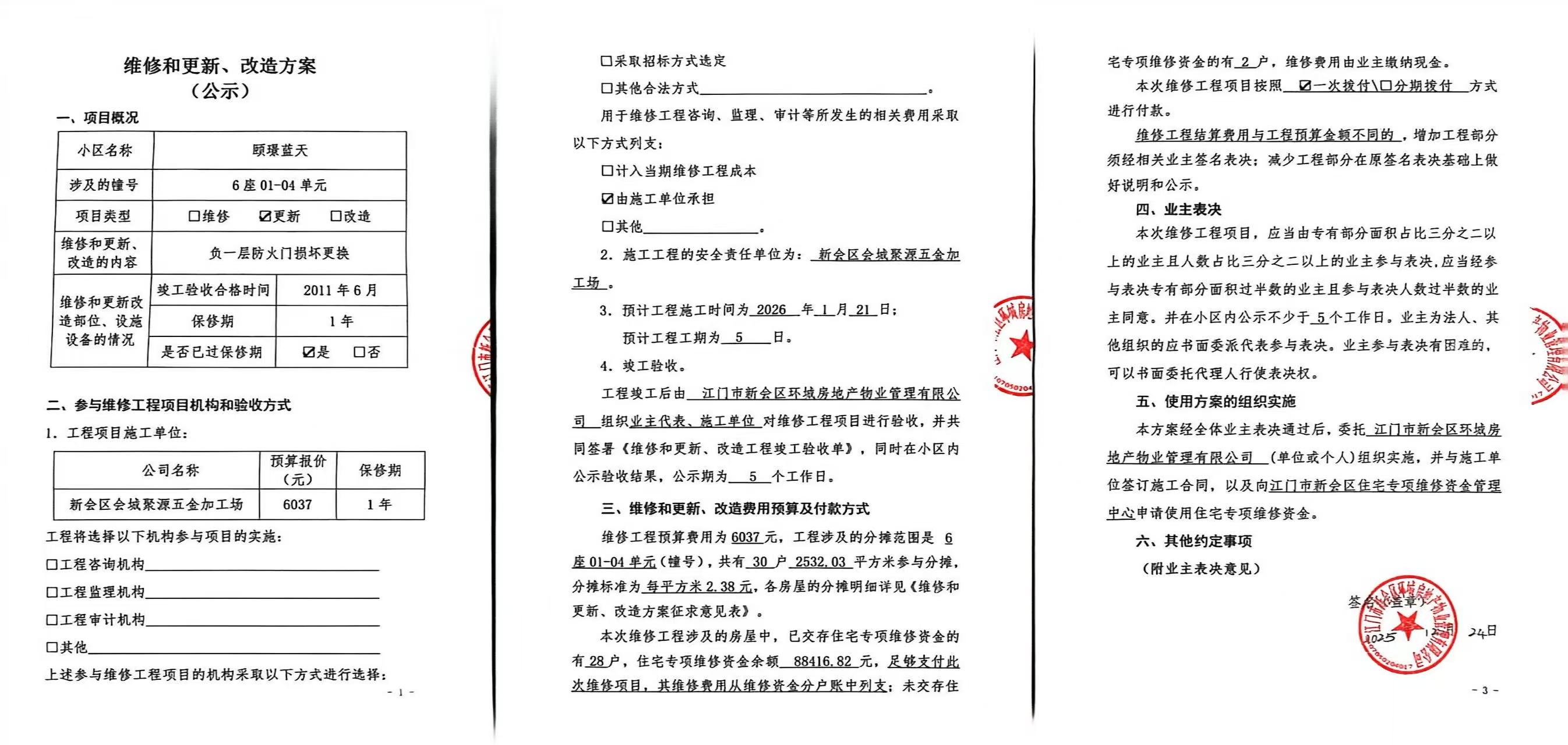 <td valign="top" values="" style="border-width:0" bindtype="0" rowspan="17" colspan="7" datasource="投票结果"><font style=" font-family:方正小标宋简体;font-size:14pt;"><p style="line-height: 1.75em;"><span style="font-family: 宋体, SimSun;">各位尊敬的业主:</span><br></p><p style="text-indent: 2em; line-height: 1.75em;"><span style="font-family: 宋体, SimSun;">根据法律法规的规定,本小区业主利用“江门市物业事项表决管理系统”已对本小区公共事务决策事项(<span style="font-family: 宋体; text-indent: 32px;">会城侨光北路11号颐璟蓝天6座01-04单元负一层防火门更换使用维修资金的投票</span>)进行了表决,在经过7日的询异公示期后,未收到业主有效的异议。现将投票结果公告,并就产生的法律效力说明如下:</span></p><p style="line-height: 1.75em; text-indent: 0em;"><strong style="text-indent: 2em;"><span style="font-family: 宋体, SimSun;">一、投票范围</span></strong></p><p style="text-indent: 2em; line-height: 1.75em;"><span style="font-family: 宋体, SimSun;">颐璟蓝天会城侨光北路11号颐璟蓝天6座</span></p><p style="text-indent: 2em; line-height: 1.75em;"><span style="font-family: 宋体, SimSun;">总人数(专有部分人数之和):17</span></p><p style="text-indent: 2em; line-height: 1.75em;"><span style="font-family: 宋体, SimSun;"><span style="font-family: 宋体, SimSun; text-indent: 32px;"><span style="font-family: 宋体; text-indent: 32px;"><span style="font-family: 宋体; text-indent: 32px;">总户数:30</span></span></span></span></p><p style="text-indent: 2em; line-height: 1.75em;"><span style="font-family: 宋体, SimSun;">建筑物总面积(专有部分面积之和):2532.03㎡</span></p><p style="line-height: 1.75em;"><strong><span style="font-family: 宋体, SimSun;">二、投票结果公告时间</span></strong></p><p style="text-indent: 2em; line-height: 1.75em;"><span style="font-family: 宋体, SimSun;"><span style="font-family: 宋体, SimSun; text-indent: 32px;">从2026年03月13日开始</span></span></p><p style="line-height: 1.75em;"><strong><span style="font-family: 宋体, SimSun;">三、计票规则</span></strong></p><p style="text-indent: 2em; line-height: 1.75em;"><span style="font-family: 宋体, SimSun;">表决事项:使用建筑物及其附属设施的维修资金<br></span></p><p style="font-family: 宋体, SimSun;line-height: 1.75em; text-indent: 2em;">计票规则:弃权票不并入其它项 未表决票不并入其它项</p><p></p><p style="line-height: 1.75em;"><strong><span style="font-family: 宋体, SimSun;">四、通过规则</span></strong></p><p style="line-height: 1.75em;"><strong><span style="font-family: 宋体, SimSun;"> 根据《中华人民共和国民法典》第二百七十八条规定:业主共同决定事项,应当由专有部分面积占比三分之二以上的业主且人数占比三分之二以上的业主参与表决。</span></strong></p><p style="text-indent: 2em; line-height: 1.75em;"><span style="font-family: 宋体, SimSun;"><span style="font-family: 宋体, SimSun; text-indent: 32px;">表决事项:使用建筑物及其附属设施的维修资金<br></span></span></p><p style="font-family: 宋体, SimSun;line-height: 1.75em; text-indent: 2em;">通过规则:双2/3以上参与表决,参与表决双过半同意</p><p></p><p style="line-height: 1.75em;"><strong><span style="font-family: 宋体, SimSun;">五、投票结果</span></strong></p><p style="line-height: 1.75em; text-indent: 2em;"><span style="font-family: 宋体, SimSun; text-indent: 2em;"></span></p><div id="resultTable"><table style="table-layout: fixed; font-size:12px; margin-top:10px" width="100%" border="0" cellspacing="0" cellpadding="0"><tbody><tr><td height="28" colspan="10" align="center" style="border: 1px solid #666"><strong style="font-size: 14px;"> 使用建筑物及其附属设施的维修资金</strong></td> </tr><tr id="trfirst"><td height="28" colspan="4" style="border-left: 1px solid #666; border-bottom: 1px solid #666"><strong> 申报单位:</strong> 新会区环城房地产物业管理有限公司</td><td colspan="3" style="border-left: 1px solid #666; border-bottom: 1px solid #666"><strong> 联系方式:</strong> </td><td colspan="3" style="border-left: 1px solid #666; border-bottom: 1px solid #666; border-right: 1px solid #666"><strong> 申报日期:</strong> 2025年12月19日 </td></tr><tr> <td height="28" colspan="5" style="border-left: 1px solid #666; border-bottom: 1px solid #666"><strong> 列支总人数(专有部分人数之和):</strong>17人 </td><td colspan="5" style="border-left: 1px solid #666; border-bottom: 1px solid #666; border-right: 1px solid #666"><strong> 列支建筑物总面积(专有部分面积之和):</strong>2532.03㎡ </td> </tr><tr><td height="28" colspan="10" bgcolor="#F3F3F3" style="border-left: 1px solid #666;border-bottom: 1px solid #666;border-right: 1px solid #666"><strong> 参与表决人数及面积统计</strong></td></tr><tr><td height="28" colspan="5" style="border-left: 1px solid #666; border-bottom: 1px solid #666"><strong> 参与表决人数:</strong>13人</td><td colspan="5" style="border-left: 1px solid #666; border-bottom: 1px solid #666; border-right: 1px solid #666"><strong> 参与表决人数占总人数比例:</strong>76.47%</td></tr><tr><td height="28" colspan="5" style="border-left: 1px solid #666; border-bottom: 1px solid #666"><strong> 参与表决面积:</strong>1794.05㎡</td><td colspan="5" style="border-left: 1px solid #666; border-bottom: 1px solid #666; border-right: 1px solid #666"><strong> 参与表决面积占总面积比例:</strong>70.85%</td></tr><tr><td height="28" colspan="10" bgcolor="#F3F3F3" style="border-left: 1px solid #666; border-bottom: 1px solid #666;border-right: 1px solid #666"> <strong> 参与表决同意人数及面积统计</strong></td> </tr><tr><td height="28" colspan="5" style="border-left: 1px solid #666; border-bottom: 1px sol