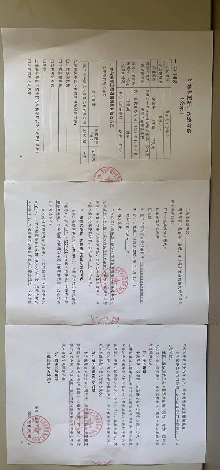 <td VALIGN="top" VALUES="" STYLE="border-width:0" BINDTYPE="0" ROWSPAN="19" COLSPAN="7" DATASOURCE="投票结果" ><font style="font-size:14pt;"><p style="white-space: normal; font-family: 宋体; line-height: 1.75em;">高尔夫1号华府蓬江区绿茵豪苑高尔夫1号华府5幢之一全体业主:</p><p style="white-space: normal; font-family: 宋体; line-height: 1.75em; text-indent: 2em;">本小区关于高尔夫1号华府5幢之一客梯维修AVO变频器、货梯更换双8单梯显示板的投票的投票已表决结束,询异时间从2024年10月16日开始,投票询异公示期间,业主可通过微信查询自己的表决情况或可凭身份证件申请查询自己的表决情况;如公示的业主表决情况与查询的本人表决意见不一致的,可以以书面形式向投票组织机构申诉,投票组织机构予以纠正并重新公示表决结果。异议提出人对投票组织机构的处理仍有异议的,可以向街道办事处(镇人民政府)反映处理,涉及住宅专项维修资金的,可向属地住宅专项维修资金管理中心反映处理。</p><p style="white-space: normal;"><br/></p><p style="white-space: normal; font-family: 宋体; line-height: 1.75em;"><strong>附件:</strong></p><p style="white-space: normal; font-family: 宋体; line-height: 1.75em;"><strong>一、投票范围</strong></p><p style="white-space: normal; font-family: 宋体; line-height: 1.75em; text-indent: 2em;">高尔夫1号华府蓬江区绿茵豪苑高尔夫1号华府5幢之一</p><p style="white-space: normal; font-family: 宋体; line-height: 1.75em; text-indent: 2em;">总人数(专有部分人数之和):32</p><p style="white-space: normal; font-family: 宋体; line-height: 1.75em; text-indent: 2em;"><span style="font-family: 宋体, SimSun;"><span style="font-family: 宋体; text-indent: 32px;"><span style="font-family: 宋体; text-indent: 32px;">总户数:32</span></span></span></p><p style="white-space: normal; font-family: 宋体; line-height: 1.75em; text-indent: 2em;">建筑物总面积(专有部分面积之和):5773.94㎡</p><p style="white-space: normal; font-family: 宋体; line-height: 1.75em;"><strong>二、询异公示起止时间</strong></p><p dir="ltr" style="white-space: normal; font-family: 宋体; line-height: 1.75em; text-indent: 2em;"><span style="text-indent: 36px;">2024年10月16日至2024年10月22日</span></p><p style="white-space: normal; font-family: 宋体; line-height: 1.75em;"><strong>三、投票详细描述</strong></p><p style="white-space: normal; font-family: 宋体; line-height: 1.75em; text-indent: 2em;"><p><span style="font-family: "Helvetica Neue", Helvetica, Arial, sans-serif; font-size: 14px; text-wrap: wrap; background-color: rgb(255, 255, 255);">高尔夫1号华府小区5幢之一的客梯日常运行时出现异常导致停止运行,货梯17楼不能呼梯。经检查,是由于客梯AVO变频器而不能运行,货梯因17楼外呼显示板失效导致;因使用时间较长,零件原件达到报废条件而不能正常运行。</span><br style="font-family: "Helvetica Neue", Helvetica, Arial, sans-serif; font-size: 14px; text-wrap: wrap; background-color: rgb(255, 255, 255);"/><span style="font-family: "Helvetica Neue", Helvetica, Arial, sans-serif; font-size: 14px; text-wrap: wrap; background-color: rgb(255, 255, 255);"> 现对5幢之一的客梯进行维修,货梯更换;工程维修预算金额为3849.88元,项目最终费用以施工合同签订金额为准。因已过保修期,维修费用由相关业主按分户分摊,每户为120.28元,详见公示附件。如业主手机不能正常通过微信投票,请联系物业公司进行线下纸质投票,物业电话:0750-3068388。</span></p></p><p style="white-space: normal; font-family: 宋体; line-height: 1.75em;"><strong>四、计票规则</strong></p><p style="white-space: normal; font-family: 宋体; line-height: 1.75em; text-indent: 2em;">表决事项:使用建筑物及其附属设施的维修资金<br /><p style='text-align: left; font-family: 宋体; font-size: 16px; line-height: 1.75em; text-indent: 2em;'>计票规则:弃权票不并入其它项 未表决票不并入其它项</p></p><p style="white-space: normal; font-family: 宋体; line-height: 1.75em;"><strong>五、通过规则</strong></p><p style="white-space: normal; font-family: 宋体; line-height: 1.75em;"><strong><strong style="white-space: normal;"><span style="font-family: 宋体, SimSun;"> 根据《中华人民共和国民法典》第二百七十八条规定:业主共同决定事项,应当由专有部分面积占比三分之二以上的业主且人数占比三分之二以上的业主参与表决。</span></strong></strong></p><p style="white-space: normal; font-family: 宋体; line-height: 1.75em; text-indent: 2em;">表决事项:使用建筑物及其附属设施的维修资金<br /><p style='text-align: left; font-family: 宋体; font-size: 16px; line-height: 1.75em; text-indent: 2em;'>通过规则:双2/3以上参与表决,参与表决双过半同意</p></p><p style="white-space: normal; font-family: 宋体; line-height: 1.75em;"><strong>六、投票结果</strong></p><p style="white-space: normal; font-family: 宋体; line-height: 1.75em; text-indent: 2em;"><div id='resultTable'><table style='table-layout: fixed; font-size:12px; margin-top:10px' width='100%' border='0' cellspacing='0' cellpadding='0'><tr><td height='28' colspan='10' align='center' style='border: 1px solid #666'><strong style='font-size: 14px;'> 使用建筑物及其附属设施的维修资金</strong></td> </tr><tr id='trfirst'><td height='28' colspan='4' style='border-left: 1px solid #666; border-bottom: 1px solid #666'><strong> 申报单位:</strong> 珠海中珠物业管理服务有限公司蓬江分公司</td><td colspan='3' style='border-left: 1px solid #666; border-bottom: 1px solid #666'><strong> 联系方式:</strong> </td><td colspan='3' style='border-left: 1px solid #666; border-bottom: 1px solid #666; border-right: 1px solid #6