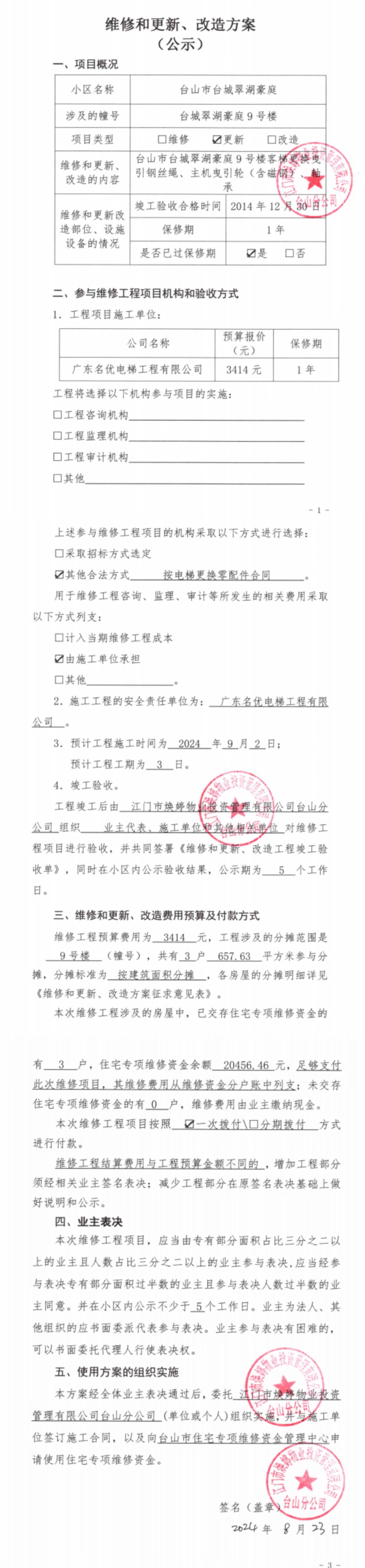 <td VALIGN="top" VALUES="" STYLE="border-width:0" BINDTYPE="0" ROWSPAN="19" COLSPAN="7" DATASOURCE="投票结果" ><font style="font-size:14pt;"><p style="white-space: normal; font-family: 宋体; line-height: 1.75em;">台山市台城翠湖豪庭翠湖豪庭9号全体业主:</p><p style="white-space: normal; font-family: 宋体; line-height: 1.75em; text-indent: 2em;">本小区关于翠湖豪庭9栋客梯更换曳引钢丝绳、主机曳引轮(含磁钢)、轴承使用维修资金的投票。的投票已表决结束,询异时间从2024年08月30日开始,投票询异公示期间,业主可通过微信查询自己的表决情况或可凭身份证件申请查询自己的表决情况;如公示的业主表决情况与查询的本人表决意见不一致的,可以以书面形式向投票组织机构申诉,投票组织机构予以纠正并重新公示表决结果。异议提出人对投票组织机构的处理仍有异议的,可以向街道办事处(镇人民政府)反映处理,涉及住宅专项维修资金的,可向属地住宅专项维修资金管理中心反映处理。</p><p style="white-space: normal;"><br/></p><p style="white-space: normal; font-family: 宋体; line-height: 1.75em;"><strong>附件:</strong></p><p style="white-space: normal; font-family: 宋体; line-height: 1.75em;"><strong>一、投票范围</strong></p><p style="white-space: normal; font-family: 宋体; line-height: 1.75em; text-indent: 2em;">台山市台城翠湖豪庭翠湖豪庭9号</p><p style="white-space: normal; font-family: 宋体; line-height: 1.75em; text-indent: 2em;">总人数(专有部分人数之和):3</p><p style="white-space: normal; font-family: 宋体; line-height: 1.75em; text-indent: 2em;"><span style="font-family: 宋体, SimSun;"><span style="font-family: 宋体; text-indent: 32px;"><span style="font-family: 宋体; text-indent: 32px;">总户数:3</span></span></span></p><p style="white-space: normal; font-family: 宋体; line-height: 1.75em; text-indent: 2em;">建筑物总面积(专有部分面积之和):657.63㎡</p><p style="white-space: normal; font-family: 宋体; line-height: 1.75em;"><strong>二、询异公示起止时间</strong></p><p dir="ltr" style="white-space: normal; font-family: 宋体; line-height: 1.75em; text-indent: 2em;"><span style="text-indent: 36px;">2024年08月30日至2024年09月05日</span></p><p style="white-space: normal; font-family: 宋体; line-height: 1.75em;"><strong>三、投票详细描述</strong></p><p style="white-space: normal; font-family: 宋体; line-height: 1.75em; text-indent: 2em;"><p><span style="font-size: 14px; background-color: rgb(255, 255, 255); font-family: 宋体;"> </span><span style="font-size: 14px; font-family: 宋体;">小区</span><span style="font-size: 14px; font-family: 宋体; background-image: initial; background-position: initial; background-size: initial; background-repeat: initial; background-attachment: initial; background-origin: initial; background-clip: initial;"><span style="font-family: Calibri;">9</span>幢</span><span style="font-size: 14px; font-family: 宋体;">的</span><span style="font-size: 14px; font-family: 宋体; background-image: initial; background-position: initial; background-size: initial; background-repeat: initial; background-attachment: initial; background-origin: initial; background-clip: initial;">客梯在日常运行时出现异响,经</span><span style="font-size: 14px; font-family: 宋体;">检查发现电梯主机曳引轮、曳引钢丝绳、轴承等配件出现磨损及有使用年久出现老化等现象,导致运行发出异响。</span></p><p><span style="font-size: 14px; font-family: 宋体;"> 现对</span><span style="font-size: 14px; font-family: 宋体; background-image: initial; background-position: initial; background-size: initial; background-repeat: initial; background-attachment: initial; background-origin: initial; background-clip: initial;"><span style="font-family: Calibri;">9</span>幢客梯进行维修</span><span style="font-size: 14px; font-family: 宋体;">,工程维修预算金额为</span><span style="font-size: 14px; font-family: 宋体; background-image: initial; background-position: initial; background-size: initial; background-repeat: initial; background-attachment: initial; background-origin: initial; background-clip: initial;"><span style="font-family: Calibri;">3414</span>元</span><span style="font-size: 14px; font-family: 宋体;">,项目最终费用以施工合同签订金额为准。因已过保修期,维修费用由相关业主</span><span style="font-size: 14px; font-family: 宋体; background-image: initial; background-position: initial; background-size: initial; background-repeat: initial; background-attachment: initial; background-origin: initial; background-clip: initial;">按建筑面积</span><span style="font-size: 14px; font-family: 宋体;">分摊,</span><span style="font-size: 14px; font-family: 宋体; background-image: initial; background-position: initial; background-size: initial; background-repeat: initial; background-attachment: initial; background-origin: initial; background-clip: initial;">每平方约</span><span style="font-size: 14px; background-image: initial; background-position: initial; background-size: initial; background-repeat: initial; background-attachment: initial; background-origin: initial; background-clip: initial;"><span style="font-family:Calibri">5.19</span><span style="font-family:宋体">元</span></span><span style="font-size: 14px; font-family: 宋体;">,详见公示附件。如业主手机不能正常通过微信投票,请联系物业公司进行线下纸质投票,物业电话</span><span style="font-size: 14px; font-family: 宋体; background-image: initial; background-position: initial; background-size: initial; background-repeat: initial; background-attachment: initial; background-origin: initial; background-clip: initial;">:<span style="font-family: Calibri;">0750-5555630</span></span><span style="font-size: 14px; f