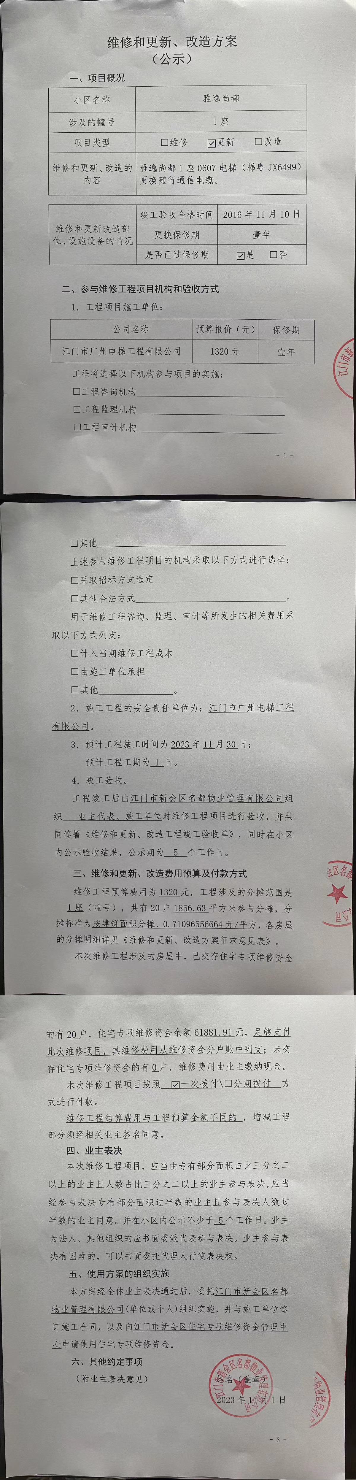 <td valign="top" values="" style="border-width:0" bindtype="0" rowspan="17" colspan="7" datasource="投票结果"><font style=" font-family:方正小标宋简体;font-size:14pt;"><p style="line-height: 1.75em;"><span style="font-family: 宋体, SimSun;">各位尊敬的业主:</span><br></p><p style="text-indent: 2em; line-height: 1.75em;"><span style="font-family: 宋体, SimSun;">根据法律法规的规定,本小区业主利用“江门市物业事项表决管理系统”已对本小区公共事务决策事项进行了表决,在经过7日的询异公示期后,未收到业主有效的异议。现将投票结果公告,并就产生的法律效力说明如下:</span></p><p style="line-height: 1.75em; text-indent: 0em;"><strong style="text-indent: 2em;"><span style="font-family: 宋体, SimSun;">一、投票范围</span></strong></p><p style="text-indent: 2em; line-height: 1.75em;"><span style="font-family: 宋体, SimSun;">雅逸尚都雅逸尚都1座</span></p><p style="text-indent: 2em; line-height: 1.75em;"><span style="font-family: 宋体, SimSun;">总人数(专有部分人数之和):20</span></p><p style="text-indent: 2em; line-height: 1.75em;"><span style="font-family: 宋体, SimSun;"><span style="font-family: 宋体, SimSun; text-indent: 32px;"><span style="font-family: 宋体; text-indent: 32px;">总户数:20</span></span></span></p><p style="text-indent: 2em; line-height: 1.75em;"><span style="font-family: 宋体, SimSun;">建筑物总面积(专有部分面积之和):1856.63㎡</span></p><p style="line-height: 1.75em;"><strong><span style="font-family: 宋体, SimSun;">二、投票结果公告时间</span></strong></p><p style="text-indent: 2em; line-height: 1.75em;"><span style="font-family: 宋体, SimSun;">从2023年11月22日开始</span></p><p style="line-height: 1.75em;"><strong><span style="font-family: 宋体, SimSun;">三、计票规则</span></strong></p><p style="text-indent: 2em; line-height: 1.75em;"><span style="font-family: 宋体, SimSun;">表决事项:使用建筑物及其附属设施的维修资金<br></span></p><p style="font-family: 宋体, SimSun;line-height: 1.75em; text-indent: 2em;">计票规则:弃权票不并入其它项 未表决票不并入其它项</p><p></p><p style="line-height: 1.75em;"><strong><span style="font-family: 宋体, SimSun;">四、通过规则</span></strong></p><p style="line-height: 1.75em;"><strong><span style="font-family: 宋体, SimSun;"> 根据《中华人民共和国民法典》第二百七十八条规定:业主共同决定事项,应当由专有部分面积占比三分之二以上的业主且人数占比三分之二以上的业主参与表决。</span></strong></p><p style="text-indent: 2em; line-height: 1.75em;"><span style="font-family: 宋体, SimSun;"><span style="font-family: 宋体, SimSun; text-indent: 32px;">表决事项:使用建筑物及其附属设施的维修资金<br></span></span></p><p style="font-family: 宋体, SimSun;line-height: 1.75em; text-indent: 2em;">通过规则:参与表决专有部分面积过半数的业主且参与表决人数过半数的业主同意</p><p></p><p style="line-height: 1.75em;"><strong><span style="font-family: 宋体, SimSun;">五、投票结果</span></strong></p><p style="line-height: 1.75em; text-indent: 2em;"><span style="font-family: 宋体, SimSun; text-indent: 2em;"></span></p><div id="resultTable"><table style="table-layout: fixed; font-size:12px; margin-top:10px" width="100%" border="0" cellspacing="0" cellpadding="0"><tbody><tr><td height="28" colspan="10" align="center" style="border: 1px solid #666"><strong style="font-size: 14px;"> 使用建筑物及其附属设施的维修资金</strong></td> </tr><tr id="trfirst"><td height="28" colspan="4" style="border-left: 1px solid #666; border-bottom: 1px solid #666"><strong> 申报单位:</strong> 江门市新会区名都物业管理有限公司</td><td colspan="3" style="border-left: 1px solid #666; border-bottom: 1px solid #666"><strong> 联系方式:</strong> 6609908 </td><td colspan="3" style="border-left: 1px solid #666; border-bottom: 1px solid #666; border-right: 1px solid #666"><strong> 申报日期:</strong> 2023年11月2日 </td></tr><tr> <td height="28" colspan="5" style="border-left: 1px solid #666; border-bottom: 1px solid #666"><strong> 总人数(专有部分人数之和):</strong>20人 </td><td colspan="5" style="border-left: 1px solid #666; border-bottom: 1px solid #666; border-right: 1px solid #666"><strong> 建筑物总面积(专有部分面积之和):</strong>1856.63㎡ </td> </tr><tr><td height="28" colspan="10" bgcolor="#F3F3F3" style="border-left: 1px solid #666;border-bottom: 1px solid #666;border-right: 1px solid #666"><strong> 参与人数及面积统计</strong></td></tr><tr><td height="28" colspan="5" style="border-left: 1px solid #666; border-bottom: 1px solid #666"><strong> 参与表决专有部分人数之和:</strong>16人</td><td colspan="5" style="border-left: 1px solid #666; border-bottom: 1px solid #666; border-right: 1px solid #666"><strong> 参与表决占有表决权总人数比例:</strong>80.00%</td></tr><tr><td height="28" colspan="5" style="border-left: 1px solid #666; border-bottom: 1px solid #666"><strong> 参与表决专有部分面积之和:</strong>1483.79㎡</td><td colspan="5" style="border-left: 1px solid #666; border-bottom: 1px solid #666; border-right: 1px solid #666"><strong> 参与表决占有表决权总面积比例:</strong>79.92%</td></tr><tr><td height="28" colspan="10" bgcolor="#F3F3F3" style="border-left: 1px solid #666; border-bottom: 1px solid #666;border-right: 1px solid #666"> <strong> 未参与人数及面积统计</strong></td> </tr><tr><td height="28" colspan="5" style="border-left: 1px solid #666; border-bottom: 1px solid #666"><strong> 未参与表决专有部分人数之和:</strong>4人 </td><td colspan="5" style="border-left: 1px solid #666; border-bottom: 1px solid #666; border-right: 1px solid #666"><strong> 未参与表决占有表决权总人数比例:</s