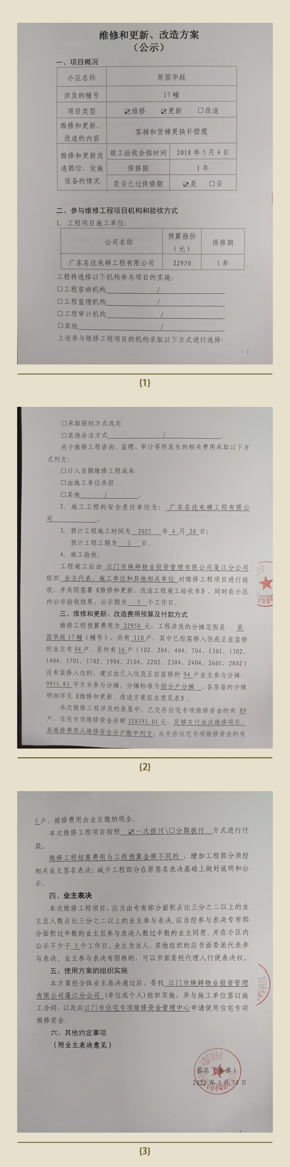 <td VALIGN="top" VALUES="" STYLE="border-width:0" BINDTYPE="0" ROWSPAN="17" COLSPAN="7" DATASOURCE="投票结果" ><font style=" font-family:方正小标宋简体;font-size:14pt;"><p style="line-height: 1.75em;"><span style="font-family: 宋体, SimSun;">各位尊敬的业主:</span><br/></p><p style="text-indent: 2em; line-height: 1.75em;"><span style="font-family: 宋体, SimSun;">根据法律法规的规定,本小区业主利用“江门市物业事项表决管理系统”已对本小区公共事务决策事项(<span style="font-family: 宋体; text-indent: 32px;">莱茵华庭小区17幢客梯和货梯更换补偿缆使用维修资金的投票</span>)进行了表决,在经过7日的询异公示期后,未收到业主有效的异议。现将投票结果公告,并就产生的法律效力说明如下:</span></p><p style="line-height: 1.75em; text-indent: 0em;"><strong style="text-indent: 2em;"><span style="font-family: 宋体, SimSun;">一、投票范围</span></strong></p><p style="text-indent: 2em; line-height: 1.75em;"><span style="font-family: 宋体, SimSun;">莱茵华庭蓬江区莱茵华庭17幢</span></p><p style="text-indent: 2em; line-height: 1.75em;"><span style="font-family: 宋体, SimSun;">总人数(专有部分人数之和):94</span></p><p style="text-indent: 2em; line-height: 1.75em;"><span style="font-family: 宋体, SimSun;"><span style="font-family: 宋体, SimSun; text-indent: 32px;"><span style="font-family: 宋体; text-indent: 32px;"><span style="font-family: 宋体; text-indent: 32px;">总户数:94</span></span></span></span></p><p style="text-indent: 2em; line-height: 1.75em;"><span style="font-family: 宋体, SimSun;">建筑物总面积(专有部分面积之和):9955.83㎡</span></p><p style="line-height: 1.75em;"><strong><span style="font-family: 宋体, SimSun;">二、投票结果公告时间</span></strong></p><p style="text-indent: 2em; line-height: 1.75em;"><span style="font-family: 宋体, SimSun;"><span style="font-family: 宋体, SimSun; text-indent: 32px;">从2025年05月08日开始</span></span></p><p style="line-height: 1.75em;"><strong><span style="font-family: 宋体, SimSun;">三、计票规则</span></strong></p><p style="text-indent: 2em; line-height: 1.75em;"><span style="font-family: 宋体, SimSun;">表决事项:使用建筑物及其附属设施的维修资金<br /><p style='font-family: 宋体, SimSun;line-height: 1.75em; text-indent: 2em;'>计票规则:弃权票不并入其它项&nbsp;&nbsp;&nbsp;&nbsp;未表决票不并入其它项</p></span></p><p style="line-height: 1.75em;"><strong><span style="font-family: 宋体, SimSun;">四、通过规则</span></strong></p><p style="line-height: 1.75em;"><strong><span style="font-family: 宋体, SimSun;">&nbsp; 根据《中华人民共和国民法典》第二百七十八条规定:业主共同决定事项,应当由专有部分面积占比三分之二以上的业主且人数占比三分之二以上的业主参与表决。</span></strong></p><p style="text-indent: 2em; line-height: 1.75em;"><span style="font-family: 宋体, SimSun;"><span style="font-family: 宋体, SimSun; text-indent: 32px;">表决事项:使用建筑物及其附属设施的维修资金<br /><p style='font-family: 宋体, SimSun;line-height: 1.75em; text-indent: 2em;'>通过规则:双2/3以上参与表决,参与表决双过半同意</p></span></span></p><p style="line-height: 1.75em;"><strong><span style="font-family: 宋体, SimSun;">五、投票结果</span></strong></p><p style="line-height: 1.75em; text-indent: 2em;"><span style="font-family: 宋体, SimSun; text-indent: 2em;"><div id='resultTable'><table style='table-layout: fixed; font-size:12px; margin-top:10px' width='100%' border='0' cellspacing='0' cellpadding='0'><tr><td height='28' colspan='10' align='center' style='border: 1px solid #666'><strong style='font-size: 14px;'> 使用建筑物及其附属设施的维修资金</strong></td> </tr><tr id='trfirst'><td height='28' colspan='4' style='border-left: 1px solid #666; border-bottom: 1px solid #666'><strong>&nbsp;申报单位:</strong> 江门市焕婷物业投资管理有限公司蓬江分公司</td><td colspan='3' style='border-left: 1px solid #666; border-bottom: 1px solid #666'><strong>&nbsp;联系方式:</strong> 3211392 </td><td colspan='3' style='border-left: 1px solid #666; border-bottom: 1px solid #666; border-right: 1px solid #666'><strong>&nbsp;申报日期:</strong> 2025年3月28日 </td></tr><tr> <td height='28' colspan='5' style='border-left: 1px solid #666; border-bottom: 1px solid #666'><strong>&nbsp;列支总人数(专有部分人数之和):</strong>94人 </td><td colspan='5' style='border-left: 1px solid #666; border-bottom: 1px solid #666; border-right: 1px solid #666'><strong>&nbsp;列支建筑物总面积(专有部分面积之和):</strong>9955.83㎡ </td> </tr><tr><td height='28' colspan='10' bgcolor='#F3F3F3' style='border-left: 1px solid #666;border-bottom: 1px solid #666;border-right: 1px solid #666'><strong>&nbsp;参与表决人数及面积统计</strong></td></tr><tr><td height='28' colspan='5' style='border-left: 1px solid #666; border-bottom: 1px solid #666'><strong>&nbsp;参与表决人数:</strong>70人</td><td colspan='5' style='border-left: 1px solid #666; border-bottom: 1px solid #666; border-right: 1px solid #666'><strong>&nbsp;参与表决人数占总人数比例:</strong>74.47%</td></tr><tr><td height='28' colspan='5' style='border-left: 1px solid #666; border-bottom: 1px solid #666'><strong>&nbsp;参与表决面积:</strong>7534.30㎡</td><td colspan='5' style='border-left: 1px solid #666; border-bottom: 1px solid #666; border-right: 1px solid #666'><strong>&nbsp;参与表决面积占总面积比例:</strong>75.68%</td></tr><tr><td height='28' colspan='10' bgcolor='#F3F3F3' style='border-left: 1px solid #666; border-bottom: 1px solid #666;border-right: 1px solid #666'> <strong>&nbsp;参与表决同意人数及面积统计</strong></td> </tr><tr><td height='28' colspan='5' style='border-l