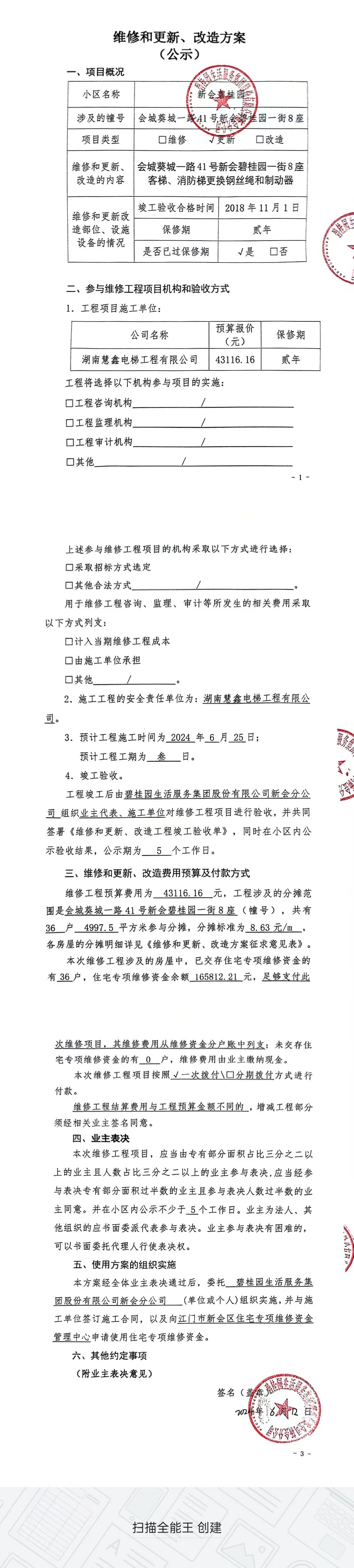 <td VALIGN="top" VALUES="" STYLE="border-width:0" BINDTYPE="0" ROWSPAN="19" COLSPAN="7" DATASOURCE="投票结果" ><font style="font-size:14pt;"><p style="white-space: normal; font-family: 宋体; line-height: 1.75em;">新会碧桂园葵城一路41号01街08座全体业主:</p><p style="white-space: normal; font-family: 宋体; line-height: 1.75em; text-indent: 2em;">本小区关于新会碧桂园会城葵城一路41号新会碧桂园一街8座客梯、消防梯更换钢丝绳和制动器使用维修资金的投票的投票已表决结束,询异时间从2024年07月04日开始,投票询异公示期间,业主可通过微信查询自己的表决情况或可凭身份证件申请查询自己的表决情况;如公示的业主表决情况与查询的本人表决意见不一致的,可以以书面形式向投票组织机构申诉,投票组织机构予以纠正并重新公示表决结果。异议提出人对投票组织机构的处理仍有异议的,可以向街道办事处(镇人民政府)反映处理,涉及住宅专项维修资金的,可向属地住宅专项维修资金管理中心反映处理。</p><p style="white-space: normal;"><br/></p><p style="white-space: normal; font-family: 宋体; line-height: 1.75em;"><strong>附件:</strong></p><p style="white-space: normal; font-family: 宋体; line-height: 1.75em;"><strong>一、投票范围</strong></p><p style="white-space: normal; font-family: 宋体; line-height: 1.75em; text-indent: 2em;">新会碧桂园葵城一路41号01街08座</p><p style="white-space: normal; font-family: 宋体; line-height: 1.75em; text-indent: 2em;">总人数(专有部分人数之和):36</p><p style="white-space: normal; font-family: 宋体; line-height: 1.75em; text-indent: 2em;"><span style="font-family: 宋体, SimSun;"><span style="font-family: 宋体; text-indent: 32px;"><span style="font-family: 宋体; text-indent: 32px;">总户数:36</span></span></span></p><p style="white-space: normal; font-family: 宋体; line-height: 1.75em; text-indent: 2em;">建筑物总面积(专有部分面积之和):4997.50㎡</p><p style="white-space: normal; font-family: 宋体; line-height: 1.75em;"><strong>二、询异公示起止时间</strong></p><p dir="ltr" style="white-space: normal; font-family: 宋体; line-height: 1.75em; text-indent: 2em;"><span style="text-indent: 36px;">2024年07月04日至2024年07月10日</span></p><p style="white-space: normal; font-family: 宋体; line-height: 1.75em;"><strong>三、投票详细描述</strong></p><p style="white-space: normal; font-family: 宋体; line-height: 1.75em; text-indent: 2em;"><p>新会碧桂园会城葵城一路41号新会碧桂园一街8座客梯、消防梯因钢丝绳和制动器存在安全隐患,现需更换客梯、消防梯钢丝绳和制动器。现申请使用维修资金对新会碧桂园会城葵城一路41号新会碧桂园一街8座客梯、消防梯更换钢丝绳和制动器,工程维修预算约43116.16元,项目最终费用以施工合同签订为准,维修费用的分摊标准按建筑面积分摊,每平方约8.63元,详见公示,如果有业主手机不能正常通过微信投票的,请联系物业公司进行线下纸质投票,物业电话17308202884. </p></p><p style="white-space: normal; font-family: 宋体; line-height: 1.75em;"><strong>四、计票规则</strong></p><p style="white-space: normal; font-family: 宋体; line-height: 1.75em; text-indent: 2em;">表决事项:使用建筑物及其附属设施的维修资金<br /><p style='text-align: left; font-family: 宋体; font-size: 16px; line-height: 1.75em; text-indent: 2em;'>计票规则:弃权票不并入其它项 未表决票不并入其它项</p></p><p style="white-space: normal; font-family: 宋体; line-height: 1.75em;"><strong>五、通过规则</strong></p><p style="white-space: normal; font-family: 宋体; line-height: 1.75em;"><strong><strong style="white-space: normal;"><span style="font-family: 宋体, SimSun;"> 根据《中华人民共和国民法典》第二百七十八条规定:业主共同决定事项,应当由专有部分面积占比三分之二以上的业主且人数占比三分之二以上的业主参与表决。</span></strong></strong></p><p style="white-space: normal; font-family: 宋体; line-height: 1.75em; text-indent: 2em;">表决事项:使用建筑物及其附属设施的维修资金<br /><p style='text-align: left; font-family: 宋体; font-size: 16px; line-height: 1.75em; text-indent: 2em;'>通过规则:双2/3以上参与表决,参与表决双过半同意</p></p><p style="white-space: normal; font-family: 宋体; line-height: 1.75em;"><strong>六、投票结果</strong></p><p style="white-space: normal; font-family: 宋体; line-height: 1.75em; text-indent: 2em;"><div id='resultTable'><table style='table-layout: fixed; font-size:12px; margin-top:10px' width='100%' border='0' cellspacing='0' cellpadding='0'><tr><td height='28' colspan='10' align='center' style='border: 1px solid #666'><strong style='font-size: 14px;'> 使用建筑物及其附属设施的维修资金</strong></td> </tr><tr id='trfirst'><td height='28' colspan='4' style='border-left: 1px solid #666; border-bottom: 1px solid #666'><strong> 申报单位:</strong> 碧桂园生活服务集团股份有限公司新会分公司</td><td colspan='3' style='border-left: 1px solid #666; border-bottom: 1px solid #666'><strong> 联系方式:</strong> </td><td colspan='3' style='border-left: 1px solid #666; border-bottom: 1px solid #666; border-right: 1px solid #666'><strong> 申报日期:</strong> 2024年6月12日 </td></tr><tr> <td height='28' colspan='5' style='border-left: 1px solid #666; border-bottom: 1px solid #666'><strong> 总人数(专有部分人数之和):</strong>36人 </td><td colspan='5' style='border-left: 1px solid #666; border-bottom: 1px solid #666; border-right: 1px solid #666'><strong> 建筑物总面积(专有部分面积之和):</strong>4997.50㎡ </td> </tr><tr><td height='28' colspan='10' bgcolor='#F3F3F3' style='border-left: 1px solid #666;bor