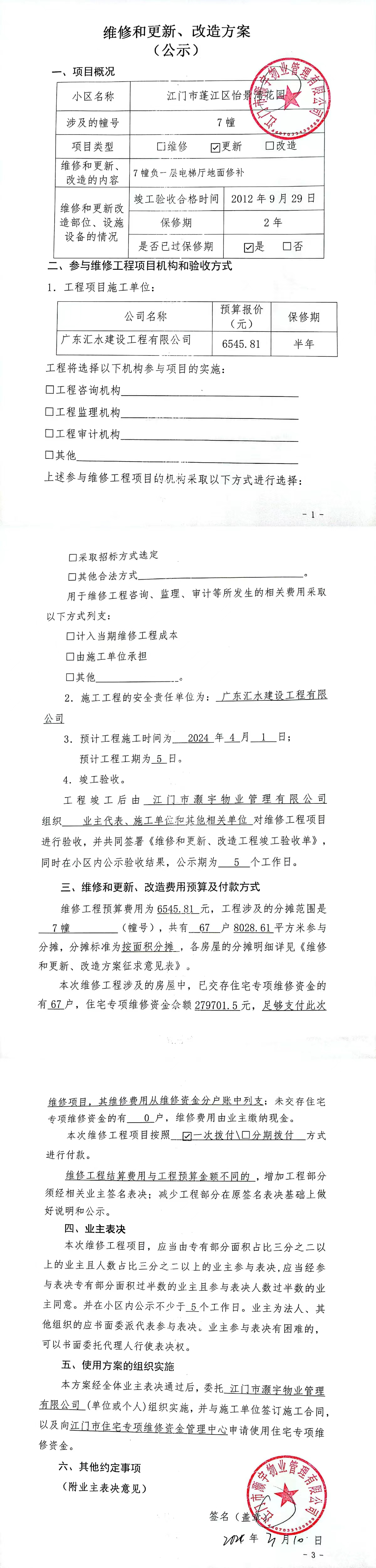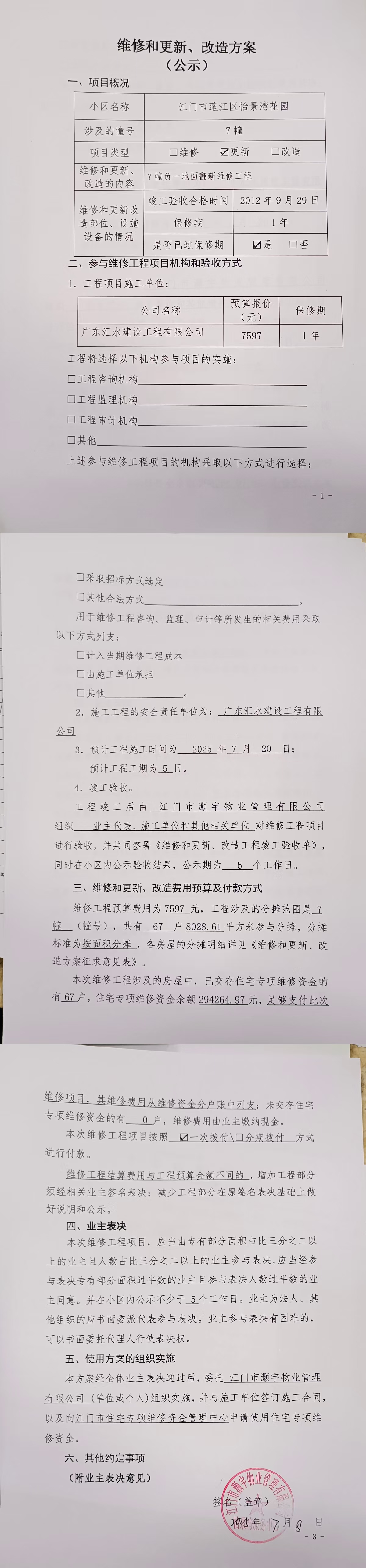 <td VALIGN="top" VALUES="" STYLE="border-width:0" BINDTYPE="0" ROWSPAN="19" COLSPAN="7" DATASOURCE="投票结果" ><font style="font-size:14pt;"><p style="white-space: normal; font-family: 宋体; line-height: 1.75em;">蓬江区怡景湾蓬江区怡景湾花园7幢全体业主:</p><p style="white-space: normal; font-family: 宋体; line-height: 1.75em; text-indent: 2em;">本小区关于蓬江区怡景湾7幢负一地面翻新维修工程使用维修资金的投票的投票已表决结束,询异时间从2025年07月30日开始,投票询异公示期间,业主可通过微信查询自己的表决情况或可凭身份证件申请查询自己的表决情况;如公示的业主表决情况与查询的本人表决意见不一致的,可以以书面形式向投票组织机构申诉,投票组织机构予以纠正并重新公示表决结果。异议提出人对投票组织机构的处理仍有异议的,可以向街道办事处(镇人民政府)反映处理,涉及住宅专项维修资金的,可向属地住宅专项维修资金管理中心反映处理。</p><p style="white-space: normal;"><br/></p><p style="white-space: normal; font-family: 宋体; line-height: 1.75em;"><strong>附件:</strong></p><p style="white-space: normal; font-family: 宋体; line-height: 1.75em;"><strong>一、投票范围</strong></p><p style="white-space: normal; font-family: 宋体; line-height: 1.75em; text-indent: 2em;">蓬江区怡景湾蓬江区怡景湾花园7幢</p><p style="white-space: normal; font-family: 宋体; line-height: 1.75em; text-indent: 2em;">总人数(专有部分人数之和):67</p><p style="white-space: normal; font-family: 宋体; line-height: 1.75em; text-indent: 2em;"><span style="font-family: 宋体, SimSun;"><span style="font-family: 宋体; text-indent: 32px;"><span style="font-family: 宋体; text-indent: 32px;">总户数:67</span></span></span></p><p style="white-space: normal; font-family: 宋体; line-height: 1.75em; text-indent: 2em;">建筑物总面积(专有部分面积之和):8028.61㎡</p><p style="white-space: normal; font-family: 宋体; line-height: 1.75em;"><strong>二、询异公示起止时间</strong></p><p dir="ltr" style="white-space: normal; font-family: 宋体; line-height: 1.75em; text-indent: 2em;"><span style="text-indent: 36px;">2025年07月30日至2025年08月09日</span></p><p style="white-space: normal; font-family: 宋体; line-height: 1.75em;"><strong>三、投票详细描述</strong></p><p style="white-space: normal; font-family: 宋体; line-height: 1.75em; text-indent: 2em;"><p><span style="font-size: 14px; text-wrap: wrap; background-color: rgb(255, 255, 255); font-family: 宋体;">小区</span><span style="font-size: 14px; text-wrap: wrap; background-color: rgb(255, 255, 255);"><span style="font-family:Calibri">7幢</span></span><span style="font-size: 14px; text-wrap: wrap; background-color: rgb(255, 255, 255); font-family: 宋体;">的负一层电梯厅地面地砖松动、鼓起,</span><span style="font-size: 14px; text-wrap: wrap; background-color: rgb(255, 255, 255); font-family: 宋体;">经检查,是由于地面地砖空鼓,</span><span style="font-size: 14px; text-wrap-style: initial; background-color: rgb(255, 255, 255); font-family: 宋体;">现对7幢</span><span style="font-size: 14px; text-wrap-style: initial; font-family: 宋体; background: rgb(255, 255, 0);"><span style="text-wrap-style: initial; background-color: rgb(255, 255, 255);">的负一层电梯厅地面地砖维修</span></span><span style="font-size: 14px; text-wrap-style: initial; background-color: rgb(255, 255, 255); font-family: 宋体;">,工程维修预算金额为</span><span style="font-size: 14px; text-wrap-style: initial;"><span style="font-family:Calibri;"><span style="background-color: rgb(255, 255, 255);">7597元</span></span></span><span style="font-size: 14px; text-wrap-style: initial; background-color: rgb(255, 255, 255); font-family: 宋体;">,项目最终费用以施工合同签订金额为准。因已过保修期,维修费用由相关业主按建筑面积</span><span style="font-size: 14px; text-wrap-style: initial; background-color: rgb(255, 255, 255); font-family: 宋体;">分摊,每平方约0.95元</span><span style="font-size: 14px; text-wrap-style: initial; background-color: rgb(255, 255, 255); font-family: 宋体;">,详见公示附件。如业主手机不能正常通过微信投票,请联系物业公司进行线下纸质投票,物业电话:0750-3692722</span><span style="font-size: 14px; text-wrap-style: initial; background-color: rgb(255, 255, 255); font-family: 宋体;">。</span></p></p><p style="white-space: normal; font-family: 宋体; line-height: 1.75em;"><strong>四、计票规则</strong></p><p style="white-space: normal; font-family: 宋体; line-height: 1.75em; text-indent: 2em;">表决事项:使用建筑物及其附属设施的维修资金<br /><p style='text-align: left; font-family: 宋体; font-size: 16px; line-height: 1.75em; text-indent: 2em;'>计票规则:弃权票不并入其它项 未表决票不并入其它项</p></p><p style="white-space: normal; font-family: 宋体; line-height: 1.75em;"><strong>五、通过规则</strong></p><p style="white-space: normal; font-family: 宋体; line-height: 1.75em;"><strong><strong style="white-space: normal;"><span style="font-family: 宋体, SimSun;"> 根据《中华人民共和国民法典》第二百七十八条规定:业主共同决定事项,应当由专有部分面积占比三分之二以上的业主且人数占比三分之二以上的业主参与表决。</span></strong></strong></p><p style="white-space: normal; font-family: 宋体; line-height: 1.75em; text-indent: 2em;">表决事项:使用建筑物及其附属设施的维修资金<br /><p style='text-align: left; font-family: 宋体; font-size: 16px; line-height: 1.75em; text-indent: 2em;'>通过规则:双2/3以上参与表决,参与表决双过半同意</p></p><p style="white-space: normal; font-family: 宋体; line-height: 1.75em;"><strong>六、投