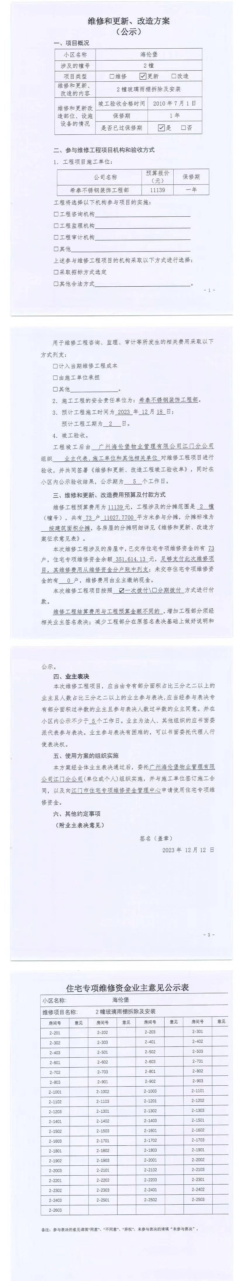 <td valign="top" values="" style="border-width:0" bindtype="0" rowspan="17" colspan="7" datasource="投票结果"><font style=" font-family:方正小标宋简体;font-size:14pt;"><p style="line-height: 1.75em;"><span style="font-family: 宋体, SimSun;">各位尊敬的业主:</span><br></p><p style="text-indent: 2em; line-height: 1.75em;"><span style="font-family: 宋体, SimSun;">根据法律法规的规定,本小区业主利用“江门市物业事项表决管理系统”已对本小区公共事务决策事项进行了表决,在经过7日的询异公示期后,未收到业主有效的异议。现将投票结果公告,并就产生的法律效力说明如下:</span></p><p style="line-height: 1.75em; text-indent: 0em;"><strong style="text-indent: 2em;"><span style="font-family: 宋体, SimSun;">一、投票范围</span></strong></p><p style="text-indent: 2em; line-height: 1.75em;"><span style="font-family: 宋体, SimSun;">海伦堡蓬江区海伦堡2幢</span></p><p style="text-indent: 2em; line-height: 1.75em;"><span style="font-family: 宋体, SimSun;">总人数(专有部分人数之和):73</span></p><p style="text-indent: 2em; line-height: 1.75em;"><span style="font-family: 宋体, SimSun;"><span style="font-family: 宋体, SimSun; text-indent: 32px;"><span style="font-family: 宋体; text-indent: 32px;"><span style="font-family: 宋体; text-indent: 32px;">总户数:73</span></span></span></span></p><p style="text-indent: 2em; line-height: 1.75em;"><span style="font-family: 宋体, SimSun;">建筑物总面积(专有部分面积之和):11027.77㎡</span></p><p style="line-height: 1.75em;"><strong><span style="font-family: 宋体, SimSun;">二、投票结果公告时间</span></strong></p><p style="text-indent: 2em; line-height: 1.75em;"><span style="font-family: 宋体, SimSun;">从2024年01月02日开始</span></p><p style="line-height: 1.75em;"><strong><span style="font-family: 宋体, SimSun;">三、计票规则</span></strong></p><p style="text-indent: 2em; line-height: 1.75em;"><span style="font-family: 宋体, SimSun;">表决事项:使用建筑物及其附属设施的维修资金<br></span></p><p style="font-family: 宋体, SimSun;line-height: 1.75em; text-indent: 2em;">计票规则:弃权票不并入其它项 未表决票不并入其它项</p><p></p><p style="line-height: 1.75em;"><strong><span style="font-family: 宋体, SimSun;">四、通过规则</span></strong></p><p style="line-height: 1.75em;"><strong><span style="font-family: 宋体, SimSun;"> 根据《中华人民共和国民法典》第二百七十八条规定:业主共同决定事项,应当由专有部分面积占比三分之二以上的业主且人数占比三分之二以上的业主参与表决。</span></strong></p><p style="text-indent: 2em; line-height: 1.75em;"><span style="font-family: 宋体, SimSun;"><span style="font-family: 宋体, SimSun; text-indent: 32px;">表决事项:使用建筑物及其附属设施的维修资金<br></span></span></p><p style="font-family: 宋体, SimSun;line-height: 1.75em; text-indent: 2em;">通过规则:参与表决专有部分面积过半数的业主且参与表决人数过半数的业主同意</p><p></p><p style="line-height: 1.75em;"><strong><span style="font-family: 宋体, SimSun;">五、投票结果</span></strong></p><p style="line-height: 1.75em; text-indent: 2em;"><span style="font-family: 宋体, SimSun; text-indent: 2em;"></span></p><div id="resultTable"><table style="table-layout: fixed; font-size:12px; margin-top:10px" width="100%" border="0" cellspacing="0" cellpadding="0"><tbody><tr><td height="28" colspan="10" align="center" style="border: 1px solid #666"><strong style="font-size: 14px;"> 使用建筑物及其附属设施的维修资金</strong></td> </tr><tr id="trfirst"><td height="28" colspan="4" style="border-left: 1px solid #666; border-bottom: 1px solid #666"><strong> 申报单位:</strong> 广州海伦堡物业管理有限公司江门分公司</td><td colspan="3" style="border-left: 1px solid #666; border-bottom: 1px solid #666"><strong> 联系方式:</strong> 0750-3380006 </td><td colspan="3" style="border-left: 1px solid #666; border-bottom: 1px solid #666; border-right: 1px solid #666"><strong> 申报日期:</strong> 2023年12月12日 </td></tr><tr> <td height="28" colspan="5" style="border-left: 1px solid #666; border-bottom: 1px solid #666"><strong> 总人数(专有部分人数之和):</strong>73人 </td><td colspan="5" style="border-left: 1px solid #666; border-bottom: 1px solid #666; border-right: 1px solid #666"><strong> 建筑物总面积(专有部分面积之和):</strong>11027.77㎡ </td> </tr><tr><td height="28" colspan="10" bgcolor="#F3F3F3" style="border-left: 1px solid #666;border-bottom: 1px solid #666;border-right: 1px solid #666"><strong> 参与人数及面积统计</strong></td></tr><tr><td height="28" colspan="5" style="border-left: 1px solid #666; border-bottom: 1px solid #666"><strong> 参与表决专有部分人数之和:</strong>54人</td><td colspan="5" style="border-left: 1px solid #666; border-bottom: 1px solid #666; border-right: 1px solid #666"><strong> 参与表决占有表决权总人数比例:</strong>73.97%</td></tr><tr><td height="28" colspan="5" style="border-left: 1px solid #666; border-bottom: 1px solid #666"><strong> 参与表决专有部分面积之和:</strong>8155.86㎡</td><td colspan="5" style="border-left: 1px solid #666; border-bottom: 1px solid #666; border-right: 1px solid #666"><strong> 参与表决占有表决权总面积比例:</strong>73.96%</td></tr><tr><td height="28" colspan="10" bgcolor="#F3F3F3" style="border-left: 1px solid #666; border-bottom: 1px solid #666;border-right: 1px solid #666"> <strong> 未参与人数及面积统计</strong></td> </tr><tr><td height="28" colspan="5" style="border-left: 1px solid #666; border-bottom: 1px solid #666"><strong> 未参与表决专有部分人数之和:</strong>19人 </td><td colspan="5" style="border-left: 1px solid #666; border-bottom: 1px solid #666; border-ri