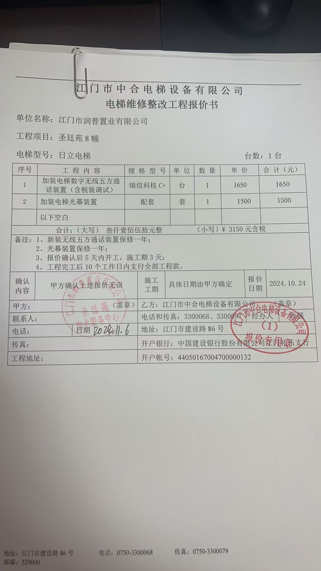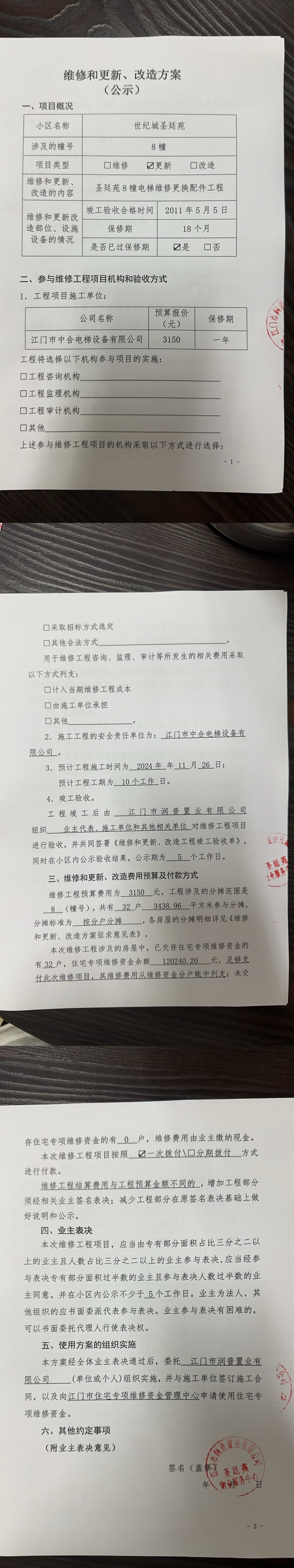 <td VALIGN="top" VALUES="" STYLE="border-width:0" BINDTYPE="0" ROWSPAN="19" COLSPAN="7" DATASOURCE="投票结果" ><font style="font-size:14pt;"><p style="white-space: normal; font-family: 宋体; line-height: 1.75em;">世纪城蓬江区圣廷苑8幢全体业主:</p><p style="white-space: normal; font-family: 宋体; line-height: 1.75em; text-indent: 2em;">本小区关于圣廷苑小区8幢电梯维修更换配件工程使用维修资金的投票的投票已表决结束,询异时间从2026年01月07日开始,投票询异公示期间,业主可通过微信查询自己的表决情况或可凭身份证件申请查询自己的表决情况;如公示的业主表决情况与查询的本人表决意见不一致的,可以以书面形式向投票组织机构申诉,投票组织机构予以纠正并重新公示表决结果。异议提出人对投票组织机构的处理仍有异议的,可以向街道办事处(镇人民政府)反映处理,涉及住宅专项维修资金的,可向属地住宅专项维修资金管理中心反映处理。</p><p style="white-space: normal;"><br/></p><p style="white-space: normal; font-family: 宋体; line-height: 1.75em;"><strong>附件:</strong></p><p style="white-space: normal; font-family: 宋体; line-height: 1.75em;"><strong>一、投票范围</strong></p><p style="white-space: normal; font-family: 宋体; line-height: 1.75em; text-indent: 2em;">世纪城蓬江区圣廷苑8幢</p><p style="white-space: normal; font-family: 宋体; line-height: 1.75em; text-indent: 2em;">总人数(专有部分人数之和):32</p><p style="white-space: normal; font-family: 宋体; line-height: 1.75em; text-indent: 2em;"><span style="font-family: 宋体, SimSun;"><span style="font-family: 宋体; text-indent: 32px;"><span style="font-family: 宋体; text-indent: 32px;">总户数:32</span></span></span></p><p style="white-space: normal; font-family: 宋体; line-height: 1.75em; text-indent: 2em;">建筑物总面积(专有部分面积之和):3438.96㎡</p><p style="white-space: normal; font-family: 宋体; line-height: 1.75em;"><strong>二、询异公示起止时间</strong></p><p dir="ltr" style="white-space: normal; font-family: 宋体; line-height: 1.75em; text-indent: 2em;"><span style="text-indent: 36px;">2026年01月07日至2026年01月14日</span></p><p style="white-space: normal; font-family: 宋体; line-height: 1.75em;"><strong>三、投票详细描述</strong></p><p style="white-space: normal; font-family: 宋体; line-height: 1.75em; text-indent: 2em;"><p style="font-family: "Helvetica Neue", Helvetica, Arial, sans-serif; font-size: 14px; text-wrap-mode: wrap; background-color: rgb(255, 255, 255);">一、圣廷苑8幢电梯五方通话和线路老化不能正常通话,由于现场线路老化布线困难,建议更换无线数字对讲装置。</p><p style="font-family: "Helvetica Neue", Helvetica, Arial, sans-serif; font-size: 14px; text-wrap-mode: wrap; background-color: rgb(255, 255, 255);">二、圣廷苑8幢电梯轿门是旧式触板保护装置,经常出现夹人现象,为确保电梯安全使用,建议更换光幕式保护装置。</p><p style="font-family: "Helvetica Neue", Helvetica, Arial, sans-serif; font-size: 14px; text-wrap-mode: wrap; background-color: rgb(255, 255, 255);">现对圣廷苑8幢进行更换配件工程,工程预算金额为3150元,项目最终费用以施工合同签订金额为准。因已过保修期,维修费用由相关业主按分户分摊,每户98.44元,详见公示</p><p style="font-family: "Helvetica Neue", Helvetica, Arial, sans-serif; font-size: 14px; text-wrap-mode: wrap; background-color: rgb(255, 255, 255);">附件。如业主手机不能正常通过微信投票,请联系物业公司进行线下纸质投票,物业电话:0750-3688100。</p><p><br/></p></p><p style="white-space: normal; font-family: 宋体; line-height: 1.75em;"><strong>四、计票规则</strong></p><p style="white-space: normal; font-family: 宋体; line-height: 1.75em; text-indent: 2em;">表决事项:使用建筑物及其附属设施的维修资金<br /><p style='text-align: left; font-family: 宋体; font-size: 16px; line-height: 1.75em; text-indent: 2em;'>计票规则:弃权票不并入其它项 未表决票不并入其它项</p></p><p style="white-space: normal; font-family: 宋体; line-height: 1.75em;"><strong>五、通过规则</strong></p><p style="white-space: normal; font-family: 宋体; line-height: 1.75em;"><strong><strong style="white-space: normal;"><span style="font-family: 宋体, SimSun;"> 根据《中华人民共和国民法典》第二百七十八条规定:业主共同决定事项,应当由专有部分面积占比三分之二以上的业主且人数占比三分之二以上的业主参与表决。</span></strong></strong></p><p style="white-space: normal; font-family: 宋体; line-height: 1.75em; text-indent: 2em;">表决事项:使用建筑物及其附属设施的维修资金<br /><p style='text-align: left; font-family: 宋体; font-size: 16px; line-height: 1.75em; text-indent: 2em;'>通过规则:双2/3以上参与表决,参与表决双过半同意</p></p><p style="white-space: normal; font-family: 宋体; line-height: 1.75em;"><strong>六、投票结果</strong></p><p style="white-space: normal; font-family: 宋体; line-height: 1.75em; text-indent: 2em;"><div id='resultTable'><table style='table-layout: fixed; font-size:12px; margin-top:10px' width='100%' border='0' cellspacing='0' cellpadding='0'><tr><td height='28' colspan='10' align='center' style='border: 1px solid #666'><strong style='font-size: 14px;'> 使用建筑物及其附属设施的维修资金</strong></td> </tr><tr id='trfirst'><td height='28' colspan='4' style='border-left: 1px solid #666; border-bottom: 1px solid #666'><strong> 申报单位:</strong> 江门市润普置业有限公司</td><td colspan='3' style='border-left: 1px solid #666; border-bottom: 1px solid #666'><strong> 联系方式:</strong> (0750) 3871336 3829717 </td><td colspan='3' style='border-left: 1px solid #666; bord