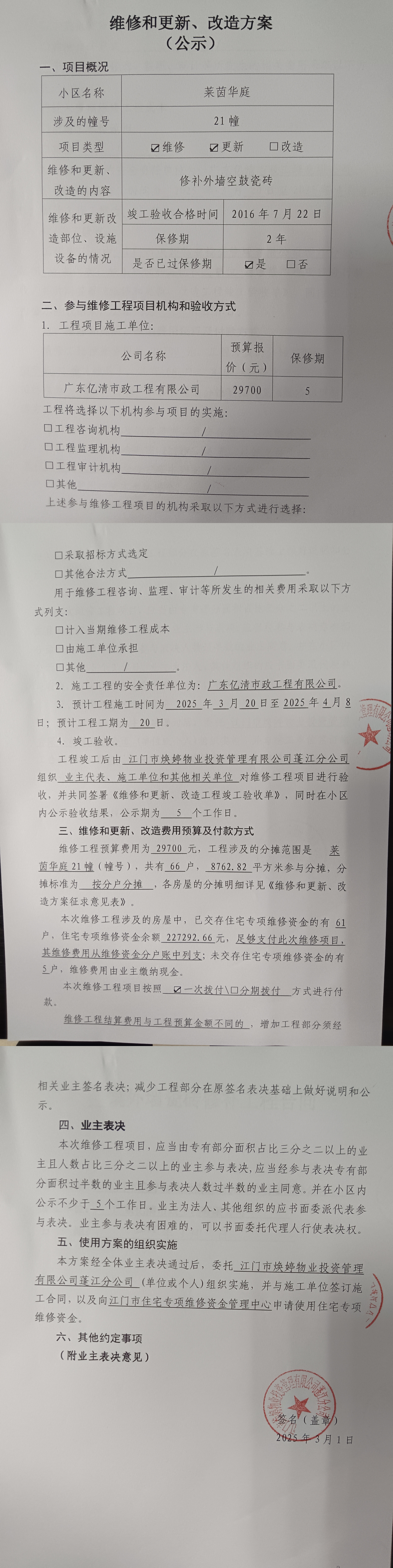 <td VALIGN="top" VALUES="" STYLE="border-width:0" BINDTYPE="0" ROWSPAN="19" COLSPAN="7" DATASOURCE="投票结果" ><font style="font-size:14pt;"><p style="white-space: normal; font-family: 宋体; line-height: 1.75em;">莱茵华庭蓬江区莱茵华庭21幢全体业主:</p><p style="white-space: normal; font-family: 宋体; line-height: 1.75em; text-indent: 2em;">本小区关于莱茵华庭小区21幢修补外墙空鼓的瓷砖使用维修资金的投票的投票已表决结束,询异时间从2025年04月18日开始,投票询异公示期间,业主可通过微信查询自己的表决情况或可凭身份证件申请查询自己的表决情况;如公示的业主表决情况与查询的本人表决意见不一致的,可以以书面形式向投票组织机构申诉,投票组织机构予以纠正并重新公示表决结果。异议提出人对投票组织机构的处理仍有异议的,可以向街道办事处(镇人民政府)反映处理,涉及住宅专项维修资金的,可向属地住宅专项维修资金管理中心反映处理。</p><p style="white-space: normal;"><br/></p><p style="white-space: normal; font-family: 宋体; line-height: 1.75em;"><strong>附件:</strong></p><p style="white-space: normal; font-family: 宋体; line-height: 1.75em;"><strong>一、投票范围</strong></p><p style="white-space: normal; font-family: 宋体; line-height: 1.75em; text-indent: 2em;">莱茵华庭蓬江区莱茵华庭21幢</p><p style="white-space: normal; font-family: 宋体; line-height: 1.75em; text-indent: 2em;">总人数(专有部分人数之和):66</p><p style="white-space: normal; font-family: 宋体; line-height: 1.75em; text-indent: 2em;"><span style="font-family: 宋体, SimSun;"><span style="font-family: 宋体; text-indent: 32px;"><span style="font-family: 宋体; text-indent: 32px;">总户数:66</span></span></span></p><p style="white-space: normal; font-family: 宋体; line-height: 1.75em; text-indent: 2em;">建筑物总面积(专有部分面积之和):8762.82㎡</p><p style="white-space: normal; font-family: 宋体; line-height: 1.75em;"><strong>二、询异公示起止时间</strong></p><p dir="ltr" style="white-space: normal; font-family: 宋体; line-height: 1.75em; text-indent: 2em;"><span style="text-indent: 36px;">2025年04月18日至2025年04月28日</span></p><p style="white-space: normal; font-family: 宋体; line-height: 1.75em;"><strong>三、投票详细描述</strong></p><p style="white-space: normal; font-family: 宋体; line-height: 1.75em; text-indent: 2em;"><p>本小区21幢的建筑外墙瓷砖出现多处脱落,如不及时对外墙脱落的位置进行修补,日后缺口会继续扩大外墙拖落的范围,已过保修期。现需申请使用维修资金对21幢外墙瓷砖进行修补,工程维修预算金额为29700元,项目最终费用以施工合同签订金额为准。维修费用的分摊标准为按分户分摊 每户约450元,详见公示附件。如业主手机不能正常通过微信投票,请联系物业公司进行线下纸质投票,物业公司联系电话:0750-3212633。 </p></p><p style="white-space: normal; font-family: 宋体; line-height: 1.75em;"><strong>四、计票规则</strong></p><p style="white-space: normal; font-family: 宋体; line-height: 1.75em; text-indent: 2em;">表决事项:使用建筑物及其附属设施的维修资金<br /><p style='text-align: left; font-family: 宋体; font-size: 16px; line-height: 1.75em; text-indent: 2em;'>计票规则:弃权票不并入其它项 未表决票不并入其它项</p></p><p style="white-space: normal; font-family: 宋体; line-height: 1.75em;"><strong>五、通过规则</strong></p><p style="white-space: normal; font-family: 宋体; line-height: 1.75em;"><strong><strong style="white-space: normal;"><span style="font-family: 宋体, SimSun;"> 根据《中华人民共和国民法典》第二百七十八条规定:业主共同决定事项,应当由专有部分面积占比三分之二以上的业主且人数占比三分之二以上的业主参与表决。</span></strong></strong></p><p style="white-space: normal; font-family: 宋体; line-height: 1.75em; text-indent: 2em;">表决事项:使用建筑物及其附属设施的维修资金<br /><p style='text-align: left; font-family: 宋体; font-size: 16px; line-height: 1.75em; text-indent: 2em;'>通过规则:双2/3以上参与表决,参与表决双过半同意</p></p><p style="white-space: normal; font-family: 宋体; line-height: 1.75em;"><strong>六、投票结果</strong></p><p style="white-space: normal; font-family: 宋体; line-height: 1.75em; text-indent: 2em;"><div id='resultTable'><table style='table-layout: fixed; font-size:12px; margin-top:10px' width='100%' border='0' cellspacing='0' cellpadding='0'><tr><td height='28' colspan='10' align='center' style='border: 1px solid #666'><strong style='font-size: 14px;'> 使用建筑物及其附属设施的维修资金</strong></td> </tr><tr id='trfirst'><td height='28' colspan='4' style='border-left: 1px solid #666; border-bottom: 1px solid #666'><strong> 申报单位:</strong> 江门市焕婷物业投资管理有限公司蓬江分公司</td><td colspan='3' style='border-left: 1px solid #666; border-bottom: 1px solid #666'><strong> 联系方式:</strong> 3211392 </td><td colspan='3' style='border-left: 1px solid #666; border-bottom: 1px solid #666; border-right: 1px solid #666'><strong> 申报日期:</strong> 2025年3月4日 </td></tr><tr> <td height='28' colspan='5' style='border-left: 1px solid #666; border-bottom: 1px solid #666'><strong> 总人数(专有部分人数之和):</strong>66人 </td><td colspan='5' style='border-left: 1px solid #666; border-bottom: 1px solid #666; border-right: 1px solid #666'><strong> 建筑物总面积(专有部分面积之和):</strong>8762.82㎡ </td> </tr><tr><td height='28' colspan='10' bgcolor='#F3F3F3' style='border-left: 1px solid #666;border-bottom: 1px solid #666;border-right: 1px solid #666'><strong> 参与人数及面积统计</strong></td></tr><tr><td heig