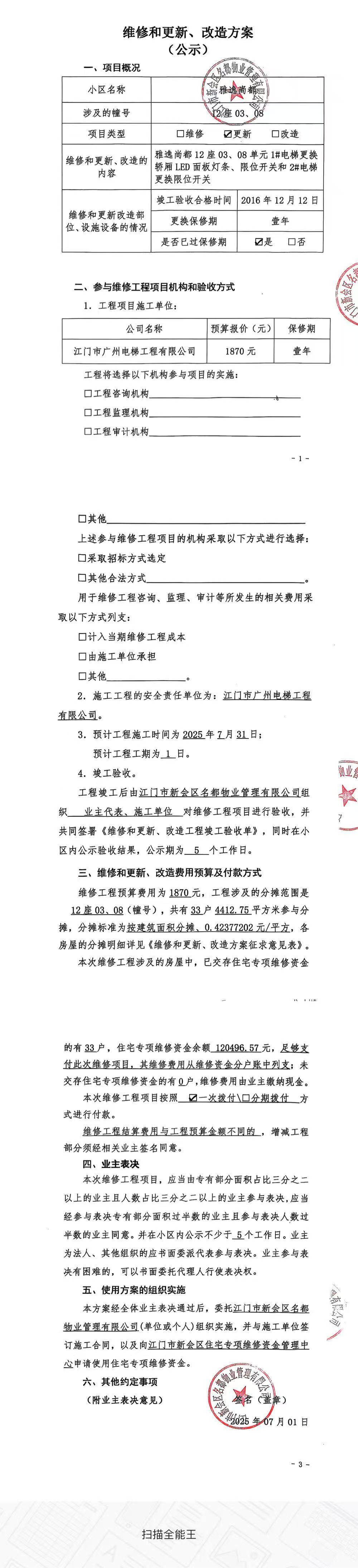 <td VALIGN="top" VALUES="" STYLE="border-width:0" BINDTYPE="0" ROWSPAN="17" COLSPAN="7" DATASOURCE="投票结果" ><font style=" font-family:方正小标宋简体;font-size:14pt;"><p style="line-height: 1.75em;"><span style="font-family: 宋体, SimSun;">各位尊敬的业主:</span><br/></p><p style="text-indent: 2em; line-height: 1.75em;"><span style="font-family: 宋体, SimSun;">根据法律法规的规定,本小区业主利用“江门市物业事项表决管理系统”已对本小区公共事务决策事项(<span style="font-family: 宋体; text-indent: 32px;">雅逸尚都12座03、08单元1#电梯(梯粤JX6512)更换轿厢LED面板灯条、限位开关和2#电梯(梯粤JX6513)更换限位开关使用维修资金的投票</span>)进行了表决,在经过7日的询异公示期后,未收到业主有效的异议。现将投票结果公告,并就产生的法律效力说明如下:</span></p><p style="line-height: 1.75em; text-indent: 0em;"><strong style="text-indent: 2em;"><span style="font-family: 宋体, SimSun;">一、投票范围</span></strong></p><p style="text-indent: 2em; line-height: 1.75em;"><span style="font-family: 宋体, SimSun;">雅逸尚都雅逸尚都12座</span></p><p style="text-indent: 2em; line-height: 1.75em;"><span style="font-family: 宋体, SimSun;">总人数(专有部分人数之和):33</span></p><p style="text-indent: 2em; line-height: 1.75em;"><span style="font-family: 宋体, SimSun;"><span style="font-family: 宋体, SimSun; text-indent: 32px;"><span style="font-family: 宋体; text-indent: 32px;"><span style="font-family: 宋体; text-indent: 32px;">总户数:33</span></span></span></span></p><p style="text-indent: 2em; line-height: 1.75em;"><span style="font-family: 宋体, SimSun;">建筑物总面积(专有部分面积之和):4412.75㎡</span></p><p style="line-height: 1.75em;"><strong><span style="font-family: 宋体, SimSun;">二、投票结果公告时间</span></strong></p><p style="text-indent: 2em; line-height: 1.75em;"><span style="font-family: 宋体, SimSun;"><span style="font-family: 宋体, SimSun; text-indent: 32px;">从2025年08月05日开始</span></span></p><p style="line-height: 1.75em;"><strong><span style="font-family: 宋体, SimSun;">三、计票规则</span></strong></p><p style="text-indent: 2em; line-height: 1.75em;"><span style="font-family: 宋体, SimSun;">表决事项:使用建筑物及其附属设施的维修资金<br /><p style='font-family: 宋体, SimSun;line-height: 1.75em; text-indent: 2em;'>计票规则:弃权票不并入其它项&nbsp;&nbsp;&nbsp;&nbsp;未表决票不并入其它项</p></span></p><p style="line-height: 1.75em;"><strong><span style="font-family: 宋体, SimSun;">四、通过规则</span></strong></p><p style="line-height: 1.75em;"><strong><span style="font-family: 宋体, SimSun;">&nbsp; 根据《中华人民共和国民法典》第二百七十八条规定:业主共同决定事项,应当由专有部分面积占比三分之二以上的业主且人数占比三分之二以上的业主参与表决。</span></strong></p><p style="text-indent: 2em; line-height: 1.75em;"><span style="font-family: 宋体, SimSun;"><span style="font-family: 宋体, SimSun; text-indent: 32px;">表决事项:使用建筑物及其附属设施的维修资金<br /><p style='font-family: 宋体, SimSun;line-height: 1.75em; text-indent: 2em;'>通过规则:双2/3以上参与表决,参与表决双过半同意</p></span></span></p><p style="line-height: 1.75em;"><strong><span style="font-family: 宋体, SimSun;">五、投票结果</span></strong></p><p style="line-height: 1.75em; text-indent: 2em;"><span style="font-family: 宋体, SimSun; text-indent: 2em;"><div id='resultTable'><table style='table-layout: fixed; font-size:12px; margin-top:10px' width='100%' border='0' cellspacing='0' cellpadding='0'><tr><td height='28' colspan='10' align='center' style='border: 1px solid #666'><strong style='font-size: 14px;'> 使用建筑物及其附属设施的维修资金</strong></td> </tr><tr id='trfirst'><td height='28' colspan='4' style='border-left: 1px solid #666; border-bottom: 1px solid #666'><strong>&nbsp;申报单位:</strong> 江门市新会区名都物业管理有限公司</td><td colspan='3' style='border-left: 1px solid #666; border-bottom: 1px solid #666'><strong>&nbsp;联系方式:</strong> 6609908 </td><td colspan='3' style='border-left: 1px solid #666; border-bottom: 1px solid #666; border-right: 1px solid #666'><strong>&nbsp;申报日期:</strong> 2025年7月3日 </td></tr><tr> <td height='28' colspan='5' style='border-left: 1px solid #666; border-bottom: 1px solid #666'><strong>&nbsp;列支总人数(专有部分人数之和):</strong>33人 </td><td colspan='5' style='border-left: 1px solid #666; border-bottom: 1px solid #666; border-right: 1px solid #666'><strong>&nbsp;列支建筑物总面积(专有部分面积之和):</strong>4412.75㎡ </td> </tr><tr><td height='28' colspan='10' bgcolor='#F3F3F3' style='border-left: 1px solid #666;border-bottom: 1px solid #666;border-right: 1px solid #666'><strong>&nbsp;参与表决人数及面积统计</strong></td></tr><tr><td height='28' colspan='5' style='border-left: 1px solid #666; border-bottom: 1px solid #666'><strong>&nbsp;参与表决人数:</strong>25人</td><td colspan='5' style='border-left: 1px solid #666; border-bottom: 1px solid #666; border-right: 1px solid #666'><strong>&nbsp;参与表决人数占总人数比例:</strong>75.76%</td></tr><tr><td height='28' colspan='5' style='border-left: 1px solid #666; border-bottom: 1px solid #666'><strong>&nbsp;参与表决面积:</strong>3350.89㎡</td><td colspan='5' style='border-left: 1px solid #666; border-bottom: 1px solid #666; border-right: 1px solid #666'><strong>&nbsp;参与表决面积占总面积比例:</strong>75.94%</td></tr><tr><td height='28' colspan='10' bgcolor='#F3F3F3' style='border-left: 1px solid #666; border-bottom: 1px solid #666;border-right: 1px solid #666'> <strong>&nbsp;参与表决同意人数及面积统计</str