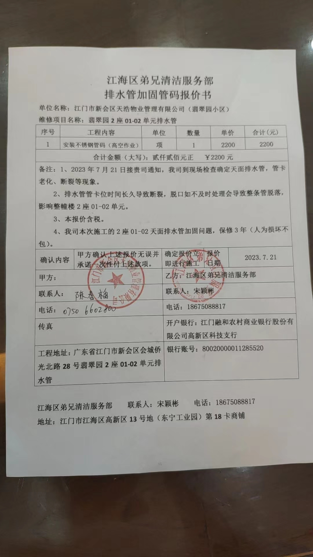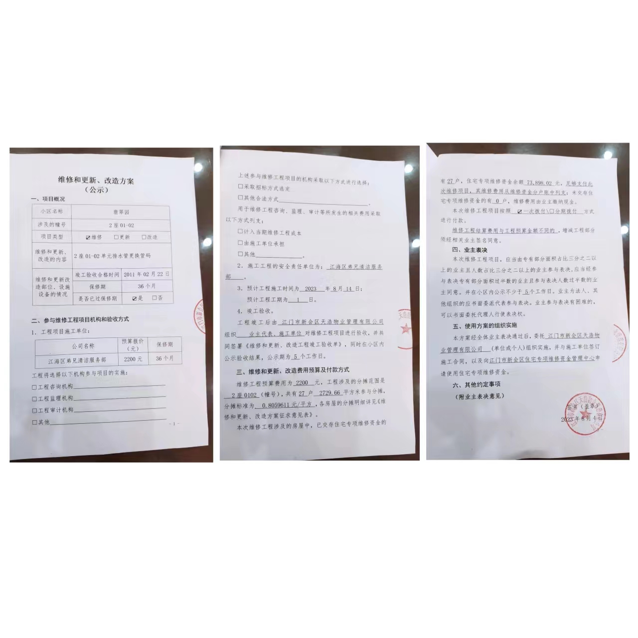 <td valign="top" values="" style="border-width:0" bindtype="0" rowspan="17" colspan="7" datasource="投票结果"><font style=" font-family:方正小标宋简体;font-size:14pt;"><p style="line-height: 1.75em;"><span style="font-family: 宋体, SimSun;">各位尊敬的业主:</span><br></p><p style="text-indent: 2em; line-height: 1.75em;"><span style="font-family: 宋体, SimSun;">根据法律法规的规定,本小区业主利用“江门市物业事项表决管理系统”已对本小区公共事务决策事项进行了表决,在经过7日的询异公示期后,未收到业主有效的异议。现将投票结果公告,并就产生的法律效力说明如下:</span></p><p style="line-height: 1.75em; text-indent: 0em;"><strong style="text-indent: 2em;"><span style="font-family: 宋体, SimSun;">一、投票范围</span></strong></p><p style="text-indent: 2em; line-height: 1.75em;"><span style="font-family: 宋体, SimSun;">翡翠园翡翠园2座</span></p><p style="text-indent: 2em; line-height: 1.75em;"><span style="font-family: 宋体, SimSun;">总人数(专有部分人数之和):18</span></p><p style="text-indent: 2em; line-height: 1.75em;"><span style="font-family: 宋体, SimSun;"><span style="font-family: 宋体, SimSun; text-indent: 32px;"><span style="font-family: 宋体; text-indent: 32px;">总户数:27</span></span></span></p><p style="text-indent: 2em; line-height: 1.75em;"><span style="font-family: 宋体, SimSun;">建筑物总面积(专有部分面积之和):2729.66㎡</span></p><p style="line-height: 1.75em;"><strong><span style="font-family: 宋体, SimSun;">二、投票结果公告时间</span></strong></p><p style="text-indent: 2em; line-height: 1.75em;"><span style="font-family: 宋体, SimSun;">从2023年11月08日开始</span></p><p style="line-height: 1.75em;"><strong><span style="font-family: 宋体, SimSun;">三、计票规则</span></strong></p><p style="text-indent: 2em; line-height: 1.75em;"><span style="font-family: 宋体, SimSun;">表决事项:使用建筑物及其附属设施的维修资金<br></span></p><p style="font-family: 宋体, SimSun;line-height: 1.75em; text-indent: 2em;">计票规则:弃权票不并入其它项 未表决票不并入其它项</p><p></p><p style="line-height: 1.75em;"><strong><span style="font-family: 宋体, SimSun;">四、通过规则</span></strong></p><p style="line-height: 1.75em;"><strong><span style="font-family: 宋体, SimSun;"> 根据《中华人民共和国民法典》第二百七十八条规定:业主共同决定事项,应当由专有部分面积占比三分之二以上的业主且人数占比三分之二以上的业主参与表决。</span></strong></p><p style="text-indent: 2em; line-height: 1.75em;"><span style="font-family: 宋体, SimSun;"><span style="font-family: 宋体, SimSun; text-indent: 32px;">表决事项:使用建筑物及其附属设施的维修资金<br></span></span></p><p style="font-family: 宋体, SimSun;line-height: 1.75em; text-indent: 2em;">通过规则:参与表决专有部分面积过半数的业主且参与表决人数过半数的业主同意</p><p></p><p style="line-height: 1.75em;"><strong><span style="font-family: 宋体, SimSun;">五、投票结果</span></strong></p><p style="line-height: 1.75em; text-indent: 2em;"><span style="font-family: 宋体, SimSun; text-indent: 2em;"></span></p><div id="resultTable"><table style="table-layout: fixed; font-size:12px; margin-top:10px" width="100%" border="0" cellspacing="0" cellpadding="0"><tbody><tr><td height="28" colspan="10" align="center" style="border: 1px solid #666"><strong style="font-size: 14px;"> 使用建筑物及其附属设施的维修资金</strong></td> </tr><tr id="trfirst"><td height="28" colspan="4" style="border-left: 1px solid #666; border-bottom: 1px solid #666"><strong> 申报单位:</strong> 江门市新会区天浩物业管理有限公司</td><td colspan="3" style="border-left: 1px solid #666; border-bottom: 1px solid #666"><strong> 联系方式:</strong> </td><td colspan="3" style="border-left: 1px solid #666; border-bottom: 1px solid #666; border-right: 1px solid #666"><strong> 申报日期:</strong> 2023年8月11日 </td></tr><tr> <td height="28" colspan="5" style="border-left: 1px solid #666; border-bottom: 1px solid #666"><strong> 总人数(专有部分人数之和):</strong>18人 </td><td colspan="5" style="border-left: 1px solid #666; border-bottom: 1px solid #666; border-right: 1px solid #666"><strong> 建筑物总面积(专有部分面积之和):</strong>2729.66㎡ </td> </tr><tr><td height="28" colspan="10" bgcolor="#F3F3F3" style="border-left: 1px solid #666;border-bottom: 1px solid #666;border-right: 1px solid #666"><strong> 参与人数及面积统计</strong></td></tr><tr><td height="28" colspan="5" style="border-left: 1px solid #666; border-bottom: 1px solid #666"><strong> 参与表决专有部分人数之和:</strong>11人</td><td colspan="5" style="border-left: 1px solid #666; border-bottom: 1px solid #666; border-right: 1px solid #666"><strong> 参与表决占有表决权总人数比例:</strong>61.11%</td></tr><tr><td height="28" colspan="5" style="border-left: 1px solid #666; border-bottom: 1px solid #666"><strong> 参与表决专有部分面积之和:</strong>1701.54㎡</td><td colspan="5" style="border-left: 1px solid #666; border-bottom: 1px solid #666; border-right: 1px solid #666"><strong> 参与表决占有表决权总面积比例:</strong>62.34%</td></tr><tr><td height="28" colspan="10" bgcolor="#F3F3F3" style="border-left: 1px solid #666; border-bottom: 1px solid #666;border-right: 1px solid #666"> <strong> 未参与人数及面积统计</strong></td> </tr><tr><td height="28" colspan="5" style="border-left: 1px solid #666; border-bottom: 1px solid #666"><strong> 未参与表决专有部分人数之和:</strong>7人 </td><td colspan="5" style="border-left: 1px solid #666; border-bottom: 1px solid #666; border-right: 1px solid #666"><strong> 未参与表决占有表决权总人数比例:</strong>38.89%</