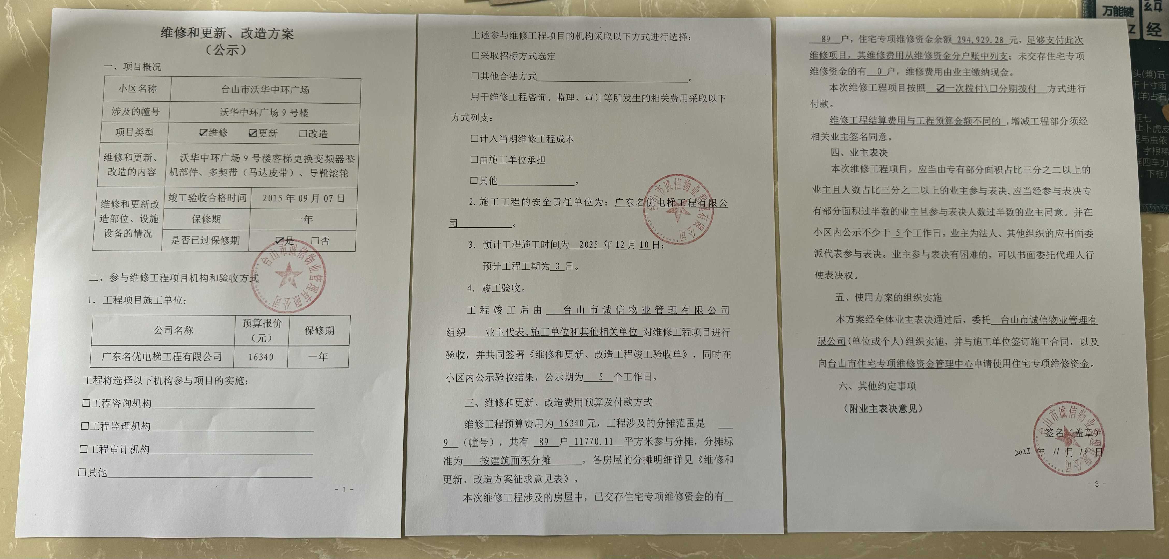 <td VALIGN="top" VALUES="" STYLE="border-width:0" BINDTYPE="0" ROWSPAN="17" COLSPAN="7" DATASOURCE="投票结果" ><font style=" font-family:方正小标宋简体;font-size:14pt;"><p style="line-height: 1.75em;"><span style="font-family: 宋体, SimSun;">各位尊敬的业主:</span><br/></p><p style="text-indent: 2em; line-height: 1.75em;"><span style="font-family: 宋体, SimSun;">根据法律法规的规定,本小区业主利用“江门市物业事项表决管理系统”已对本小区公共事务决策事项(<span style="font-family: 宋体; text-indent: 32px;">沃华中环广场9号楼客梯更换变频器整机部件、多契带(马达皮带)、导靴滚轮使用维修资金的投票</span>)进行了表决,在经过7日的询异公示期后,未收到业主有效的异议。现将投票结果公告,并就产生的法律效力说明如下:</span></p><p style="line-height: 1.75em; text-indent: 0em;"><strong style="text-indent: 2em;"><span style="font-family: 宋体, SimSun;">一、投票范围</span></strong></p><p style="text-indent: 2em; line-height: 1.75em;"><span style="font-family: 宋体, SimSun;">台山沃华中环广场台山沃华中环广场9号楼</span></p><p style="text-indent: 2em; line-height: 1.75em;"><span style="font-family: 宋体, SimSun;">总人数(专有部分人数之和):87</span></p><p style="text-indent: 2em; line-height: 1.75em;"><span style="font-family: 宋体, SimSun;"><span style="font-family: 宋体, SimSun; text-indent: 32px;"><span style="font-family: 宋体; text-indent: 32px;"><span style="font-family: 宋体; text-indent: 32px;">总户数:89</span></span></span></span></p><p style="text-indent: 2em; line-height: 1.75em;"><span style="font-family: 宋体, SimSun;">建筑物总面积(专有部分面积之和):11770.11㎡</span></p><p style="line-height: 1.75em;"><strong><span style="font-family: 宋体, SimSun;">二、投票结果公告时间</span></strong></p><p style="text-indent: 2em; line-height: 1.75em;"><span style="font-family: 宋体, SimSun;"><span style="font-family: 宋体, SimSun; text-indent: 32px;">从2025年12月14日开始</span></span></p><p style="line-height: 1.75em;"><strong><span style="font-family: 宋体, SimSun;">三、计票规则</span></strong></p><p style="text-indent: 2em; line-height: 1.75em;"><span style="font-family: 宋体, SimSun;">表决事项:使用建筑物及其附属设施的维修资金<br /><p style='font-family: 宋体, SimSun;line-height: 1.75em; text-indent: 2em;'>计票规则:弃权票不并入其它项&nbsp;&nbsp;&nbsp;&nbsp;未表决票不并入其它项</p></span></p><p style="line-height: 1.75em;"><strong><span style="font-family: 宋体, SimSun;">四、通过规则</span></strong></p><p style="line-height: 1.75em;"><strong><span style="font-family: 宋体, SimSun;">&nbsp; 根据《中华人民共和国民法典》第二百七十八条规定:业主共同决定事项,应当由专有部分面积占比三分之二以上的业主且人数占比三分之二以上的业主参与表决。</span></strong></p><p style="text-indent: 2em; line-height: 1.75em;"><span style="font-family: 宋体, SimSun;"><span style="font-family: 宋体, SimSun; text-indent: 32px;">表决事项:使用建筑物及其附属设施的维修资金<br /><p style='font-family: 宋体, SimSun;line-height: 1.75em; text-indent: 2em;'>通过规则:双2/3以上参与表决,参与表决双过半同意</p></span></span></p><p style="line-height: 1.75em;"><strong><span style="font-family: 宋体, SimSun;">五、投票结果</span></strong></p><p style="line-height: 1.75em; text-indent: 2em;"><span style="font-family: 宋体, SimSun; text-indent: 2em;"><div id='resultTable'><table style='table-layout: fixed; font-size:12px; margin-top:10px' width='100%' border='0' cellspacing='0' cellpadding='0'><tr><td height='28' colspan='10' align='center' style='border: 1px solid #666'><strong style='font-size: 14px;'> 使用建筑物及其附属设施的维修资金</strong></td> </tr><tr id='trfirst'><td height='28' colspan='4' style='border-left: 1px solid #666; border-bottom: 1px solid #666'><strong>&nbsp;申报单位:</strong> 台山市诚信物业管理有限公司</td><td colspan='3' style='border-left: 1px solid #666; border-bottom: 1px solid #666'><strong>&nbsp;联系方式:</strong> 5555819 </td><td colspan='3' style='border-left: 1px solid #666; border-bottom: 1px solid #666; border-right: 1px solid #666'><strong>&nbsp;申报日期:</strong> 2025年11月15日 </td></tr><tr> <td height='28' colspan='5' style='border-left: 1px solid #666; border-bottom: 1px solid #666'><strong>&nbsp;列支总人数(专有部分人数之和):</strong>87人 </td><td colspan='5' style='border-left: 1px solid #666; border-bottom: 1px solid #666; border-right: 1px solid #666'><strong>&nbsp;列支建筑物总面积(专有部分面积之和):</strong>11770.11㎡ </td> </tr><tr><td height='28' colspan='10' bgcolor='#F3F3F3' style='border-left: 1px solid #666;border-bottom: 1px solid #666;border-right: 1px solid #666'><strong>&nbsp;参与表决人数及面积统计</strong></td></tr><tr><td height='28' colspan='5' style='border-left: 1px solid #666; border-bottom: 1px solid #666'><strong>&nbsp;参与表决人数:</strong>63人</td><td colspan='5' style='border-left: 1px solid #666; border-bottom: 1px solid #666; border-right: 1px solid #666'><strong>&nbsp;参与表决人数占总人数比例:</strong>72.41%</td></tr><tr><td height='28' colspan='5' style='border-left: 1px solid #666; border-bottom: 1px solid #666'><strong>&nbsp;参与表决面积:</strong>8417.75㎡</td><td colspan='5' style='border-left: 1px solid #666; border-bottom: 1px solid #666; border-right: 1px solid #666'><strong>&nbsp;参与表决面积占总面积比例:</strong>71.52%</td></tr><tr><td height='28' colspan='10' bgcolor='#F3F3F3' style='border-left: 1px solid #666; border-bottom: 1px solid #666;border-right: 1px solid #666'> <strong>&nbsp;参与表决同意人数及面积统计</strong></td> </tr><t