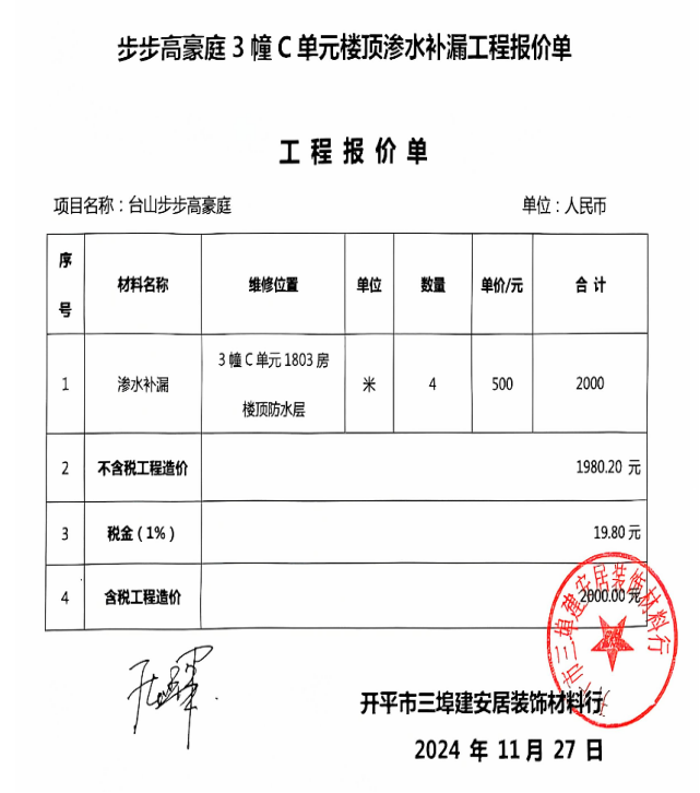 <td VALIGN="top" VALUES="" STYLE="border-width:0" BINDTYPE="0" ROWSPAN="19" COLSPAN="7" DATASOURCE="投票结果" ><font style="font-size:14pt;"><p style="white-space: normal; font-family: 宋体; line-height: 1.75em;">步步高豪庭步步高豪庭3幢C单元全体业主:</p><p style="white-space: normal; font-family: 宋体; line-height: 1.75em; text-indent: 2em;">本小区关于步步高豪庭3幢C单元楼顶渗水补漏工程使用维修资金投票的投票已表决结束,询异时间从2025年01月10日开始,投票询异公示期间,业主可通过微信查询自己的表决情况或可凭身份证件申请查询自己的表决情况;如公示的业主表决情况与查询的本人表决意见不一致的,可以以书面形式向投票组织机构申诉,投票组织机构予以纠正并重新公示表决结果。异议提出人对投票组织机构的处理仍有异议的,可以向街道办事处(镇人民政府)反映处理,涉及住宅专项维修资金的,可向属地住宅专项维修资金管理中心反映处理。</p><p style="white-space: normal;"><br/></p><p style="white-space: normal; font-family: 宋体; line-height: 1.75em;"><strong>附件:</strong></p><p style="white-space: normal; font-family: 宋体; line-height: 1.75em;"><strong>一、投票范围</strong></p><p style="white-space: normal; font-family: 宋体; line-height: 1.75em; text-indent: 2em;">步步高豪庭步步高豪庭3幢C单元</p><p style="white-space: normal; font-family: 宋体; line-height: 1.75em; text-indent: 2em;">总人数(专有部分人数之和):51</p><p style="white-space: normal; font-family: 宋体; line-height: 1.75em; text-indent: 2em;"><span style="font-family: 宋体, SimSun;"><span style="font-family: 宋体; text-indent: 32px;"><span style="font-family: 宋体; text-indent: 32px;">总户数:51</span></span></span></p><p style="white-space: normal; font-family: 宋体; line-height: 1.75em; text-indent: 2em;">建筑物总面积(专有部分面积之和):6122.89㎡</p><p style="white-space: normal; font-family: 宋体; line-height: 1.75em;"><strong>二、询异公示起止时间</strong></p><p dir="ltr" style="white-space: normal; font-family: 宋体; line-height: 1.75em; text-indent: 2em;"><span style="text-indent: 36px;">2025年01月10日至2025年01月20日</span></p><p style="white-space: normal; font-family: 宋体; line-height: 1.75em;"><strong>三、投票详细描述</strong></p><p style="white-space: normal; font-family: 宋体; line-height: 1.75em; text-indent: 2em;"><p> 步步高豪庭小区3幢C单元楼顶公共区域开裂渗水的补漏维修申请。</p><p> 现对3幢C单元楼顶公共区域开裂进行补漏修复,工程维修预算金额为2000元,项目最终费用以施工合同签订金额为准。因已过保修期,维修费用由相关业主 按建筑面积分摊,每平方约0.32元,详见公示附件。如业主手机不能正常通过微信投票,请联系物业公司进行线下纸质投票,物业电话:0750-5538322/18138056278</p><p><br/></p></p><p style="white-space: normal; font-family: 宋体; line-height: 1.75em;"><strong>四、计票规则</strong></p><p style="white-space: normal; font-family: 宋体; line-height: 1.75em; text-indent: 2em;">表决事项:使用建筑物及其附属设施的维修资金<br /><p style='text-align: left; font-family: 宋体; font-size: 16px; line-height: 1.75em; text-indent: 2em;'>计票规则:弃权票不并入其它项 未表决票不并入其它项</p></p><p style="white-space: normal; font-family: 宋体; line-height: 1.75em;"><strong>五、通过规则</strong></p><p style="white-space: normal; font-family: 宋体; line-height: 1.75em;"><strong><strong style="white-space: normal;"><span style="font-family: 宋体, SimSun;"> 根据《中华人民共和国民法典》第二百七十八条规定:业主共同决定事项,应当由专有部分面积占比三分之二以上的业主且人数占比三分之二以上的业主参与表决。</span></strong></strong></p><p style="white-space: normal; font-family: 宋体; line-height: 1.75em; text-indent: 2em;">表决事项:使用建筑物及其附属设施的维修资金<br /><p style='text-align: left; font-family: 宋体; font-size: 16px; line-height: 1.75em; text-indent: 2em;'>通过规则:双2/3以上参与表决,参与表决双过半同意</p></p><p style="white-space: normal; font-family: 宋体; line-height: 1.75em;"><strong>六、投票结果</strong></p><p style="white-space: normal; font-family: 宋体; line-height: 1.75em; text-indent: 2em;"><div id='resultTable'><table style='table-layout: fixed; font-size:12px; margin-top:10px' width='100%' border='0' cellspacing='0' cellpadding='0'><tr><td height='28' colspan='10' align='center' style='border: 1px solid #666'><strong style='font-size: 14px;'> 使用建筑物及其附属设施的维修资金</strong></td> </tr><tr id='trfirst'><td height='28' colspan='4' style='border-left: 1px solid #666; border-bottom: 1px solid #666'><strong> 申报单位:</strong> 广州珠江城市管理服务集团股份有限公司台山分公司</td><td colspan='3' style='border-left: 1px solid #666; border-bottom: 1px solid #666'><strong> 联系方式:</strong> 5538322 </td><td colspan='3' style='border-left: 1px solid #666; border-bottom: 1px solid #666; border-right: 1px solid #666'><strong> 申报日期:</strong> 2024年12月9日 </td></tr><tr> <td height='28' colspan='5' style='border-left: 1px solid #666; border-bottom: 1px solid #666'><strong> 总人数(专有部分人数之和):</strong>51人 </td><td colspan='5' style='border-left: 1px solid #666; border-bottom: 1px solid #666; border-right: 1px solid #666'><strong> 建筑物总面积(专有部分面积之和):</strong>6122.89㎡ </td> </tr><tr><td height='28' colspan='10' bgcolor='#F3F3F3' style='border-left: 1px solid #666;border-bottom: 1px solid #666;border-right: 1px solid #666'><strong> 参与人数及面积统计</strong></td></tr><tr><td height='28' colspan='5' style='bord