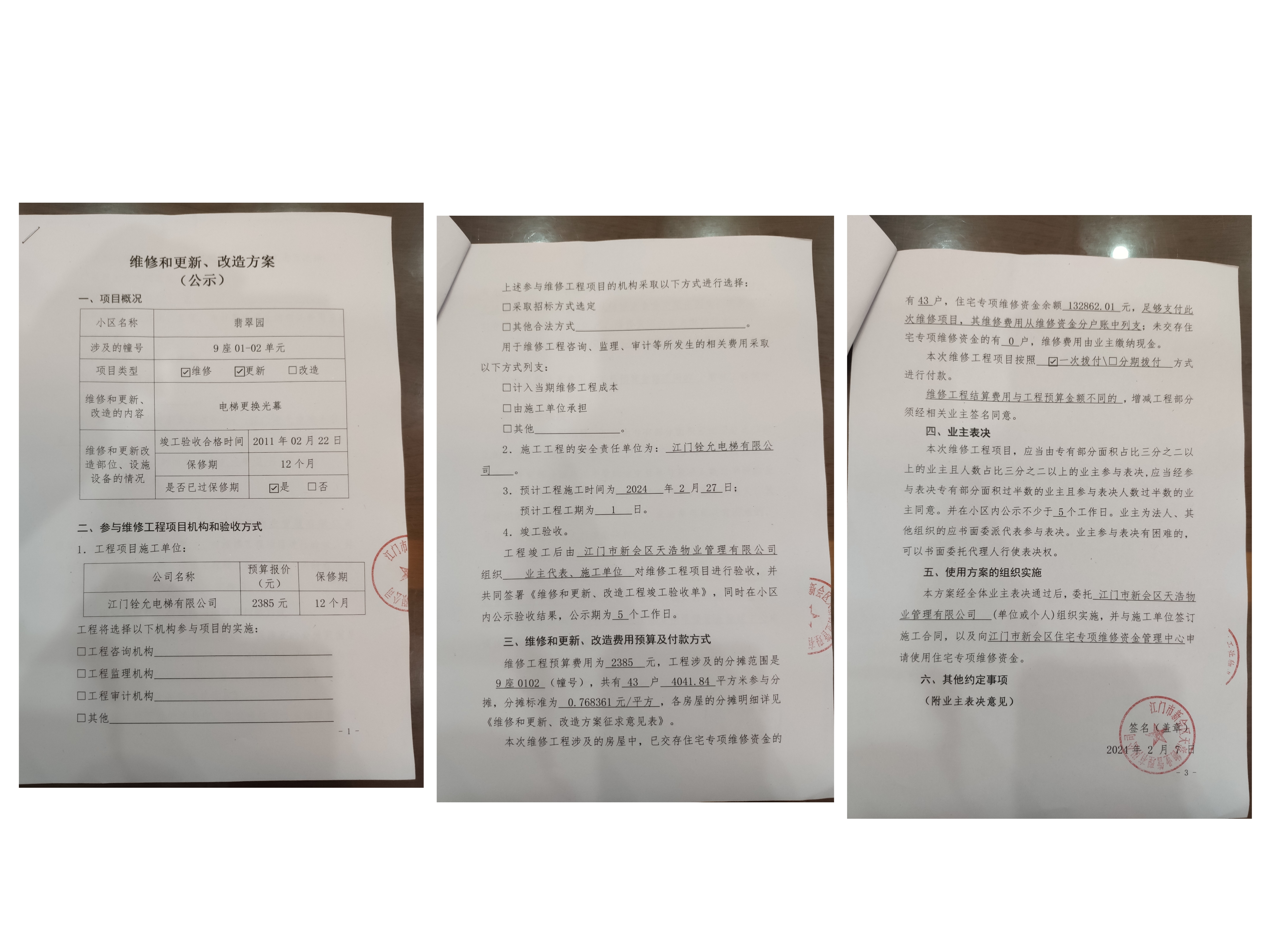 <td VALIGN="top" VALUES="" STYLE="border-width:0" BINDTYPE="0" ROWSPAN="19" COLSPAN="7" DATASOURCE="投票结果" ><font style="font-size:14pt;"><p style="white-space: normal; font-family: 宋体; line-height: 1.75em;">翡翠园翡翠园9座全体业主:</p><p style="white-space: normal; font-family: 宋体; line-height: 1.75em; text-indent: 2em;">本小区关于翡翠园9座01-02单元电梯【梯粤JX5580】更换光幕使用维修资金的投票的投票已表决结束,询异时间从2024年03月29日开始,投票询异公示期间,业主可通过微信查询自己的表决情况或可凭身份证件申请查询自己的表决情况;如公示的业主表决情况与查询的本人表决意见不一致的,可以以书面形式向投票组织机构申诉,投票组织机构予以纠正并重新公示表决结果。异议提出人对投票组织机构的处理仍有异议的,可以向街道办事处(镇人民政府)反映处理,涉及住宅专项维修资金的,可向属地住宅专项维修资金管理中心反映处理。</p><p style="white-space: normal;"><br/></p><p style="white-space: normal; font-family: 宋体; line-height: 1.75em;"><strong>附件:</strong></p><p style="white-space: normal; font-family: 宋体; line-height: 1.75em;"><strong>一、投票范围</strong></p><p style="white-space: normal; font-family: 宋体; line-height: 1.75em; text-indent: 2em;">翡翠园翡翠园9座</p><p style="white-space: normal; font-family: 宋体; line-height: 1.75em; text-indent: 2em;">总人数(专有部分人数之和):24</p><p style="white-space: normal; font-family: 宋体; line-height: 1.75em; text-indent: 2em;"><span style="font-family: 宋体, SimSun;"><span style="font-family: 宋体; text-indent: 32px;"><span style="font-family: 宋体; text-indent: 32px;">总户数:43</span></span></span></p><p style="white-space: normal; font-family: 宋体; line-height: 1.75em; text-indent: 2em;">建筑物总面积(专有部分面积之和):4041.84㎡</p><p style="white-space: normal; font-family: 宋体; line-height: 1.75em;"><strong>二、询异公示起止时间</strong></p><p dir="ltr" style="white-space: normal; font-family: 宋体; line-height: 1.75em; text-indent: 2em;"><span style="text-indent: 36px;">2024年03月29日至2024年04月04日</span></p><p style="white-space: normal; font-family: 宋体; line-height: 1.75em;"><strong>三、投票详细描述</strong></p><p style="white-space: normal; font-family: 宋体; line-height: 1.75em; text-indent: 2em;"><p>翡翠园9座01-02单元电梯【梯粤JX5580】电梯开关门异常,无法正常运行,经检查,需更换二合一光幕(触板式光幕) ,工程维修预算金额为 2385元,项目最终费用以施工合同签订金额为准。维修费用的分摊标准为按建筑面积分摊 ,每平方0.768361元,详见公示附件。如业主手机不能正常通过微信投票,请联系物业公司进行线下纸质投票,物业公司联系电话:6602800</p></p><p style="white-space: normal; font-family: 宋体; line-height: 1.75em;"><strong>四、计票规则</strong></p><p style="white-space: normal; font-family: 宋体; line-height: 1.75em; text-indent: 2em;">表决事项:使用建筑物及其附属设施的维修资金<br /><p style='text-align: left; font-family: 宋体; font-size: 16px; line-height: 1.75em; text-indent: 2em;'>计票规则:弃权票不并入其它项 未表决票不并入其它项</p></p><p style="white-space: normal; font-family: 宋体; line-height: 1.75em;"><strong>五、通过规则</strong></p><p style="white-space: normal; font-family: 宋体; line-height: 1.75em;"><strong><strong style="white-space: normal;"><span style="font-family: 宋体, SimSun;"> 根据《中华人民共和国民法典》第二百七十八条规定:业主共同决定事项,应当由专有部分面积占比三分之二以上的业主且人数占比三分之二以上的业主参与表决。</span></strong></strong></p><p style="white-space: normal; font-family: 宋体; line-height: 1.75em; text-indent: 2em;">表决事项:使用建筑物及其附属设施的维修资金<br /><p style='text-align: left; font-family: 宋体; font-size: 16px; line-height: 1.75em; text-indent: 2em;'>通过规则:双2/3以上参与表决,参与表决双过半同意</p></p><p style="white-space: normal; font-family: 宋体; line-height: 1.75em;"><strong>六、投票结果</strong></p><p style="white-space: normal; font-family: 宋体; line-height: 1.75em; text-indent: 2em;"><div id='resultTable'><table style='table-layout: fixed; font-size:12px; margin-top:10px' width='100%' border='0' cellspacing='0' cellpadding='0'><tr><td height='28' colspan='10' align='center' style='border: 1px solid #666'><strong style='font-size: 14px;'> 使用建筑物及其附属设施的维修资金</strong></td> </tr><tr id='trfirst'><td height='28' colspan='4' style='border-left: 1px solid #666; border-bottom: 1px solid #666'><strong> 申报单位:</strong> 江门市新会区天浩物业管理有限公司</td><td colspan='3' style='border-left: 1px solid #666; border-bottom: 1px solid #666'><strong> 联系方式:</strong> </td><td colspan='3' style='border-left: 1px solid #666; border-bottom: 1px solid #666; border-right: 1px solid #666'><strong> 申报日期:</strong> 2024年2月7日 </td></tr><tr> <td height='28' colspan='5' style='border-left: 1px solid #666; border-bottom: 1px solid #666'><strong> 总人数(专有部分人数之和):</strong>24人 </td><td colspan='5' style='border-left: 1px solid #666; border-bottom: 1px solid #666; border-right: 1px solid #666'><strong> 建筑物总面积(专有部分面积之和):</strong>4041.84㎡ </td> </tr><tr><td height='28' colspan='10' bgcolor='#F3F3F3' style='border-left: 1px solid #666;border-bottom: 1px solid #666;border-right: 1px solid #666'><strong> 参与人数及面积统计</strong></td></tr><tr><td height='28' colspan='5' style='border-left: 1px solid #666; border-bottom: 1px solid #666'><strong> 参与表决专有部分人数之