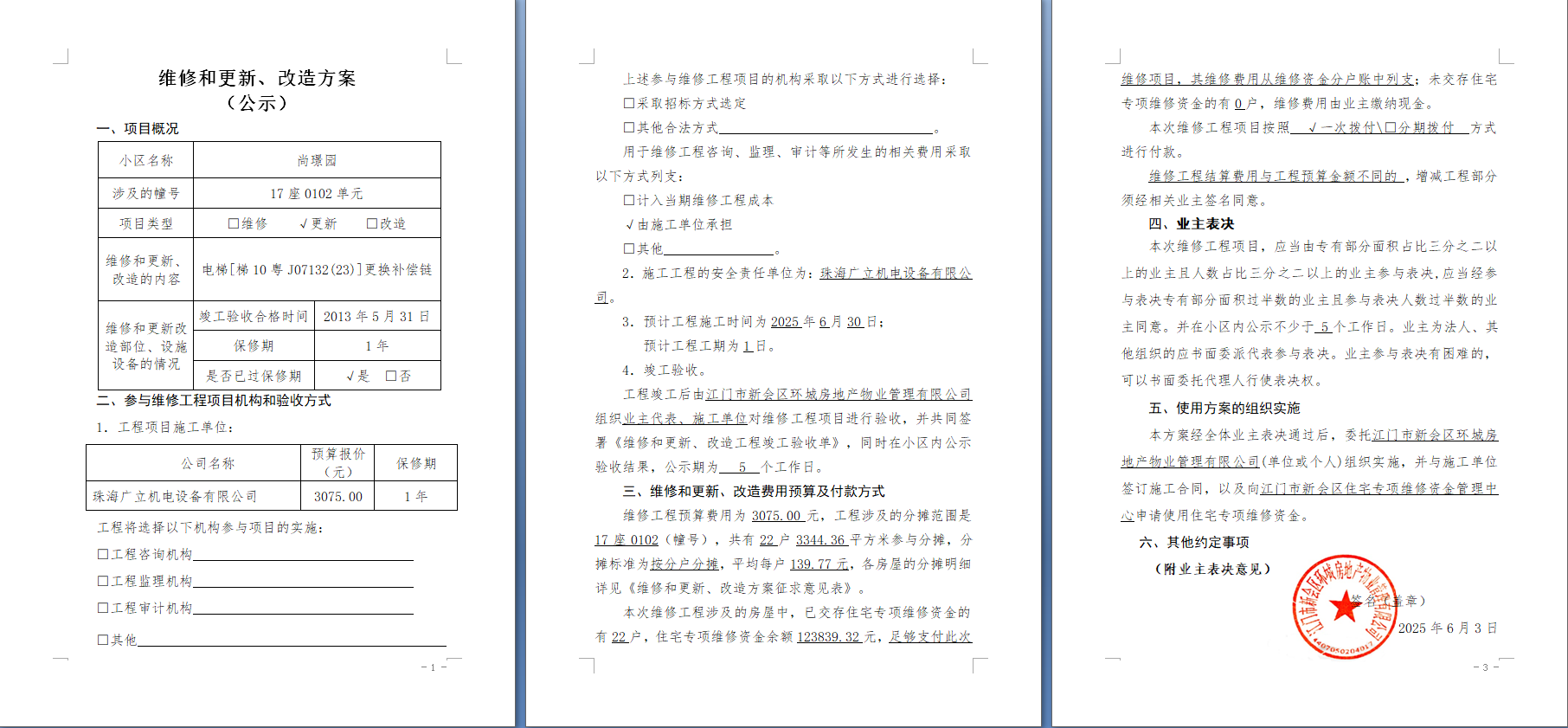 <td VALIGN="top" VALUES="" STYLE="border-width:0" BINDTYPE="0" ROWSPAN="19" COLSPAN="7" DATASOURCE="投票结果" ><font style="font-size:14pt;"><p style="white-space: normal; font-family: 宋体; line-height: 1.75em;">尚璟园尚璟园17座全体业主:</p><p style="white-space: normal; font-family: 宋体; line-height: 1.75em; text-indent: 2em;">本小区关于尚璟园17座0102电梯[梯10粤J07132(23)]更换补偿链使用维修资金的投票的投票已表决结束,询异时间从2025年08月15日开始,投票询异公示期间,业主可通过微信查询自己的表决情况或可凭身份证件申请查询自己的表决情况;如公示的业主表决情况与查询的本人表决意见不一致的,可以以书面形式向投票组织机构申诉,投票组织机构予以纠正并重新公示表决结果。异议提出人对投票组织机构的处理仍有异议的,可以向街道办事处(镇人民政府)反映处理,涉及住宅专项维修资金的,可向属地住宅专项维修资金管理中心反映处理。</p><p style="white-space: normal;"><br/></p><p style="white-space: normal; font-family: 宋体; line-height: 1.75em;"><strong>附件:</strong></p><p style="white-space: normal; font-family: 宋体; line-height: 1.75em;"><strong>一、投票范围</strong></p><p style="white-space: normal; font-family: 宋体; line-height: 1.75em; text-indent: 2em;">尚璟园尚璟园17座</p><p style="white-space: normal; font-family: 宋体; line-height: 1.75em; text-indent: 2em;">总人数(专有部分人数之和):22</p><p style="white-space: normal; font-family: 宋体; line-height: 1.75em; text-indent: 2em;"><span style="font-family: 宋体, SimSun;"><span style="font-family: 宋体; text-indent: 32px;"><span style="font-family: 宋体; text-indent: 32px;">总户数:22</span></span></span></p><p style="white-space: normal; font-family: 宋体; line-height: 1.75em; text-indent: 2em;">建筑物总面积(专有部分面积之和):3344.36㎡</p><p style="white-space: normal; font-family: 宋体; line-height: 1.75em;"><strong>二、询异公示起止时间</strong></p><p dir="ltr" style="white-space: normal; font-family: 宋体; line-height: 1.75em; text-indent: 2em;"><span style="text-indent: 36px;">2025年08月15日至2025年08月25日</span></p><p style="white-space: normal; font-family: 宋体; line-height: 1.75em;"><strong>三、投票详细描述</strong></p><p style="white-space: normal; font-family: 宋体; line-height: 1.75em; text-indent: 2em;"><p><span style="font-family: arial, helvetica, sans-serif;"><span style="font-size: 15px; color: black; background: white;">本小区</span><span style="font-size: 15px; color: black; background: white;">17</span><span style="font-size: 15px; color: black; background: white;">座</span><span style="font-size: 15px; color: black; background: white;">0102</span><span style="font-size: 15px; color: black; background: white;">单元电梯</span><span style="font-size: 15px; color: black; background: white;">[</span><span style="font-size: 15px; color: black; background: white;"></span>梯10粤J07132(23)<span style="font-size: 15px; color: black; background: white;">]</span><span style="font-size: 15px; color: black; background: white;">出现故障,经检查,是由于电梯补偿链损坏造成。现需申请使用维修资金对</span><span style="font-size: 15px; color: black; background: white;">17</span><span style="font-size: 15px; color: black; background: white;">座</span><span style="font-size: 15px; color: black; background: white;">0102</span><span style="font-size: 15px; color: black; background: white;">单元电梯</span><span style="font-size: 15px; color: black; background: white;">[</span><span style="font-size: 15px; color: black; background: white;"></span><span style="text-wrap-mode: wrap;">梯10粤J07132(23)</span><span style="font-size: 15px; color: black; background: white;">]</span><span style="font-size: 15px; color: black; background: white;">的补偿链进行更换,工程维修预算金额为</span><span style="font-size: 15px; color: black; background: white;">3075.00</span><span style="font-size: 15px; color: black; background: white;">元,项目最终费用以施工合同签订金额为准。因已过保修期,维修费用由相关业主按分户分摊,共涉及</span><span style="font-size: 15px; color: black; background: white;">22</span><span style="font-size: 15px; color: black; background: white;">户,每户139.77元,详见公示附件。如业主手机不能正常通过微信投票,请联系物业公司进行线下纸质投票,物业公司联系电话:</span><span style="font-size: 15px; color: black; background: white;">0750-6198383</span><span style="font-size: 15px; color: black; background: white;">。</span></span></p><p><br/></p></p><p style="white-space: normal; font-family: 宋体; line-height: 1.75em;"><strong>四、计票规则</strong></p><p style="white-space: normal; font-family: 宋体; line-height: 1.75em; text-indent: 2em;">表决事项:使用建筑物及其附属设施的维修资金<br /><p style='text-align: left; font-family: 宋体; font-size: 16px; line-height: 1.75em; text-indent: 2em;'>计票规则:弃权票不并入其它项 未表决票不并入其它项</p></p><p style="white-space: normal; font-family: 宋体; line-height: 1.75em;"><strong>五、通过规则</strong></p><p style="white-space: normal; font-family: 宋体; line-height: 1.75em;"><strong><strong style="white-space: normal;"><span style="font-family: 宋体, SimSun;"> 根据《中华人民共和国民法典》第二百七十八条规定:业主共同决定事项,应当由专有部分面积占比三分之二以上的业主且人数占比三分之二以上的业主参与表决。</span></strong></strong></p><p style="white-space: normal; font-family: 宋体; line-height: 1.75em; text-indent: 2em;">表决事项:使用建筑物及其附属设施的维修资金<br /><p style='text-align: left; font-family: 宋体; font-