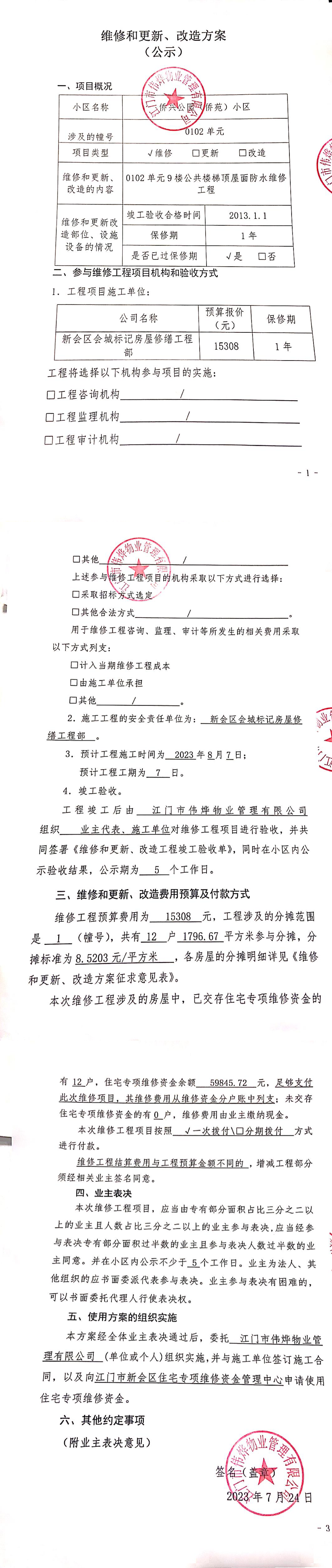<td valign="top" values="" style="border-width:0" bindtype="0" rowspan="19" colspan="7" datasource="投票结果"><font style="font-size:14pt;"><p style="white-space: normal; font-family: 宋体; line-height: 1.75em;">侨兴公园会城侨兴南路28号全体业主:</p><p style="white-space: normal; font-family: 宋体; line-height: 1.75em; text-indent: 2em;">本小区关于侨兴公园(侨苑)0102单元9楼公共楼梯顶屋面防水维修工程的使用维修资金的投票的投票已表决结束,询异时间从2023年08月24日开始,投票询异公示期间,业主可通过微信查询自己的表决情况或可凭身份证件申请查询自己的表决情况;如公示的业主表决情况与查询的本人表决意见不一致的,可以以书面形式向投票组织机构申诉,投票组织机构予以纠正并重新公示表决结果。异议提出人对投票组织机构的处理仍有异议的,可以向街道办事处(镇人民政府)反映处理,涉及住宅专项维修资金的,可向属地住宅专项维修资金管理中心反映处理。</p><p style="white-space: normal;"><br></p><p style="white-space: normal; font-family: 宋体; line-height: 1.75em;"><strong>附件:</strong></p><p style="white-space: normal; font-family: 宋体; line-height: 1.75em;"><strong>一、投票范围</strong></p><p style="white-space: normal; font-family: 宋体; line-height: 1.75em; text-indent: 2em;">侨兴公园会城侨兴南路28号</p><p style="white-space: normal; font-family: 宋体; line-height: 1.75em; text-indent: 2em;">总人数(专有部分人数之和):12</p><p style="white-space: normal; font-family: 宋体; line-height: 1.75em; text-indent: 2em;"><span style="font-family: 宋体, SimSun;">总户数:12</span></p><p style="white-space: normal; font-family: 宋体; line-height: 1.75em; text-indent: 2em;">建筑物总面积(专有部分面积之和):1796.67㎡</p><p style="white-space: normal; font-family: 宋体; line-height: 1.75em;"><strong>二、询异公示起止时间</strong></p><p dir="ltr" style="white-space: normal; font-family: 宋体; line-height: 1.75em; text-indent: 2em;"><span style="text-indent: 36px;">2023年08月24日至2023年08月30日</span></p><p style="white-space: normal; font-family: 宋体; line-height: 1.75em;"><strong>三、投票详细描述</strong></p><p style="white-space: normal; font-family: 宋体; line-height: 1.75em; text-indent: 2em;"></p><p><span style="font-size: 14px;">本小区0102单元9楼公共楼梯顶屋面共用部位出现严重渗水,下雨时导致9楼公共楼梯与9楼公共平台有渗水现象,经检查,是由于日久公共楼梯顶屋面的防水层失效导致渗水,已过保修期。现需申请使用维修资金对0102单元9楼公共楼梯顶屋面与9楼公共平台的共用部位进行防水工程维修,工程维修预算金额为15308元,项目最终费用以施工合同签订金额为准。维修费用的分摊标准为按建筑面积分摊,每平方约:8.5203元,详见公示附件。如业主手机不能正常通过微信投票,请联系物业公司进行线下纸质投票,物业联系电话:13326847009</span></p><p></p><p style="white-space: normal; font-family: 宋体; line-height: 1.75em;"><strong>四、计票规则</strong></p><p style="white-space: normal; font-family: 宋体; line-height: 1.75em; text-indent: 2em;">表决事项:使用建筑物及其附属设施的维修资金<br></p><p style="text-align: left; font-family: 宋体; font-size: 16px; line-height: 1.75em; text-indent: 2em;">计票规则:弃权票不并入其它项 未表决票不并入其它项</p><p></p><p style="white-space: normal; font-family: 宋体; line-height: 1.75em;"><strong>五、通过规则</strong></p><p style="white-space: normal; font-family: 宋体; line-height: 1.75em; text-indent: 2em;">表决事项:使用建筑物及其附属设施的维修资金<br></p><p style="text-align: left; font-family: 宋体; font-size: 16px; line-height: 1.75em; text-indent: 2em;">通过规则:参与表决专有部分面积过半数的业主且参与表决人数过半数的业主同意</p><p></p><p style="white-space: normal; font-family: 宋体; line-height: 1.75em;"><strong>六、投票结果</strong></p><p style="white-space: normal; font-family: 宋体; line-height: 1.75em; text-indent: 2em;"></p><div id="resultTable"><table style="table-layout: fixed; font-size:12px; margin-top:10px" width="100%" border="0" cellspacing="0" cellpadding="0"><tbody><tr><td height="28" colspan="10" align="center" style="border: 1px solid #666"><strong style="font-size: 14px;"> 使用建筑物及其附属设施的维修资金</strong></td> </tr><tr id="trfirst"><td height="28" colspan="4" style="border-left: 1px solid #666; border-bottom: 1px solid #666"><strong> 申报单位:</strong> 江门市伟烨物业管理有限公司</td><td colspan="3" style="border-left: 1px solid #666; border-bottom: 1px solid #666"><strong> 联系方式:</strong> 0750-6123828 </td><td colspan="3" style="border-left: 1px solid #666; border-bottom: 1px solid #666; border-right: 1px solid #666"><strong> 申报日期:</strong> 2023年7月21日 </td></tr><tr> <td height="28" colspan="5" style="border-left: 1px solid #666; border-bottom: 1px solid #666"><strong> 总人数(专有部分人数之和):</strong>12人 </td><td colspan="5" style="border-left: 1px solid #666; border-bottom: 1px solid #666; border-right: 1px solid #666"><strong> 建筑物总面积(专有部分面积之和):</strong>1796.67㎡ </td> </tr><tr><td height="28" colspan="10" bgcolor="#F3F3F3" style="border-left: 1px solid #666;border-bottom: 1px solid #666;border-right: 1px solid #666"><strong> 参与人数及面积统计</strong></td></tr><tr><td height="28" colspan="5" style="border-left: 1px solid #666; border-bottom: 1px solid #666"><strong> 参与表决专有部分人数之和:</strong>2人</td><td colspan="5" style="border-left: 1px solid #666; border-bottom: 1px solid #666; border-right: 1px solid #666"><strong> 参与表