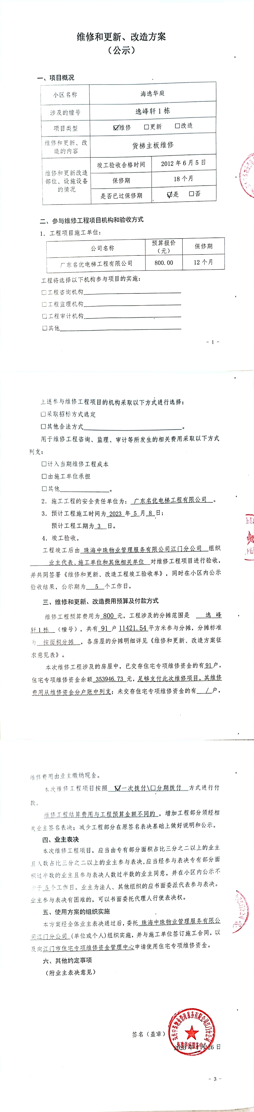 <td valign="top" values="" style="border-width:0" bindtype="0" rowspan="17" colspan="7" datasource="投票结果"><font style=" font-family:方正小标宋简体;font-size:14pt;"><p style="line-height: 1.75em;"><span style="font-family: 宋体, SimSun;">各位尊敬的业主:</span><br></p><p style="text-indent: 2em; line-height: 1.75em;"><span style="font-family: 宋体, SimSun;">根据法律法规的规定,本小区业主利用“物业公共事务决策系统”已对本小区公共事务决策事项进行了表决,在经过7日的询异公示期后,未收到业主有效的异议。现将投票结果公告,并就产生的法律效力说明如下:</span></p><p style="line-height: 1.75em; text-indent: 0em;"><strong style="text-indent: 2em;"><span style="font-family: 宋体, SimSun;">一、投票范围</span></strong></p><p style="text-indent: 2em; line-height: 1.75em;"><span style="font-family: 宋体, SimSun;">海逸华庭江海区海逸华庭逸峰轩1幢</span></p><p style="text-indent: 2em; line-height: 1.75em;"><span style="font-family: 宋体, SimSun;">总人数(专有部分人数之和):91</span></p><p style="text-indent: 2em; line-height: 1.75em;"><span style="font-family: 宋体, SimSun;"><span style="font-family: 宋体, SimSun; text-indent: 32px;">总户数:91</span></span></p><p style="text-indent: 2em; line-height: 1.75em;"><span style="font-family: 宋体, SimSun;">建筑物总面积(专有部分面积之和):11421.54㎡</span></p><p style="line-height: 1.75em;"><strong><span style="font-family: 宋体, SimSun;">二、投票起止时间</span></strong></p><p style="text-indent: 2em; line-height: 1.75em;"><span style="font-family: 宋体, SimSun;">投票表决时间:从2023年04月27日到2023年05月31日止</span></p><p style="text-indent: 2em; line-height: 1.75em;"><span style="font-family: 宋体, SimSun;">投票询异公示时间:从2023年06月01日开始</span></p><p style="text-indent: 2em; line-height: 1.75em;"><span style="font-family: 宋体, SimSun;">投票结果通知公告时间:从2023年06月08日开始</span></p><p style="line-height: 1.75em;"><strong><span style="font-family: 宋体, SimSun;">三、计票规则</span></strong></p><p style="text-indent: 2em; line-height: 1.75em;"><span style="font-family: 宋体, SimSun;">表决事项:使用建筑物及其附属设施的维修资金<br></span></p><p style="font-family: 宋体, SimSun;line-height: 1.75em; text-indent: 2em;">计票规则:弃权票不并入其它项 未表决票不并入其它项</p><p></p><p style="line-height: 1.75em;"><strong><span style="font-family: 宋体, SimSun;">四、通过规则</span></strong></p><p style="text-indent: 2em; line-height: 1.75em;"><span style="font-family: 宋体, SimSun;"><span style="font-family: 宋体, SimSun; text-indent: 32px;">表决事项:使用建筑物及其附属设施的维修资金<br></span></span></p><p style="font-family: 宋体, SimSun;line-height: 1.75em; text-indent: 2em;">通过规则:参与表决专有部分面积过半数的业主且参与表决人数过半数的业主同意</p><p></p><p style="line-height: 1.75em;"><strong><span style="font-family: 宋体, SimSun;">五、投票结果</span></strong></p><p style="line-height: 1.75em; text-indent: 2em;"><span style="font-family: 宋体, SimSun; text-indent: 2em;"></span></p><div id="resultTable"><table style="table-layout: fixed; font-size:12px; margin-top:10px" width="100%" border="0" cellspacing="0" cellpadding="0"><tbody><tr><td height="28" colspan="10" align="center" style="border: 1px solid #666"><strong style="font-size: 14px;"> 使用建筑物及其附属设施的维修资金</strong></td> </tr><tr id="trfirst"><td height="28" colspan="4" style="border-left: 1px solid #666; border-bottom: 1px solid #666"><strong> 申报单位:</strong> 珠海中珠物业管理服务有限公司江门分公司</td><td colspan="3" style="border-left: 1px solid #666; border-bottom: 1px solid #666"><strong> 联系方式:</strong> 3181899 </td><td colspan="3" style="border-left: 1px solid #666; border-bottom: 1px solid #666; border-right: 1px solid #666"><strong> 申报日期:</strong> 2023年4月26日 </td></tr><tr> <td height="28" colspan="5" style="border-left: 1px solid #666; border-bottom: 1px solid #666"><strong> 总人数(专有部分人数之和):</strong>91人 </td><td colspan="5" style="border-left: 1px solid #666; border-bottom: 1px solid #666; border-right: 1px solid #666"><strong> 建筑物总面积(专有部分面积之和):</strong>11421.54㎡ </td> </tr><tr><td height="28" colspan="10" bgcolor="#F3F3F3" style="border-left: 1px solid #666;border-bottom: 1px solid #666;border-right: 1px solid #666"><strong> 参与人数及面积统计</strong></td></tr><tr><td height="28" colspan="5" style="border-left: 1px solid #666; border-bottom: 1px solid #666"><strong> 参与表决专有部分人数之和:</strong>67人</td><td colspan="5" style="border-left: 1px solid #666; border-bottom: 1px solid #666; border-right: 1px solid #666"><strong> 参与表决占有表决权总人数比例:</strong>73.63%</td></tr><tr><td height="28" colspan="5" style="border-left: 1px solid #666; border-bottom: 1px solid #666"><strong> 参与表决专有部分面积之和:</strong>8444.18㎡</td><td colspan="5" style="border-left: 1px solid #666; border-bottom: 1px solid #666; border-right: 1px solid #666"><strong> 参与表决占有表决权总面积比例:</strong>73.93%</td></tr><tr><td height="28" colspan="10" bgcolor="#F3F3F3" style="border-left: 1px solid #666; border-bottom: 1px solid #666;border-right: 1px solid #666"> <strong> 未参与人数及面积统计</strong></td> </tr><tr><td height="28" colspan="5" style="border-left: 1px solid #666; border-bottom: 1px solid #666"><strong> 未参与表决专有部分人数之和:</strong>24人 </td><td colspan="5" style="border-left: 1px solid #666; border-bottom: 1px solid #666; border-right: 1px solid #666"><strong> 未参与表决占有表决权总人数比例:</strong>26.3