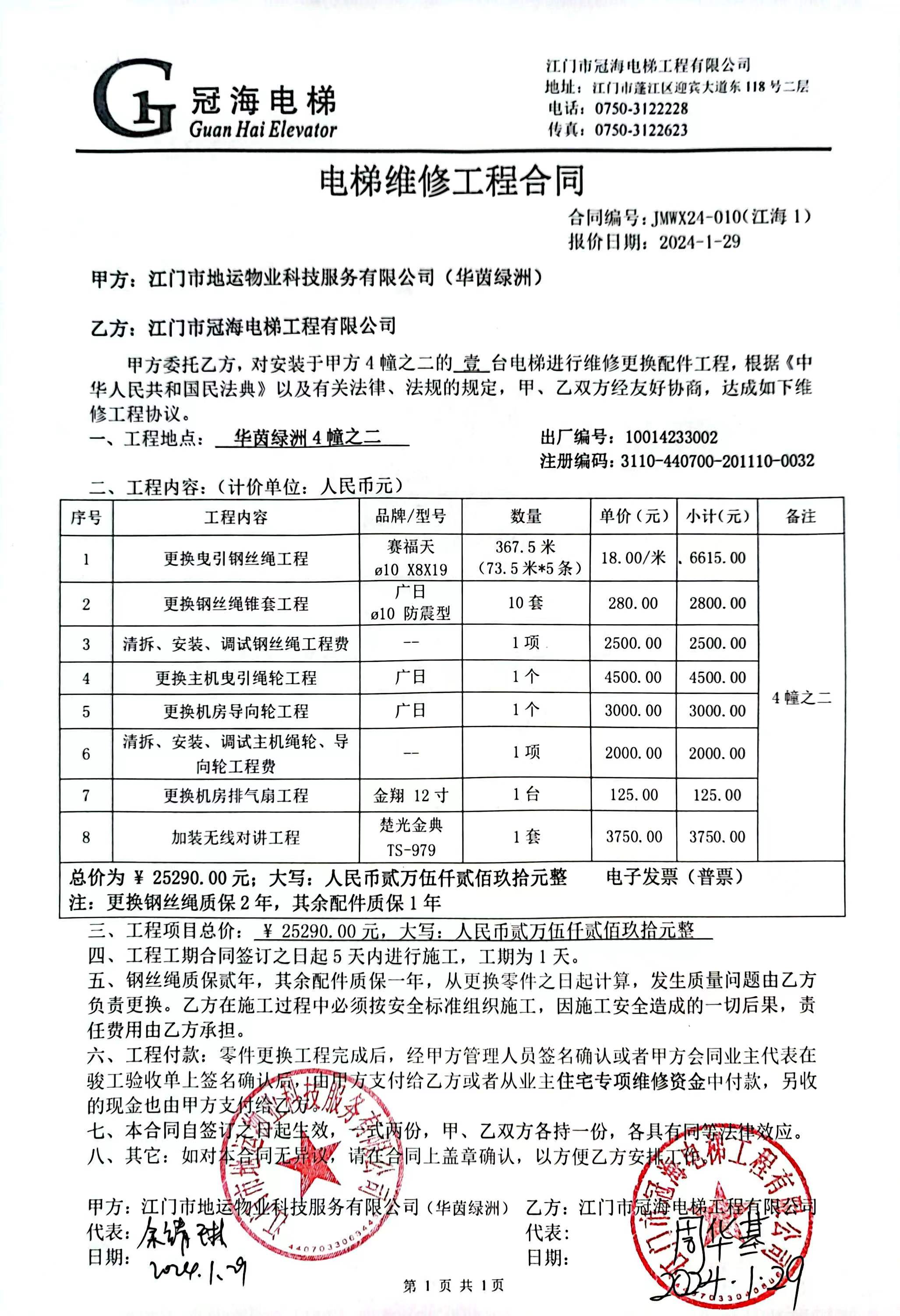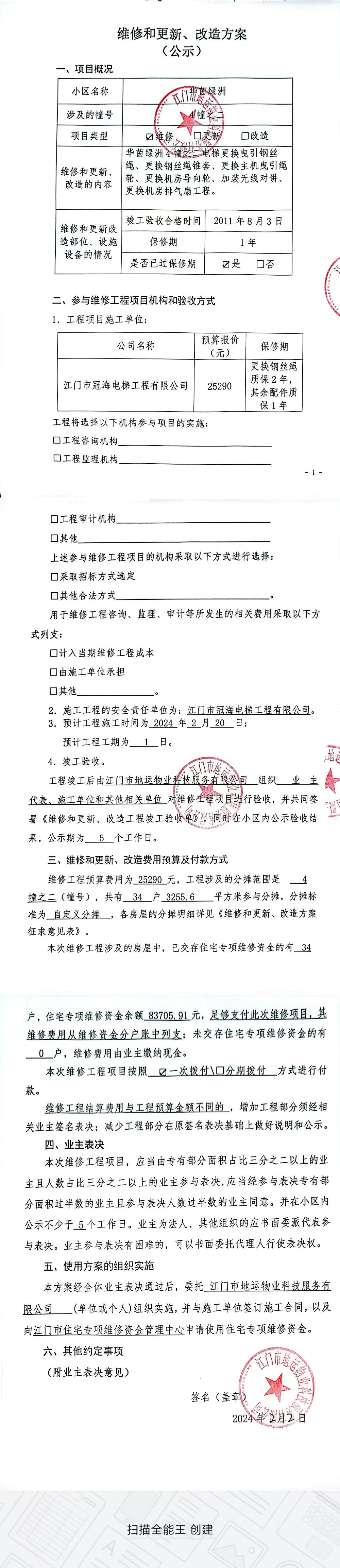 <td VALIGN="top" VALUES="" STYLE="border-width:0" BINDTYPE="0" ROWSPAN="19" COLSPAN="7" DATASOURCE="投票结果" ><font style="font-size:14pt;"><p style="white-space: normal; font-family: 宋体; line-height: 1.75em;">华茵绿洲江门市江海区华茵绿洲4幢全体业主:</p><p style="white-space: normal; font-family: 宋体; line-height: 1.75em; text-indent: 2em;">本小区关于华茵绿洲4幢之二电梯更换曳引钢丝绳及配件等六项的投票的投票已表决结束,询异时间从2024年03月01日开始,投票询异公示期间,业主可通过微信查询自己的表决情况或可凭身份证件申请查询自己的表决情况;如公示的业主表决情况与查询的本人表决意见不一致的,可以以书面形式向投票组织机构申诉,投票组织机构予以纠正并重新公示表决结果。异议提出人对投票组织机构的处理仍有异议的,可以向街道办事处(镇人民政府)反映处理,涉及住宅专项维修资金的,可向属地住宅专项维修资金管理中心反映处理。</p><p style="white-space: normal;"><br/></p><p style="white-space: normal; font-family: 宋体; line-height: 1.75em;"><strong>附件:</strong></p><p style="white-space: normal; font-family: 宋体; line-height: 1.75em;"><strong>一、投票范围</strong></p><p style="white-space: normal; font-family: 宋体; line-height: 1.75em; text-indent: 2em;">华茵绿洲江门市江海区华茵绿洲4幢</p><p style="white-space: normal; font-family: 宋体; line-height: 1.75em; text-indent: 2em;">总人数(专有部分人数之和):34</p><p style="white-space: normal; font-family: 宋体; line-height: 1.75em; text-indent: 2em;"><span style="font-family: 宋体, SimSun;"><span style="font-family: 宋体; text-indent: 32px;"><span style="font-family: 宋体; text-indent: 32px;">总户数:34</span></span></span></p><p style="white-space: normal; font-family: 宋体; line-height: 1.75em; text-indent: 2em;">建筑物总面积(专有部分面积之和):3255.60㎡</p><p style="white-space: normal; font-family: 宋体; line-height: 1.75em;"><strong>二、询异公示起止时间</strong></p><p dir="ltr" style="white-space: normal; font-family: 宋体; line-height: 1.75em; text-indent: 2em;"><span style="text-indent: 36px;">2024年03月01日至2024年03月07日</span></p><p style="white-space: normal; font-family: 宋体; line-height: 1.75em;"><strong>三、投票详细描述</strong></p><p style="white-space: normal; font-family: 宋体; line-height: 1.75em; text-indent: 2em;"><p><span style=";font-family:宋体;font-size:14px"><span style="font-family:宋体">华茵绿洲</span></span><span style=";font-family:宋体;font-size:14px"><span style="font-family:Calibri">4</span></span><span style=";font-family:宋体;font-size:14px"><span style="font-family:宋体">幢之二的电梯故障,电梯不能正常运行,经检查确认为</span></span><span style=";font-family:宋体;font-size:14px"><span style="font-family:Calibri">4</span></span><span style=";font-family:宋体;font-size:14px"><span style="font-family:宋体">幢之二电梯</span></span><span style=";font-family:宋体;font-size:14px"><span style="font-family:宋体">钢丝绳出现磨损及渗油现象,曳引绳轮磨损导致摩擦力不足,会出现电梯运行不平层、振动、异响、打滑故障</span></span><span style=";font-family:宋体;font-size:14px"><span style="font-family:宋体">,</span></span><span style=";font-family:宋体;font-size:14px"><span style="font-family:宋体">电梯需加装无线对讲等,</span></span><span style="font-family: 宋体; font-size: 14px;">因电梯投入使用时间已有<span style="font-family:Calibri">13</span>年,</span><span style="font-family: 宋体; font-size: 14px;">电梯</span><span style="font-family: 宋体; font-size: 14px;">已过保修期。现需申请使用维修资金对</span><span style="font-family: 宋体; font-size: 14px;"><span style="font-family:Calibri">4</span></span><span style="font-family: 宋体; font-size: 14px;">幢之二电梯进行维修,工程维修预算金额为</span><span style="font-family: 宋体; font-size: 14px;"><span style="font-family:Calibri">25290</span></span><span style="font-family: 宋体; font-size: 14px;">元,项目最终费用以施工合同签订金额为准。维修费用的分摊标准为按</span><span style="font-family: 宋体; font-size: 14px;">自定义</span><span style="font-family: 宋体; font-size: 14px;">分摊,每户分摊约</span><span style="font-family: 宋体; font-size: 14px;"><span style="font-family:Calibri">743.82</span></span><span style="font-family: 宋体; font-size: 14px;">元,详见公示附件。如业主手机不能正常通过维修投票,请联系物业公司进行线下纸质投票,物业电话:<span style="font-family:Calibri">18924686903</span>。</span></p><p><br/></p><p><br/></p></p><p style="white-space: normal; font-family: 宋体; line-height: 1.75em;"><strong>四、计票规则</strong></p><p style="white-space: normal; font-family: 宋体; line-height: 1.75em; text-indent: 2em;">表决事项:使用建筑物及其附属设施的维修资金<br /><p style='text-align: left; font-family: 宋体; font-size: 16px; line-height: 1.75em; text-indent: 2em;'>计票规则:弃权票不并入其它项 未表决票不并入其它项</p></p><p style="white-space: normal; font-family: 宋体; line-height: 1.75em;"><strong>五、通过规则</strong></p><p style="white-space: normal; font-family: 宋体; line-height: 1.75em;"><strong><strong style="white-space: normal;"><span style="font-family: 宋体, SimSun;"> 根据《中华人民共和国民法典》第二百七十八条规定:业主共同决定事项,应当由专有部分面积占比三分之二以上的业主且人数占比三分之二以上的业主参与表决。</span></strong></strong></p><p style="white-space: normal; font-family: 宋体; line-height: 1.75em; text-indent: 2em;">表决事项:使用建筑物及其附属