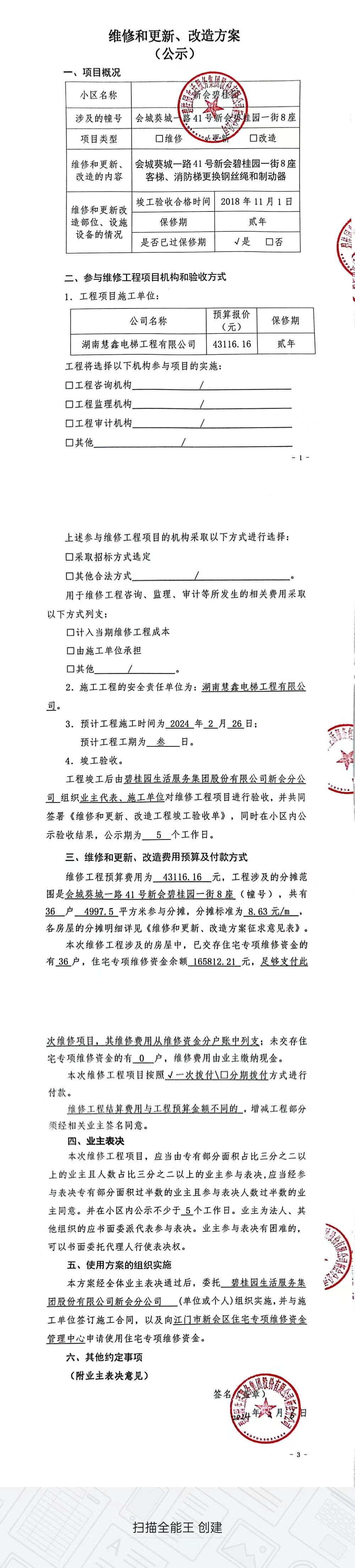 <td VALIGN="top" VALUES="" STYLE="border-width:0" BINDTYPE="0" ROWSPAN="17" COLSPAN="7" DATASOURCE="投票结果" ><font style=" font-family:方正小标宋简体;font-size:14pt;"><p style="line-height: 1.75em;"><span style="font-family: 宋体, SimSun;">各位尊敬的业主:</span><br/></p><p style="text-indent: 2em; line-height: 1.75em;"><span style="font-family: 宋体, SimSun;">根据法律法规的规定,本小区业主利用“江门市物业事项表决管理系统”已对本小区公共事务决策事项进行了表决,在经过7日的询异公示期后,未收到业主有效的异议。现将投票结果公告,并就产生的法律效力说明如下:</span></p><p style="line-height: 1.75em; text-indent: 0em;"><strong style="text-indent: 2em;"><span style="font-family: 宋体, SimSun;">一、投票范围</span></strong></p><p style="text-indent: 2em; line-height: 1.75em;"><span style="font-family: 宋体, SimSun;">新会碧桂园葵城一路41号01街08座</span></p><p style="text-indent: 2em; line-height: 1.75em;"><span style="font-family: 宋体, SimSun;">总人数(专有部分人数之和):36</span></p><p style="text-indent: 2em; line-height: 1.75em;"><span style="font-family: 宋体, SimSun;"><span style="font-family: 宋体, SimSun; text-indent: 32px;"><span style="font-family: 宋体; text-indent: 32px;"><span style="font-family: 宋体; text-indent: 32px;">总户数:36</span></span></span></span></p><p style="text-indent: 2em; line-height: 1.75em;"><span style="font-family: 宋体, SimSun;">建筑物总面积(专有部分面积之和):4997.50㎡</span></p><p style="line-height: 1.75em;"><strong><span style="font-family: 宋体, SimSun;">二、投票结果公告时间</span></strong></p><p style="text-indent: 2em; line-height: 1.75em;"><span style="font-family: 宋体, SimSun;">从2024年04月08日开始</span></p><p style="line-height: 1.75em;"><strong><span style="font-family: 宋体, SimSun;">三、计票规则</span></strong></p><p style="text-indent: 2em; line-height: 1.75em;"><span style="font-family: 宋体, SimSun;">表决事项:使用建筑物及其附属设施的维修资金<br /><p style='font-family: 宋体, SimSun;line-height: 1.75em; text-indent: 2em;'>计票规则:弃权票不并入其它项&nbsp;&nbsp;&nbsp;&nbsp;未表决票不并入其它项</p></span></p><p style="line-height: 1.75em;"><strong><span style="font-family: 宋体, SimSun;">四、通过规则</span></strong></p><p style="line-height: 1.75em;"><strong><span style="font-family: 宋体, SimSun;">&nbsp; 根据《中华人民共和国民法典》第二百七十八条规定:业主共同决定事项,应当由专有部分面积占比三分之二以上的业主且人数占比三分之二以上的业主参与表决。</span></strong></p><p style="text-indent: 2em; line-height: 1.75em;"><span style="font-family: 宋体, SimSun;"><span style="font-family: 宋体, SimSun; text-indent: 32px;">表决事项:使用建筑物及其附属设施的维修资金<br /><p style='font-family: 宋体, SimSun;line-height: 1.75em; text-indent: 2em;'>通过规则:双2/3以上参与表决,参与表决双过半同意</p></span></span></p><p style="line-height: 1.75em;"><strong><span style="font-family: 宋体, SimSun;">五、投票结果</span></strong></p><p style="line-height: 1.75em; text-indent: 2em;"><span style="font-family: 宋体, SimSun; text-indent: 2em;"><div id='resultTable'><table style='table-layout: fixed; font-size:12px; margin-top:10px' width='100%' border='0' cellspacing='0' cellpadding='0'><tr><td height='28' colspan='10' align='center' style='border: 1px solid #666'><strong style='font-size: 14px;'> 使用建筑物及其附属设施的维修资金</strong></td> </tr><tr id='trfirst'><td height='28' colspan='4' style='border-left: 1px solid #666; border-bottom: 1px solid #666'><strong>&nbsp;申报单位:</strong> 碧桂园生活服务集团股份有限公司新会分公司</td><td colspan='3' style='border-left: 1px solid #666; border-bottom: 1px solid #666'><strong>&nbsp;联系方式:</strong> </td><td colspan='3' style='border-left: 1px solid #666; border-bottom: 1px solid #666; border-right: 1px solid #666'><strong>&nbsp;申报日期:</strong> 2024年2月7日 </td></tr><tr> <td height='28' colspan='5' style='border-left: 1px solid #666; border-bottom: 1px solid #666'><strong>&nbsp;列支总人数(专有部分人数之和):</strong>36人 </td><td colspan='5' style='border-left: 1px solid #666; border-bottom: 1px solid #666; border-right: 1px solid #666'><strong>&nbsp;列支建筑物总面积(专有部分面积之和):</strong>4997.50㎡ </td> </tr><tr><td height='28' colspan='10' bgcolor='#F3F3F3' style='border-left: 1px solid #666;border-bottom: 1px solid #666;border-right: 1px solid #666'><strong>&nbsp;参与表决人数及面积统计</strong></td></tr><tr><td height='28' colspan='5' style='border-left: 1px solid #666; border-bottom: 1px solid #666'><strong>&nbsp;参与表决人数:</strong>23人</td><td colspan='5' style='border-left: 1px solid #666; border-bottom: 1px solid #666; border-right: 1px solid #666'><strong>&nbsp;参与表决人数占总人数比例:</strong>63.89%</td></tr><tr><td height='28' colspan='5' style='border-left: 1px solid #666; border-bottom: 1px solid #666'><strong>&nbsp;参与表决面积:</strong>3195.70㎡</td><td colspan='5' style='border-left: 1px solid #666; border-bottom: 1px solid #666; border-right: 1px solid #666'><strong>&nbsp;参与表决面积占总面积比例:</strong>63.95%</td></tr><tr><td height='28' colspan='10' bgcolor='#F3F3F3' style='border-left: 1px solid #666; border-bottom: 1px solid #666;border-right: 1px solid #666'> <strong>&nbsp;参与表决同意人数及面积统计</strong></td> </tr><tr><td height='28' colspan='5' style='border-left: 1px solid #666; border-bottom: 1px solid #666'><strong>&nbsp;参与表决同意人数:</strong>1人 </td><td colspan='5' style='border-left: 1px solid #666; border-bottom: 1px solid #666; border-right: 1px solid 