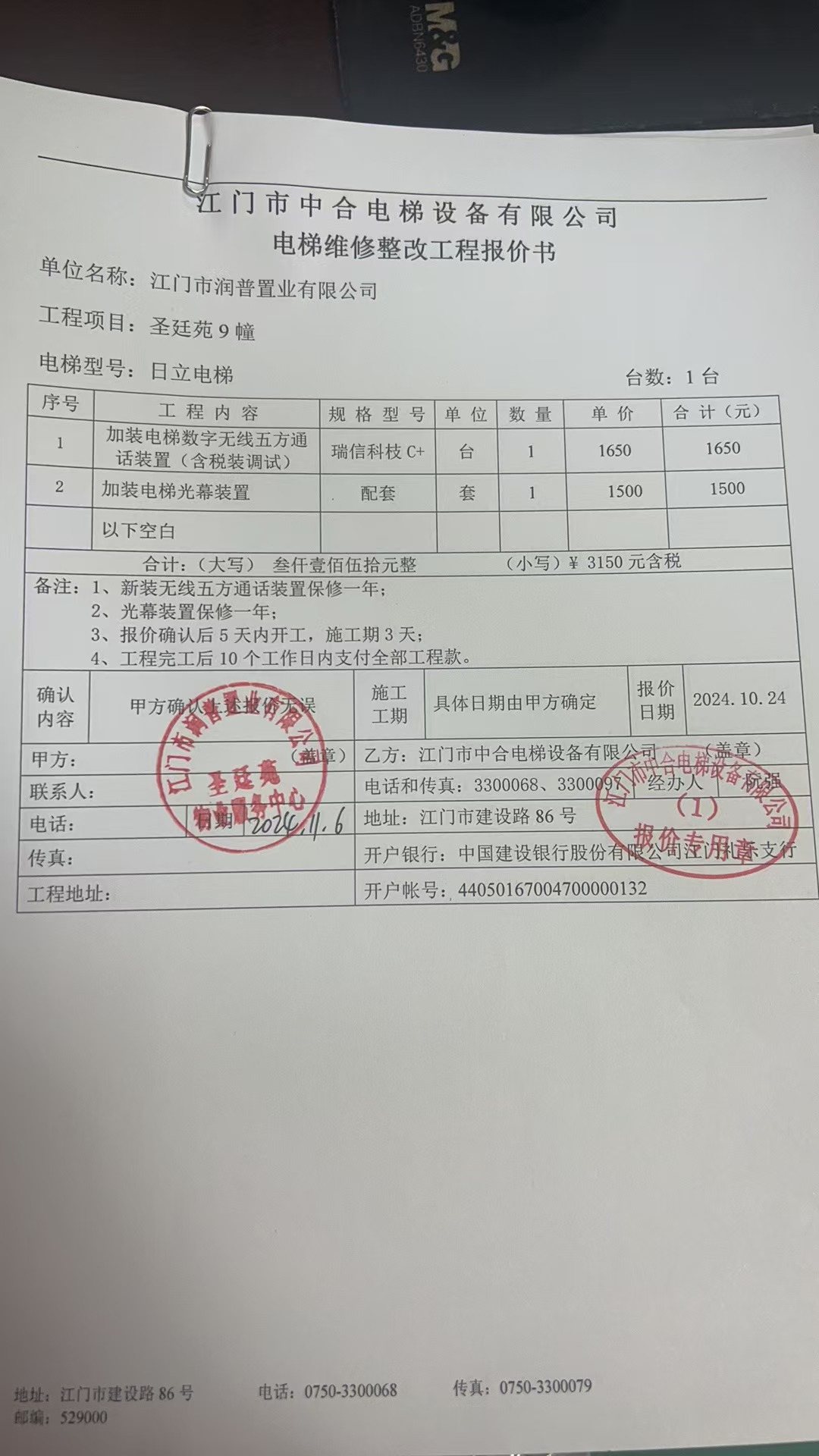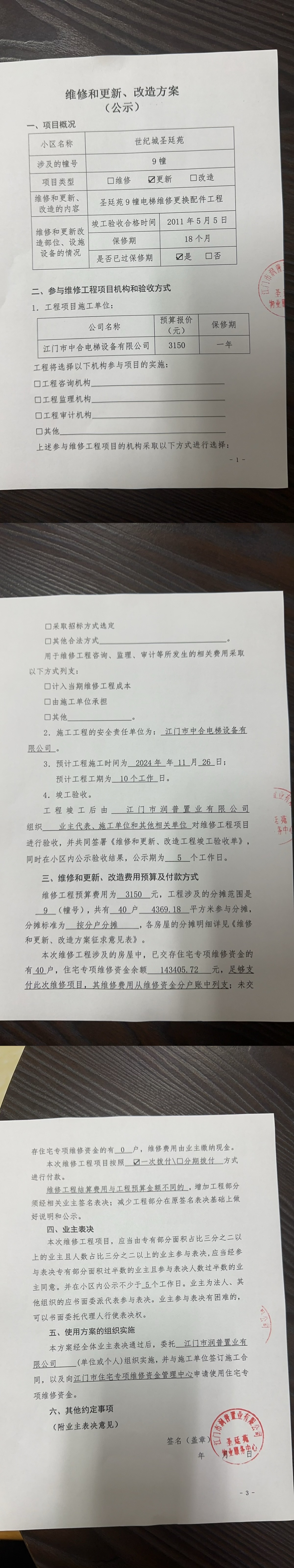 <td VALIGN="top" VALUES="" STYLE="border-width:0" BINDTYPE="0" ROWSPAN="19" COLSPAN="7" DATASOURCE="投票结果" ><font style="font-size:14pt;"><p style="white-space: normal; font-family: 宋体; line-height: 1.75em;">世纪城蓬江区圣廷苑9幢全体业主:</p><p style="white-space: normal; font-family: 宋体; line-height: 1.75em; text-indent: 2em;">本小区关于圣廷苑小区9幢电梯维修更换配件工程使用维修资金的投票的投票已表决结束,询异时间从2026年01月07日开始,投票询异公示期间,业主可通过微信查询自己的表决情况或可凭身份证件申请查询自己的表决情况;如公示的业主表决情况与查询的本人表决意见不一致的,可以以书面形式向投票组织机构申诉,投票组织机构予以纠正并重新公示表决结果。异议提出人对投票组织机构的处理仍有异议的,可以向街道办事处(镇人民政府)反映处理,涉及住宅专项维修资金的,可向属地住宅专项维修资金管理中心反映处理。</p><p style="white-space: normal;"><br/></p><p style="white-space: normal; font-family: 宋体; line-height: 1.75em;"><strong>附件:</strong></p><p style="white-space: normal; font-family: 宋体; line-height: 1.75em;"><strong>一、投票范围</strong></p><p style="white-space: normal; font-family: 宋体; line-height: 1.75em; text-indent: 2em;">世纪城蓬江区圣廷苑9幢</p><p style="white-space: normal; font-family: 宋体; line-height: 1.75em; text-indent: 2em;">总人数(专有部分人数之和):39</p><p style="white-space: normal; font-family: 宋体; line-height: 1.75em; text-indent: 2em;"><span style="font-family: 宋体, SimSun;"><span style="font-family: 宋体; text-indent: 32px;"><span style="font-family: 宋体; text-indent: 32px;">总户数:40</span></span></span></p><p style="white-space: normal; font-family: 宋体; line-height: 1.75em; text-indent: 2em;">建筑物总面积(专有部分面积之和):4369.18㎡</p><p style="white-space: normal; font-family: 宋体; line-height: 1.75em;"><strong>二、询异公示起止时间</strong></p><p dir="ltr" style="white-space: normal; font-family: 宋体; line-height: 1.75em; text-indent: 2em;"><span style="text-indent: 36px;">2026年01月07日至2026年01月14日</span></p><p style="white-space: normal; font-family: 宋体; line-height: 1.75em;"><strong>三、投票详细描述</strong></p><p style="white-space: normal; font-family: 宋体; line-height: 1.75em; text-indent: 2em;"><p style="font-family: "Helvetica Neue", Helvetica, Arial, sans-serif; font-size: 14px; white-space: normal; background-color: rgb(255, 255, 255);">一、圣廷苑9幢电梯五方通话和线路老化不能正常通话,由于现场线路老化布线困难,建议更换无线数字对讲装置。</p><p style="font-family: "Helvetica Neue", Helvetica, Arial, sans-serif; font-size: 14px; white-space: normal; background-color: rgb(255, 255, 255);">二、圣廷苑9幢电梯轿门是旧式触板保护装置,经常出现夹人现象,为确保电梯安全使用,建议更换光幕式保护装置。</p><p style="font-family: "Helvetica Neue", Helvetica, Arial, sans-serif; font-size: 14px; white-space: normal; background-color: rgb(255, 255, 255);">现对圣廷苑9幢进行更换配件工程,工程预算金额为3150元,项目最终费用以施工合同签订金额为准。因已过保修期,维修费用由相关业主按分户分摊,每户78.75元,详见公示</p><p style="font-family: "Helvetica Neue", Helvetica, Arial, sans-serif; font-size: 14px; white-space: normal; background-color: rgb(255, 255, 255);">附件。如业主手机不能正常通过微信投票,请联系物业公司进行线下纸质投票,物业电话:0750-3688100。</p><p><br/></p></p><p style="white-space: normal; font-family: 宋体; line-height: 1.75em;"><strong>四、计票规则</strong></p><p style="white-space: normal; font-family: 宋体; line-height: 1.75em; text-indent: 2em;">表决事项:使用建筑物及其附属设施的维修资金<br /><p style='text-align: left; font-family: 宋体; font-size: 16px; line-height: 1.75em; text-indent: 2em;'>计票规则:弃权票不并入其它项 未表决票不并入其它项</p></p><p style="white-space: normal; font-family: 宋体; line-height: 1.75em;"><strong>五、通过规则</strong></p><p style="white-space: normal; font-family: 宋体; line-height: 1.75em;"><strong><strong style="white-space: normal;"><span style="font-family: 宋体, SimSun;"> 根据《中华人民共和国民法典》第二百七十八条规定:业主共同决定事项,应当由专有部分面积占比三分之二以上的业主且人数占比三分之二以上的业主参与表决。</span></strong></strong></p><p style="white-space: normal; font-family: 宋体; line-height: 1.75em; text-indent: 2em;">表决事项:使用建筑物及其附属设施的维修资金<br /><p style='text-align: left; font-family: 宋体; font-size: 16px; line-height: 1.75em; text-indent: 2em;'>通过规则:双2/3以上参与表决,参与表决双过半同意</p></p><p style="white-space: normal; font-family: 宋体; line-height: 1.75em;"><strong>六、投票结果</strong></p><p style="white-space: normal; font-family: 宋体; line-height: 1.75em; text-indent: 2em;"><div id='resultTable'><table style='table-layout: fixed; font-size:12px; margin-top:10px' width='100%' border='0' cellspacing='0' cellpadding='0'><tr><td height='28' colspan='10' align='center' style='border: 1px solid #666'><strong style='font-size: 14px;'> 使用建筑物及其附属设施的维修资金</strong></td> </tr><tr id='trfirst'><td height='28' colspan='4' style='border-left: 1px solid #666; border-bottom: 1px solid #666'><strong> 申报单位:</strong> 江门市润普置业有限公司</td><td colspan='3' style='border-left: 1px solid #666; border-bottom: 1px solid #666'><strong> 联系方式:</strong> (0750) 3871336 3829717 </td><td colspan='3' style='border-left: 1px solid #666; border-b