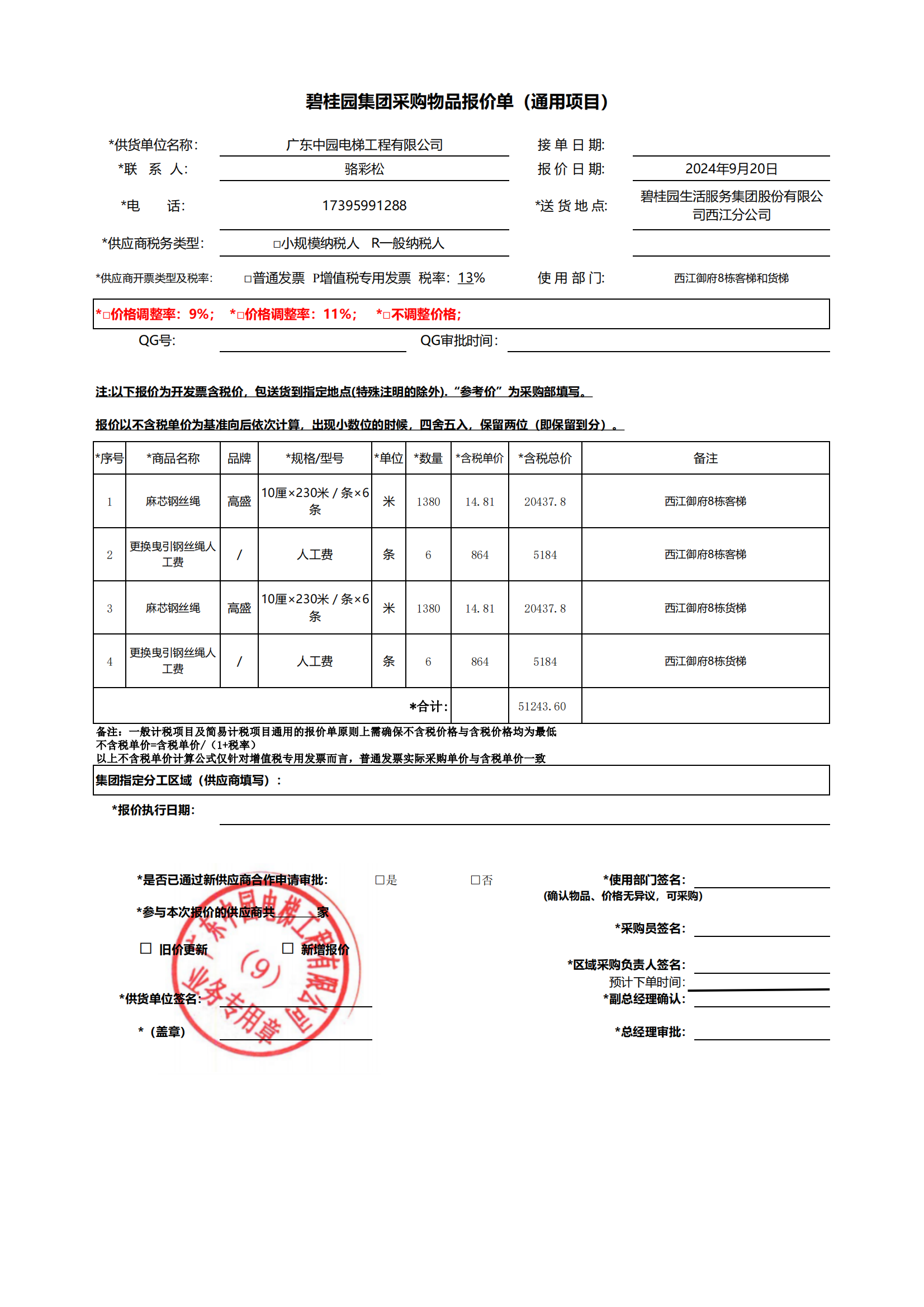 <td VALIGN="top" VALUES="" STYLE="border-width:0" BINDTYPE="0" ROWSPAN="19" COLSPAN="7" DATASOURCE="投票结果" ><font style="font-size:14pt;"><p style="white-space: normal; font-family: 宋体; line-height: 1.75em;">西江御府蓬江区西江御府8幢全体业主:</p><p style="white-space: normal; font-family: 宋体; line-height: 1.75em; text-indent: 2em;">本小区关于西江御府8幢客梯和货梯更换钢丝绳使用维修资金的投票的投票已表决结束,询异时间从2024年11月01日开始,投票询异公示期间,业主可通过微信查询自己的表决情况或可凭身份证件申请查询自己的表决情况;如公示的业主表决情况与查询的本人表决意见不一致的,可以以书面形式向投票组织机构申诉,投票组织机构予以纠正并重新公示表决结果。异议提出人对投票组织机构的处理仍有异议的,可以向街道办事处(镇人民政府)反映处理,涉及住宅专项维修资金的,可向属地住宅专项维修资金管理中心反映处理。</p><p style="white-space: normal;"><br/></p><p style="white-space: normal; font-family: 宋体; line-height: 1.75em;"><strong>附件:</strong></p><p style="white-space: normal; font-family: 宋体; line-height: 1.75em;"><strong>一、投票范围</strong></p><p style="white-space: normal; font-family: 宋体; line-height: 1.75em; text-indent: 2em;">西江御府蓬江区西江御府8幢</p><p style="white-space: normal; font-family: 宋体; line-height: 1.75em; text-indent: 2em;">总人数(专有部分人数之和):120</p><p style="white-space: normal; font-family: 宋体; line-height: 1.75em; text-indent: 2em;"><span style="font-family: 宋体, SimSun;"><span style="font-family: 宋体; text-indent: 32px;"><span style="font-family: 宋体; text-indent: 32px;">总户数:120</span></span></span></p><p style="white-space: normal; font-family: 宋体; line-height: 1.75em; text-indent: 2em;">建筑物总面积(专有部分面积之和):13117.78㎡</p><p style="white-space: normal; font-family: 宋体; line-height: 1.75em;"><strong>二、询异公示起止时间</strong></p><p dir="ltr" style="white-space: normal; font-family: 宋体; line-height: 1.75em; text-indent: 2em;"><span style="text-indent: 36px;">2024年11月01日至2024年11月18日</span></p><p style="white-space: normal; font-family: 宋体; line-height: 1.75em;"><strong>三、投票详细描述</strong></p><p style="white-space: normal; font-family: 宋体; line-height: 1.75em; text-indent: 2em;"><p>江门市特种设备检测研究院(以下简称“特检院”)对西江御府8幢电梯开展了年度检测,检测发现西江御府8幢2台电梯钢丝绳有出油泥和出红粉情况,情况较为严重,存在较大的安全隐患,红粉较多也可能会对电梯其他部件造成影响,扩大电梯其他部件的维修范围 ,针对钢丝绳出红粉这一情况特检院出具了整改通知书,现需申购钢丝绳进行更换,更换钢丝绳属于中大修,须依法启用“住宅专项维修资金”进行维修。<br/><br/> 现对8幢客梯、货梯进行维修,工程维修预算金额为51243.6元,项目最终费用以施工合同签订金额为准。因已过保修期,维修费用由相关业主按建筑面积分摊,每平方约3.9元,详见公示附件。如业主手机不能正常通过微信投票,请联系物业公司进行线下纸质投票,物业电话:0750-3335388。</p></p><p style="white-space: normal; font-family: 宋体; line-height: 1.75em;"><strong>四、计票规则</strong></p><p style="white-space: normal; font-family: 宋体; line-height: 1.75em; text-indent: 2em;">表决事项:使用建筑物及其附属设施的维修资金<br /><p style='text-align: left; font-family: 宋体; font-size: 16px; line-height: 1.75em; text-indent: 2em;'>计票规则:弃权票不并入其它项 未表决票不并入其它项</p></p><p style="white-space: normal; font-family: 宋体; line-height: 1.75em;"><strong>五、通过规则</strong></p><p style="white-space: normal; font-family: 宋体; line-height: 1.75em;"><strong><strong style="white-space: normal;"><span style="font-family: 宋体, SimSun;"> 根据《中华人民共和国民法典》第二百七十八条规定:业主共同决定事项,应当由专有部分面积占比三分之二以上的业主且人数占比三分之二以上的业主参与表决。</span></strong></strong></p><p style="white-space: normal; font-family: 宋体; line-height: 1.75em; text-indent: 2em;">表决事项:使用建筑物及其附属设施的维修资金<br /><p style='text-align: left; font-family: 宋体; font-size: 16px; line-height: 1.75em; text-indent: 2em;'>通过规则:最多前位,且双2/3以上参与表决,参与表决双过半同意</p></p><p style="white-space: normal; font-family: 宋体; line-height: 1.75em;"><strong>六、投票结果</strong></p><p style="white-space: normal; font-family: 宋体; line-height: 1.75em; text-indent: 2em;"><div id='resultTable'><table style='table-layout: fixed; font-size:12px; margin-top:10px' width='100%' border='0' cellspacing='0' cellpadding='0'><tr><td height='28' colspan='10' align='center' style='border: 1px solid #666'><strong style='font-size: 14px;'> 使用建筑物及其附属设施的维修资金</strong></td> </tr><tr id='trfirst'><td height='28' colspan='4' style='border-left: 1px solid #666; border-bottom: 1px solid #666'><strong> 申报单位:</strong> 碧桂园生活服务集团股份有限公司西江分公司</td><td colspan='3' style='border-left: 1px solid #666; border-bottom: 1px solid #666'><strong> 联系方式:</strong> 0750-3938919 </td><td colspan='3' style='border-left: 1px solid #666; border-bottom: 1px solid #666; border-right: 1px solid #666'><strong> 申报日期:</strong> 2024年10月14日 </td></tr><tr> <td height='28' colspan='5' style='border-left: 1px solid #666; border-bottom: 1px solid #666'><strong> 总人数(专有部分人数之和):</strong>120人 </td><td colspan='5' style='border