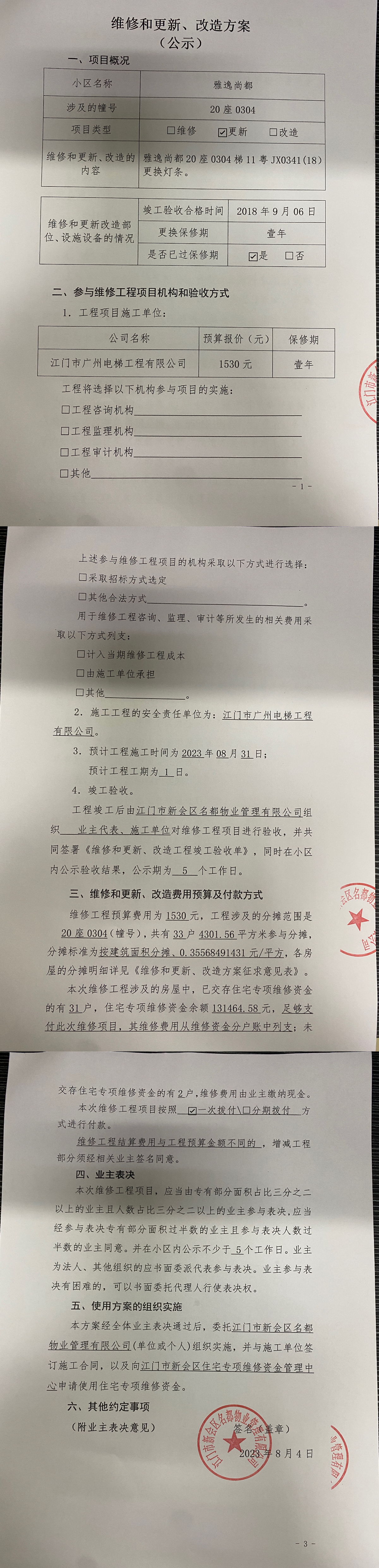 <td valign="top" values="" style="border-width:0" bindtype="0" rowspan="17" colspan="7" datasource="投票结果"><font style=" font-family:方正小标宋简体;font-size:14pt;"><p style="line-height: 1.75em;"><span style="font-family: 宋体, SimSun;">各位尊敬的业主:</span><br></p><p style="text-indent: 2em; line-height: 1.75em;"><span style="font-family: 宋体, SimSun;">根据法律法规的规定,本小区业主利用“物业公共事务决策系统”已对本小区公共事务决策事项进行了表决,在经过7日的询异公示期后,未收到业主有效的异议。现将投票结果公告,并就产生的法律效力说明如下:</span></p><p style="line-height: 1.75em; text-indent: 0em;"><strong style="text-indent: 2em;"><span style="font-family: 宋体, SimSun;">一、投票范围</span></strong></p><p style="text-indent: 2em; line-height: 1.75em;"><span style="font-family: 宋体, SimSun;">雅逸尚都雅逸尚都20座</span></p><p style="text-indent: 2em; line-height: 1.75em;"><span style="font-family: 宋体, SimSun;">总人数(专有部分人数之和):33</span></p><p style="text-indent: 2em; line-height: 1.75em;"><span style="font-family: 宋体, SimSun;"><span style="font-family: 宋体, SimSun; text-indent: 32px;">总户数:33</span></span></p><p style="text-indent: 2em; line-height: 1.75em;"><span style="font-family: 宋体, SimSun;">建筑物总面积(专有部分面积之和):4301.56㎡</span></p><p style="line-height: 1.75em;"><strong><span style="font-family: 宋体, SimSun;">二、投票起止时间</span></strong></p><p style="text-indent: 2em; line-height: 1.75em;"><span style="font-family: 宋体, SimSun;">投票表决时间:从2023年08月07日到2023年08月22日止</span></p><p style="text-indent: 2em; line-height: 1.75em;"><span style="font-family: 宋体, SimSun;">投票询异公示时间:从2023年08月23日开始</span></p><p style="text-indent: 2em; line-height: 1.75em;"><span style="font-family: 宋体, SimSun;">投票结果通知公告时间:从2023年08月30日开始</span></p><p style="line-height: 1.75em;"><strong><span style="font-family: 宋体, SimSun;">三、计票规则</span></strong></p><p style="text-indent: 2em; line-height: 1.75em;"><span style="font-family: 宋体, SimSun;">表决事项:使用建筑物及其附属设施的维修资金<br></span></p><p style="font-family: 宋体, SimSun;line-height: 1.75em; text-indent: 2em;">计票规则:弃权票不并入其它项 未表决票不并入其它项</p><p></p><p style="line-height: 1.75em;"><strong><span style="font-family: 宋体, SimSun;">四、通过规则</span></strong></p><p style="text-indent: 2em; line-height: 1.75em;"><span style="font-family: 宋体, SimSun;"><span style="font-family: 宋体, SimSun; text-indent: 32px;">表决事项:使用建筑物及其附属设施的维修资金<br></span></span></p><p style="font-family: 宋体, SimSun;line-height: 1.75em; text-indent: 2em;">通过规则:参与表决专有部分面积过半数的业主且参与表决人数过半数的业主同意</p><p></p><p style="line-height: 1.75em;"><strong><span style="font-family: 宋体, SimSun;">五、投票结果</span></strong></p><p style="line-height: 1.75em; text-indent: 2em;"><span style="font-family: 宋体, SimSun; text-indent: 2em;"></span></p><div id="resultTable"><table style="table-layout: fixed; font-size:12px; margin-top:10px" width="100%" border="0" cellspacing="0" cellpadding="0"><tbody><tr><td height="28" colspan="10" align="center" style="border: 1px solid #666"><strong style="font-size: 14px;"> 使用建筑物及其附属设施的维修资金</strong></td> </tr><tr id="trfirst"><td height="28" colspan="4" style="border-left: 1px solid #666; border-bottom: 1px solid #666"><strong> 申报单位:</strong> 江门市新会区名都物业管理有限公司</td><td colspan="3" style="border-left: 1px solid #666; border-bottom: 1px solid #666"><strong> 联系方式:</strong> 6609908 </td><td colspan="3" style="border-left: 1px solid #666; border-bottom: 1px solid #666; border-right: 1px solid #666"><strong> 申报日期:</strong> 2023年8月5日 </td></tr><tr> <td height="28" colspan="5" style="border-left: 1px solid #666; border-bottom: 1px solid #666"><strong> 总人数(专有部分人数之和):</strong>33人 </td><td colspan="5" style="border-left: 1px solid #666; border-bottom: 1px solid #666; border-right: 1px solid #666"><strong> 建筑物总面积(专有部分面积之和):</strong>4301.56㎡ </td> </tr><tr><td height="28" colspan="10" bgcolor="#F3F3F3" style="border-left: 1px solid #666;border-bottom: 1px solid #666;border-right: 1px solid #666"><strong> 参与人数及面积统计</strong></td></tr><tr><td height="28" colspan="5" style="border-left: 1px solid #666; border-bottom: 1px solid #666"><strong> 参与表决专有部分人数之和:</strong>6人</td><td colspan="5" style="border-left: 1px solid #666; border-bottom: 1px solid #666; border-right: 1px solid #666"><strong> 参与表决占有表决权总人数比例:</strong>18.18%</td></tr><tr><td height="28" colspan="5" style="border-left: 1px solid #666; border-bottom: 1px solid #666"><strong> 参与表决专有部分面积之和:</strong>742.86㎡</td><td colspan="5" style="border-left: 1px solid #666; border-bottom: 1px solid #666; border-right: 1px solid #666"><strong> 参与表决占有表决权总面积比例:</strong>17.27%</td></tr><tr><td height="28" colspan="10" bgcolor="#F3F3F3" style="border-left: 1px solid #666; border-bottom: 1px solid #666;border-right: 1px solid #666"> <strong> 未参与人数及面积统计</strong></td> </tr><tr><td height="28" colspan="5" style="border-left: 1px solid #666; border-bottom: 1px solid #666"><strong> 未参与表决专有部分人数之和:</strong>27人 </td><td colspan="5" style="border-left: 1px solid #666; border-bottom: 1px solid #666; border-right: 1px solid #666"><strong> 未参与表决占有表决权总人数比例:</strong>81.82%</td></tr><tr><td height="28"