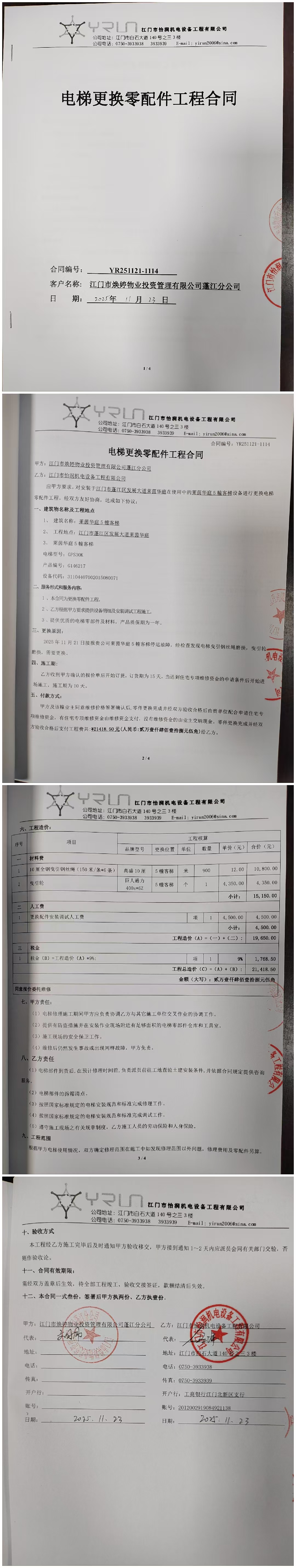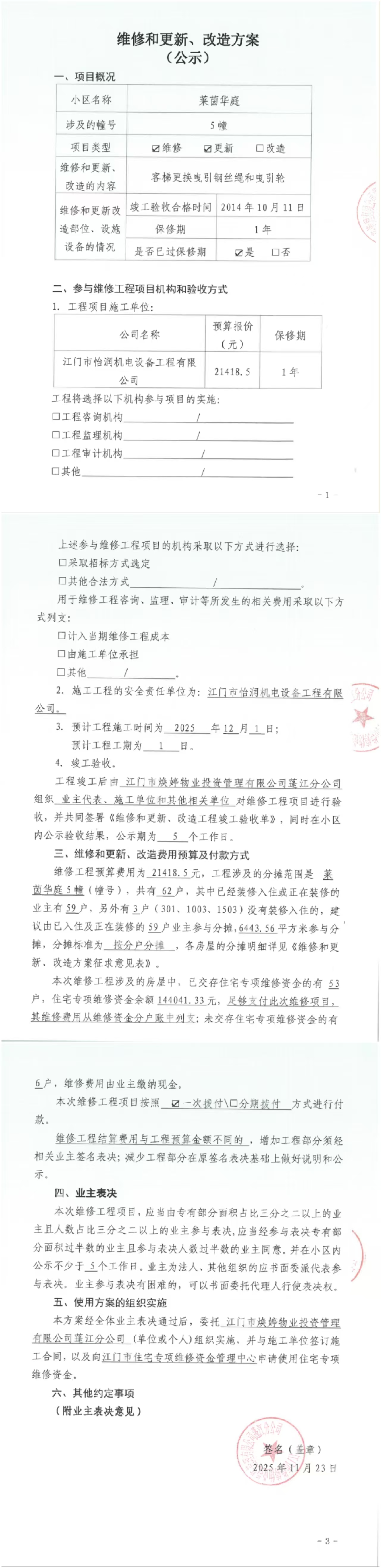 <td VALIGN="top" VALUES="" STYLE="border-width:0" BINDTYPE="0" ROWSPAN="19" COLSPAN="7" DATASOURCE="投票结果" ><font style="font-size:14pt;"><p style="white-space: normal; font-family: 宋体; line-height: 1.75em;">莱茵华庭蓬江区莱茵华庭5幢全体业主:</p><p style="white-space: normal; font-family: 宋体; line-height: 1.75em; text-indent: 2em;">本小区关于莱茵华庭小区5幢客梯更换曳引钢丝绳和曳引轮使用维修资金的投票的投票已表决结束,询异时间从2025年12月24日开始,投票询异公示期间,业主可通过微信查询自己的表决情况或可凭身份证件申请查询自己的表决情况;如公示的业主表决情况与查询的本人表决意见不一致的,可以以书面形式向投票组织机构申诉,投票组织机构予以纠正并重新公示表决结果。异议提出人对投票组织机构的处理仍有异议的,可以向街道办事处(镇人民政府)反映处理,涉及住宅专项维修资金的,可向属地住宅专项维修资金管理中心反映处理。</p><p style="white-space: normal;"><br/></p><p style="white-space: normal; font-family: 宋体; line-height: 1.75em;"><strong>附件:</strong></p><p style="white-space: normal; font-family: 宋体; line-height: 1.75em;"><strong>一、投票范围</strong></p><p style="white-space: normal; font-family: 宋体; line-height: 1.75em; text-indent: 2em;">莱茵华庭蓬江区莱茵华庭5幢</p><p style="white-space: normal; font-family: 宋体; line-height: 1.75em; text-indent: 2em;">总人数(专有部分人数之和):59</p><p style="white-space: normal; font-family: 宋体; line-height: 1.75em; text-indent: 2em;"><span style="font-family: 宋体, SimSun;"><span style="font-family: 宋体; text-indent: 32px;"><span style="font-family: 宋体; text-indent: 32px;">总户数:59</span></span></span></p><p style="white-space: normal; font-family: 宋体; line-height: 1.75em; text-indent: 2em;">建筑物总面积(专有部分面积之和):6443.56㎡</p><p style="white-space: normal; font-family: 宋体; line-height: 1.75em;"><strong>二、询异公示起止时间</strong></p><p dir="ltr" style="white-space: normal; font-family: 宋体; line-height: 1.75em; text-indent: 2em;"><span style="text-indent: 36px;">2025年12月24日至2025年12月31日</span></p><p style="white-space: normal; font-family: 宋体; line-height: 1.75em;"><strong>三、投票详细描述</strong></p><p style="white-space: normal; font-family: 宋体; line-height: 1.75em; text-indent: 2em;"><p style="font-family: "Helvetica Neue", Helvetica, Arial, sans-serif; font-size: 14px; white-space: normal; background-color: rgb(255, 255, 255);"> </p><p style="font-family: "Helvetica Neue", Helvetica, Arial, sans-serif; font-size: 14px; white-space: normal; background-color: rgb(255, 255, 255);"> 小区5幢的客梯运行时出现异响,经电梯维保公司现场检查发现曳引钢丝绳已经断股、曳引轮绳槽下陷磨损,目前客梯已停梯,需要更换电梯曳引钢丝绳和曳引轮才能恢复电梯的正常运行。</p><p style="font-family: "Helvetica Neue", Helvetica, Arial, sans-serif; font-size: 14px; white-space: normal; background-color: rgb(255, 255, 255);"> 现对5幢客梯进行维修,工程维修预算金额为<span style="color: rgb(0, 0, 0);">21418.5元,项目最终费用以施工合同签订金额为准。因已过保修期,维修费用由相关业主按分户分摊,每户约363.03</span>元,详见公示附件。如业主手机不能正常通过微信投票,请联系物业公司进行线下纸质投票,物业电话:0750-3212633。</p><p style="font-family: "Helvetica Neue", Helvetica, Arial, sans-serif; font-size: 14px; white-space: normal; background-color: rgb(255, 255, 255);"><br/></p></p><p style="white-space: normal; font-family: 宋体; line-height: 1.75em;"><strong>四、计票规则</strong></p><p style="white-space: normal; font-family: 宋体; line-height: 1.75em; text-indent: 2em;">表决事项:使用建筑物及其附属设施的维修资金<br /><p style='text-align: left; font-family: 宋体; font-size: 16px; line-height: 1.75em; text-indent: 2em;'>计票规则:弃权票不并入其它项 未表决票不并入其它项</p></p><p style="white-space: normal; font-family: 宋体; line-height: 1.75em;"><strong>五、通过规则</strong></p><p style="white-space: normal; font-family: 宋体; line-height: 1.75em;"><strong><strong style="white-space: normal;"><span style="font-family: 宋体, SimSun;"> 根据《中华人民共和国民法典》第二百七十八条规定:业主共同决定事项,应当由专有部分面积占比三分之二以上的业主且人数占比三分之二以上的业主参与表决。</span></strong></strong></p><p style="white-space: normal; font-family: 宋体; line-height: 1.75em; text-indent: 2em;">表决事项:使用建筑物及其附属设施的维修资金<br /><p style='text-align: left; font-family: 宋体; font-size: 16px; line-height: 1.75em; text-indent: 2em;'>通过规则:双2/3以上参与表决,参与表决双过半同意</p></p><p style="white-space: normal; font-family: 宋体; line-height: 1.75em;"><strong>六、投票结果</strong></p><p style="white-space: normal; font-family: 宋体; line-height: 1.75em; text-indent: 2em;"><div id='resultTable'><table style='table-layout: fixed; font-size:12px; margin-top:10px' width='100%' border='0' cellspacing='0' cellpadding='0'><tr><td height='28' colspan='10' align='center' style='border: 1px solid #666'><strong style='font-size: 14px;'> 使用建筑物及其附属设施的维修资金</strong></td> </tr><tr id='trfirst'><td height='28' colspan='4' style='border-left: 1px solid #666; border-bottom: 1px solid #666'><strong> 申报单位:</strong> 江门市焕婷物业投资管理有限公司蓬江分公司</td><td colspan='3' style='border-left: 1px solid #666; border-bottom: 1px solid #666'><strong> 联系方式:</strong> 3211392 </td><td colspan='3' style='border-left: 1px so