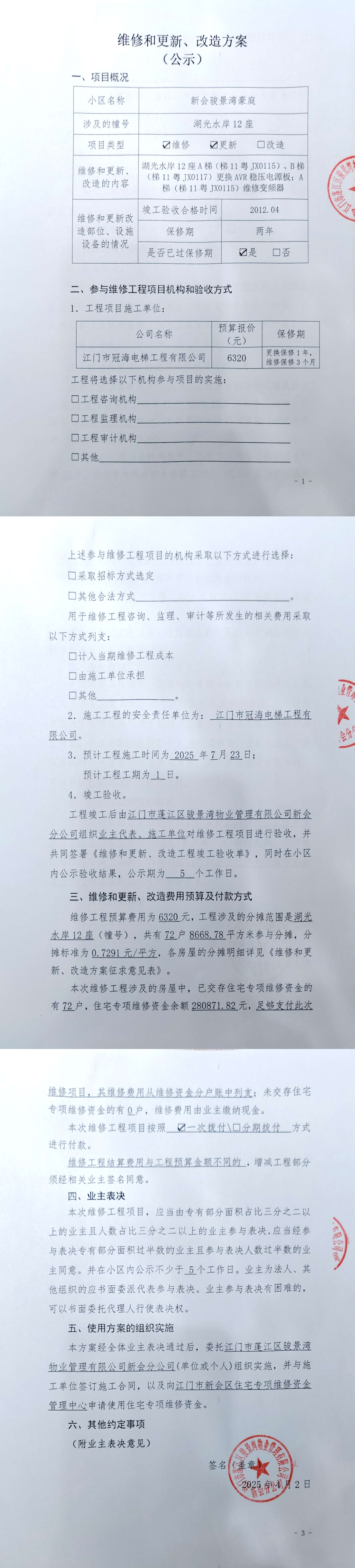 <td VALIGN="top" VALUES="" STYLE="border-width:0" BINDTYPE="0" ROWSPAN="19" COLSPAN="7" DATASOURCE="投票结果" ><font style="font-size:14pt;"><p style="white-space: normal; font-family: 宋体; line-height: 1.75em;">新会骏景湾豪庭湖光水岸12座全体业主:</p><p style="white-space: normal; font-family: 宋体; line-height: 1.75em; text-indent: 2em;">本小区关于新会骏景湾豪庭湖光水岸12座A梯(梯11粤JX0115)、B梯(梯11粤JX0117)更换AVR稳压电源板;A梯(梯11粤JX0115)维修变频器使用维修资金的投票的投票已表决结束,询异时间从2026年01月07日开始,投票询异公示期间,业主可通过微信查询自己的表决情况或可凭身份证件申请查询自己的表决情况;如公示的业主表决情况与查询的本人表决意见不一致的,可以以书面形式向投票组织机构申诉,投票组织机构予以纠正并重新公示表决结果。异议提出人对投票组织机构的处理仍有异议的,可以向街道办事处(镇人民政府)反映处理,涉及住宅专项维修资金的,可向属地住宅专项维修资金管理中心反映处理。</p><p style="white-space: normal;"><br/></p><p style="white-space: normal; font-family: 宋体; line-height: 1.75em;"><strong>附件:</strong></p><p style="white-space: normal; font-family: 宋体; line-height: 1.75em;"><strong>一、投票范围</strong></p><p style="white-space: normal; font-family: 宋体; line-height: 1.75em; text-indent: 2em;">新会骏景湾豪庭湖光水岸12座</p><p style="white-space: normal; font-family: 宋体; line-height: 1.75em; text-indent: 2em;">总人数(专有部分人数之和):72</p><p style="white-space: normal; font-family: 宋体; line-height: 1.75em; text-indent: 2em;"><span style="font-family: 宋体, SimSun;"><span style="font-family: 宋体; text-indent: 32px;"><span style="font-family: 宋体; text-indent: 32px;">总户数:72</span></span></span></p><p style="white-space: normal; font-family: 宋体; line-height: 1.75em; text-indent: 2em;">建筑物总面积(专有部分面积之和):8668.78㎡</p><p style="white-space: normal; font-family: 宋体; line-height: 1.75em;"><strong>二、询异公示起止时间</strong></p><p dir="ltr" style="white-space: normal; font-family: 宋体; line-height: 1.75em; text-indent: 2em;"><span style="text-indent: 36px;">2026年01月07日至2026年01月14日</span></p><p style="white-space: normal; font-family: 宋体; line-height: 1.75em;"><strong>三、投票详细描述</strong></p><p style="white-space: normal; font-family: 宋体; line-height: 1.75em; text-indent: 2em;"><p>新会骏景湾豪庭湖光水岸12座A梯(梯11粤JX0115)、B梯(梯11粤JX0117)在运行时出现故障,经检查,发现是A梯(梯11粤JX0115)、B梯(梯11粤JX0117)AVR稳压电源板自然损坏,为确保电梯安全运行,需要更换;A梯(梯11粤JX0115)变频器损坏,为确保电梯安全运行,需要维修。</p><p> 现对湖光水岸12座A梯(梯11粤JX0115)、B梯(梯11粤JX0117)进行维修,工程维修预算金额为6320元,项目最终费用以施工合同签订金额为准。因已过保修期,维修费用由相关业主按建筑面积分摊,每平方约0.7291元,详见公示附件。如业主手机不能正常通过微信投票,请联系物业公司进行线下纸质投票,物业电话:0750-6179992。</p></p><p style="white-space: normal; font-family: 宋体; line-height: 1.75em;"><strong>四、计票规则</strong></p><p style="white-space: normal; font-family: 宋体; line-height: 1.75em; text-indent: 2em;">表决事项:使用建筑物及其附属设施的维修资金<br /><p style='text-align: left; font-family: 宋体; font-size: 16px; line-height: 1.75em; text-indent: 2em;'>计票规则:弃权票不并入其它项 未表决票不并入其它项</p></p><p style="white-space: normal; font-family: 宋体; line-height: 1.75em;"><strong>五、通过规则</strong></p><p style="white-space: normal; font-family: 宋体; line-height: 1.75em;"><strong><strong style="white-space: normal;"><span style="font-family: 宋体, SimSun;"> 根据《中华人民共和国民法典》第二百七十八条规定:业主共同决定事项,应当由专有部分面积占比三分之二以上的业主且人数占比三分之二以上的业主参与表决。</span></strong></strong></p><p style="white-space: normal; font-family: 宋体; line-height: 1.75em; text-indent: 2em;">表决事项:使用建筑物及其附属设施的维修资金<br /><p style='text-align: left; font-family: 宋体; font-size: 16px; line-height: 1.75em; text-indent: 2em;'>通过规则:双2/3以上参与表决,参与表决双过半同意</p></p><p style="white-space: normal; font-family: 宋体; line-height: 1.75em;"><strong>六、投票结果</strong></p><p style="white-space: normal; font-family: 宋体; line-height: 1.75em; text-indent: 2em;"><div id='resultTable'><table style='table-layout: fixed; font-size:12px; margin-top:10px' width='100%' border='0' cellspacing='0' cellpadding='0'><tr><td height='28' colspan='10' align='center' style='border: 1px solid #666'><strong style='font-size: 14px;'> 使用建筑物及其附属设施的维修资金</strong></td> </tr><tr id='trfirst'><td height='28' colspan='4' style='border-left: 1px solid #666; border-bottom: 1px solid #666'><strong> 申报单位:</strong> 江门市蓬江区骏景湾物业管理有限公司新会分公司</td><td colspan='3' style='border-left: 1px solid #666; border-bottom: 1px solid #666'><strong> 联系方式:</strong> </td><td colspan='3' style='border-left: 1px solid #666; border-bottom: 1px solid #666; border-right: 1px solid #666'><strong> 申报日期:</strong> 2025年4月8日 </td></tr><tr> <td height='28' colspan='5' style='border-left: 1px solid #666; border-bottom: 1px solid #666'><strong> 总人数(专有部分人数之和):</strong>72人 </td><td colspan='5' style='border-left: 1px solid #666; border-bottom: 1px solid #666; border-right: 1px solid #666'><strong> 建筑物总